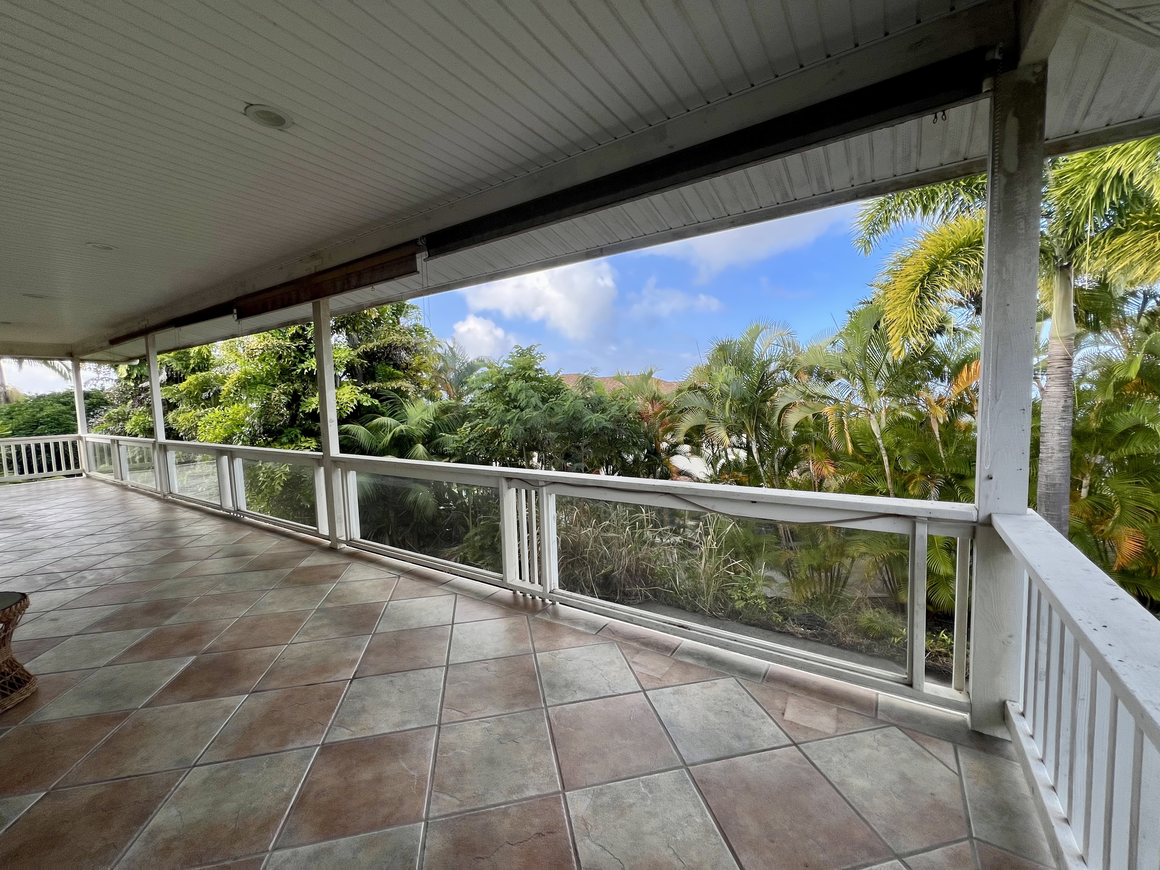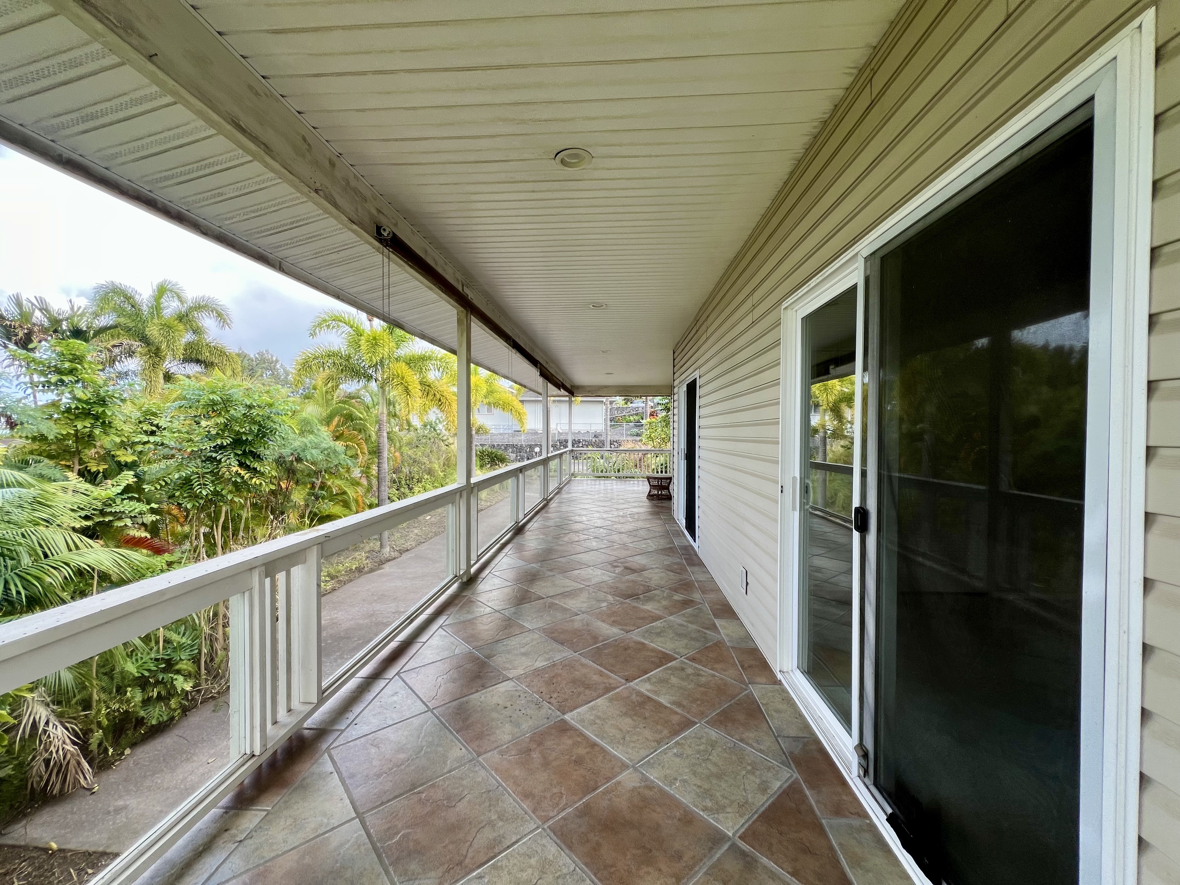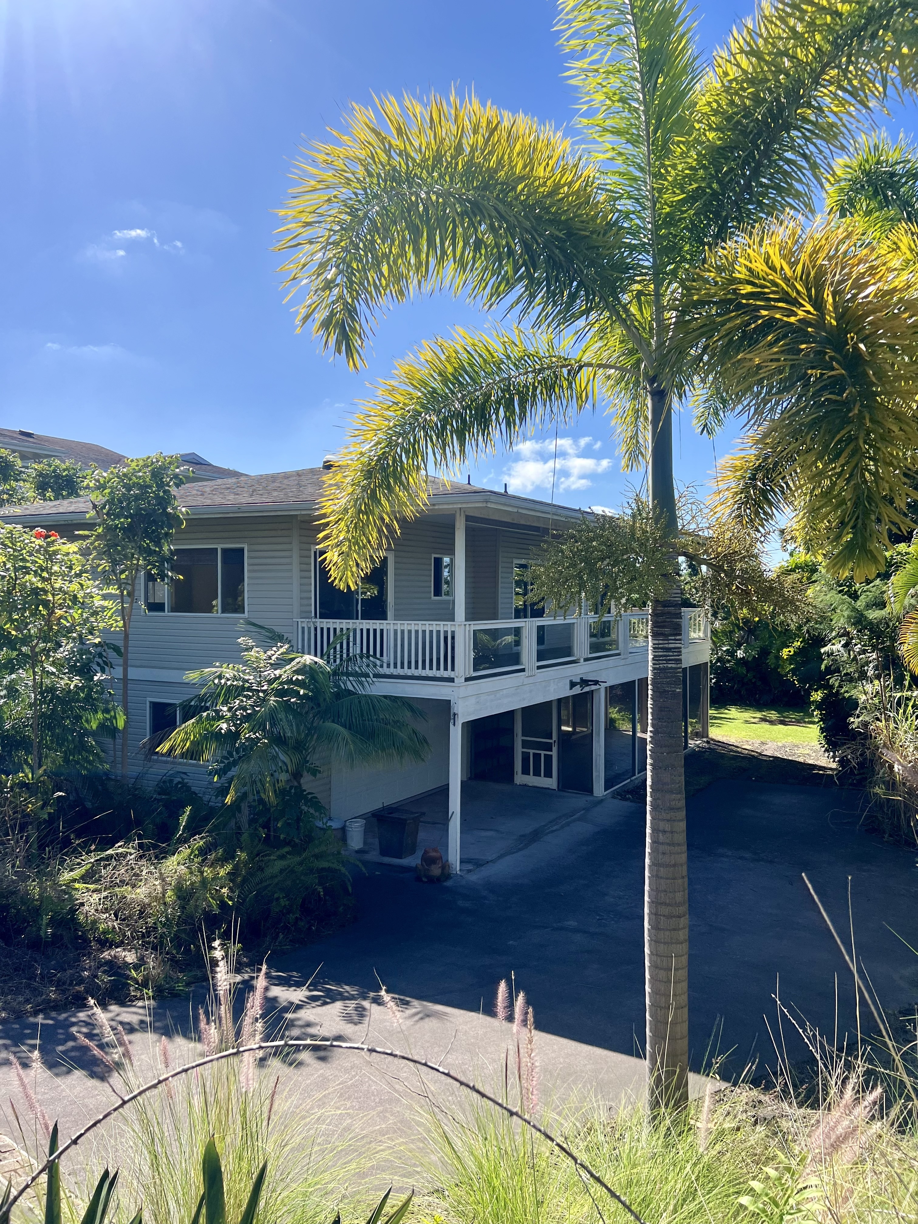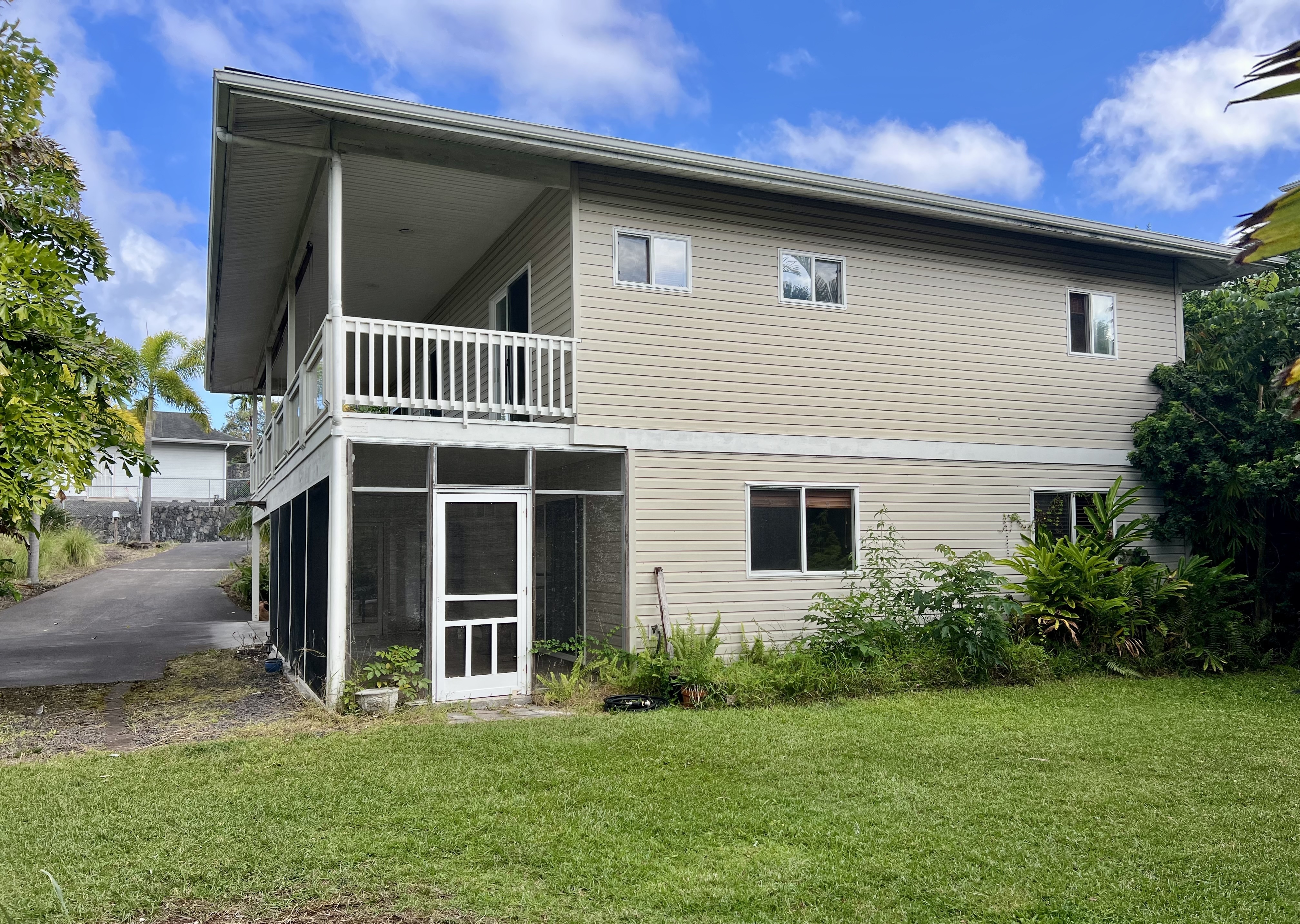 Exceptional opportunity to build equity in this 4 Bedroom 3 bath cosmetic fixer located adjacent to Kona Palisades on a quiet dead end street. 3 bedrooms, 2 baths, kitchen and living room are located upstairs. Upstairs has a large screened in lanai with peek a boo ocean views. A separate 616 sq ft downstairs guest suite provides excellent flexibility with its own private entrance, kitchenette, living space, bedroom, and bath–perfect for extended family, guests, or potential rental income. The large 728 sqft garage has room for 2 cars plus plenty of storage. With some fresh updates and personal touches, transform this solid, well-laid-out property into your island retreat.