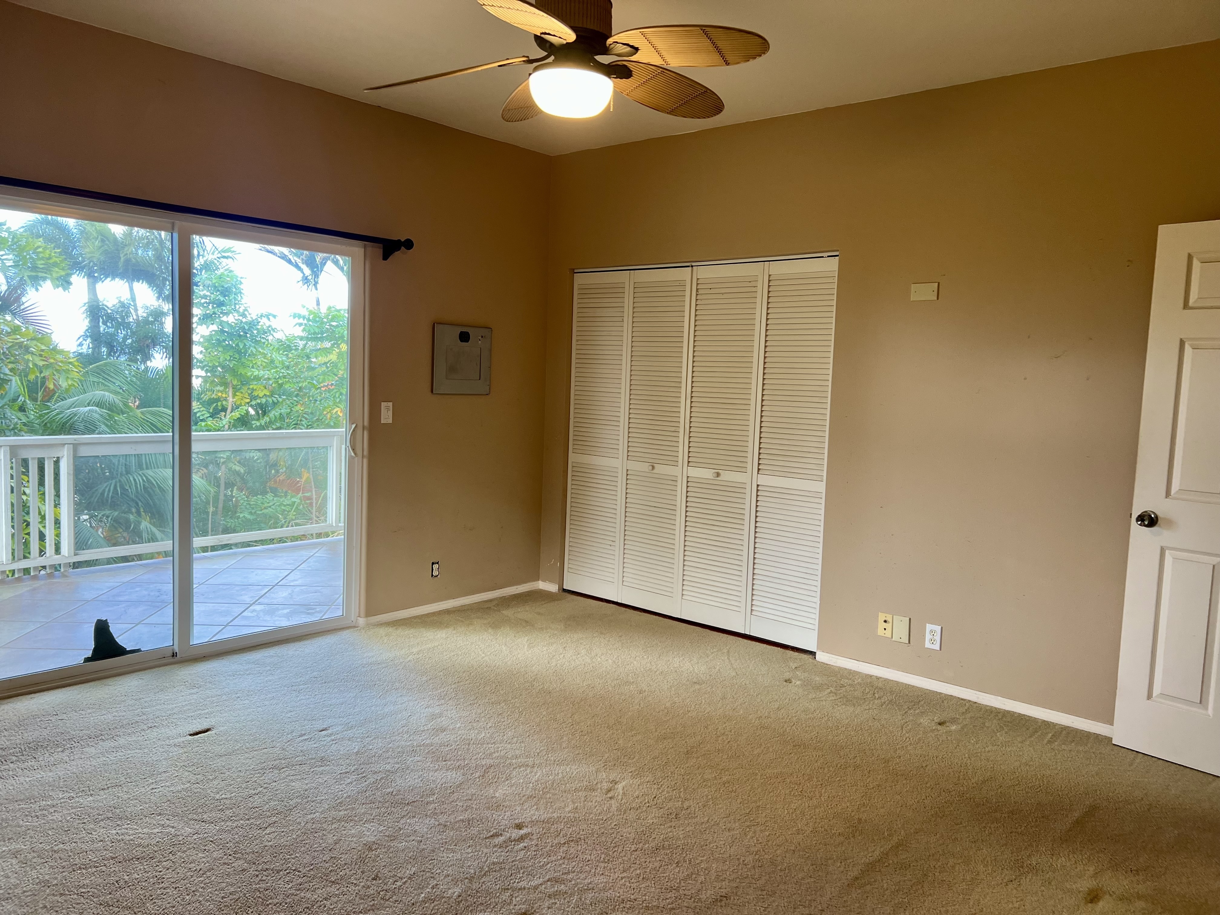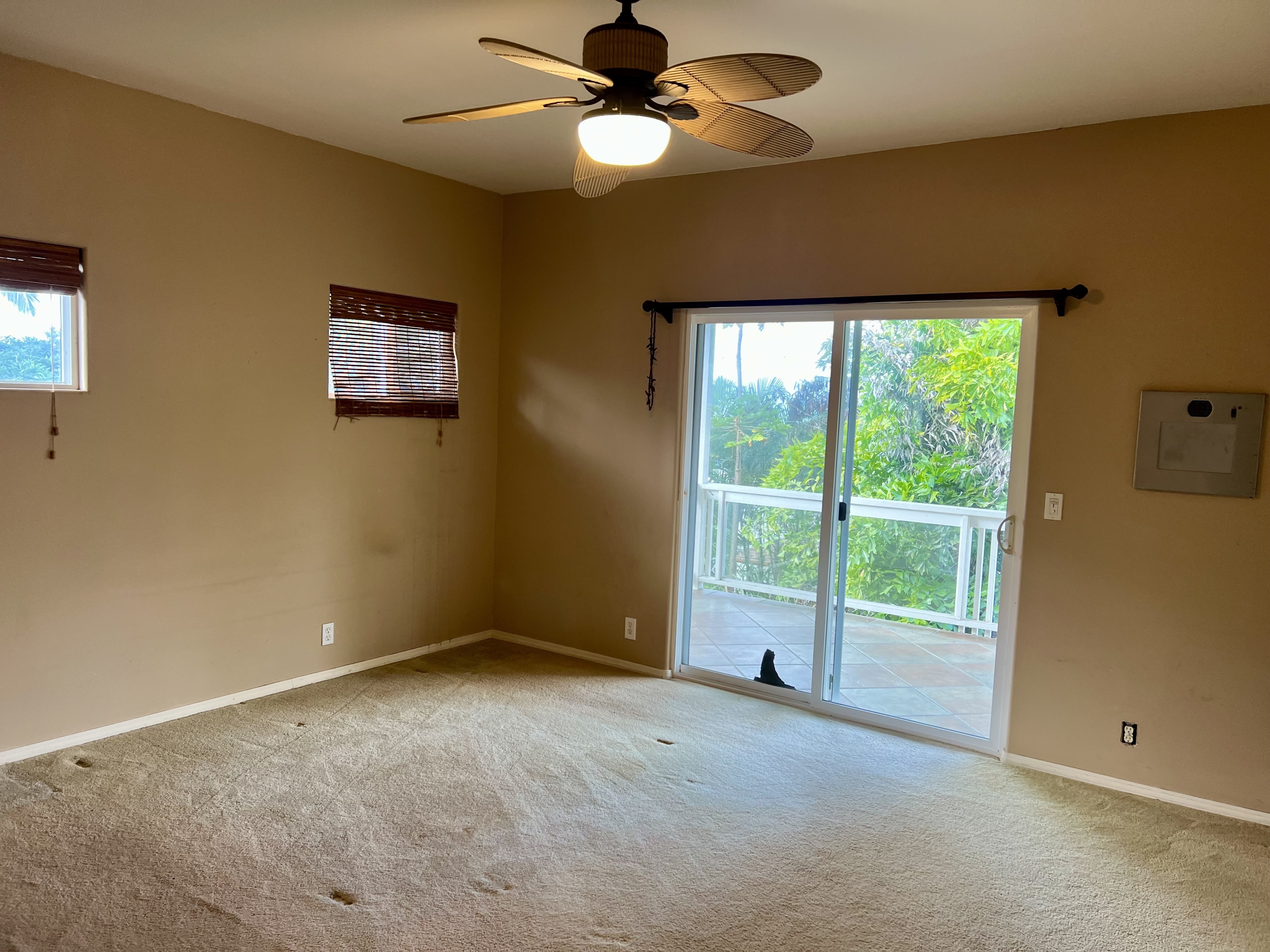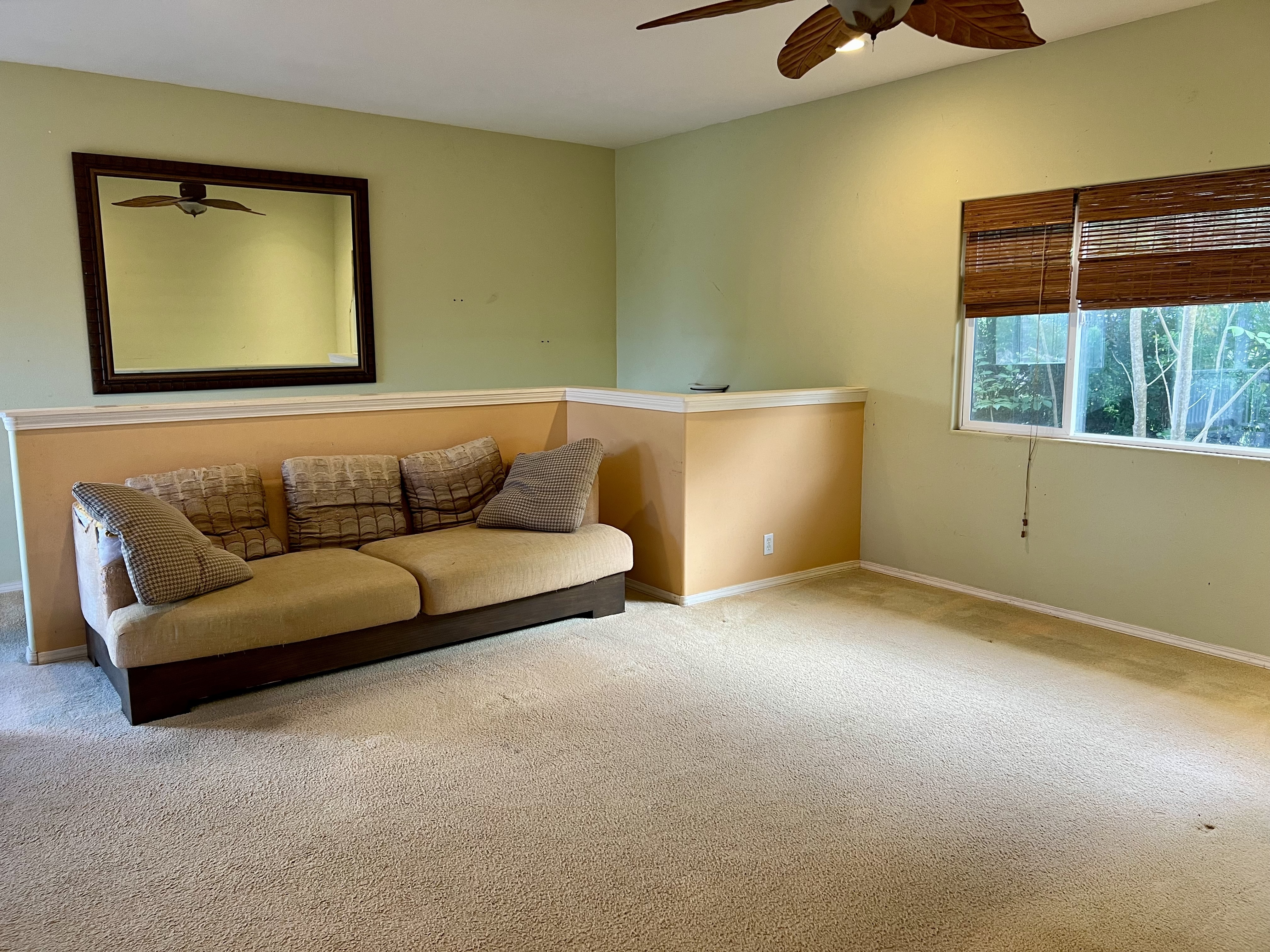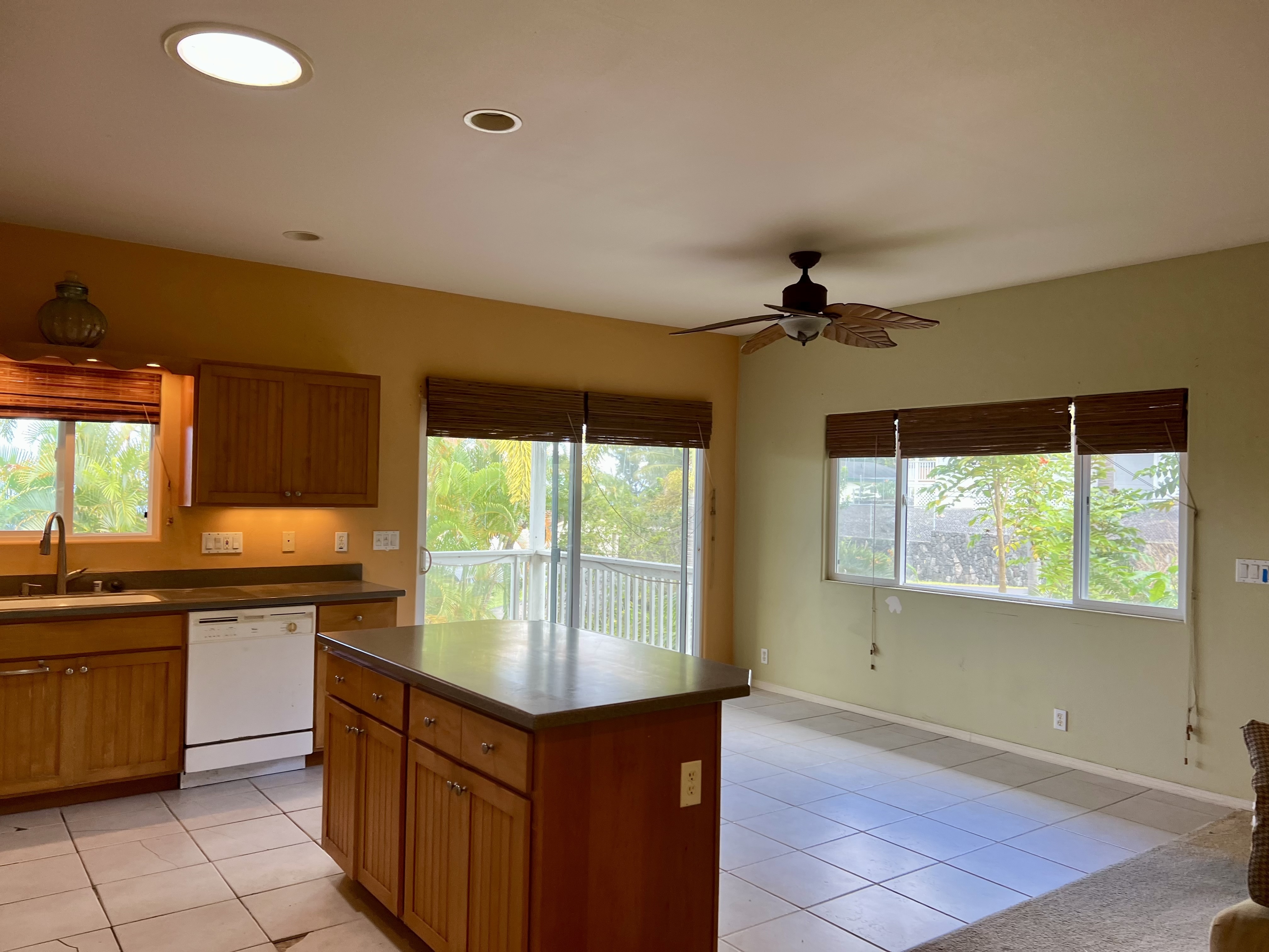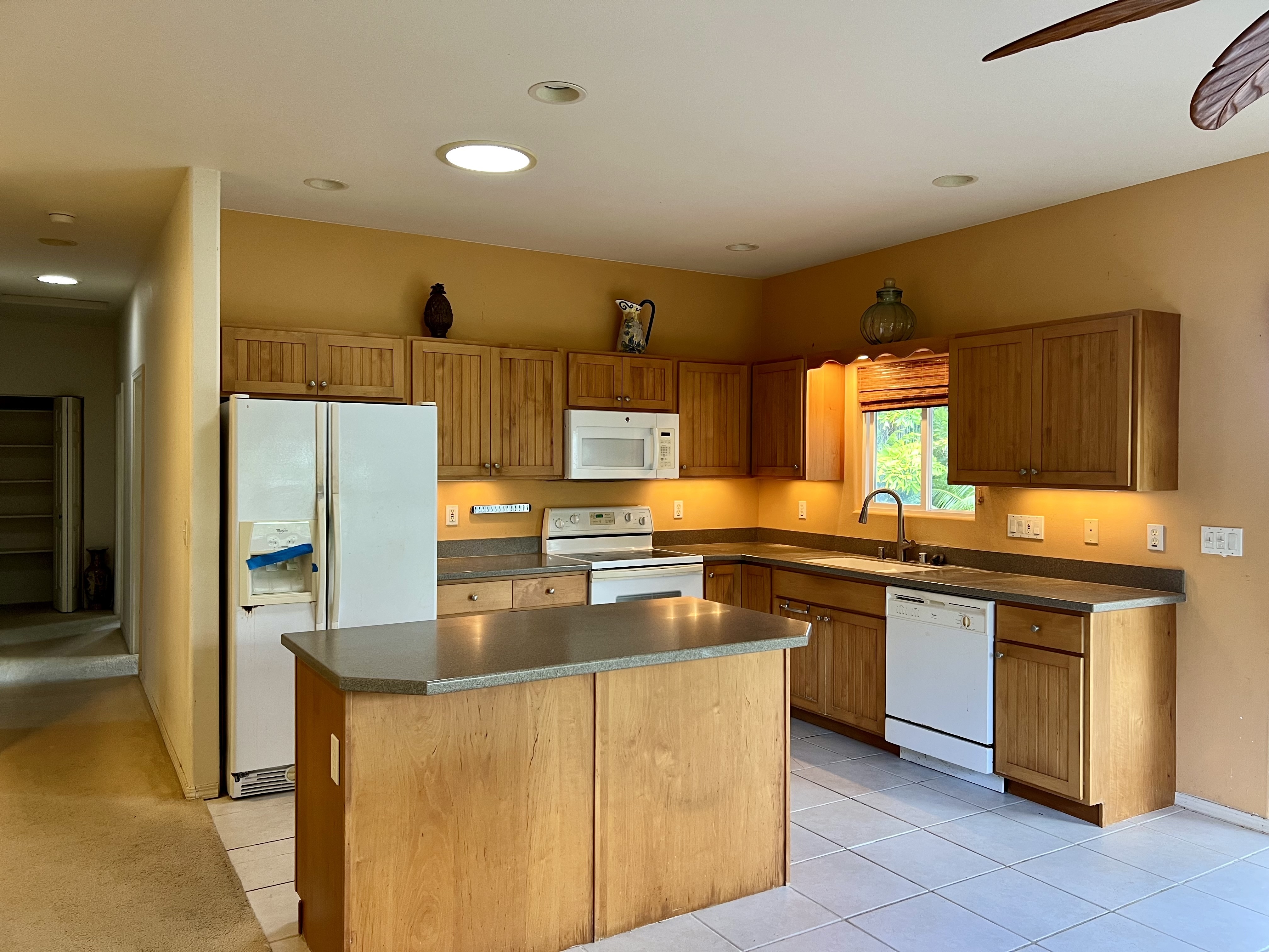Exceptional opportunity to build equity in this 4 Bedroom 3 bath cosmetic fixer located adjacent to Kona Palisades on a quiet dead end street. 3 bedrooms, 2 baths, kitchen and living room are located upstairs. Upstairs has a large screened in lanai with peek a boo ocean views. A separate 616 sq ft downstairs guest suite provides excellent flexibility with its own private entrance, kitchenette, living space, bedroom, and bath–perfect for extended family, guests, or potential rental income. The large 728 sqft garage has room for 2 cars plus plenty of storage. With some fresh updates and personal touches, transform this solid, well-laid-out property into your island retreat.