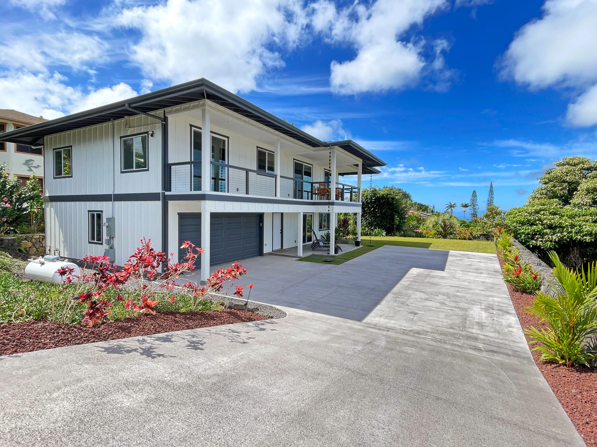 Experience the quality of new construction in a well-designed floor plan on this tucked away cul de sac just 10 minutes from downtown Kailua Kona, 10 minutes from the airport and 10 minutes from Costco. Enjoy beautiful ocean and coastline views from a generously-sized covered lanai. The house, completed in 2022, includes a lower-level guest quarters with large living area, kitchenette, bedroom and bathroom. This beautiful and well-built home, with modern, neutral finishes, is ready to move in.
