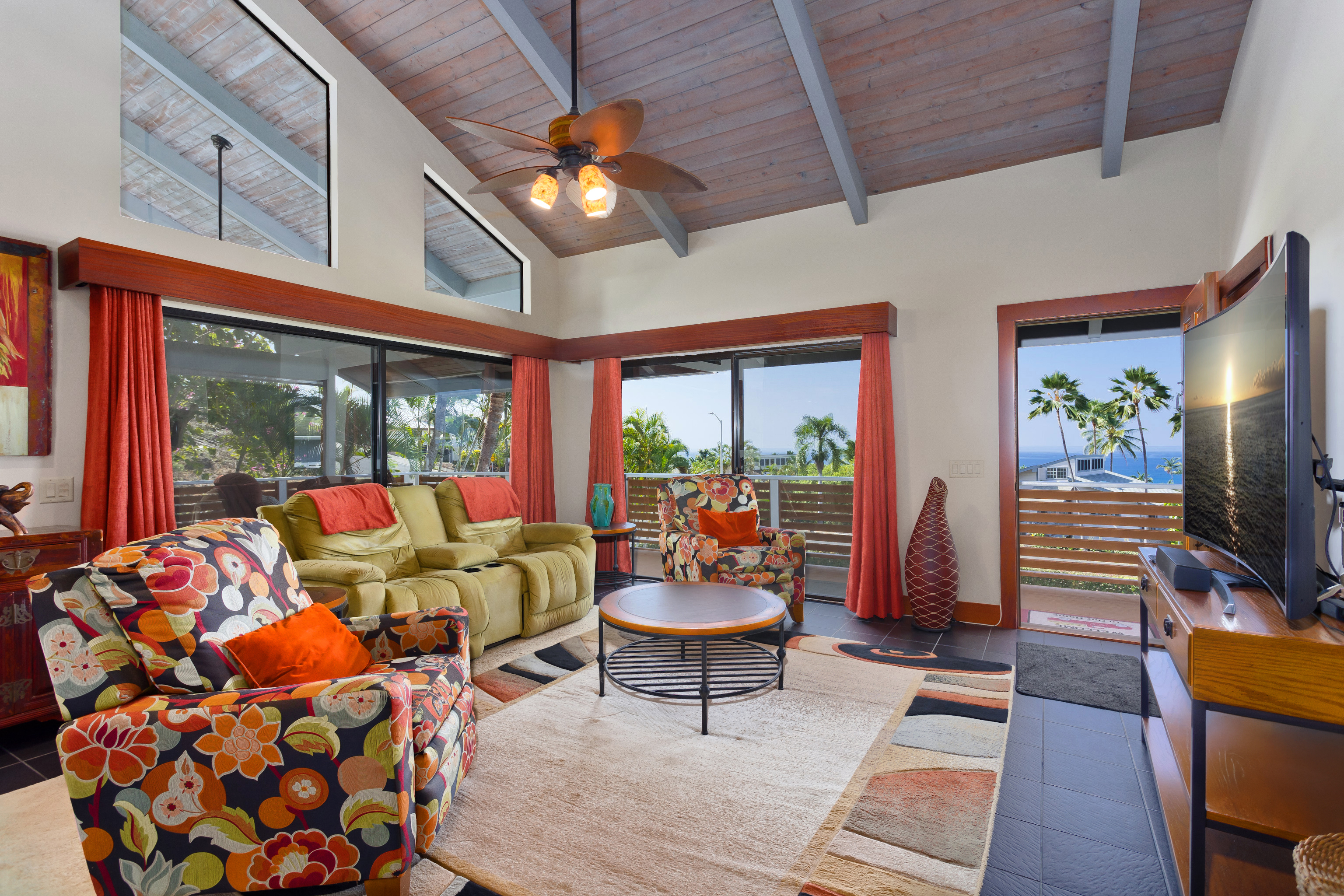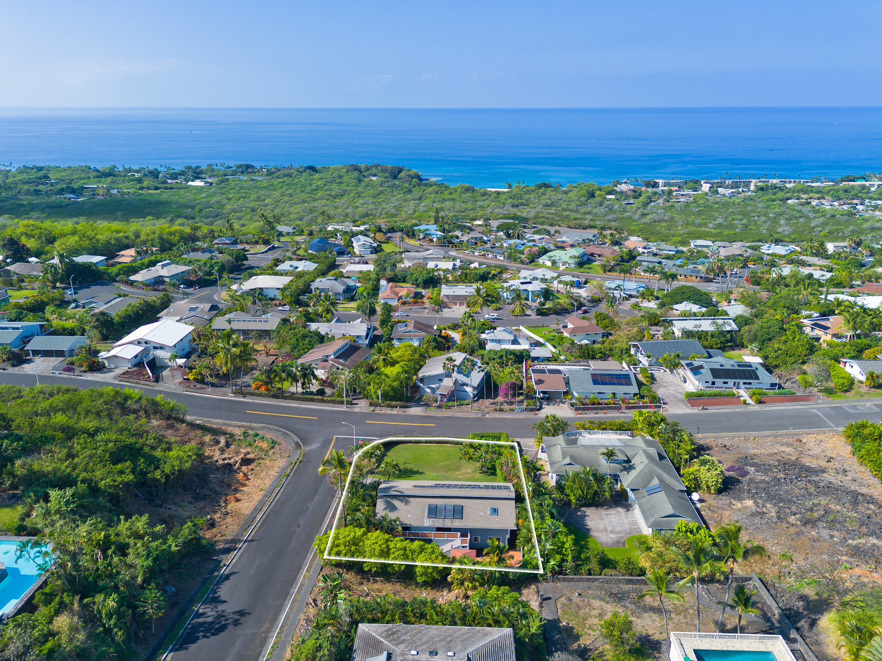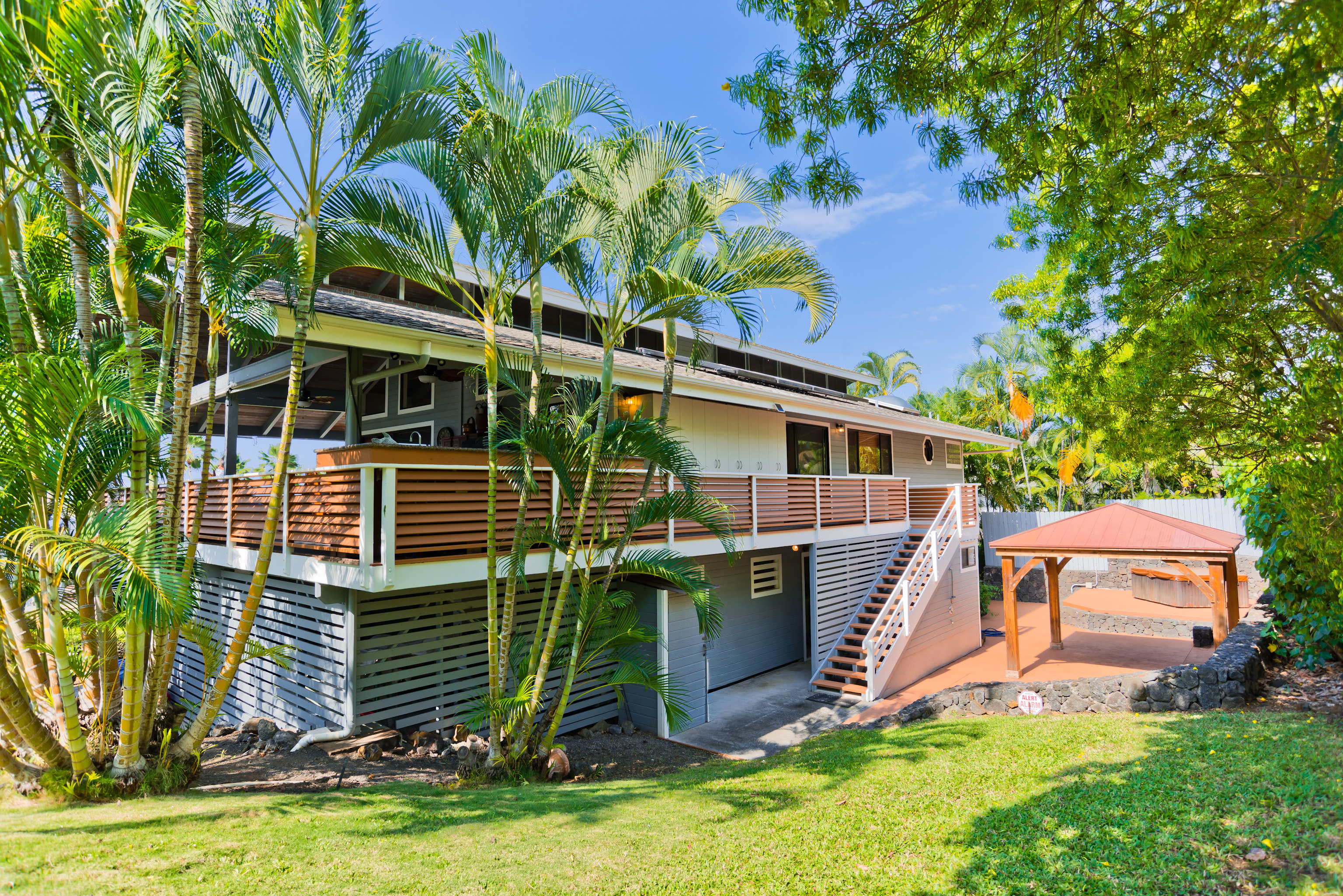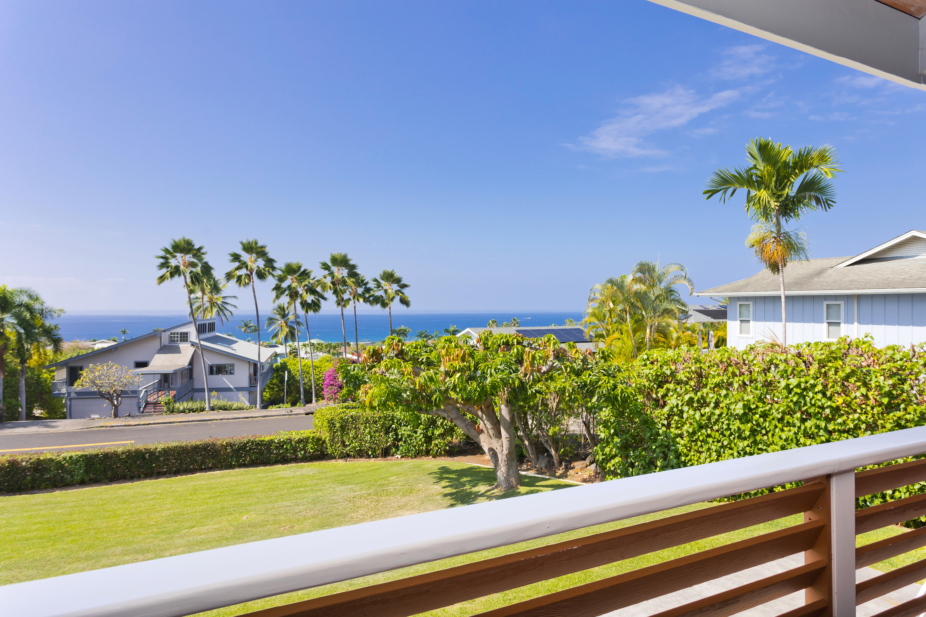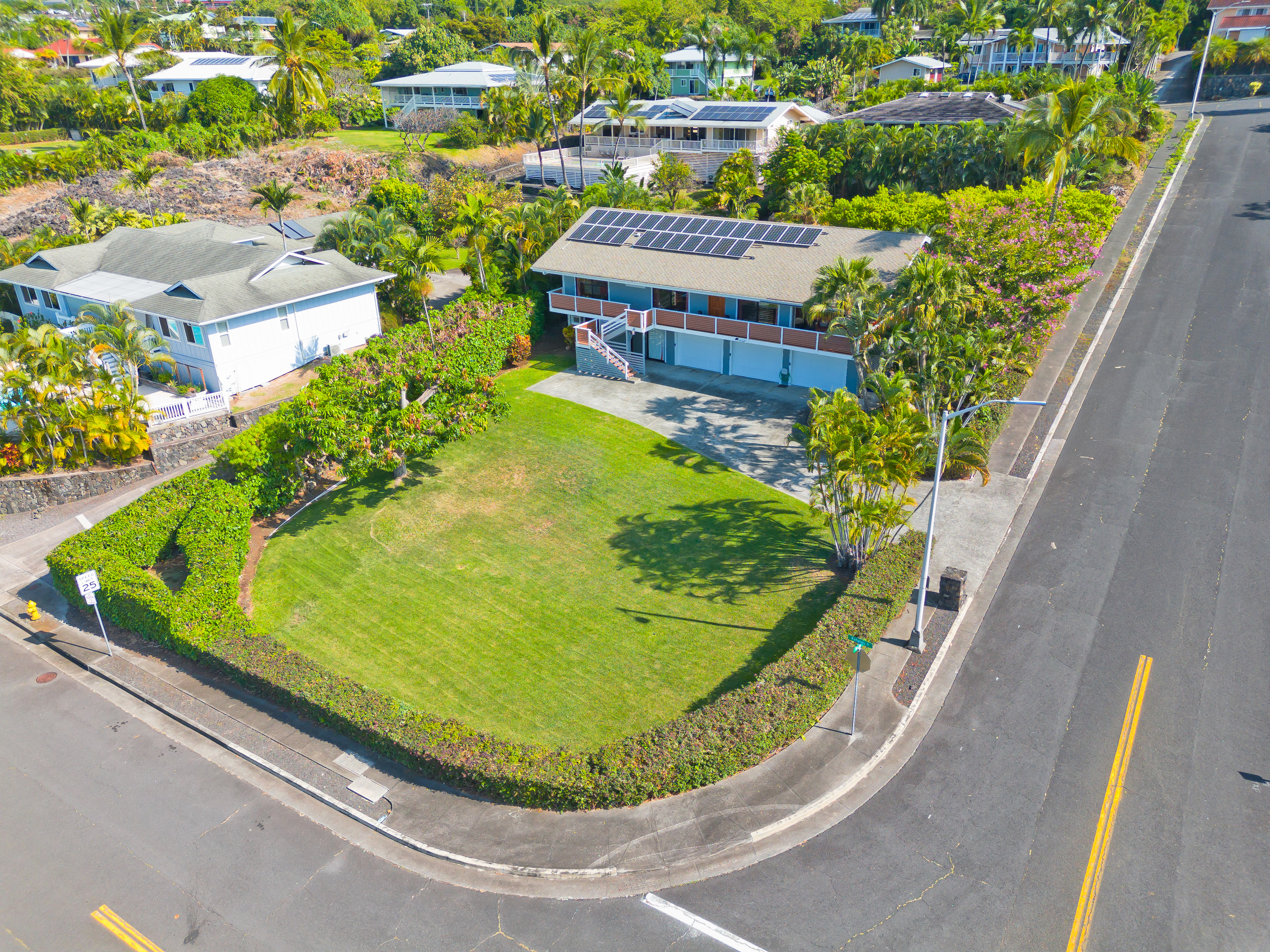Welcome to this impressive and updated 2 story 4 bedroom 3 bath home located in a well established neighborhood & blessed with two separate living areas that graces a large corner lot, fringed on three sides with privacy trees & hedges. Located at a comfortable elevation of approximately 250', this enviable home overlooks a well tended landscape of lawn & attractive low profile west boundary hedge to an inspiring view of the ocean. This home is energy efficient & comes with an owned & net metered photovoltaic system together with two solar hot water systems with 120*2 gallon reservoirs respectively. Other notable features include:- Upper level:- * 3bd/2ba with 1400 sqft of living area & a wraparound covered lanai of 968 sqft. * Resplendent tiger wood flooring in the kitchen & dining area together with eye-catching black slate living room flooring. * Travertine tiled bathroom floors & showers. * High open beam T&G cedar ceilings. * Mahogany kitchen cabinetry & paneling. * Top of the line kitchen appliances. * Attractive granite kitchen counters & bathroom vanities. * Large entertainment area encompassing the southern end of the covered lanai. Complete with BBQ grill, granite counter space, refrigerator & sink. Ground Floor:- * A living area of 672 sqft that includes a bedroom, bathroom, living room & wet bar. * A three vehicle garage. * A laundry complete with storage cabinets, counter & sink. Landscape Features:- * Northern, eastern & a portion of the southern boundaries defined by high hedges. * Rockwall along a portion of the north east corner. * A pergola & hot tub on a large cement pad near the north eastern corner of the property. * A producing mango tree. This property is located in well established Komohana Kai 2 subdivision & is approximately 4 miles south of Kailua-Kona & a similar distance north of Keauhou Shopping Center. Video: https://player.vimeo.com/video/1156397614