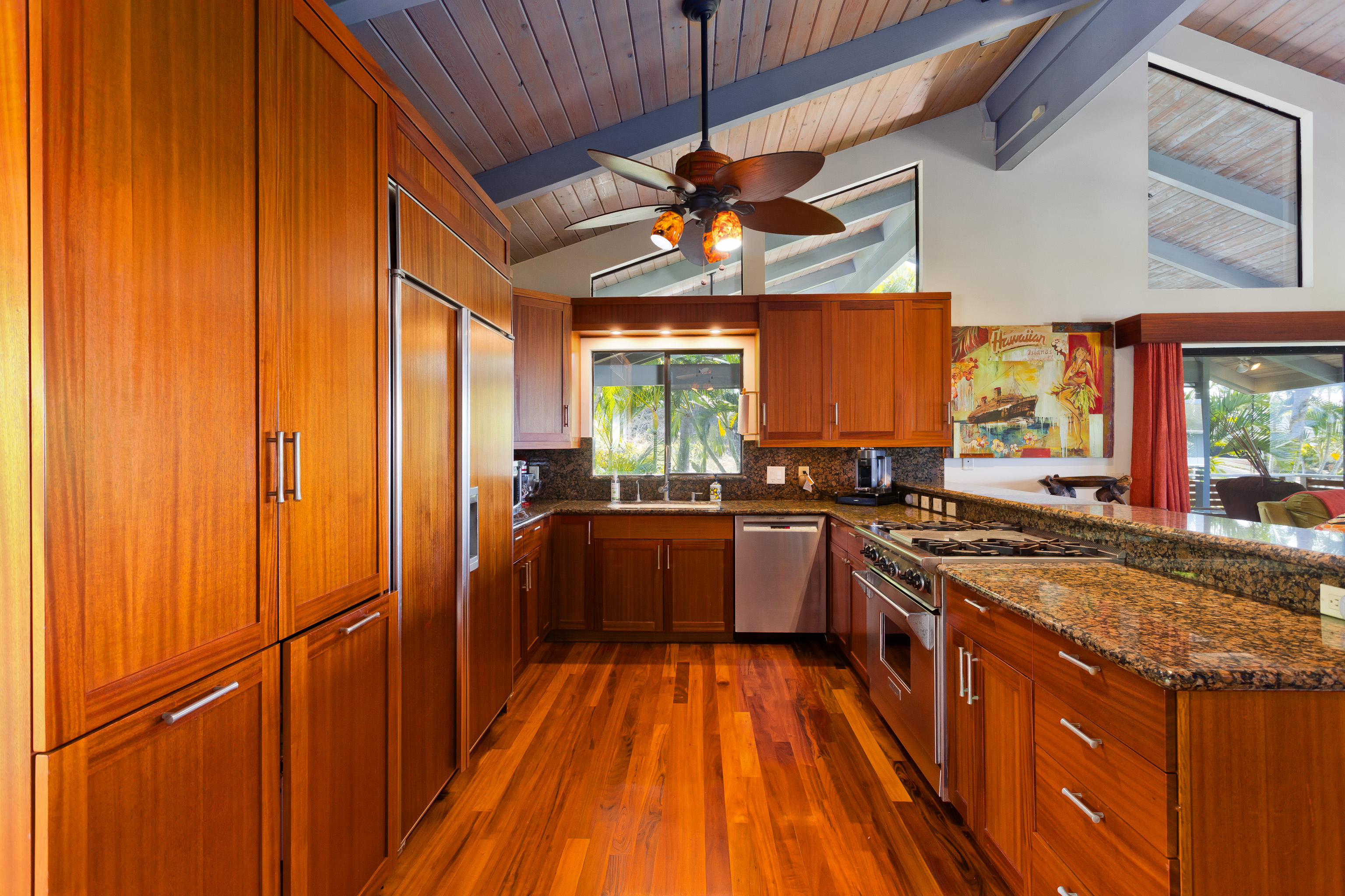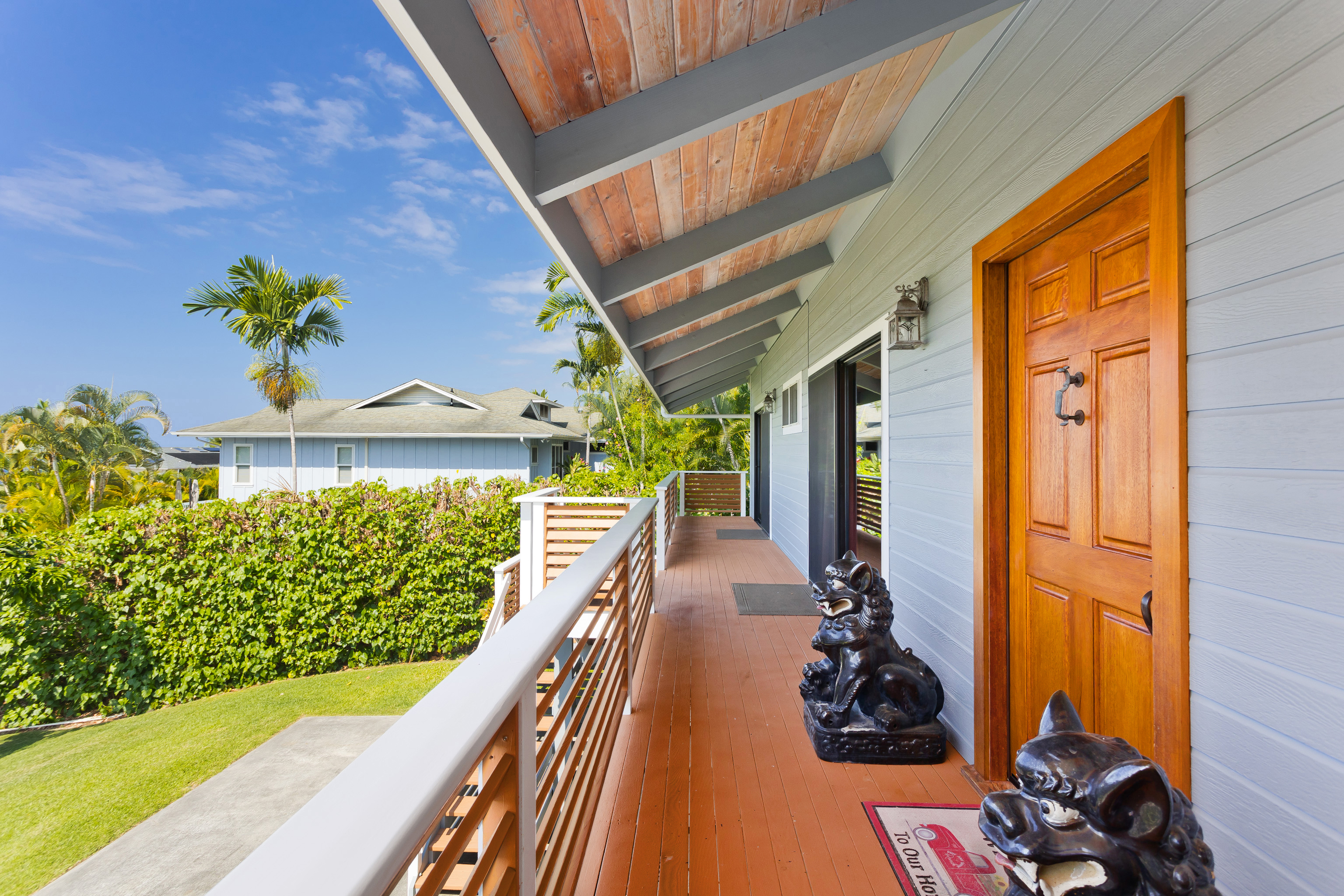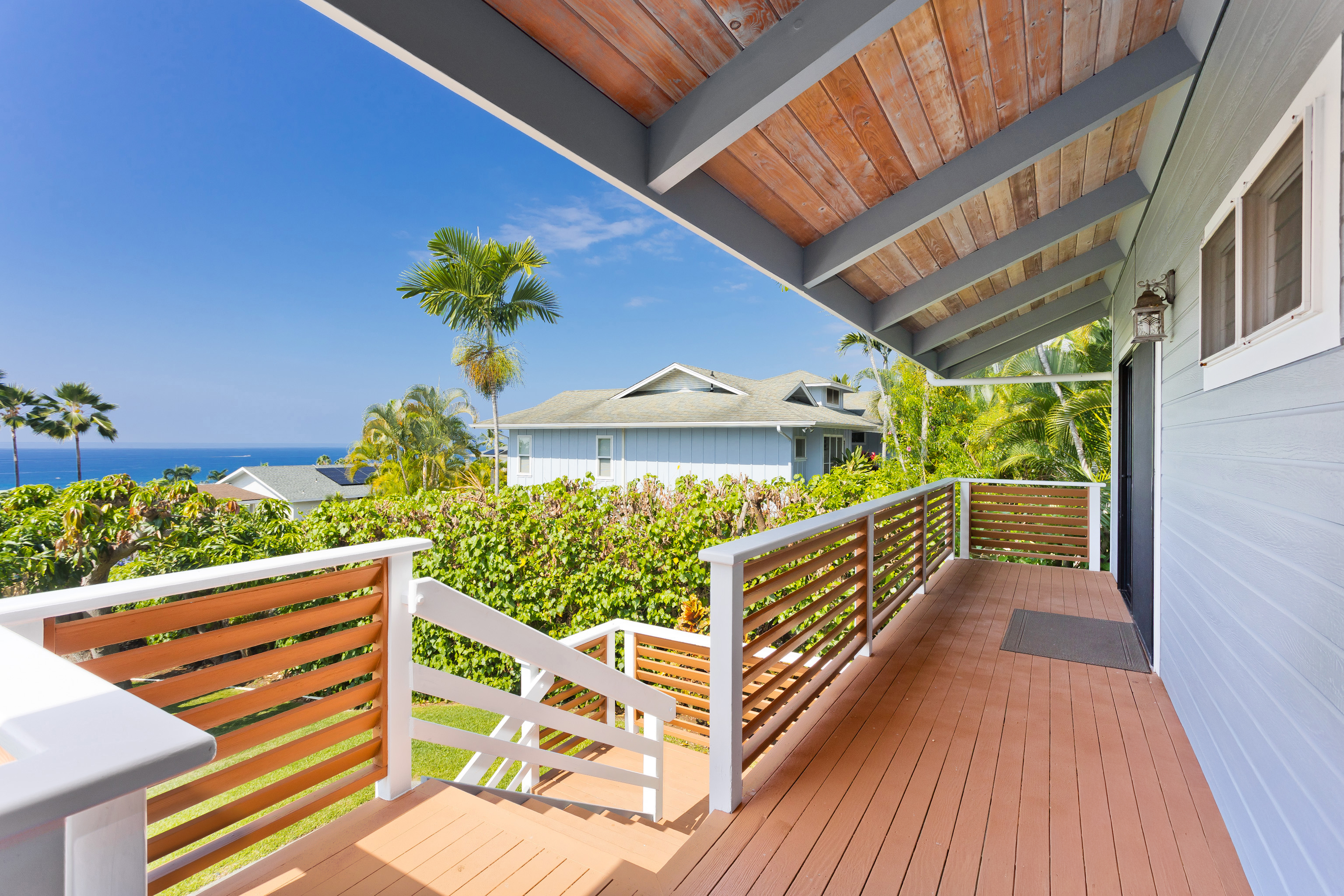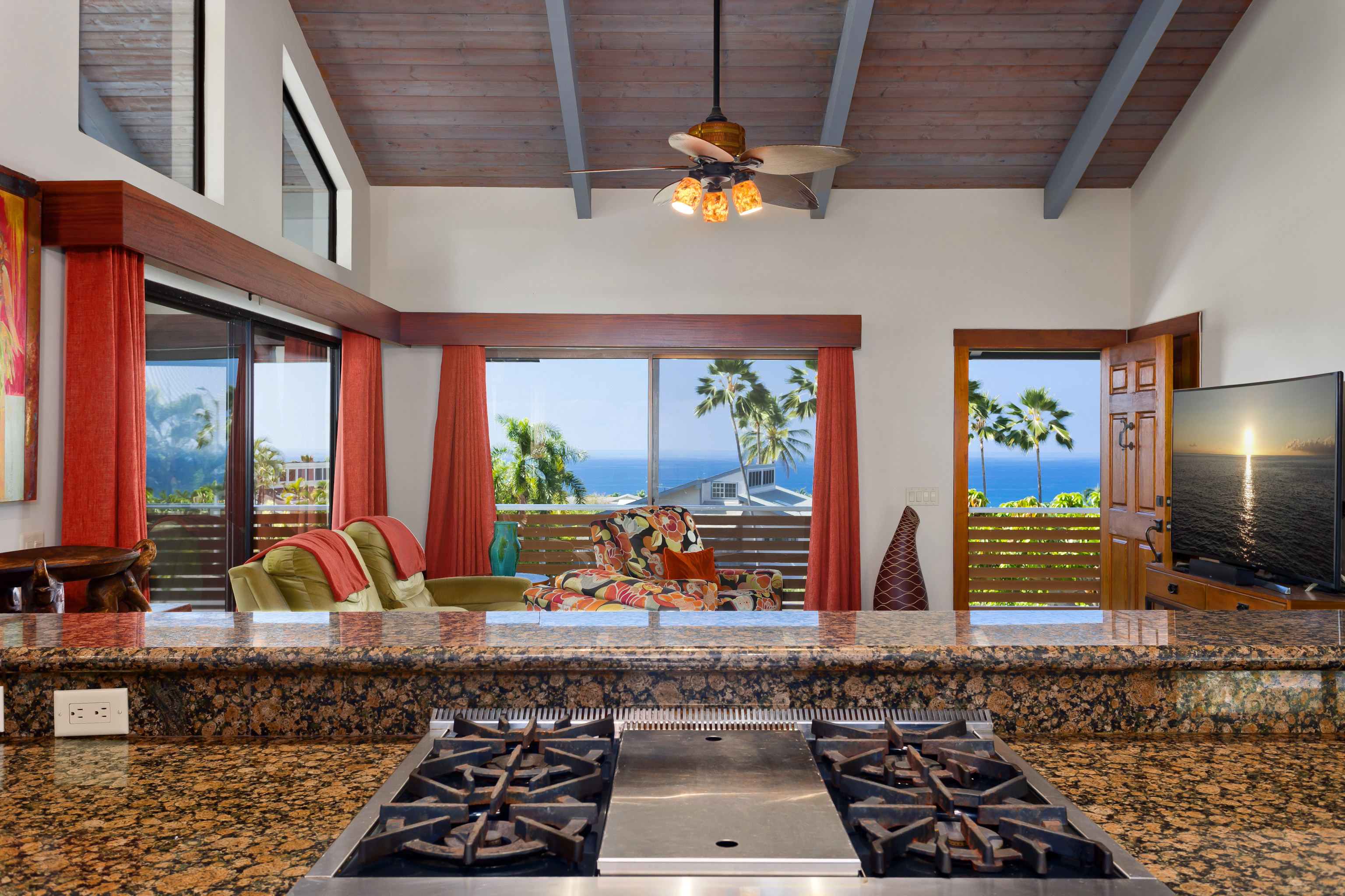 Welcome to this impressive and updated 2 story 4 bedroom 3 bath home located in a well established neighborhood & blessed with two separate living areas that graces a large corner lot, fringed on three sides with privacy trees & hedges. Located at a comfortable elevation of approximately 250', this enviable home overlooks a well tended landscape of lawn & attractive low profile west boundary hedge to an inspiring view of the ocean. This home is energy efficient & comes with an owned & net metered photovoltaic system together with two solar hot water systems with 120*2 gallon reservoirs respectively. Other notable features include:- Upper level:- * 3bd/2ba with 1400 sqft of living area & a wraparound covered lanai of 968 sqft. * Resplendent tiger wood flooring in the kitchen & dining area together with eye-catching black slate living room flooring. * Travertine tiled bathroom floors & showers. * High open beam T&G cedar ceilings. * Mahogany kitchen cabinetry & paneling. * Top of the line kitchen appliances. * Attractive granite kitchen counters & bathroom vanities. * Large entertainment area encompassing the southern end of the covered lanai. Complete with BBQ grill, granite counter space, refrigerator & sink. Ground Floor:- * A living area of 672 sqft that includes a bedroom, bathroom, living room & wet bar. * A three vehicle garage. * A laundry complete with storage cabinets, counter & sink. Landscape Features:- * Northern, eastern & a portion of the southern boundaries defined by high hedges. * Rockwall along a portion of the north east corner. * A pergola & hot tub on a large cement pad near the north eastern corner of the property. * A producing mango tree. This property is located in well established Komohana Kai 2 subdivision & is approximately 4 miles south of Kailua-Kona & a similar distance north of Keauhou Shopping Center. Video: https://player.vimeo.com/video/1156397614