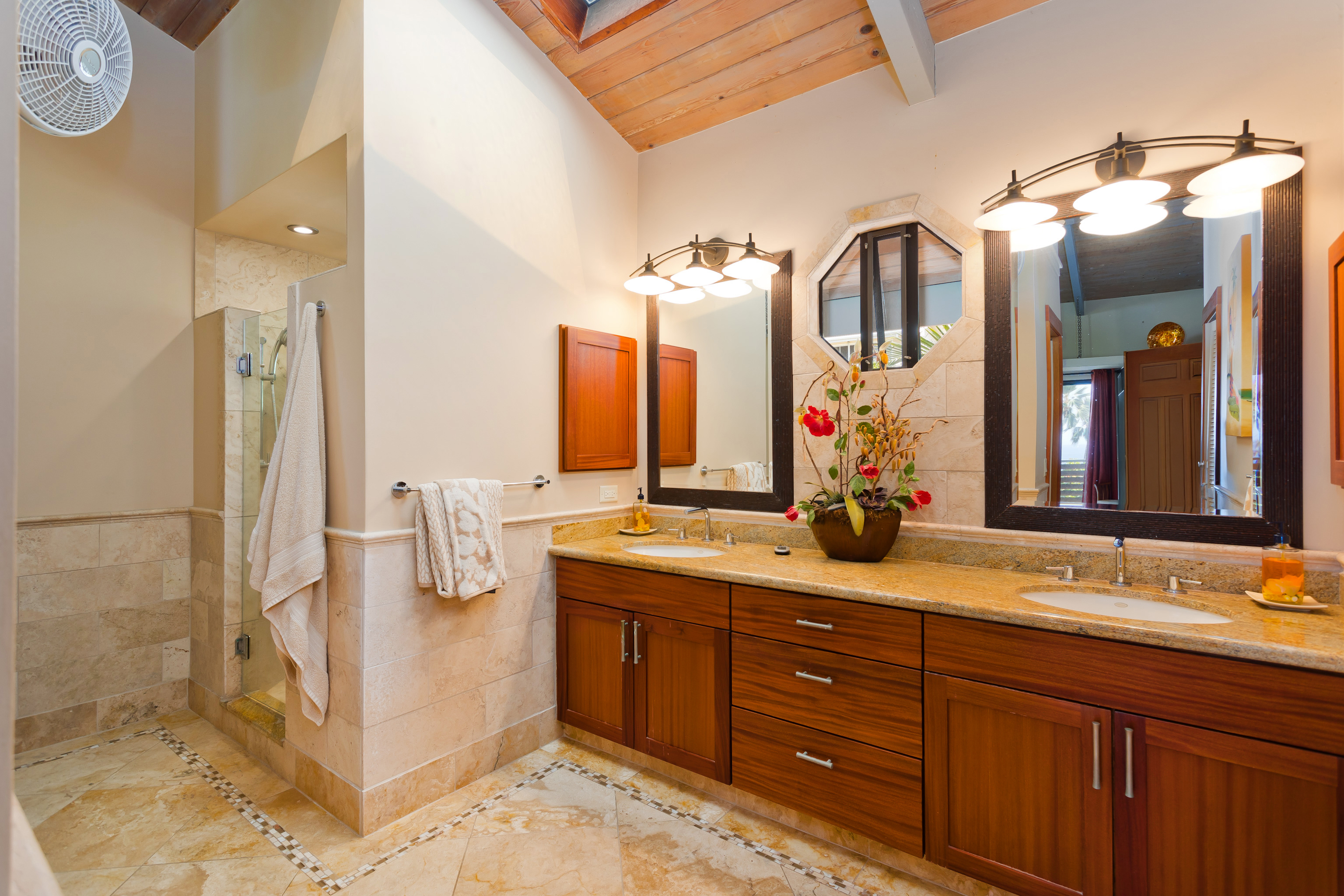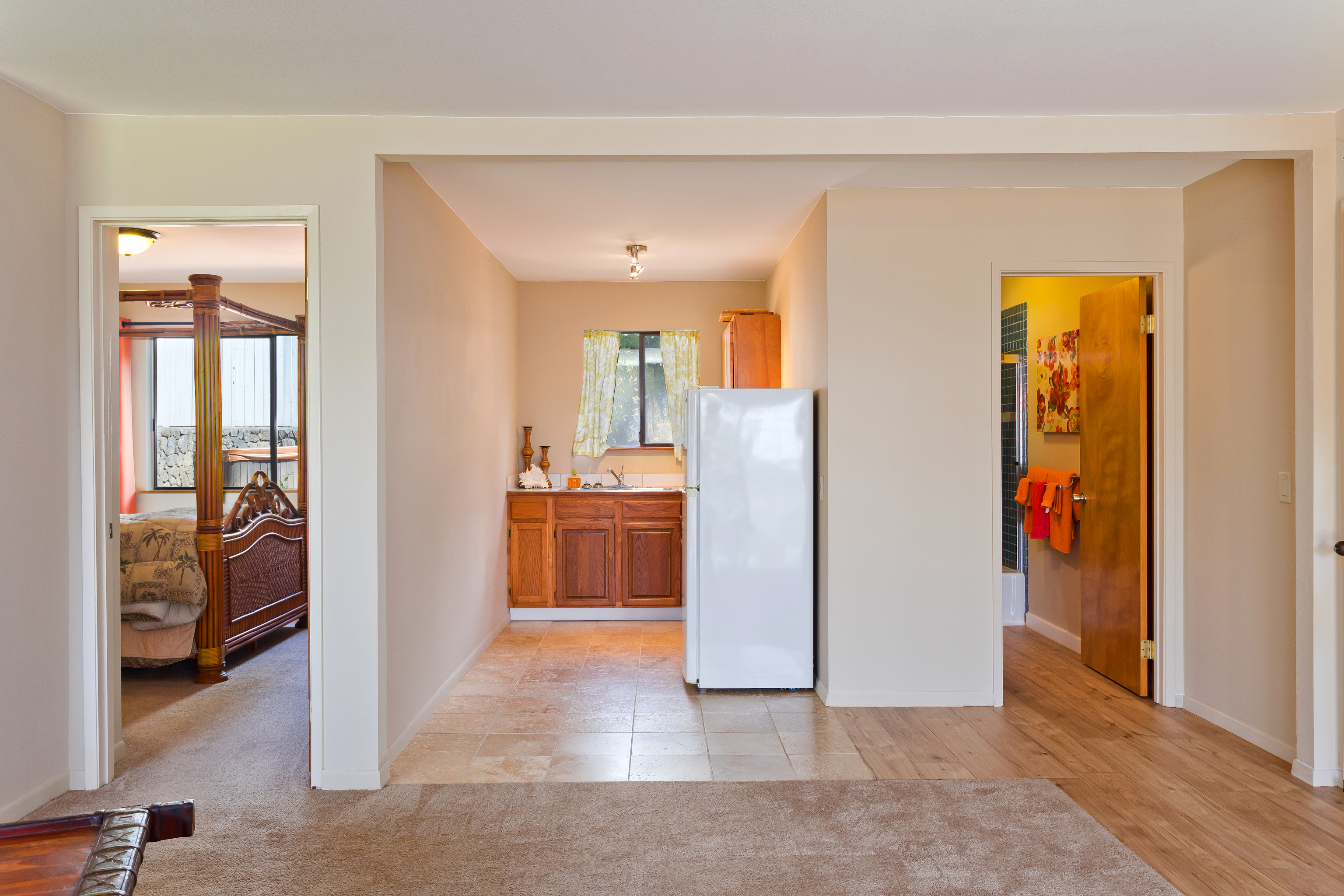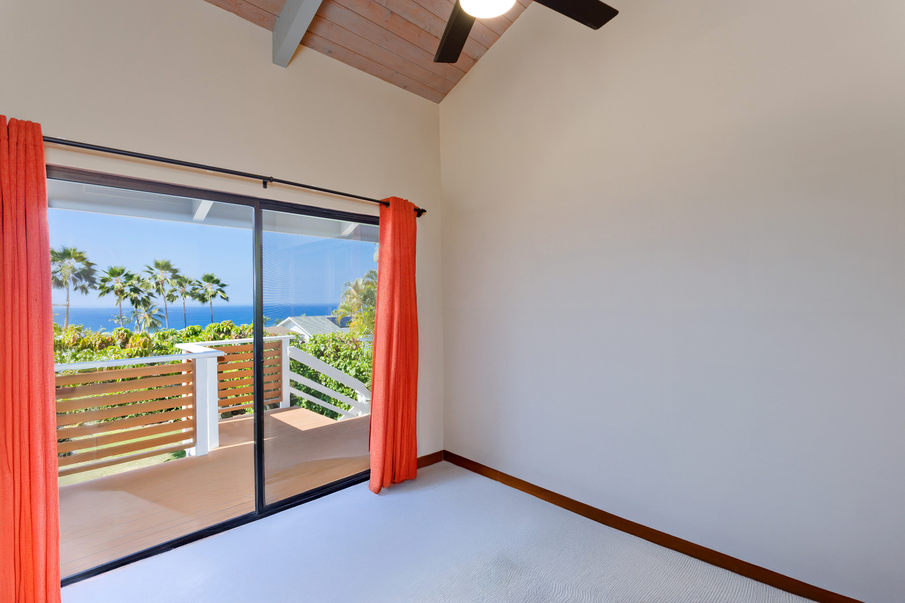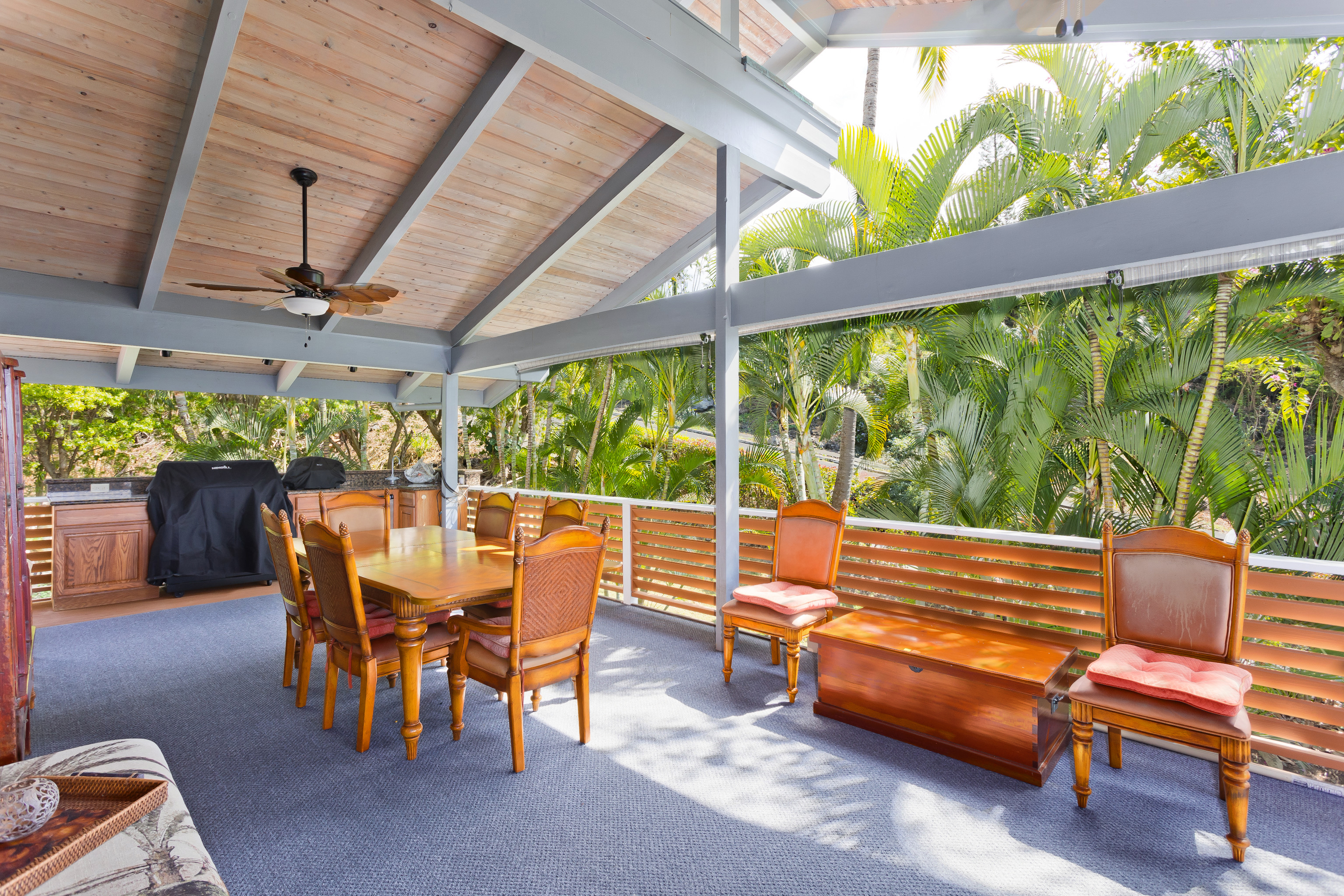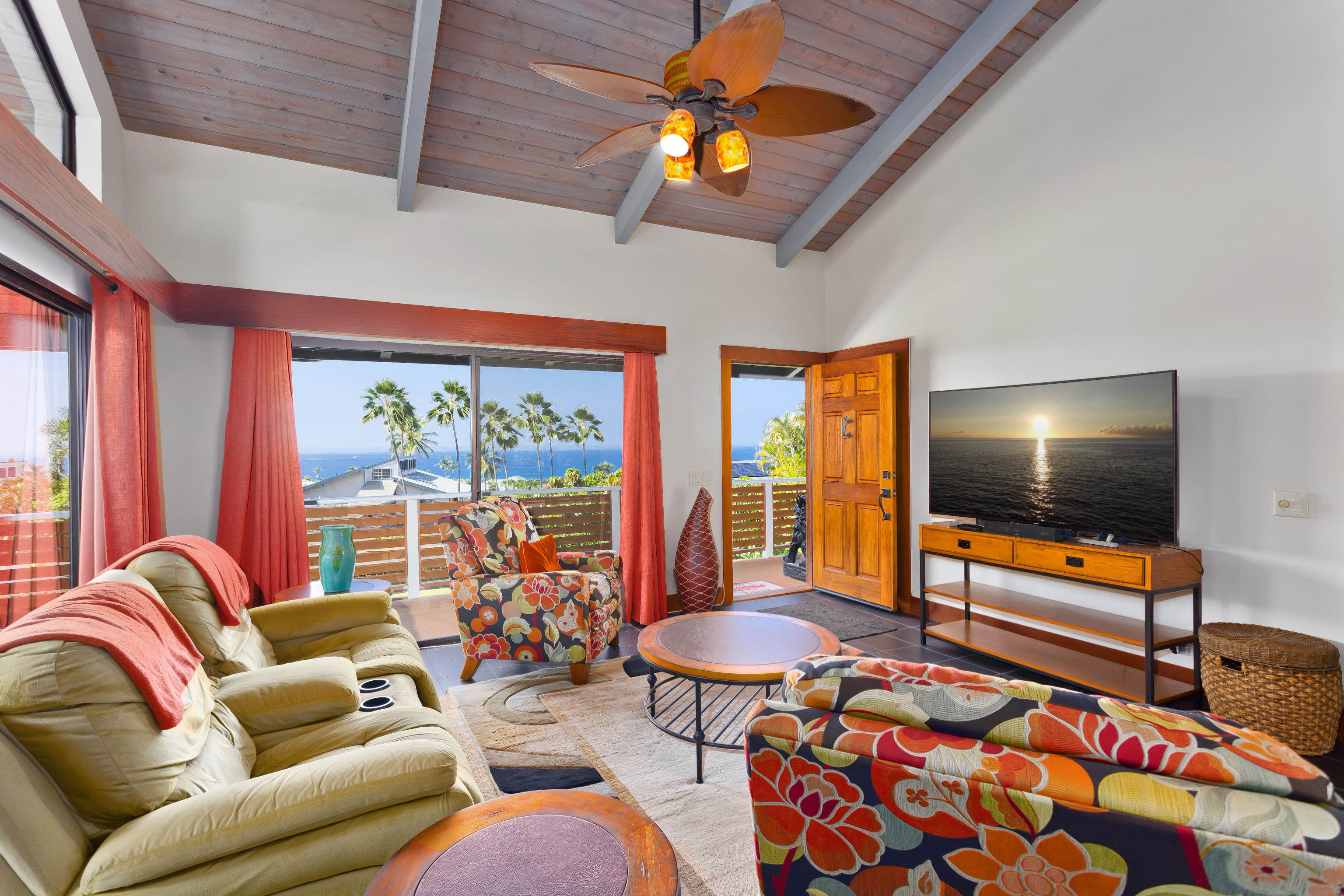 Welcome to this impressive and updated 2 story 4 bedroom 3 bath home located in a well established neighborhood & blessed with two separate living areas that graces a large corner lot, fringed on three sides with privacy trees & hedges. Located at a comfortable elevation of approximately 250', this enviable home overlooks a well tended landscape of lawn & attractive low profile west boundary hedge to an inspiring view of the ocean. This home is energy efficient & comes with an owned & net metered photovoltaic system together with two solar hot water systems with 120*2 gallon reservoirs respectively. Other notable features include:- Upper level:- * 3bd/2ba with 1400 sqft of living area & a wraparound covered lanai of 968 sqft. * Resplendent tiger wood flooring in the kitchen & dining area together with eye-catching black slate living room flooring. * Travertine tiled bathroom floors & showers. * High open beam T&G cedar ceilings. * Mahogany kitchen cabinetry & paneling. * Top of the line kitchen appliances. * Attractive granite kitchen counters & bathroom vanities. * Large entertainment area encompassing the southern end of the covered lanai. Complete with BBQ grill, granite counter space, refrigerator & sink. Ground Floor:- * A living area of 672 sqft that includes a bedroom, bathroom, living room & wet bar. * A three vehicle garage. * A laundry complete with storage cabinets, counter & sink. Landscape Features:- * Northern, eastern & a portion of the southern boundaries defined by high hedges. * Rockwall along a portion of the north east corner. * A pergola & hot tub on a large cement pad near the north eastern corner of the property. * A producing mango tree. This property is located in well established Komohana Kai 2 subdivision & is approximately 4 miles south of Kailua-Kona & a similar distance north of Keauhou Shopping Center. Video: https://player.vimeo.com/video/1156397614