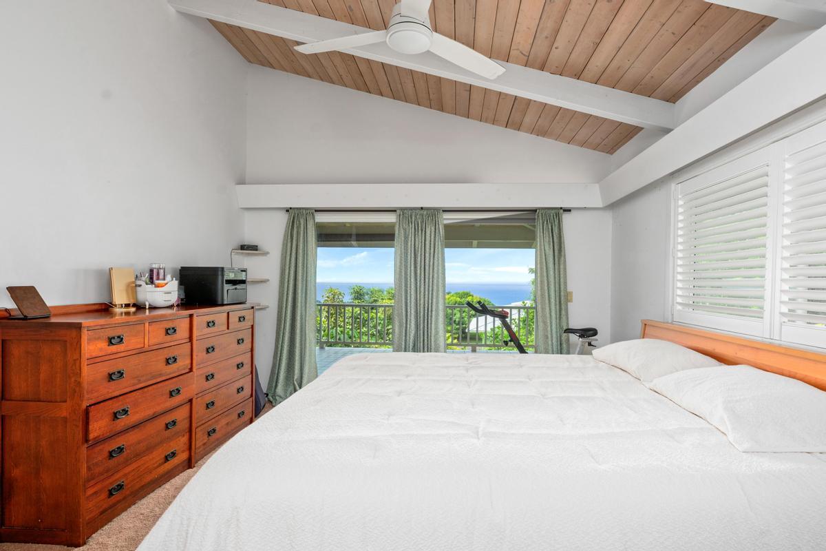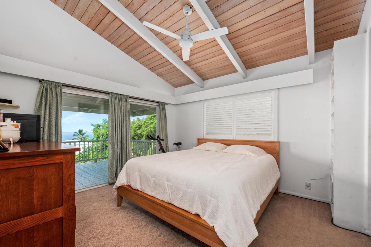 Upstairs (3 bed/2 bath): Main home, Open-concept living with vaulted wood open-beam ceilings, granite kitchen counters, split floor plan with primary and guest rooms separated by living space and large lanai perfect for watching year round sunsets.