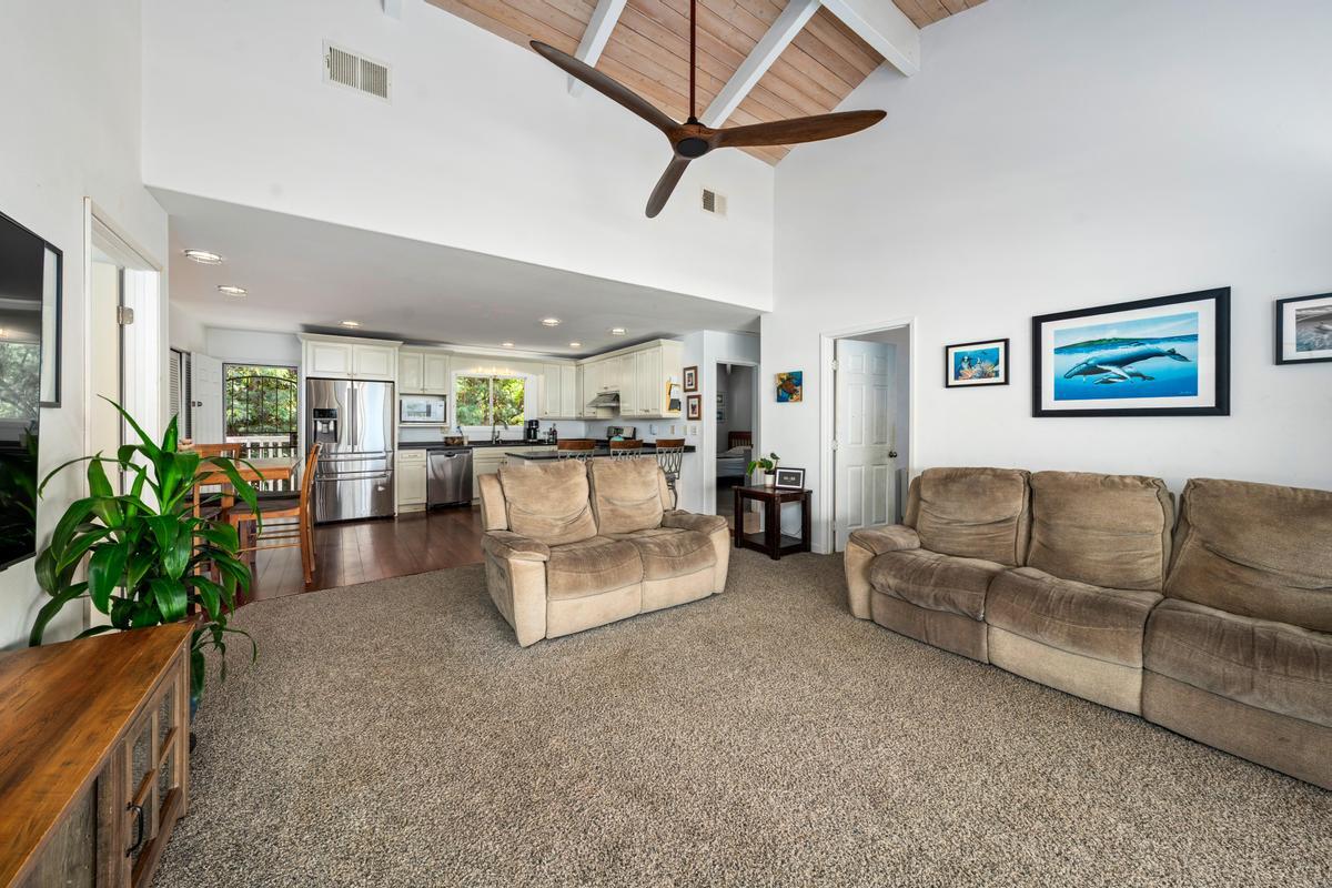 Spacious almost 2,300sf home on a private ~½-acre flag lot with mature trees and a nice grassy fenced yard. Features two separate living areas with ocean views from both levels.