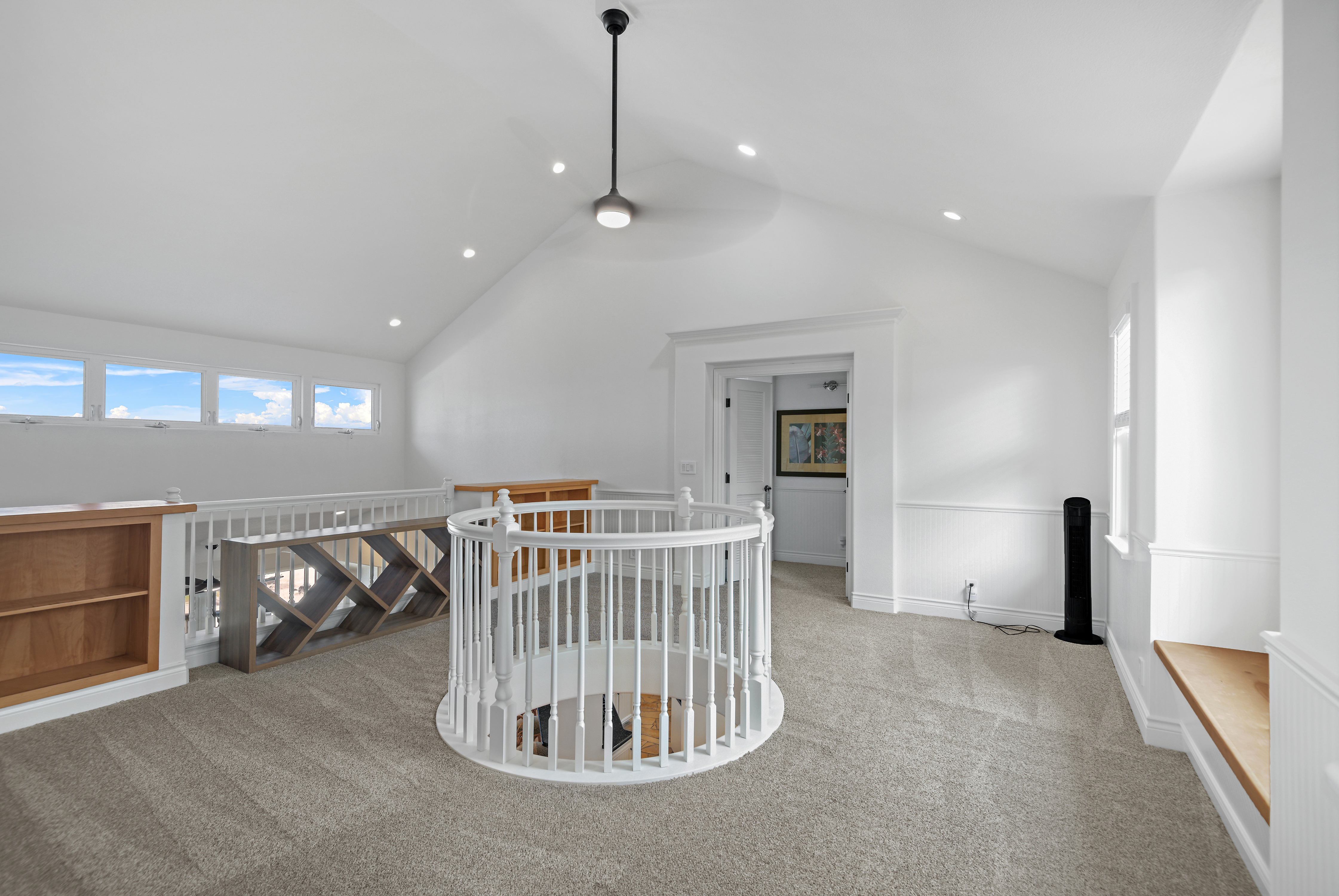 The Great Room, with soaring ceilings and sweeping ocean views, opens to a spacious wraparound porch designed for dining, lounging, and entertaining against the sound of the Pacific. The kitchen features a large granite island with prep sink, gas stove, walk-in pantry, and generous counter space–all with ocean vistas. A media room adjacent to the Great Room adds even more space for entertainment.