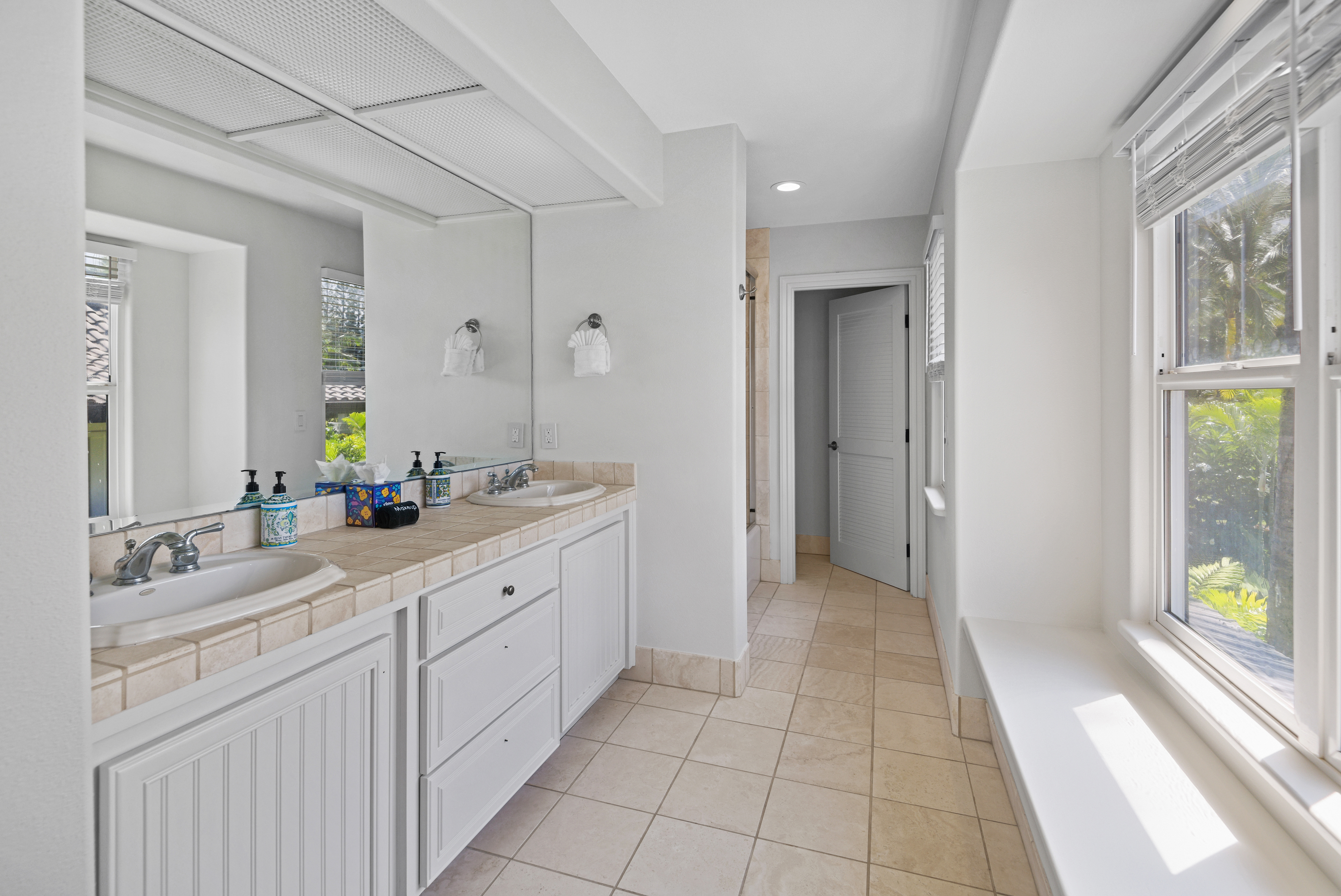 The main-level primary suite offers French doors to a private lanai and a spa-style bath with dual vanities, jetted tub, shower, and walk-in closet. Upstairs, three bedroom suites each include their own ensuite bath, plus an open library and sitting area.