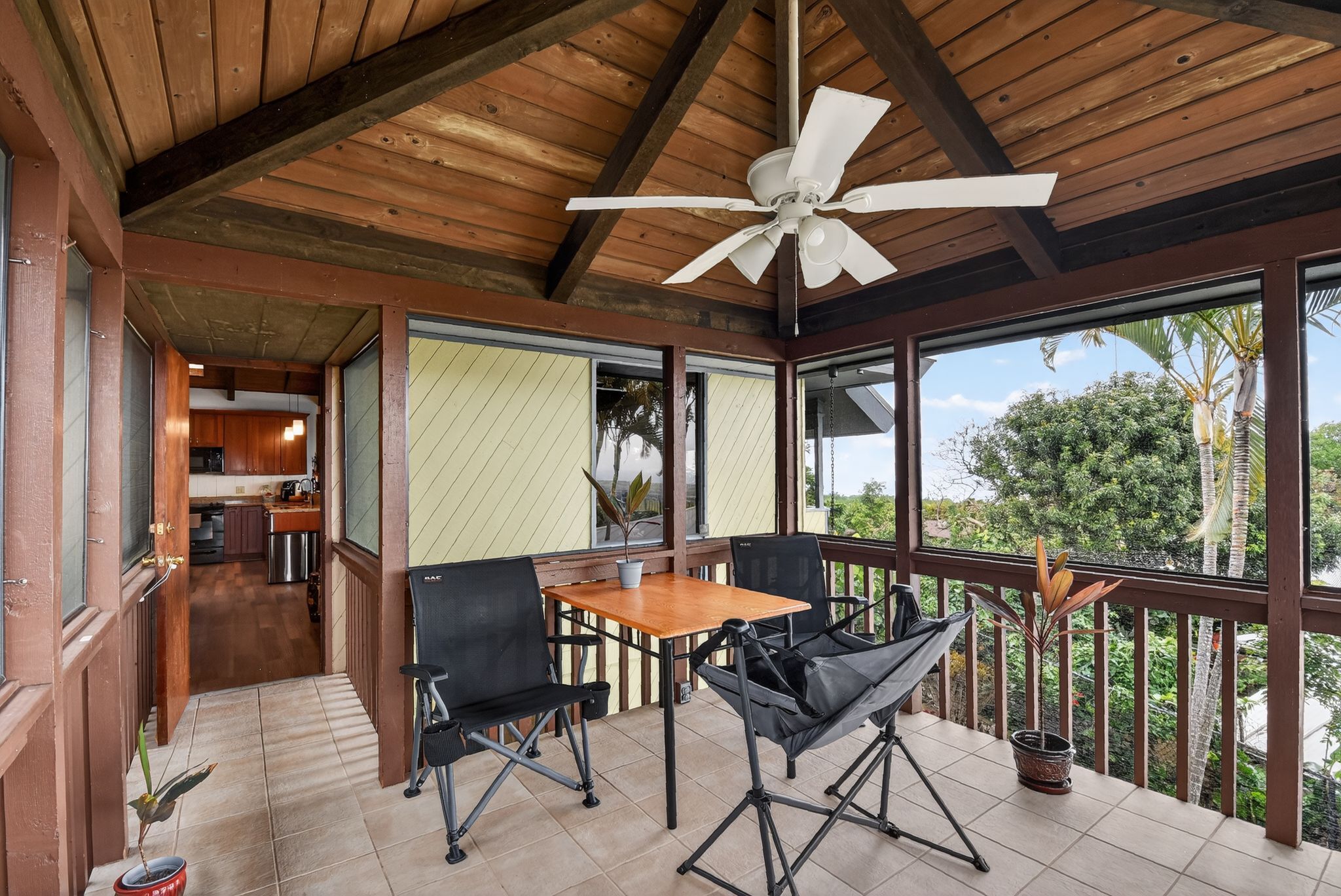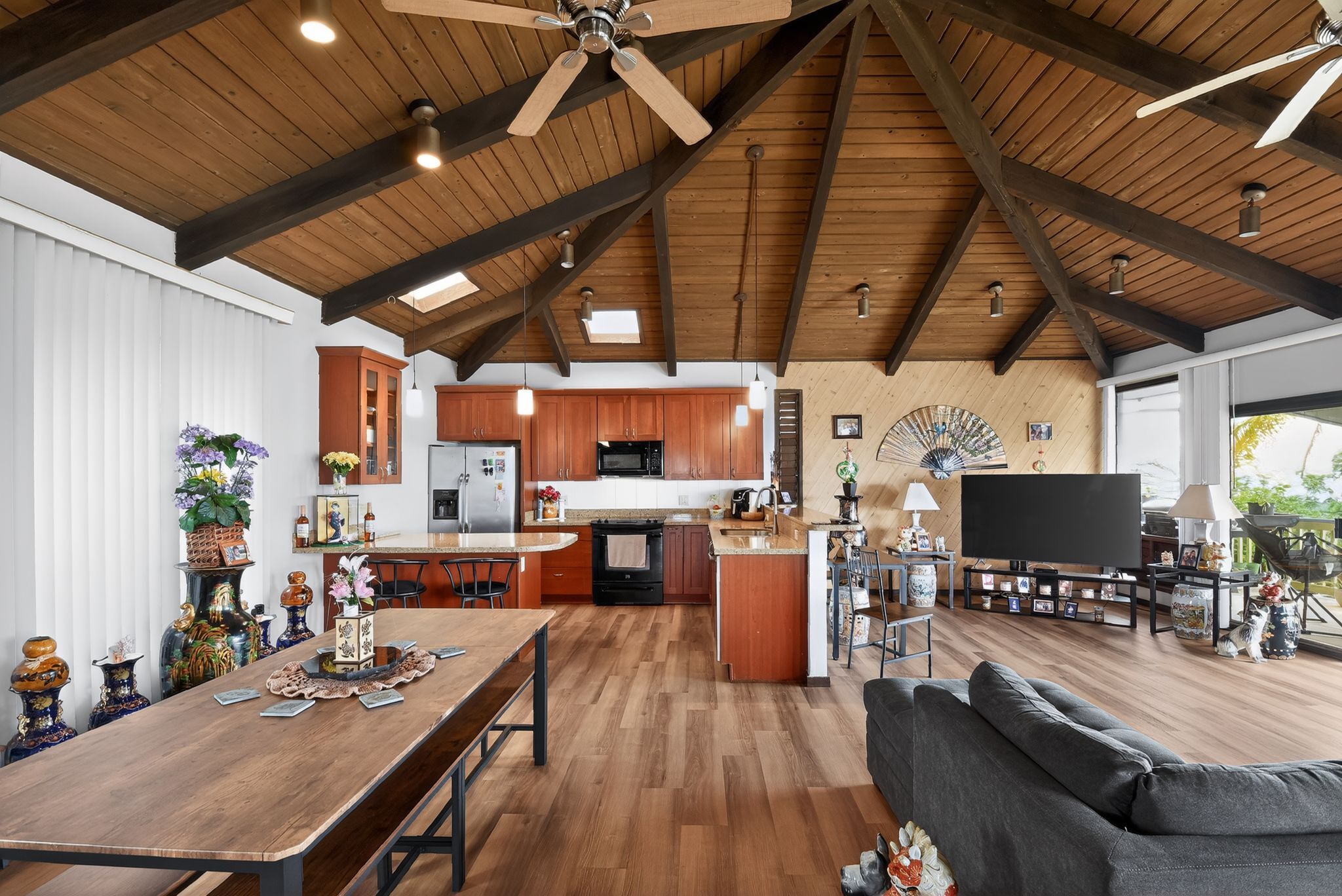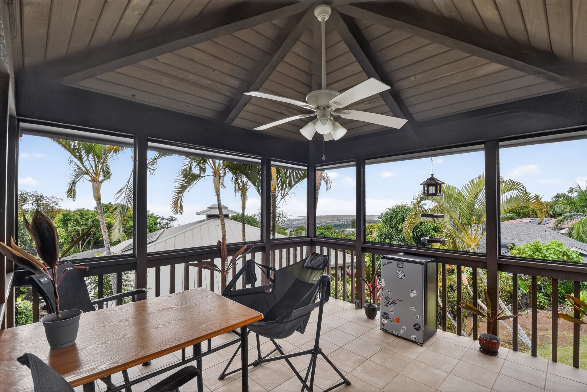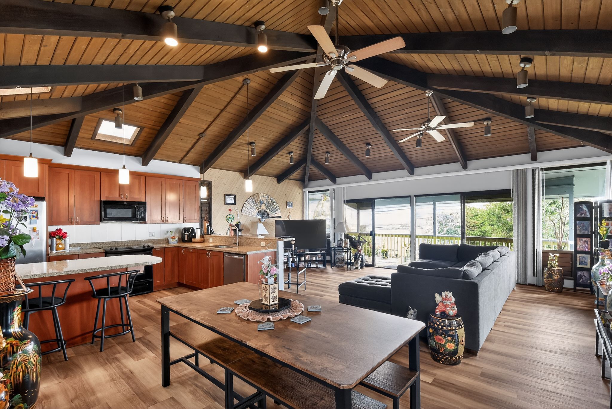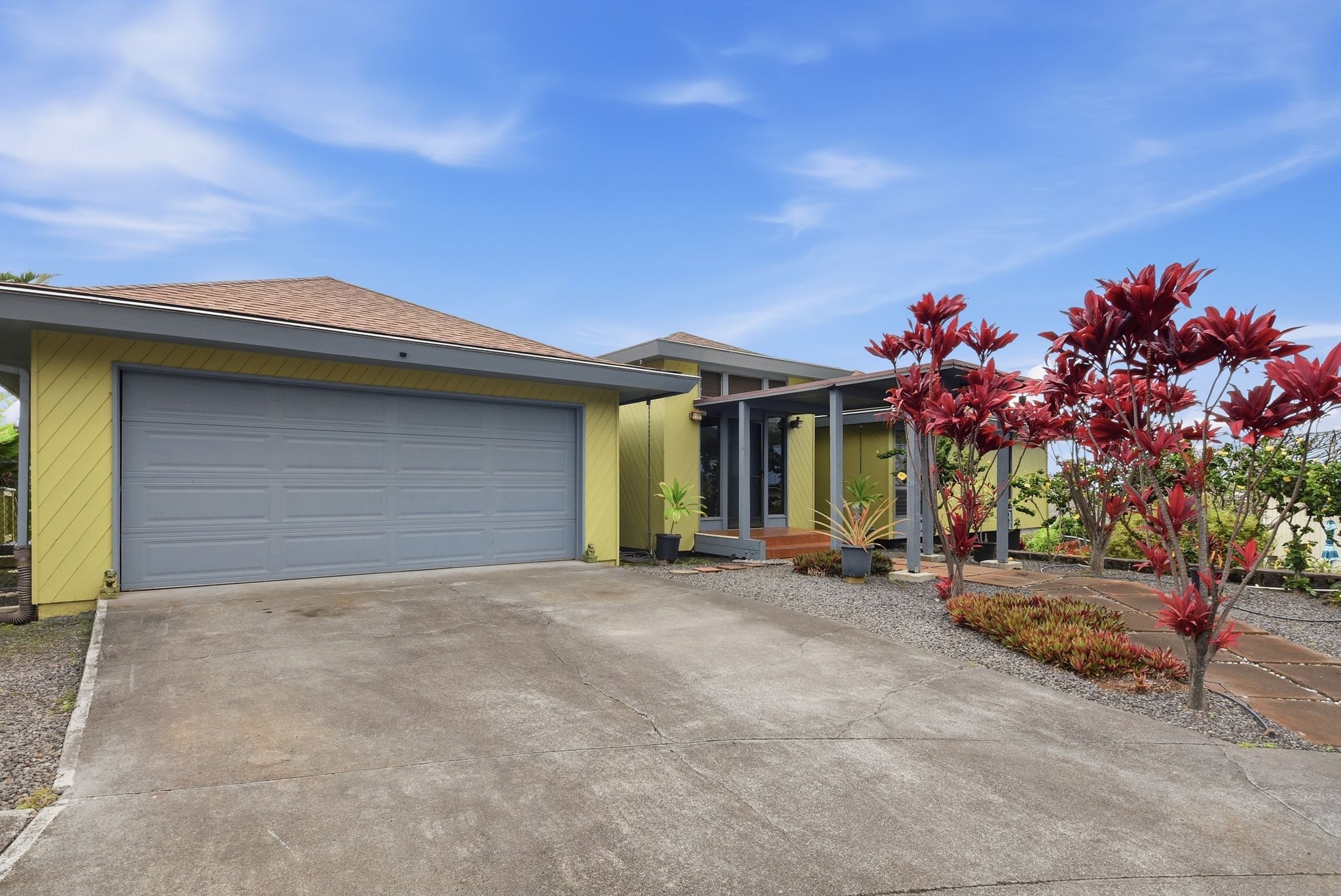 Welcome to 75-5790 Kele Place – a beautifully updated 3-bedroom, 3-full-bath split-level home offering 2,304 sq ft of comfortable living space on an 8,284 sq ft lot, nestled on one of Kona's most peaceful cul-de-sacs. Step inside and you'll immediately notice the unique character this home offers – gorgeous atriums bring the outdoors in, bathing the living spaces in natural light and adding a distinctive architectural touch rarely found in the area. Upstairs features an open concept with vaulted ceilings with the west side of the home lined with sliding glass doors for ocean views and natural light. Newly installed luxury vinyl flooring flows throughout most of the home, giving it a fresh, modern feel while remaining durable and easy to maintain. The kitchen is well-equipped with granite countertops and stainless steel appliances, making meal prep a pleasure. Two of the three bathrooms have been newly remodeled, offering clean, contemporary finishes that are move-in ready. One of the home's true standout features is the expansive lower level – a massive family room that can flex as a playroom, game room, home theater, or whatever your lifestyle demands. It's the kind of space that makes this home truly versatile for families of all sizes. Outside, the extensive lanai is your front-row seat to stunning Kona evening sunsets – the perfect spot to unwind after a day in paradise. The primary bedroom features its very own screened-in lanai, a private sanctuary where you can curl up with a good book and a fresh cup of world-famous Kona Coffee while taking in the gentle island breeze. The automatic irrigated fenced yard with grassy area for the children to play adds privacy and peace of mind, completing this wonderful outdoor living package. A 2-car garage rounds out this exceptional property, offers ample storage and parking. With its unique layout, thoughtful updates, and unbeatable Kona lifestyle, 75-5790 Kele Place is a rare gem you won't want to miss.