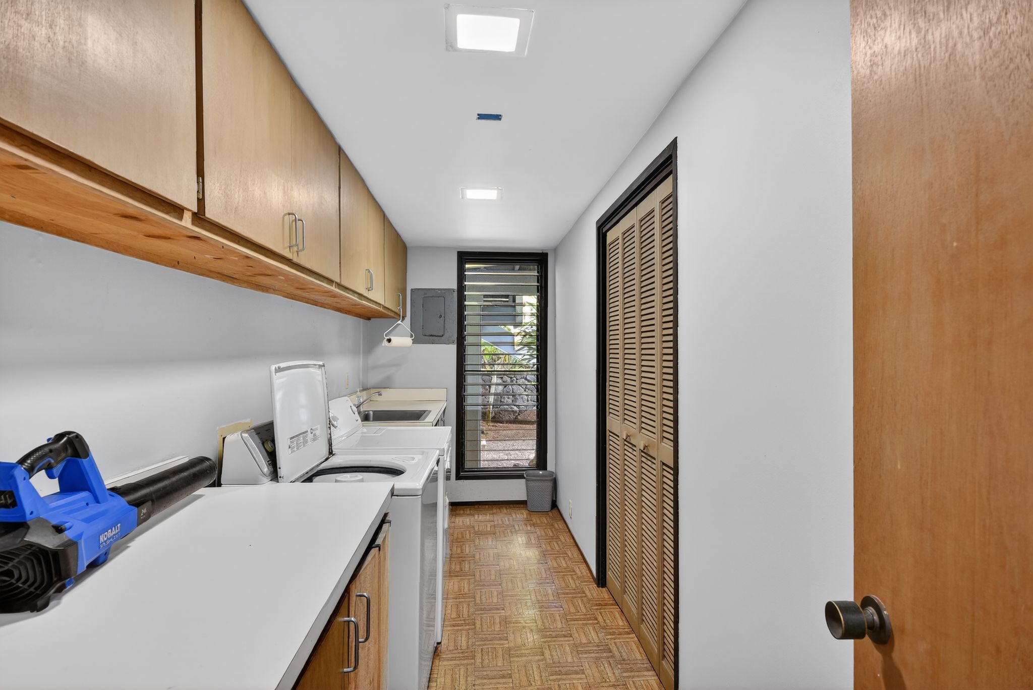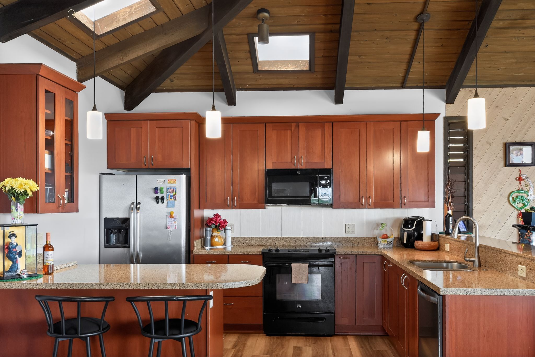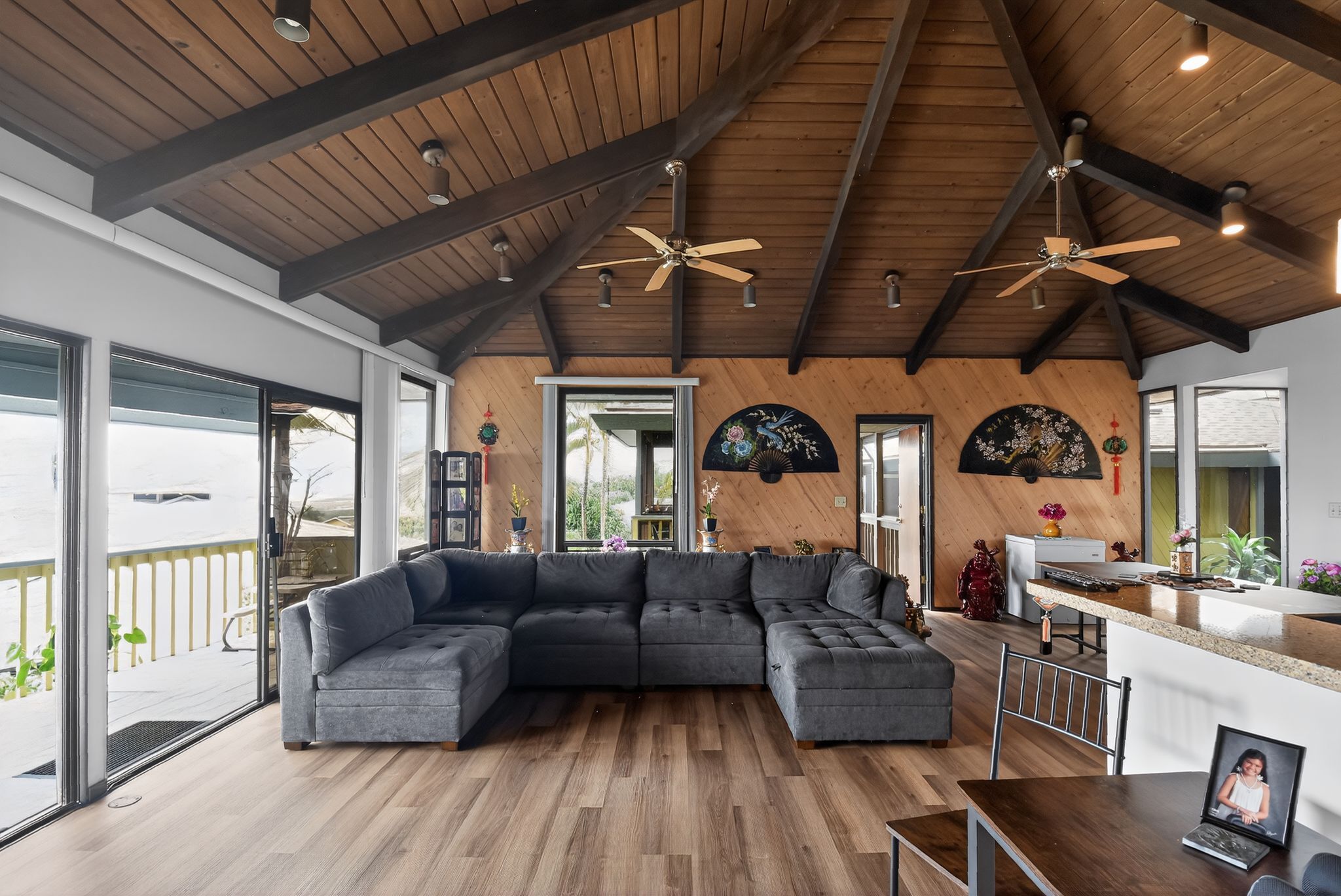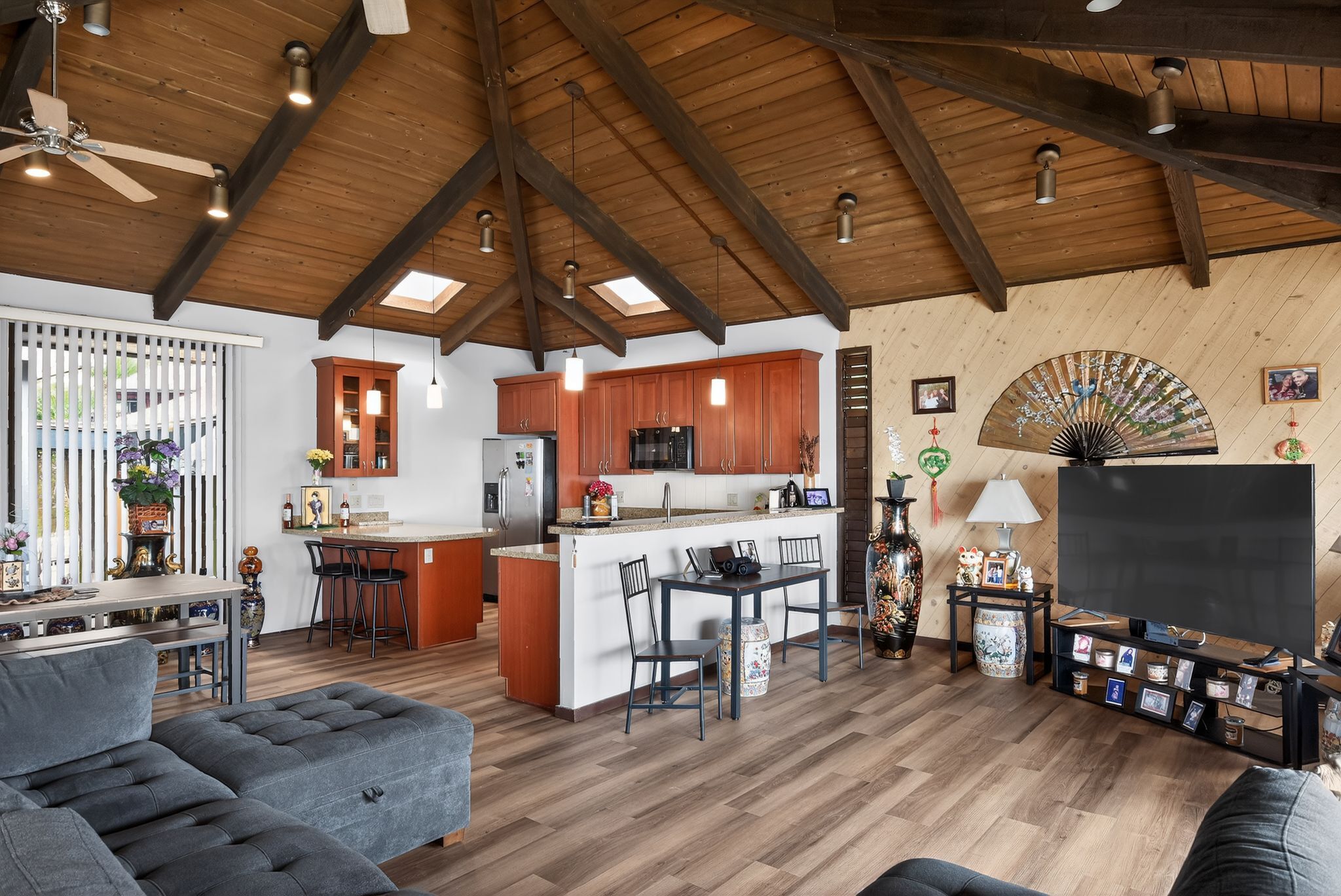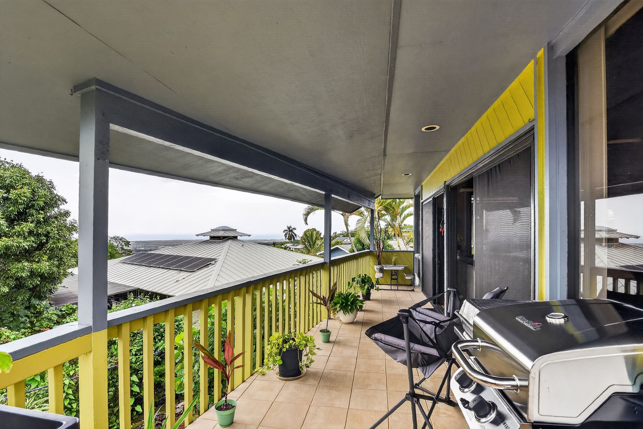 Welcome to 75-5790 Kele Place – a beautifully updated 3-bedroom, 3-full-bath split-level home offering 2,304 sq ft of comfortable living space on an 8,284 sq ft lot, nestled on one of Kona's most peaceful cul-de-sacs. Step inside and you'll immediately notice the unique character this home offers – gorgeous atriums bring the outdoors in, bathing the living spaces in natural light and adding a distinctive architectural touch rarely found in the area. Upstairs features an open concept with vaulted ceilings with the west side of the home lined with sliding glass doors for ocean views and natural light. Newly installed luxury vinyl flooring flows throughout most of the home, giving it a fresh, modern feel while remaining durable and easy to maintain. The kitchen is well-equipped with granite countertops and stainless steel appliances, making meal prep a pleasure. Two of the three bathrooms have been newly remodeled, offering clean, contemporary finishes that are move-in ready. One of the home's true standout features is the expansive lower level – a massive family room that can flex as a playroom, game room, home theater, or whatever your lifestyle demands. It's the kind of space that makes this home truly versatile for families of all sizes. Outside, the extensive lanai is your front-row seat to stunning Kona evening sunsets – the perfect spot to unwind after a day in paradise. The primary bedroom features its very own screened-in lanai, a private sanctuary where you can curl up with a good book and a fresh cup of world-famous Kona Coffee while taking in the gentle island breeze. The automatic irrigated fenced yard with grassy area for the children to play adds privacy and peace of mind, completing this wonderful outdoor living package. A 2-car garage rounds out this exceptional property, offers ample storage and parking. With its unique layout, thoughtful updates, and unbeatable Kona lifestyle, 75-5790 Kele Place is a rare gem you won't want to miss.