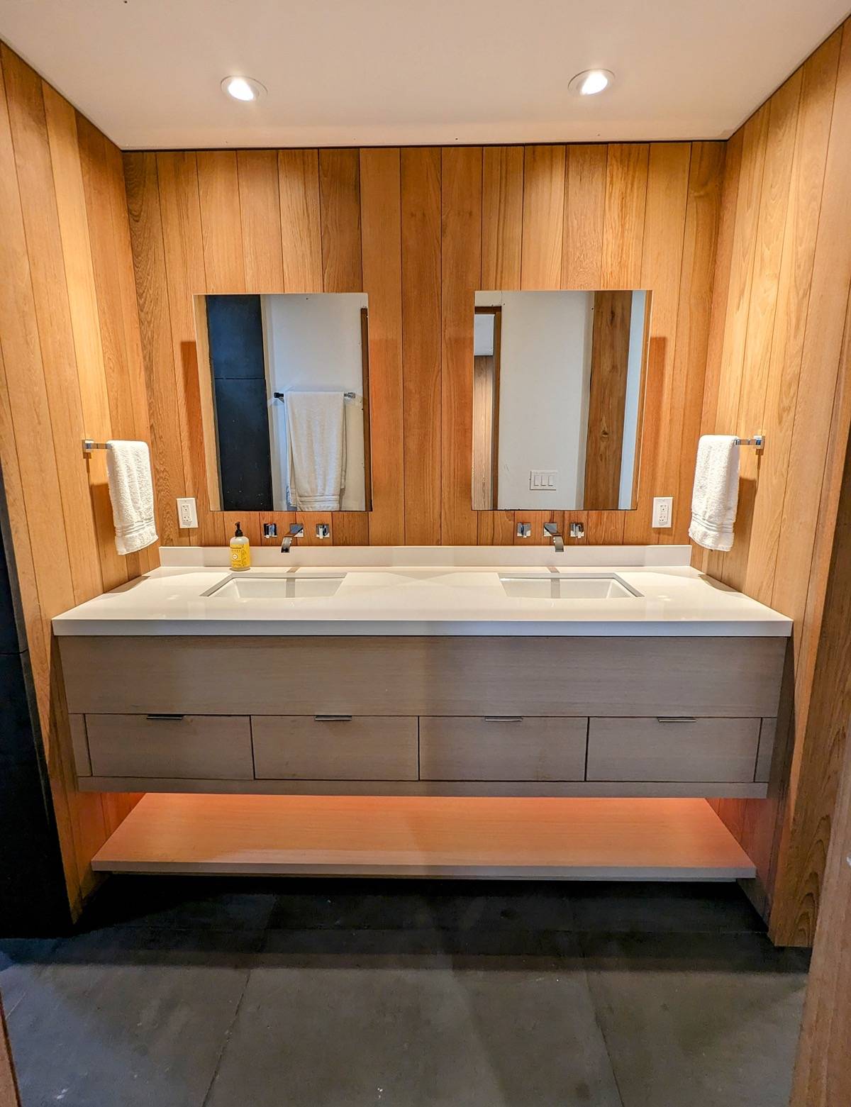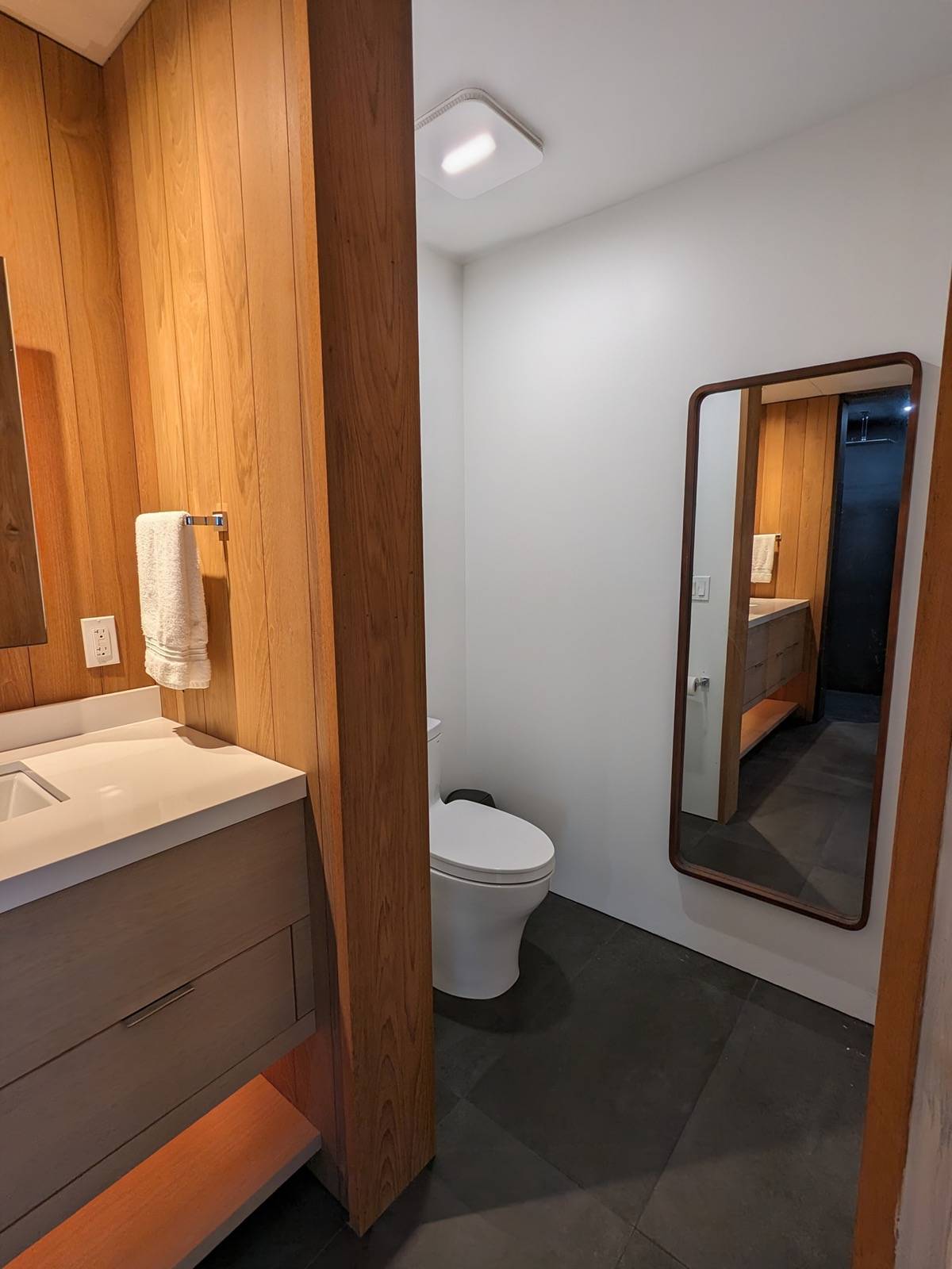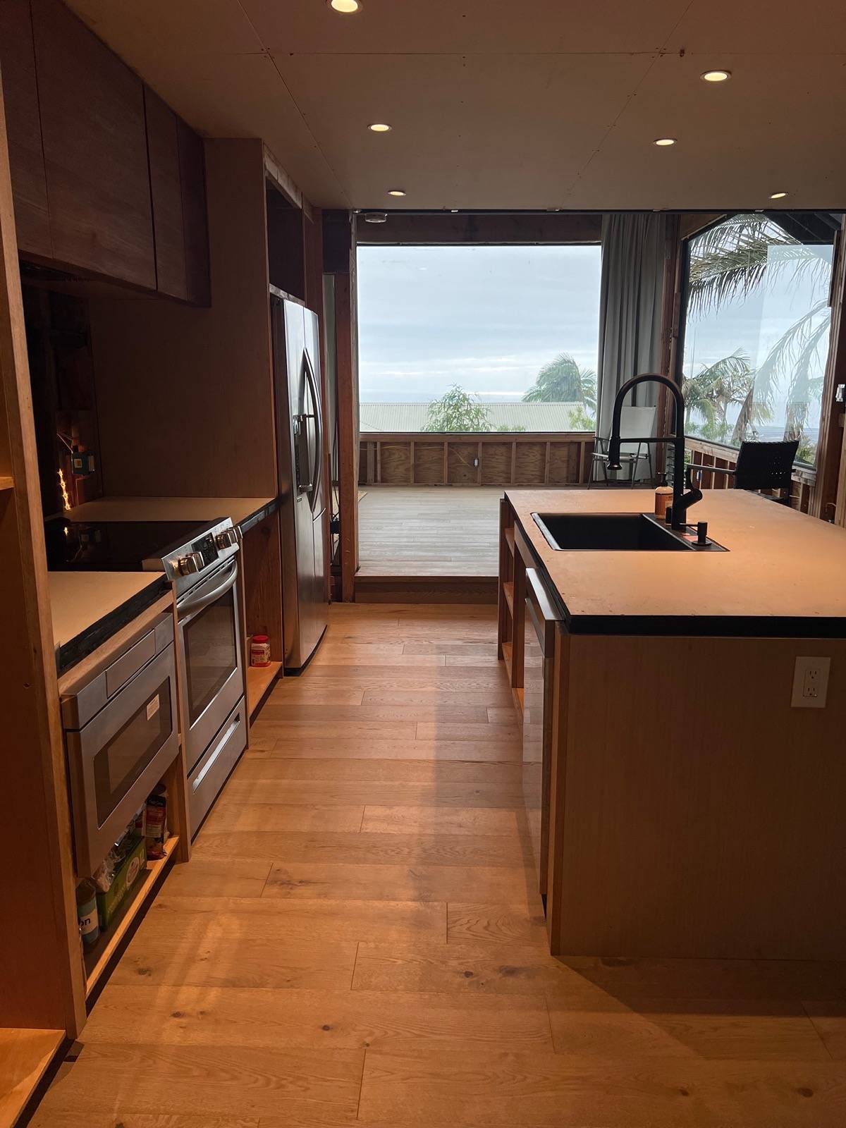 This modern home has many warm touches of wood throughout. The custom kitchen cabinets are made from 1/4 sawn white oak and teak. Teak accents are found in the kitchen, bedroom and bathrooms. Floors are European white oak 8" wide plank. There are top-end Toto toilets in both bathrooms.