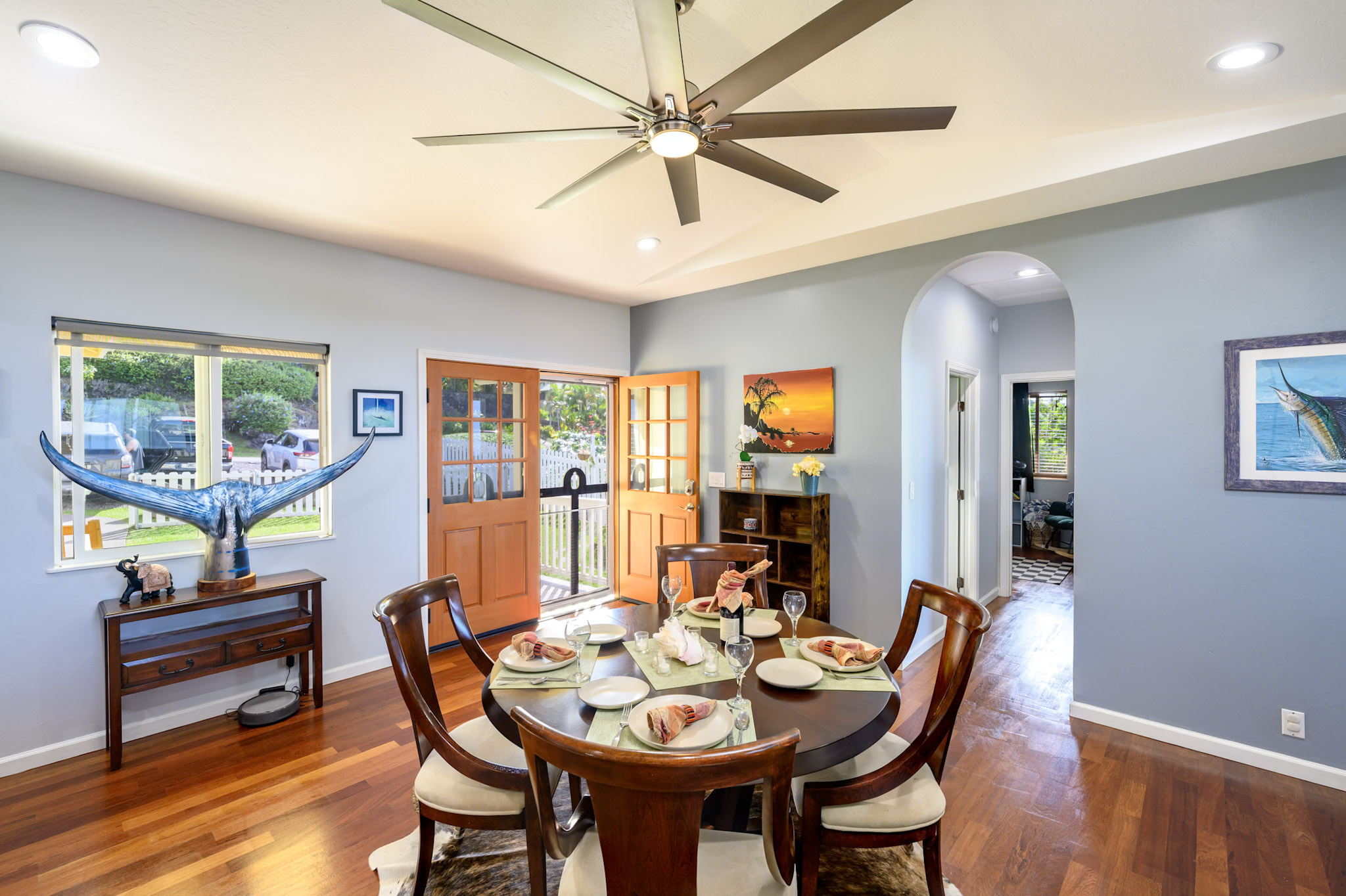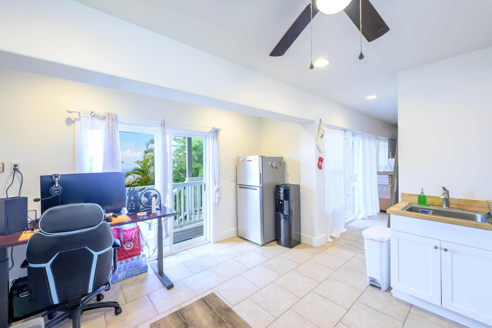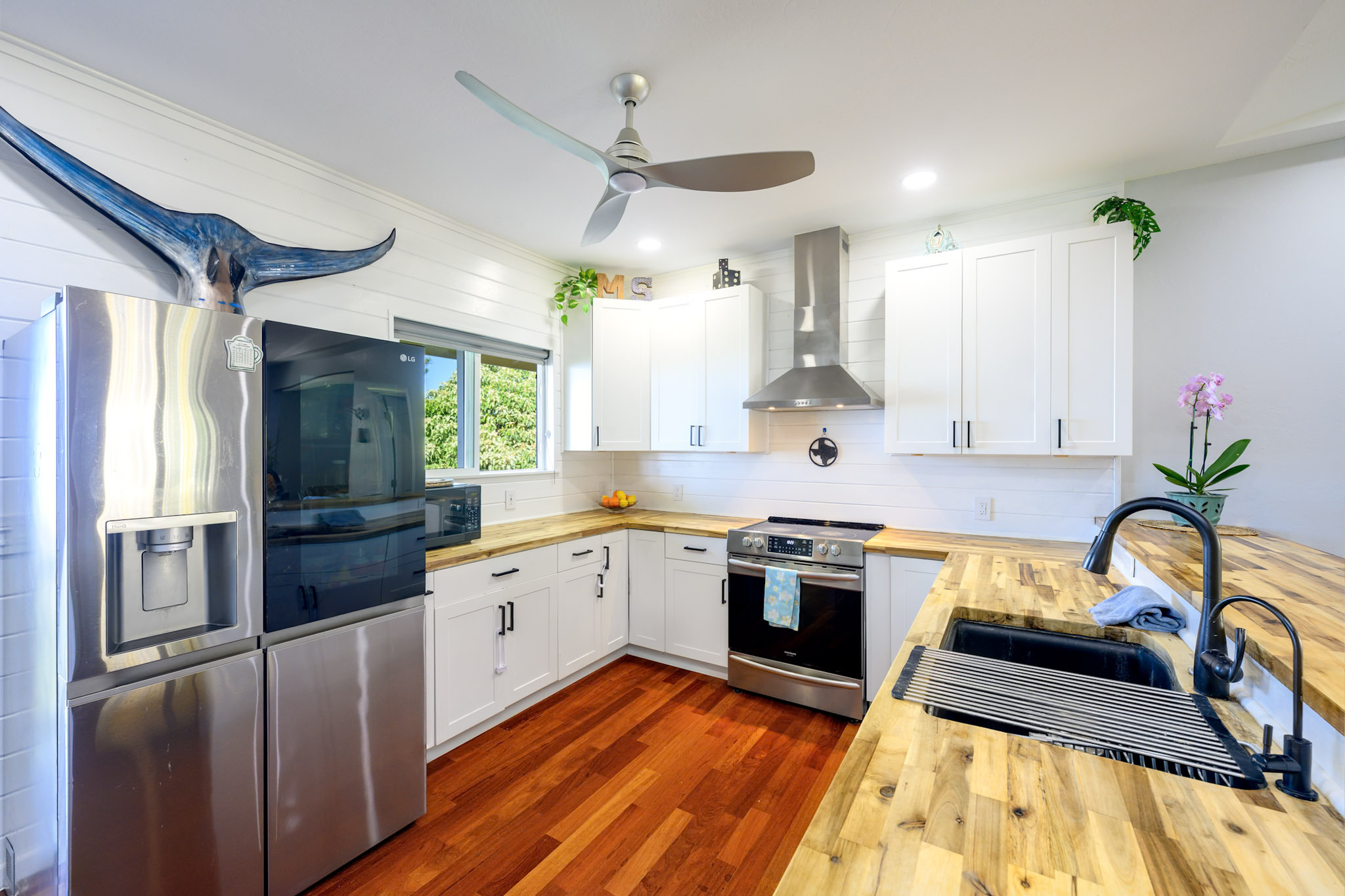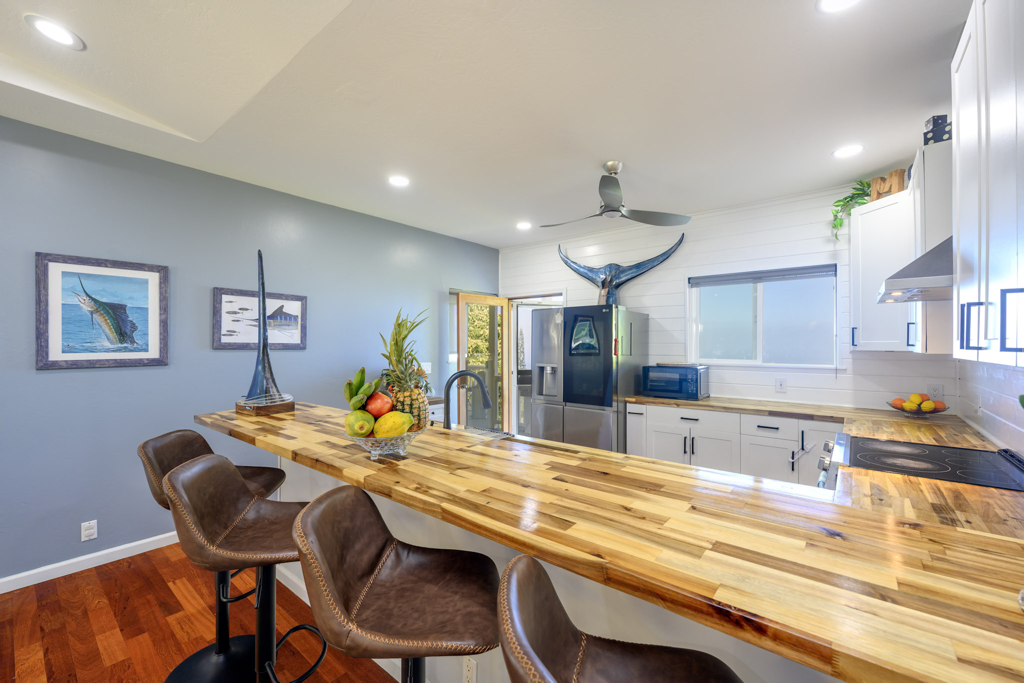 Welcome to the Kona Highlands in Kailua Kona featuring expansive ocean views! This unique property is a dream come true for a family looking to enjoy the beauty and convenience of living in paradise. With cooler temperatures at 1,100-foot elevation, the home is located just 10 minutes from the airport, and close to the beaches, shopping and Kona downtown. Unobstructed views of the Kona coastline. Main Level - 3 bedrooms, 2 bathrooms - Open and renovated kitchen and dining room concept - Fully Remodeled kitchen with beautiful butcher block countertops - Sunken living room — perfect for entertaining guests or relaxing with family - Main floor has solid 3/4” refinished hardwood floors throughout - Spacious lanai to take in the stunning Kona sunsets overlooking the ocean - Laundry area conveniently located in the large garage - Fenced front yard great for pets Lower Level - 1 bed / 1 bath unit - Studio / 1 bath unit - Accessed from the lower lanai, each suite has its own entrance - Additional washer/dryer on the lanai - Perfect for a multi-generational family, or for a potential income source - The lower lanai also has views and a seating area perfect for gatherings or barbecues - Flat lower yard perfect for a garden or pets. Additional Highlights - Huge oversized 600 sqft garage with 15-foot ceiling and 12 x 16-foot roll-up garage door — perfect for cars, boats, gym, or workshop/business - Off-street parking for 6 cars, a rarity for this area. - 22 leased solar photovoltaic panels & solar water heater