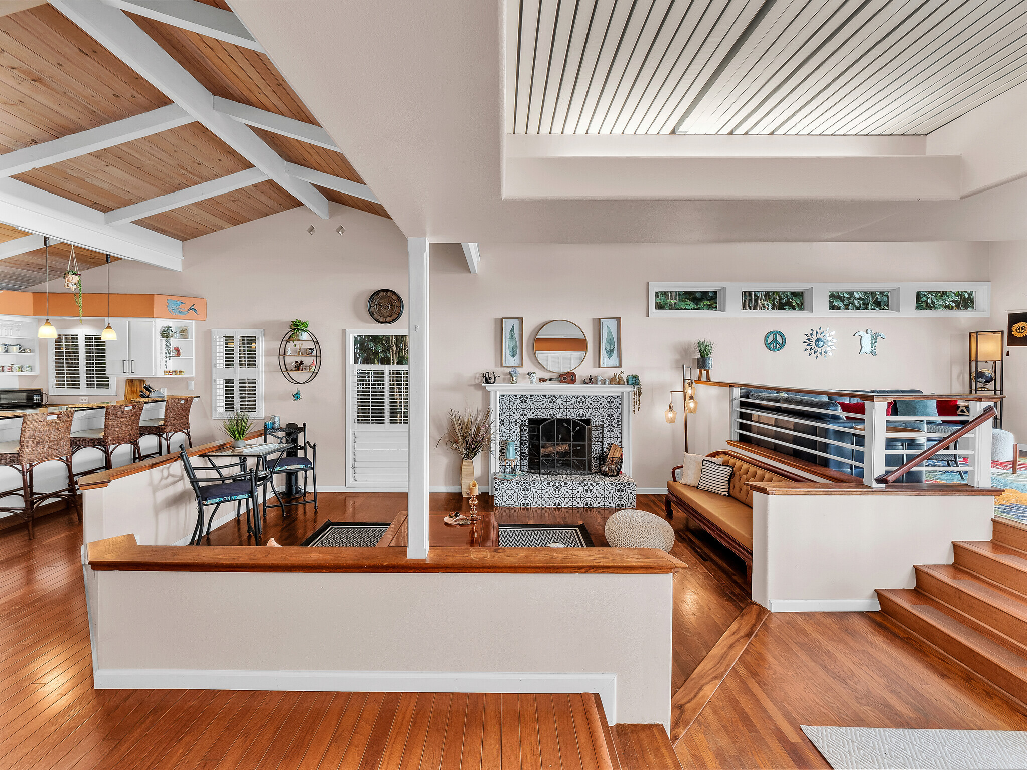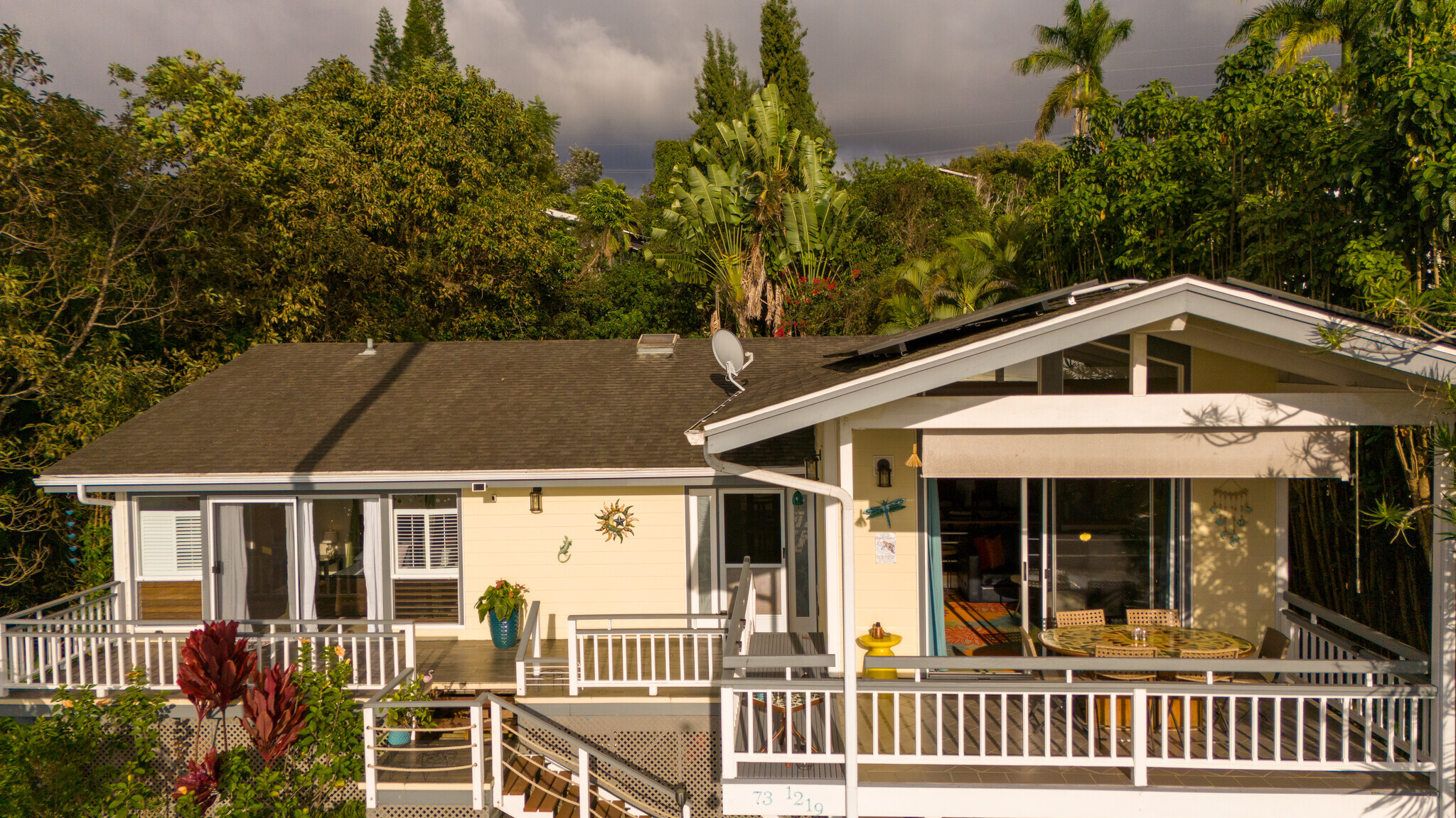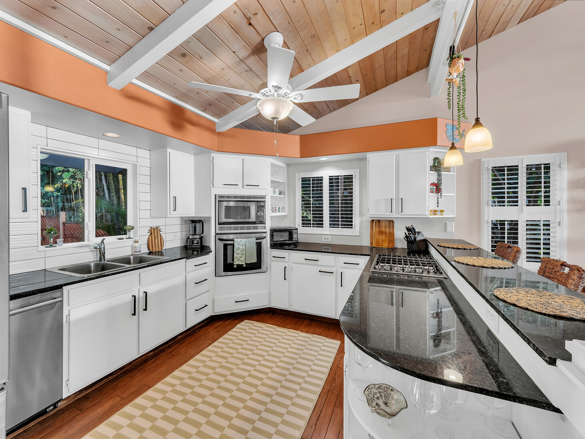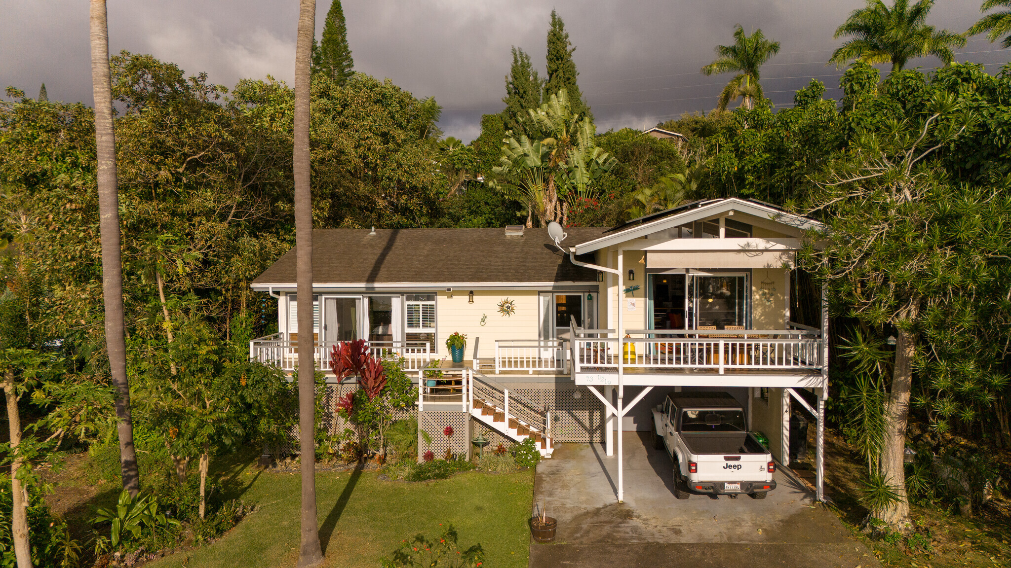 Welcome to Casa Amore, a beautifully custom-built 3-bedroom, 2-bath home featuring soaring vaulted tongue-and-groove ceilings and an open, airy layout designed to embrace indoor-outdoor island living. Rich hardwood floors flow throughout the main living spaces, complemented by a bright kitchen with a gas stove and seamless connection to the dining and living areas. A separate lounge provides a cozy retreat with a wood-burning fireplace, ideal for crisp evenings and relaxed mornings. The spacious primary suite is a true sanctuary, offering an ensuite bath, a generously sized closet, and a separate office well suited for remote work or creative pursuits. A sliding glass door from the bedroom opens directly to the expansive lanai, creating an effortless connection to ocean and sunset views. Two guest bedrooms on the opposite side of the home provide comfortable and flexible accommodations. From the great room, the wraparound lanai offers an ideal setting for entertaining, morning coffee, or evening cocktails against a stunning coastal backdrop. The backyard features an oversized lanai in a private setting, surrounded by mature avocado trees, and rich tropical foliage, along with a fully fenced yard suitable for pets and outdoor living. Offered fully furnished, this turnkey property is ready to enjoy from day one. Additional features include an on-demand water heater, a leased photovoltaic system to help manage electricity costs, and an enclosed washer and dryer located off the back lanai. The carport and storage area below offer flexibility, with potential to be enclosed as a garage or expanded to create additional living space. Situated at a comfortable, cooler elevation, the property enjoys close proximity to white-sand beaches, dining, shopping, Costco, Kona International Airport, and downtown Kailua-Kona. Private, lush, and thoughtfully designed, Casa Amore captures the essence of relaxed island living.