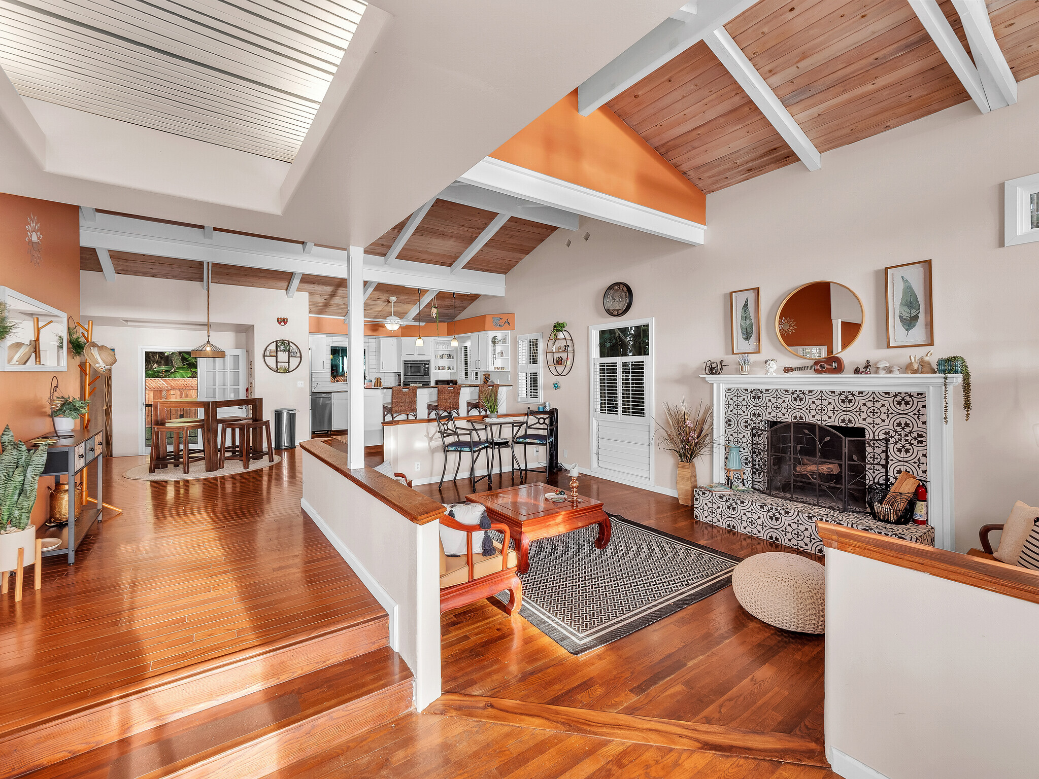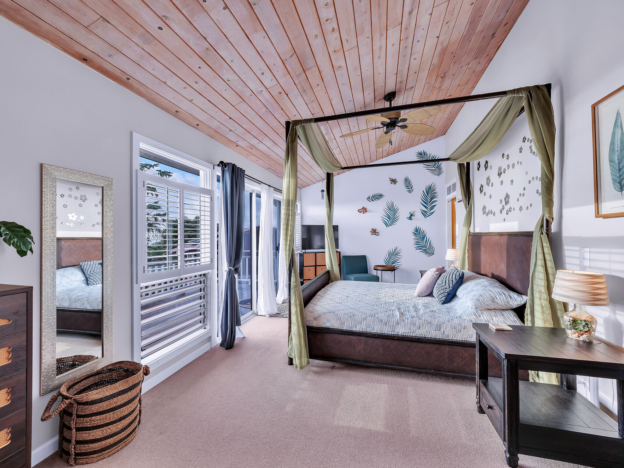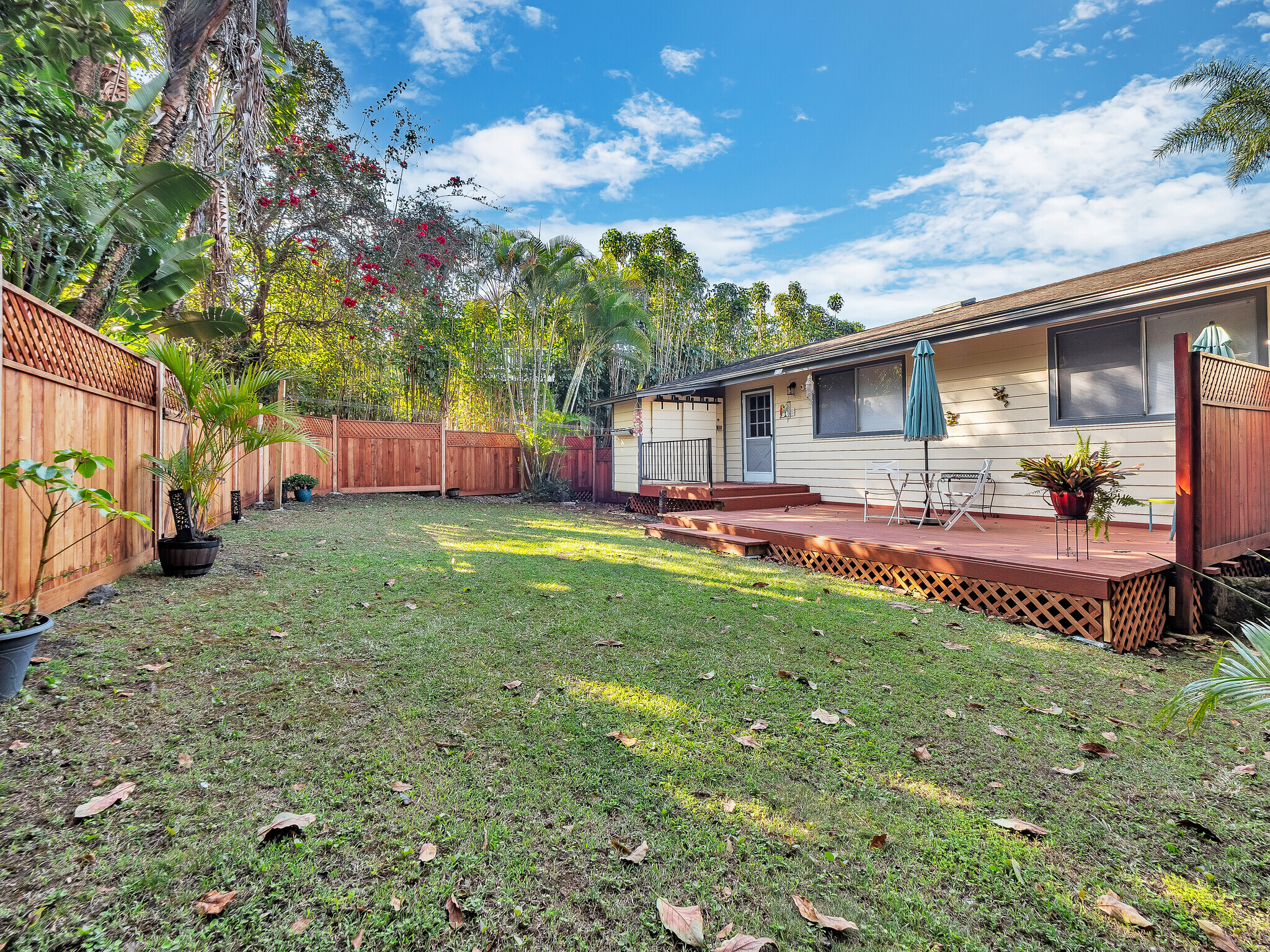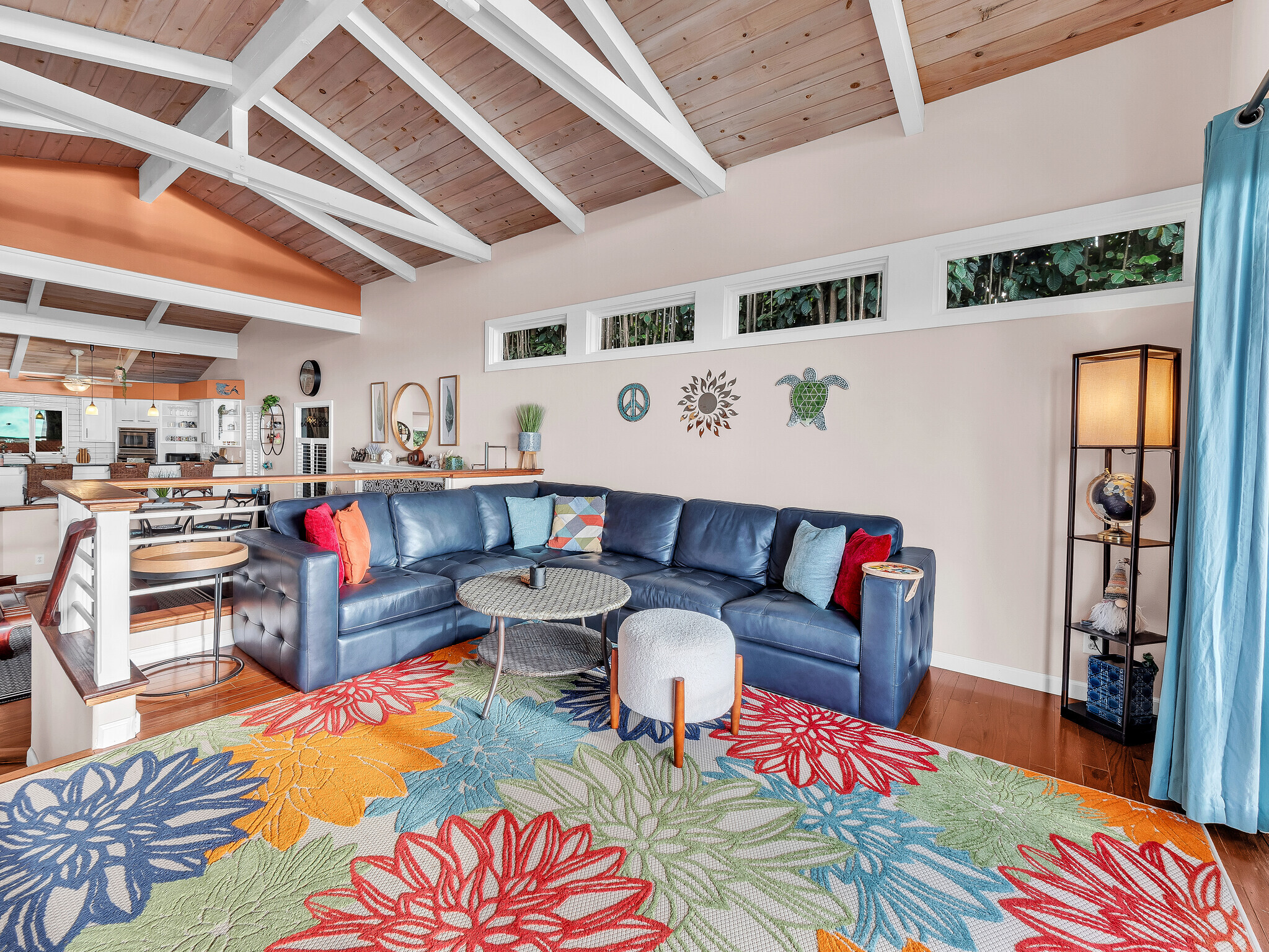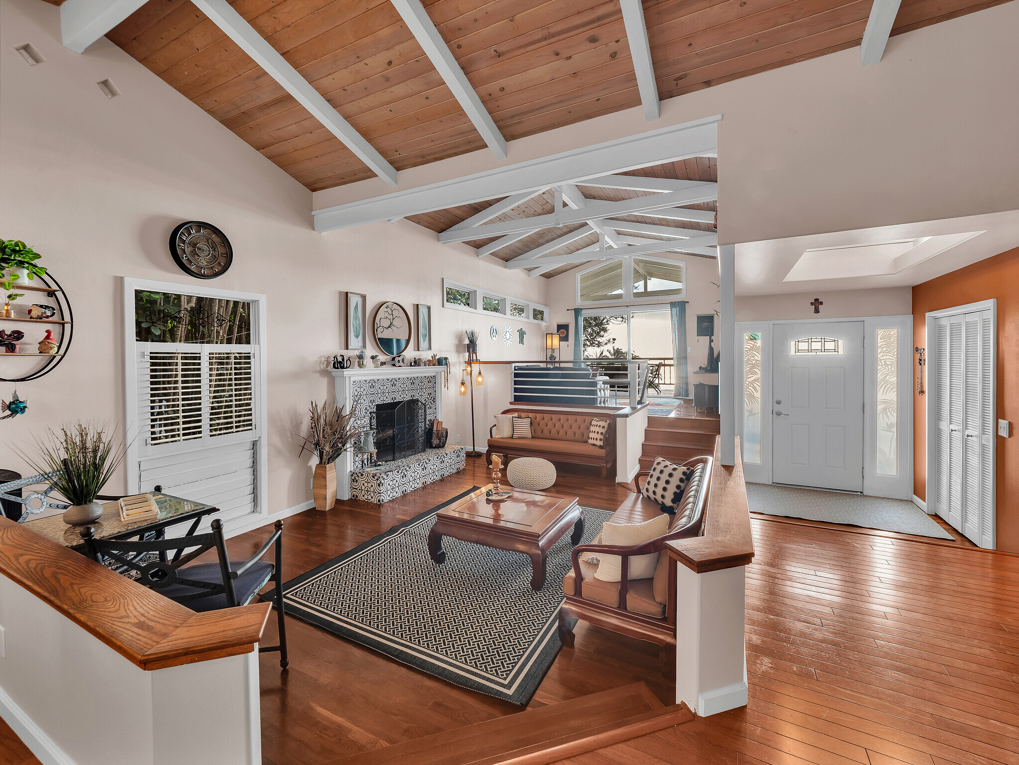 Welcome to Casa Amore, a beautifully custom-built 3-bedroom, 2-bath home featuring soaring vaulted tongue-and-groove ceilings and an open, airy layout designed to embrace indoor-outdoor island living. Rich hardwood floors flow throughout the main living spaces, complemented by a bright kitchen with a gas stove and seamless connection to the dining and living areas. A separate lounge provides a cozy retreat with a wood-burning fireplace, ideal for crisp evenings and relaxed mornings. The spacious primary suite is a true sanctuary, offering an ensuite bath, a generously sized closet, and a separate office well suited for remote work or creative pursuits. A sliding glass door from the bedroom opens directly to the expansive lanai, creating an effortless connection to ocean and sunset views. Two guest bedrooms on the opposite side of the home provide comfortable and flexible accommodations. From the great room, the wraparound lanai offers an ideal setting for entertaining, morning coffee, or evening cocktails against a stunning coastal backdrop. The backyard features an oversized lanai in a private setting, surrounded by mature avocado trees, and rich tropical foliage, along with a fully fenced yard suitable for pets and outdoor living. Offered fully furnished, this turnkey property is ready to enjoy from day one. Additional features include an on-demand water heater, a leased photovoltaic system to help manage electricity costs, and an enclosed washer and dryer located off the back lanai. The carport and storage area below offer flexibility, with potential to be enclosed as a garage or expanded to create additional living space. Situated at a comfortable, cooler elevation, the property enjoys close proximity to white-sand beaches, dining, shopping, Costco, Kona International Airport, and downtown Kailua-Kona. Private, lush, and thoughtfully designed, Casa Amore captures the essence of relaxed island living.