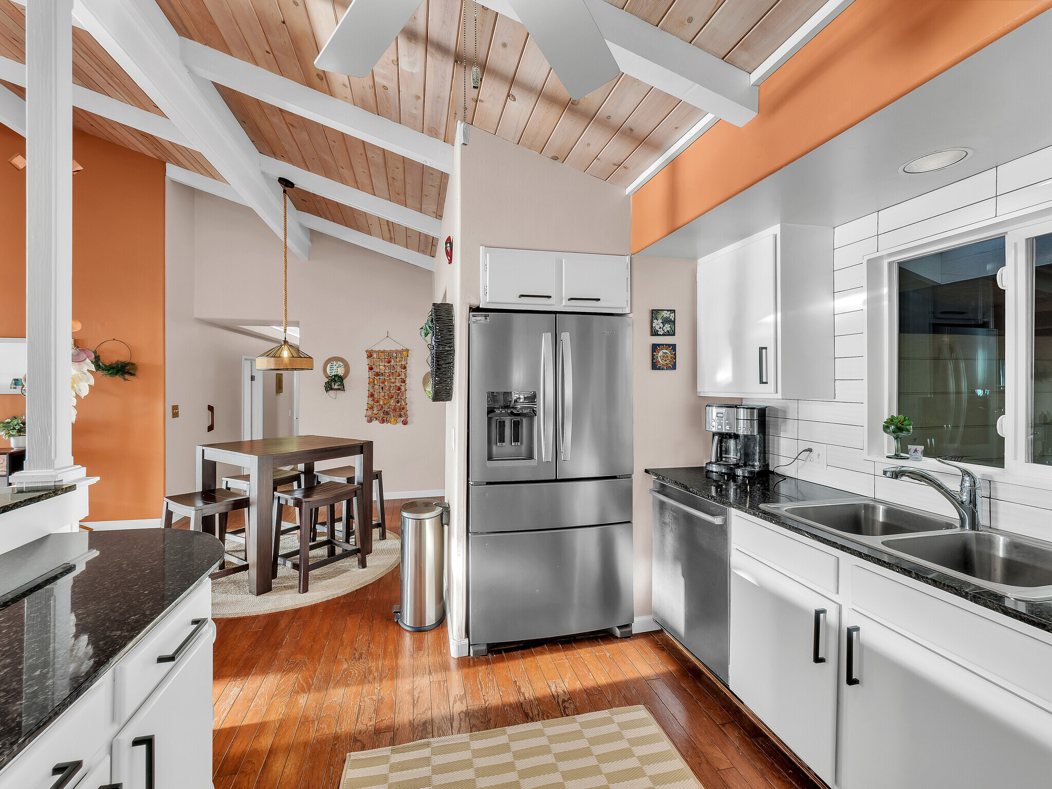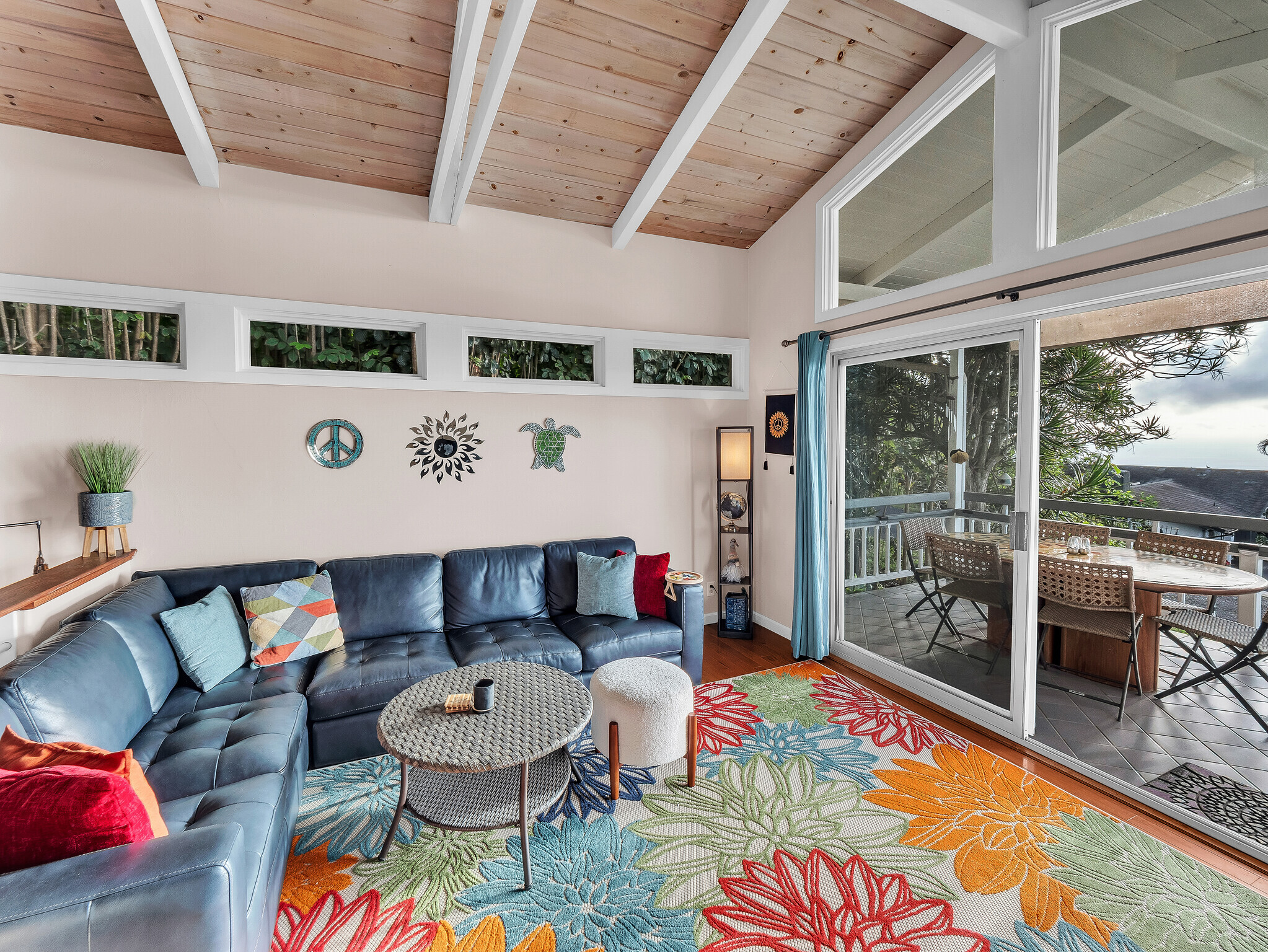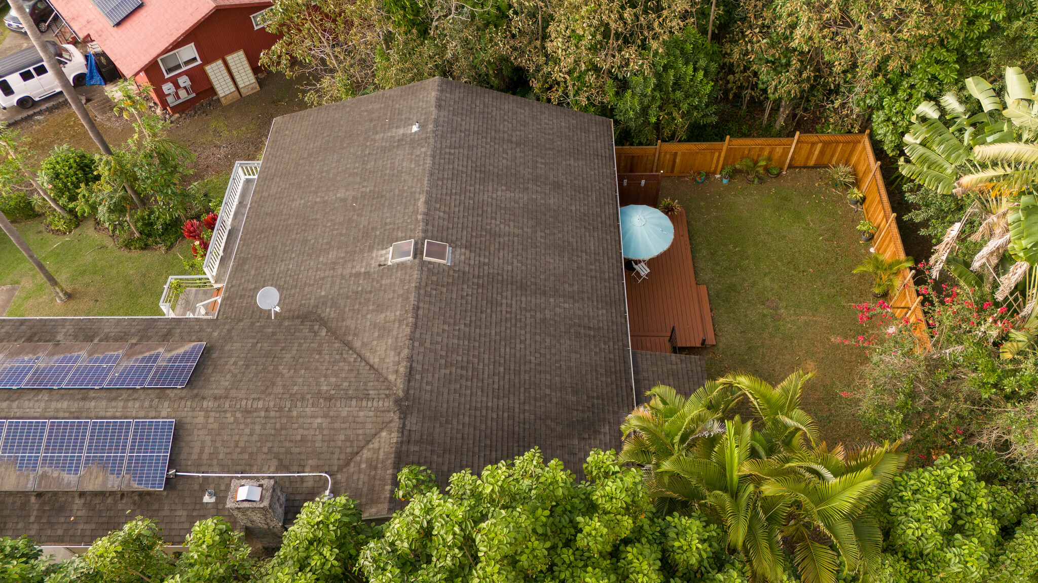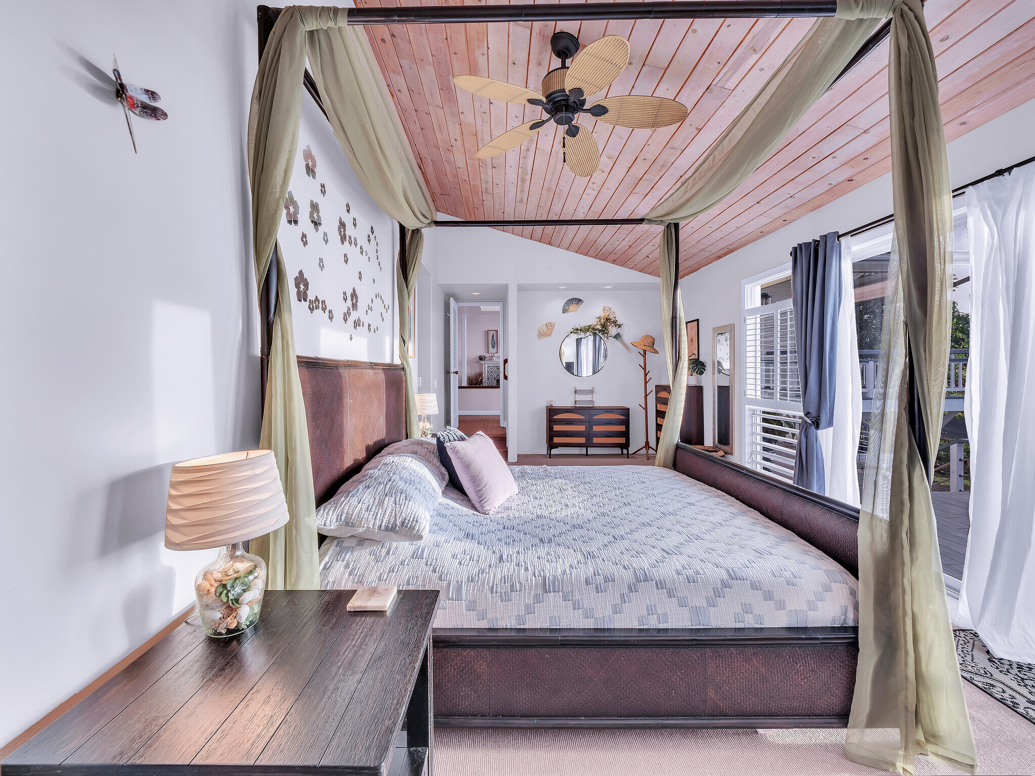 Welcome to Casa Amore, a beautifully custom-built 3-bedroom, 2-bath home featuring soaring vaulted tongue-and-groove ceilings and an open, airy layout designed to embrace indoor-outdoor island living. Rich hardwood floors flow throughout the main living spaces, complemented by a bright kitchen with a gas stove and seamless connection to the dining and living areas. A separate lounge provides a cozy retreat with a wood-burning fireplace, ideal for crisp evenings and relaxed mornings. The spacious primary suite is a true sanctuary, offering an ensuite bath, a generously sized closet, and a separate office well suited for remote work or creative pursuits. A sliding glass door from the bedroom opens directly to the expansive lanai, creating an effortless connection to ocean and sunset views. Two guest bedrooms on the opposite side of the home provide comfortable and flexible accommodations. From the great room, the wraparound lanai offers an ideal setting for entertaining, morning coffee, or evening cocktails against a stunning coastal backdrop. The backyard features an oversized lanai in a private setting, surrounded by mature avocado trees, and rich tropical foliage, along with a fully fenced yard suitable for pets and outdoor living. Offered fully furnished, this turnkey property is ready to enjoy from day one. Additional features include an on-demand water heater, a leased photovoltaic system to help manage electricity costs, and an enclosed washer and dryer located off the back lanai. The carport and storage area below offer flexibility, with potential to be enclosed as a garage or expanded to create additional living space. Situated at a comfortable, cooler elevation, the property enjoys close proximity to white-sand beaches, dining, shopping, Costco, Kona International Airport, and downtown Kailua-Kona. Private, lush, and thoughtfully designed, Casa Amore captures the essence of relaxed island living.