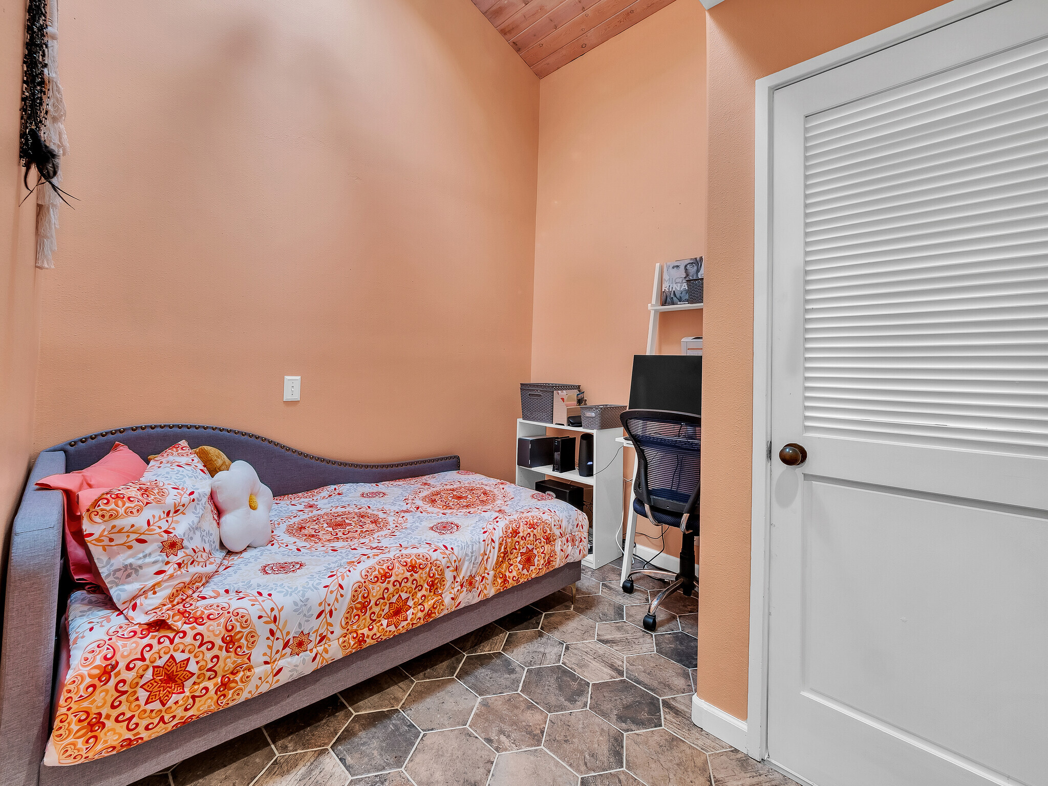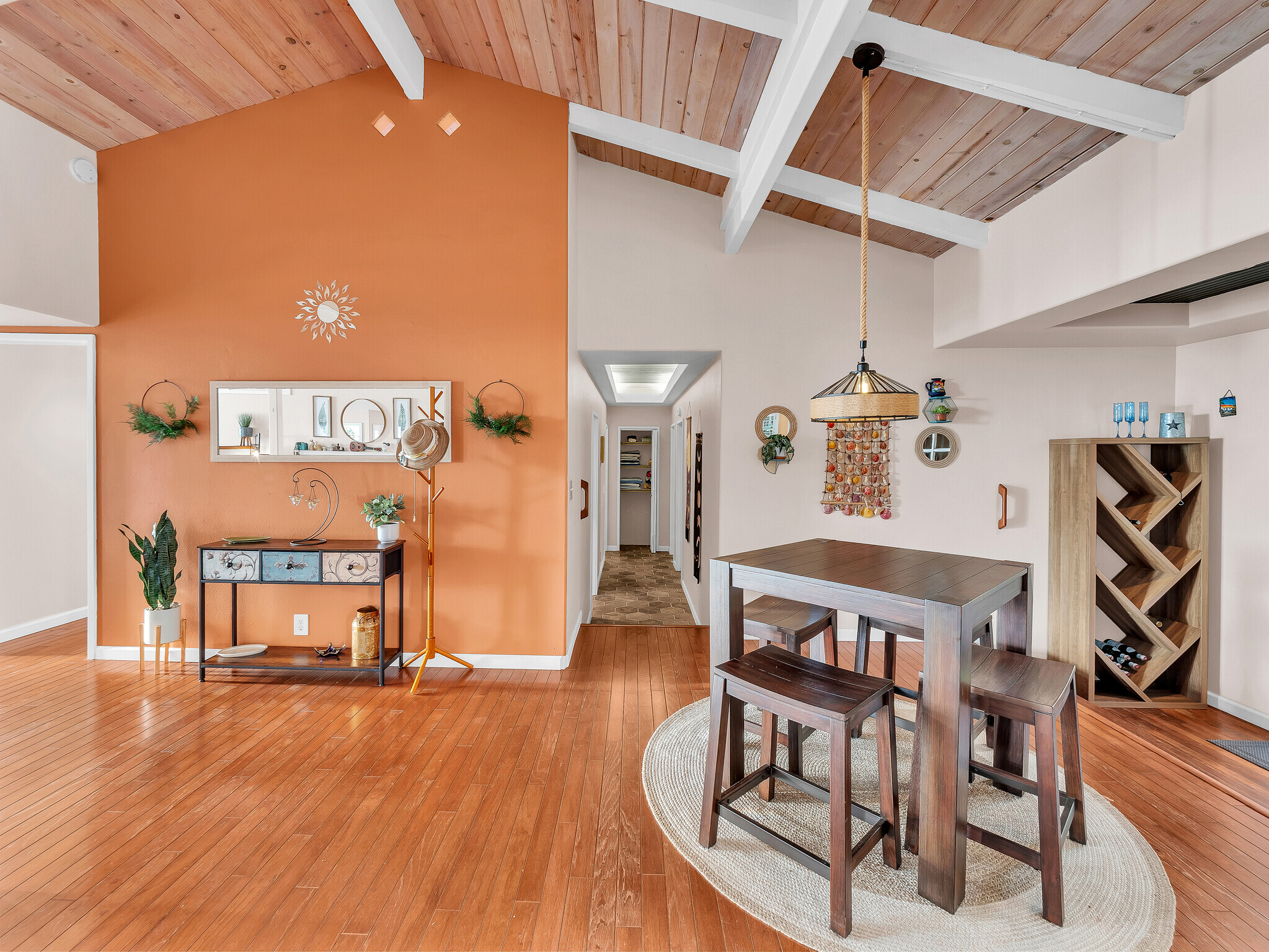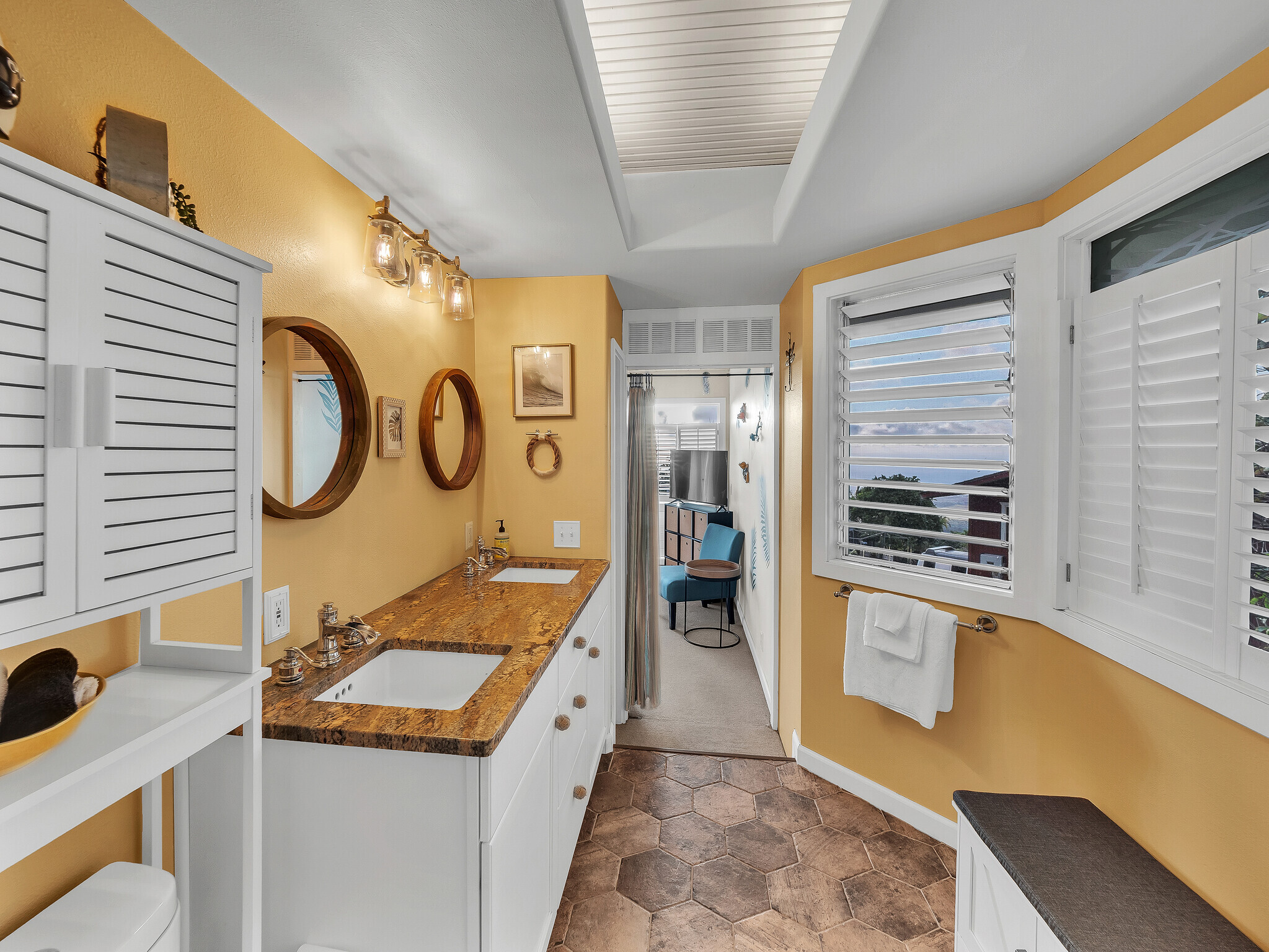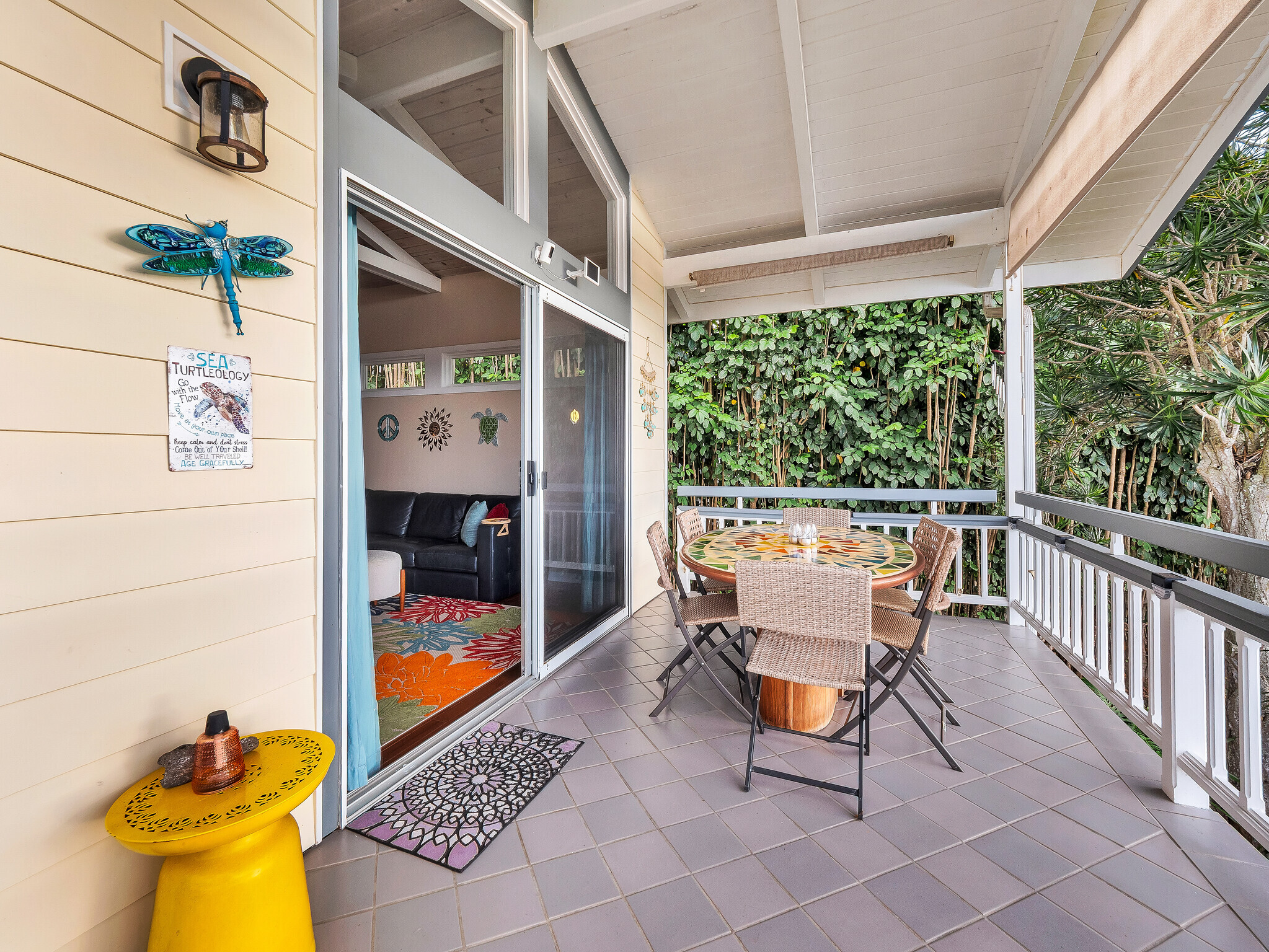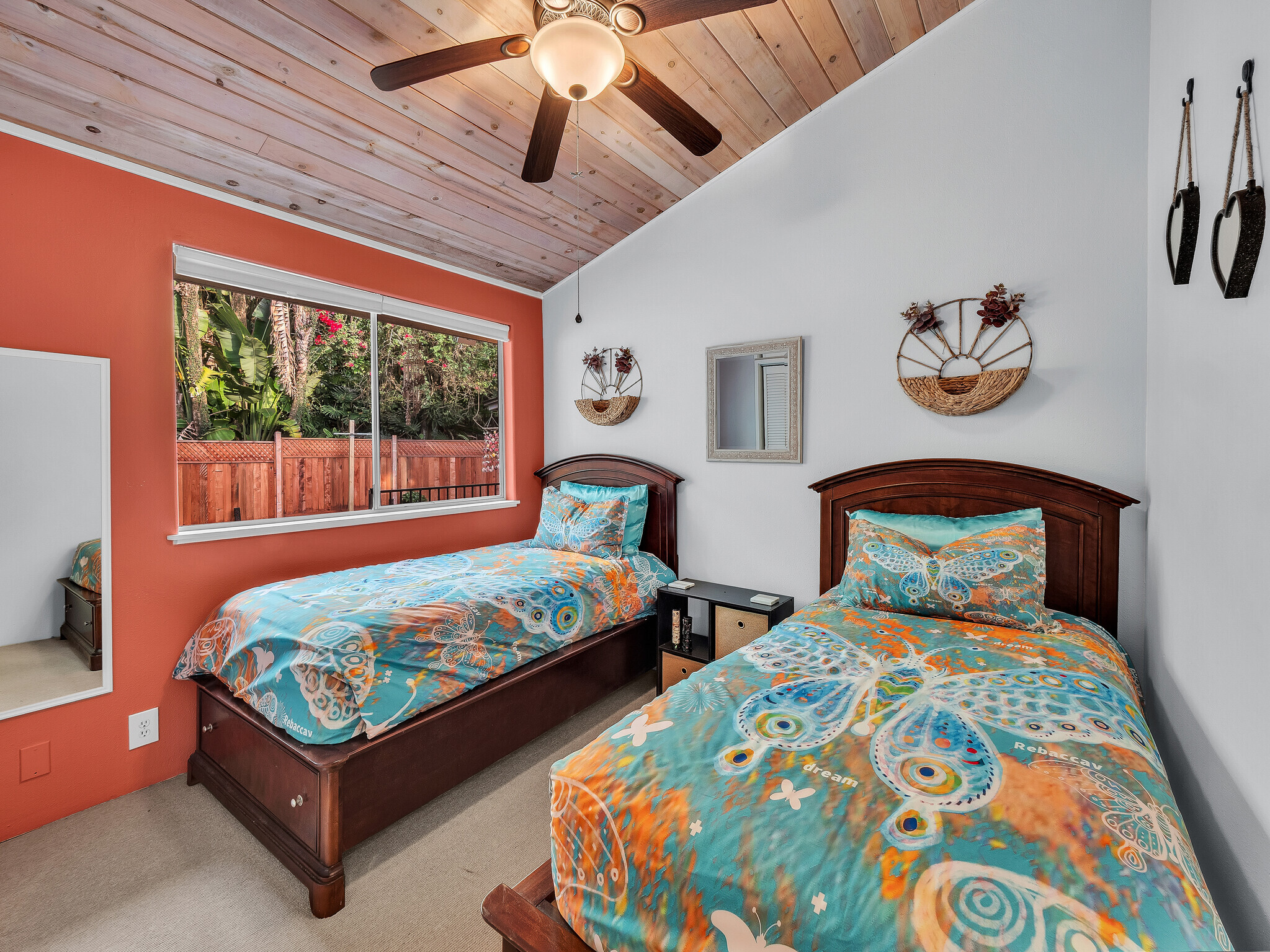 Welcome to Casa Amore, a beautifully custom-built 3-bedroom, 2-bath home featuring soaring vaulted tongue-and-groove ceilings and an open, airy layout designed to embrace indoor-outdoor island living. Rich hardwood floors flow throughout the main living spaces, complemented by a bright kitchen with a gas stove and seamless connection to the dining and living areas. A separate lounge provides a cozy retreat with a wood-burning fireplace, ideal for crisp evenings and relaxed mornings. The spacious primary suite is a true sanctuary, offering an ensuite bath, a generously sized closet, and a separate office well suited for remote work or creative pursuits. A sliding glass door from the bedroom opens directly to the expansive lanai, creating an effortless connection to ocean and sunset views. Two guest bedrooms on the opposite side of the home provide comfortable and flexible accommodations. From the great room, the wraparound lanai offers an ideal setting for entertaining, morning coffee, or evening cocktails against a stunning coastal backdrop. The backyard features an oversized lanai in a private setting, surrounded by mature avocado trees, and rich tropical foliage, along with a fully fenced yard suitable for pets and outdoor living. Offered fully furnished, this turnkey property is ready to enjoy from day one. Additional features include an on-demand water heater, a leased photovoltaic system to help manage electricity costs, and an enclosed washer and dryer located off the back lanai. The carport and storage area below offer flexibility, with potential to be enclosed as a garage or expanded to create additional living space. Situated at a comfortable, cooler elevation, the property enjoys close proximity to white-sand beaches, dining, shopping, Costco, Kona International Airport, and downtown Kailua-Kona. Private, lush, and thoughtfully designed, Casa Amore captures the essence of relaxed island living.