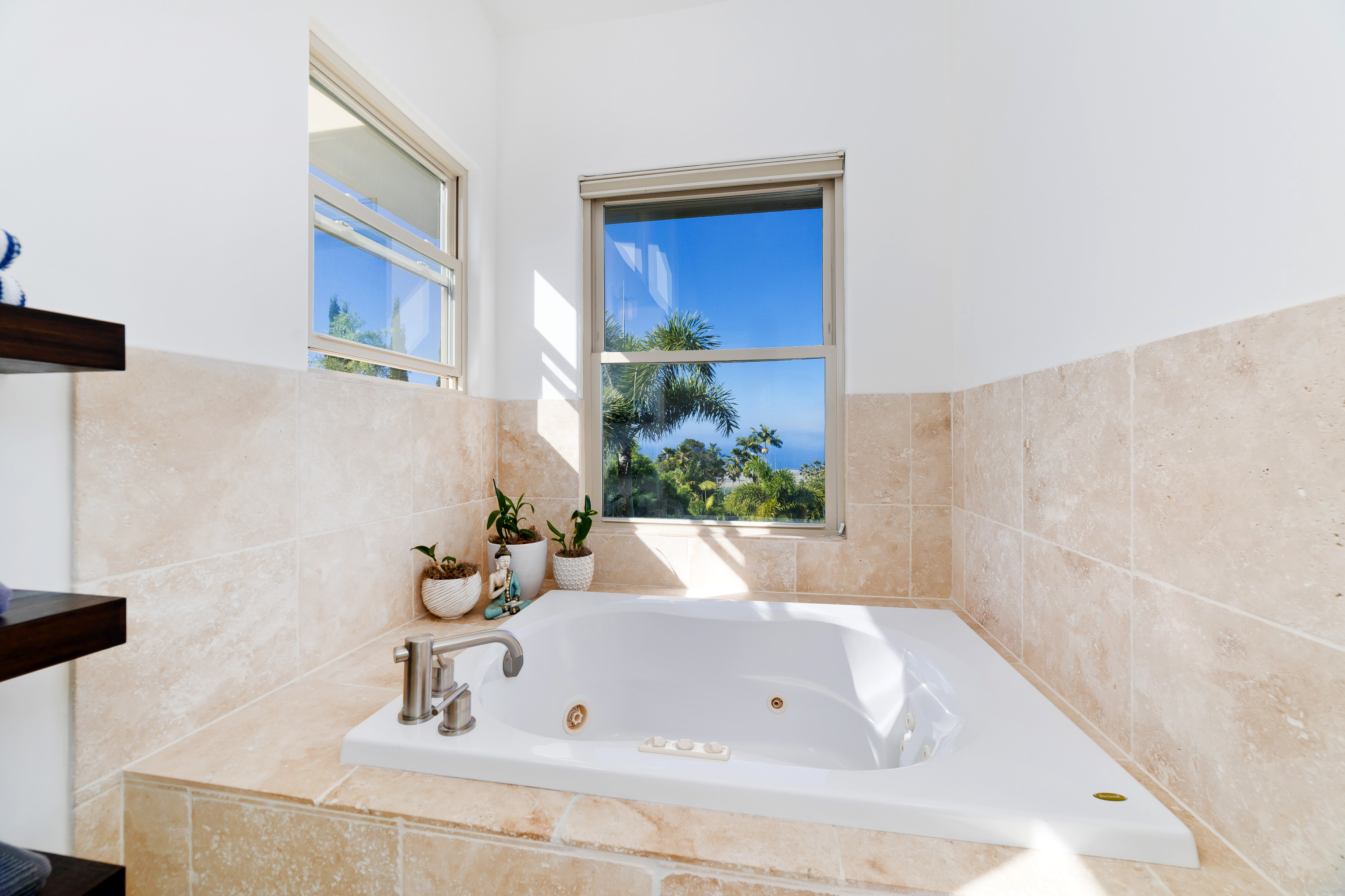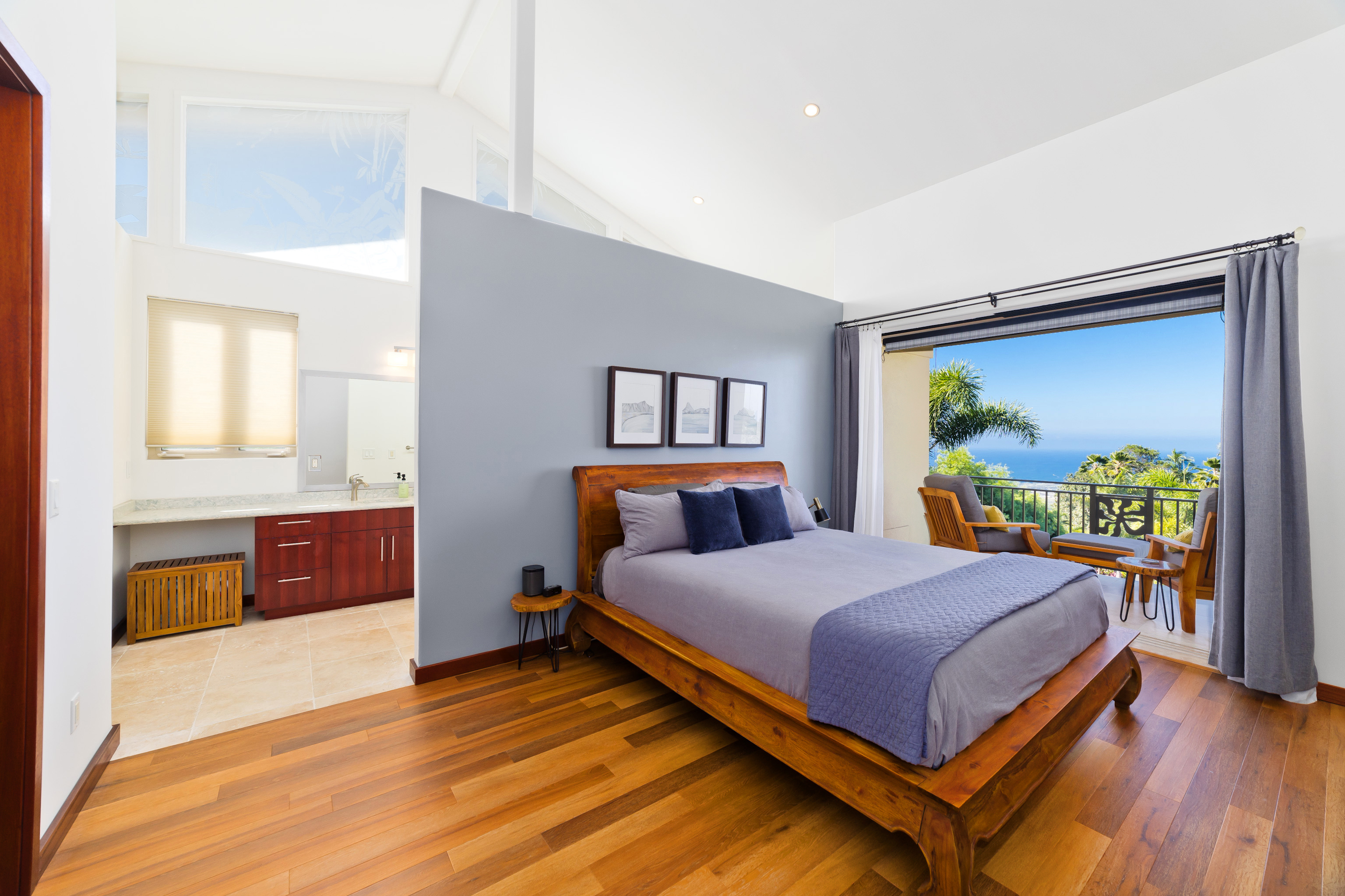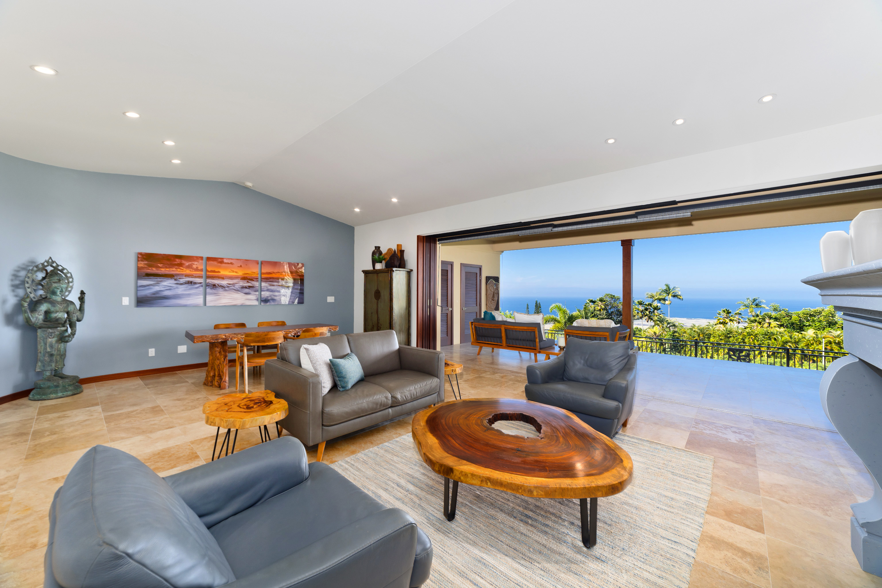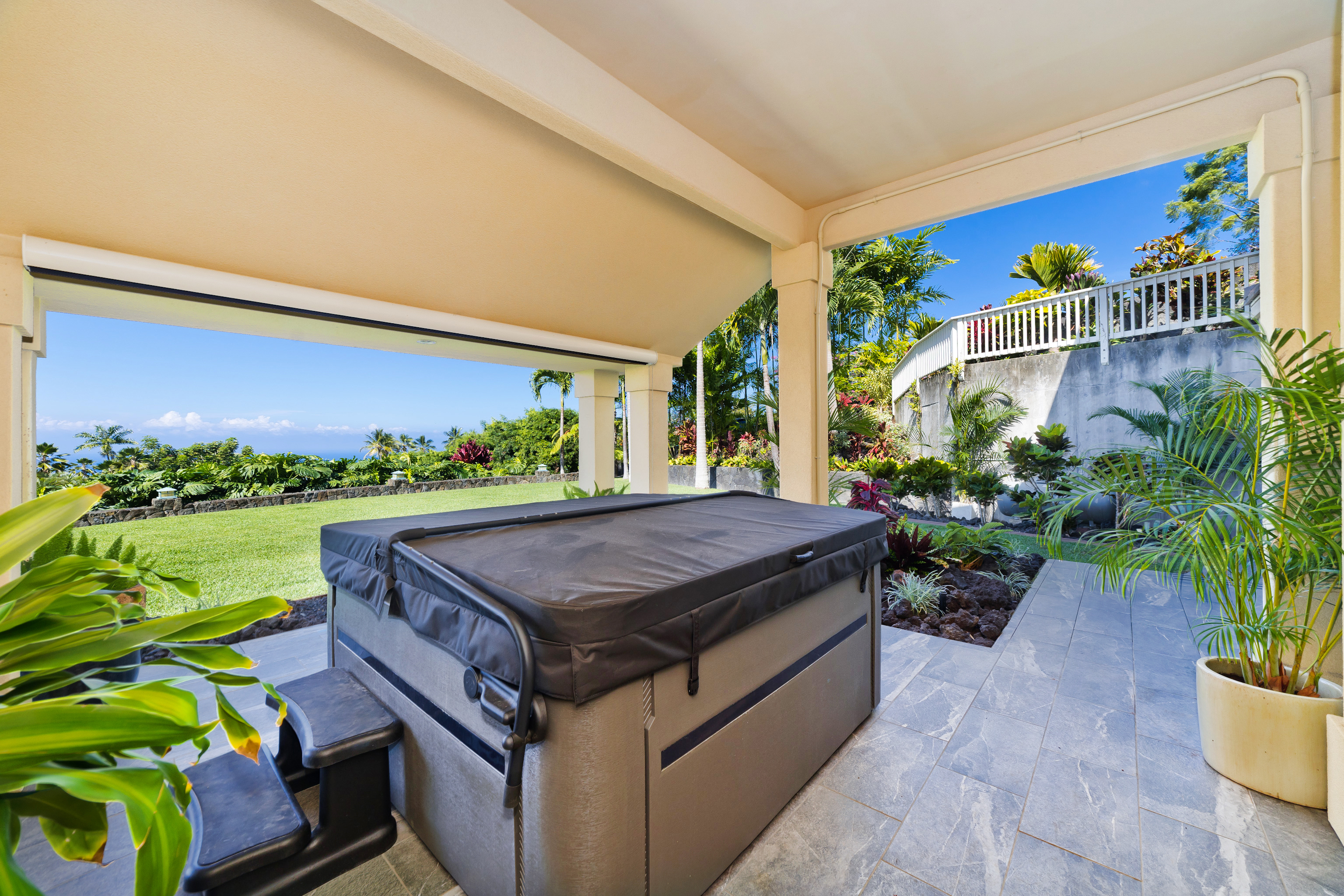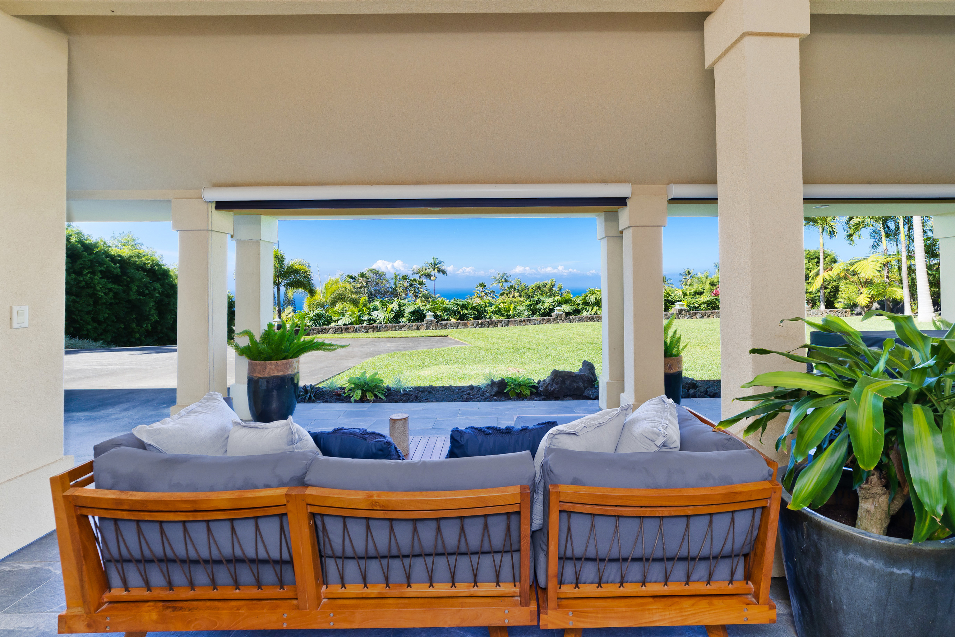 Experience year-round ocean, coastline, and sunset views from this beautifully refreshed residence in gated Kona Hills Estates. Set on a terraced one-acre lot, the property offers enhanced view corridors, upgraded tropical landscaping, and multiple outdoor living spaces designed for relaxation and entertaining. The main level provides true single-level living and features the primary suite, great room, dining area, kitchen, office, and laundry–all oriented toward sweeping ocean views. Large pocket doors open the great room to an expansive covered lanai for seamless indoor—outdoor living. Fresh interior paint, new LVP flooring, and contemporary touches blend with custom architecture, mahogany finishes, vaulted ceilings, and travertine tile. The primary suite includes a private lanai, sitting area, walk-in shower, and jetted tub overlooking the coastline. Two spacious guest suites are located on the lower level, each with an en-suite bath, walk-in closet, and direct access to a covered lanai with a hot tub and lush tropical landscaping. A media room and additional lounge spaces offer flexible living and entertainment areas. The upgraded chef’s kitchen features Thermador appliances, a 4-burner propane range with built-in electric griddle, granite countertops, a copper farmhouse sink, butcher-block island, and generous pantry storage. Remote-controlled lanai shades, a gas fireplace, built-in shelving, and custom woodwork add comfort and functionality throughout. Outdoor enhancements include refreshed gardens, upgraded pathways, terraced levels, and a gravel entertaining area surrounded by tropical plantings. The home also offers two gated driveways, a 3-car garage with EV charger, an owned 18-panel PV system, and mature rock wall landscaping. This well-appointed home blends privacy, elevated views, and thoughtful upgrades–an inviting retreat within one of North Kona’s most desirable gated communities.