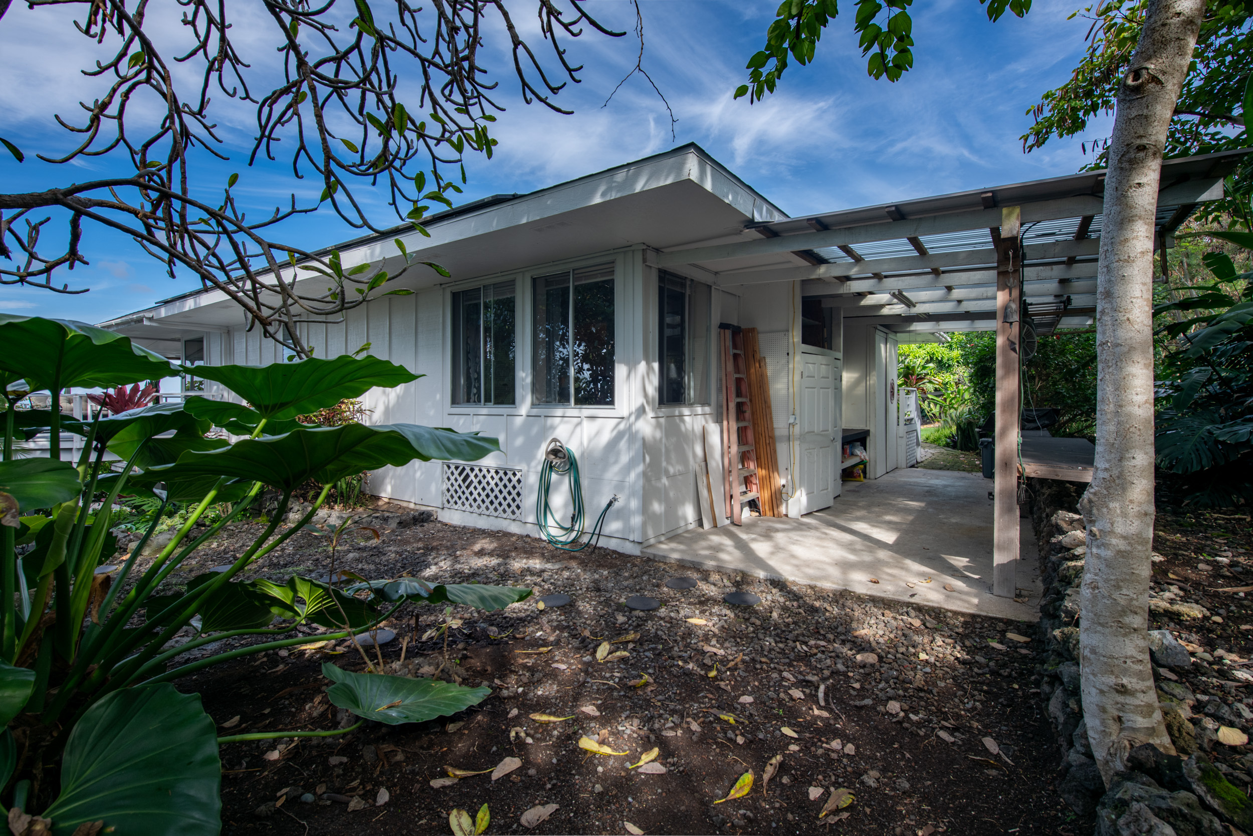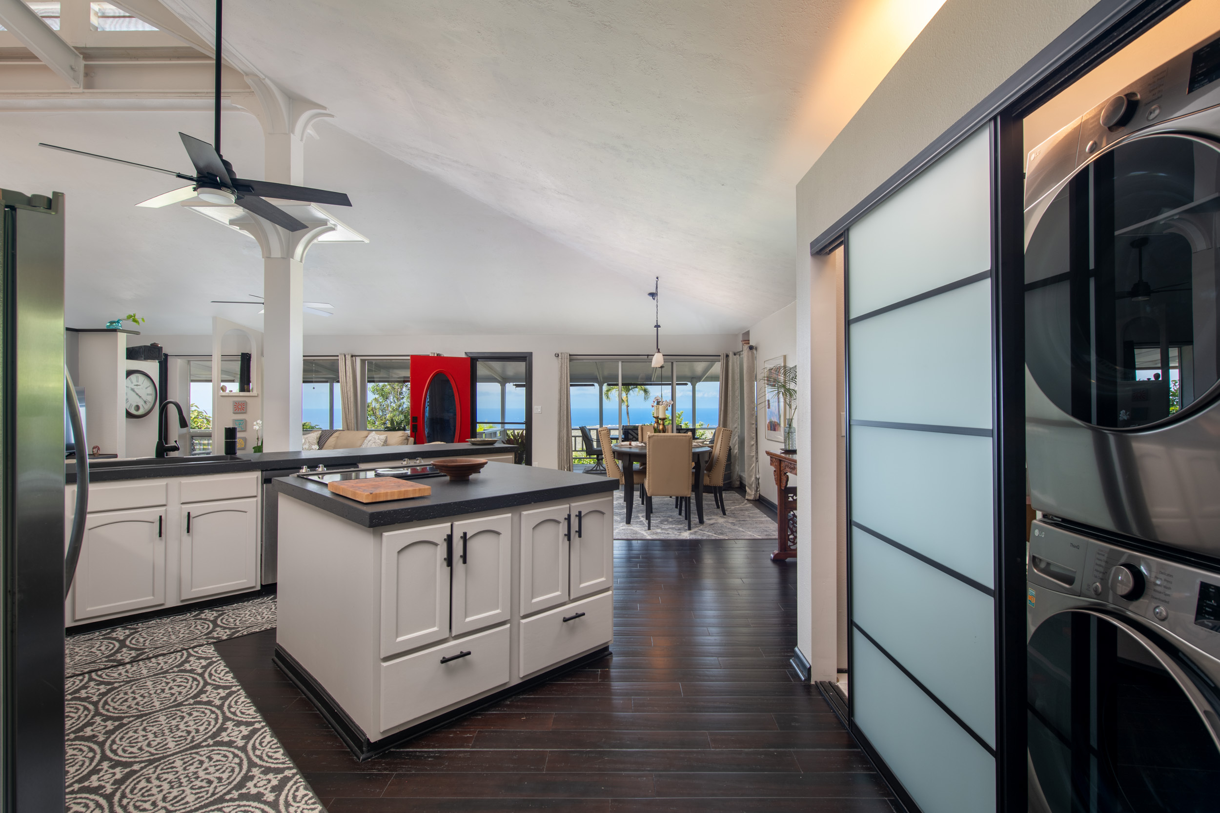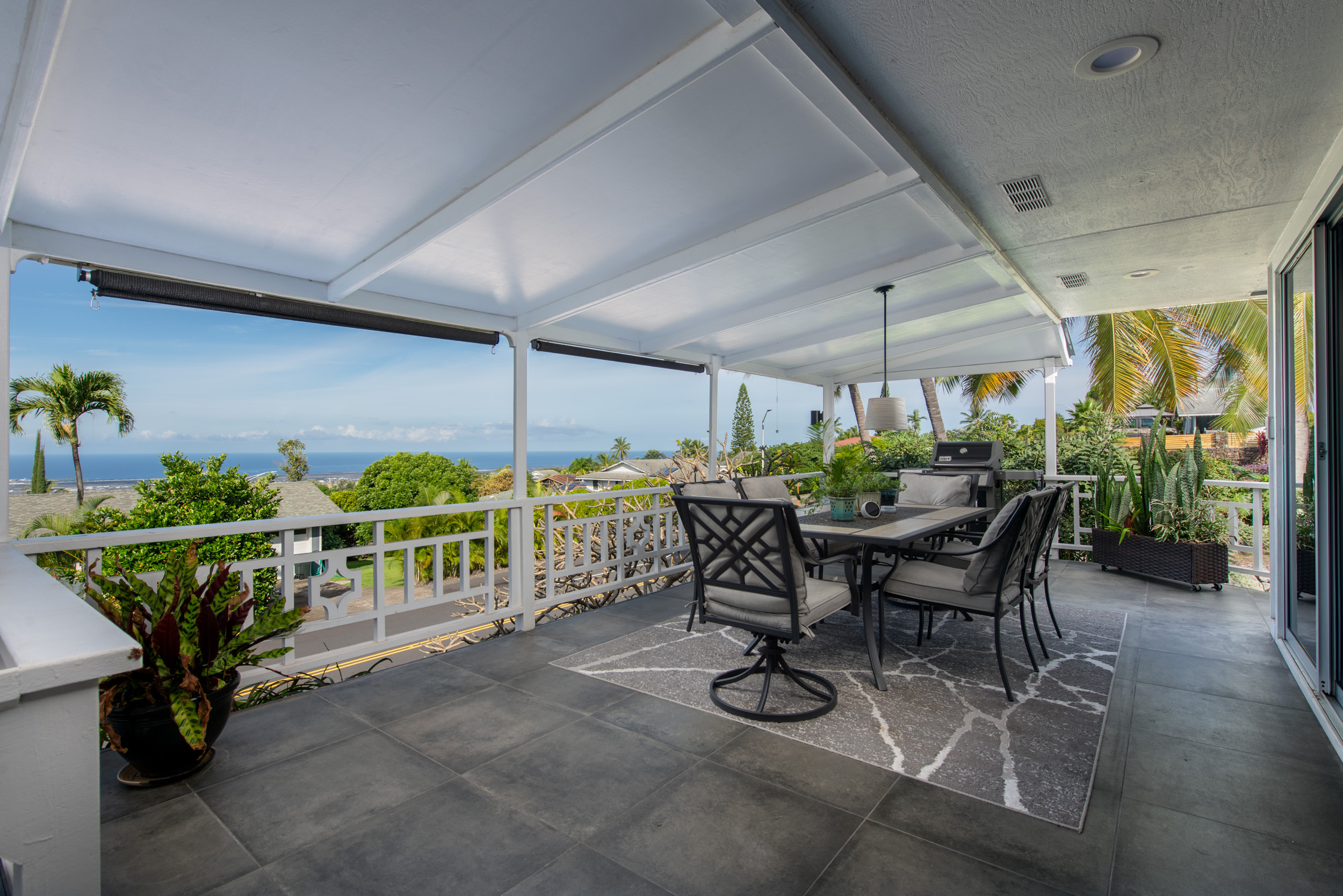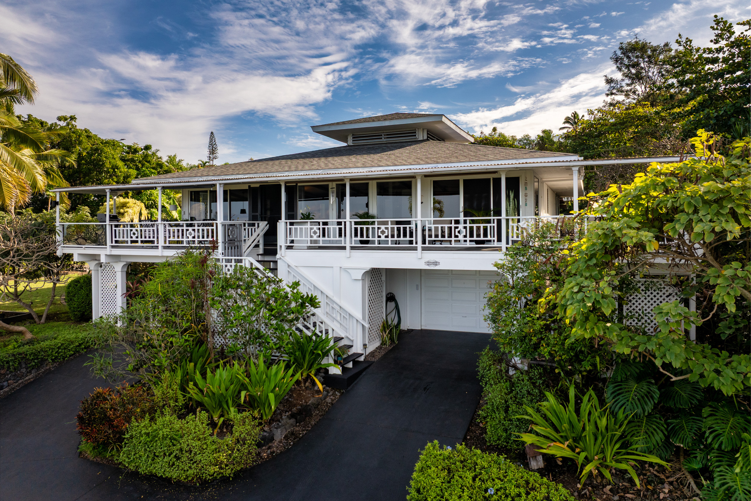 Get out your checklist. Spectacular coastline views? Yes. A spacious, unique floor plan? Absolutely. A separate, private guest space with income potential? Check. And that’s just the beginning. This home captures the essence of Hawai?i living, with an emphasis on indoor-outdoor flow and everyday comfort. Expansive covered lanais on both the upper and lower levels invite you to relax, entertain, and enjoy cooling trade winds and ocean views year-round. A distinctive central cupola was thoughtfully designed to enhance natural airflow throughout the main living areas. The kitchen sits at the heart of the home, offering ample space for cooking, gathering, and entertaining. The main level upstairs features three bedrooms and two full baths, providing a functional and comfortable layout for daily living. Downstairs, a separate guest room/ohana offers its own private entrance and parking. This space includes one bedroom, a full bath, and a kitchenette, ideal for extended guests, multi-generational living, or potential rental income. Construction is a standout feature of this property. The steel-framed structure and a new roof installed in June 2023 contribute to strong inspection appeal. The home has been well maintained by the current owners, and a pre-listing inspection has already been completed, offering added peace of mind. The property is ideally located near major shopping, dining, schools, beaches, and Kona International Airport, blending privacy with everyday convenience. Step outside and explore your own tropical retreat, complete with mature fruit trees including mango, starfruit, papaya, banana, and more. Lush tropical landscaping and a variety of flowering plants create a vibrant garden setting. An outdoor workshop area provides space for hobbies and projects while still enjoying the island lifestyle. Furnishings are negotiable, making this an easy, move-in-ready opportunity.