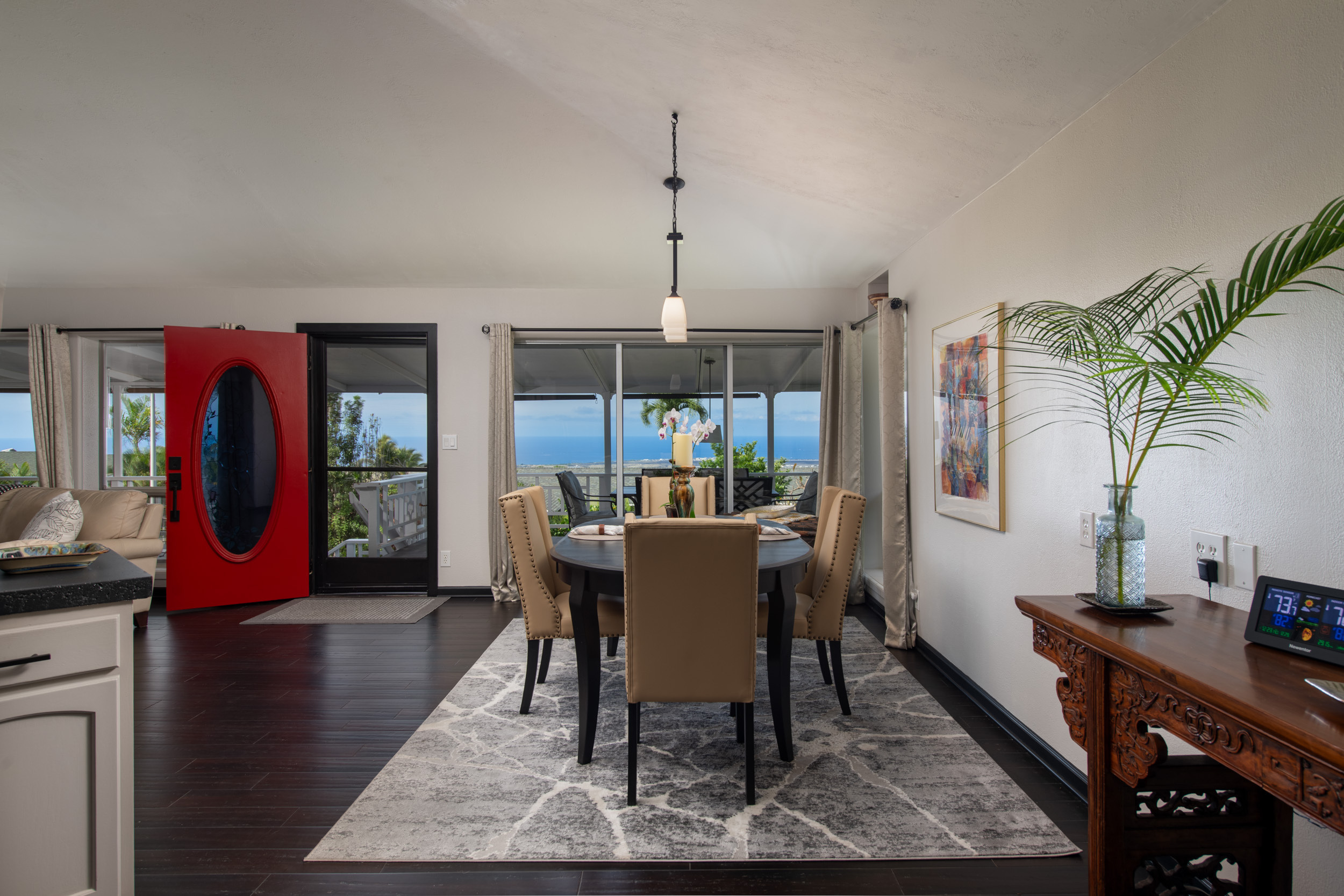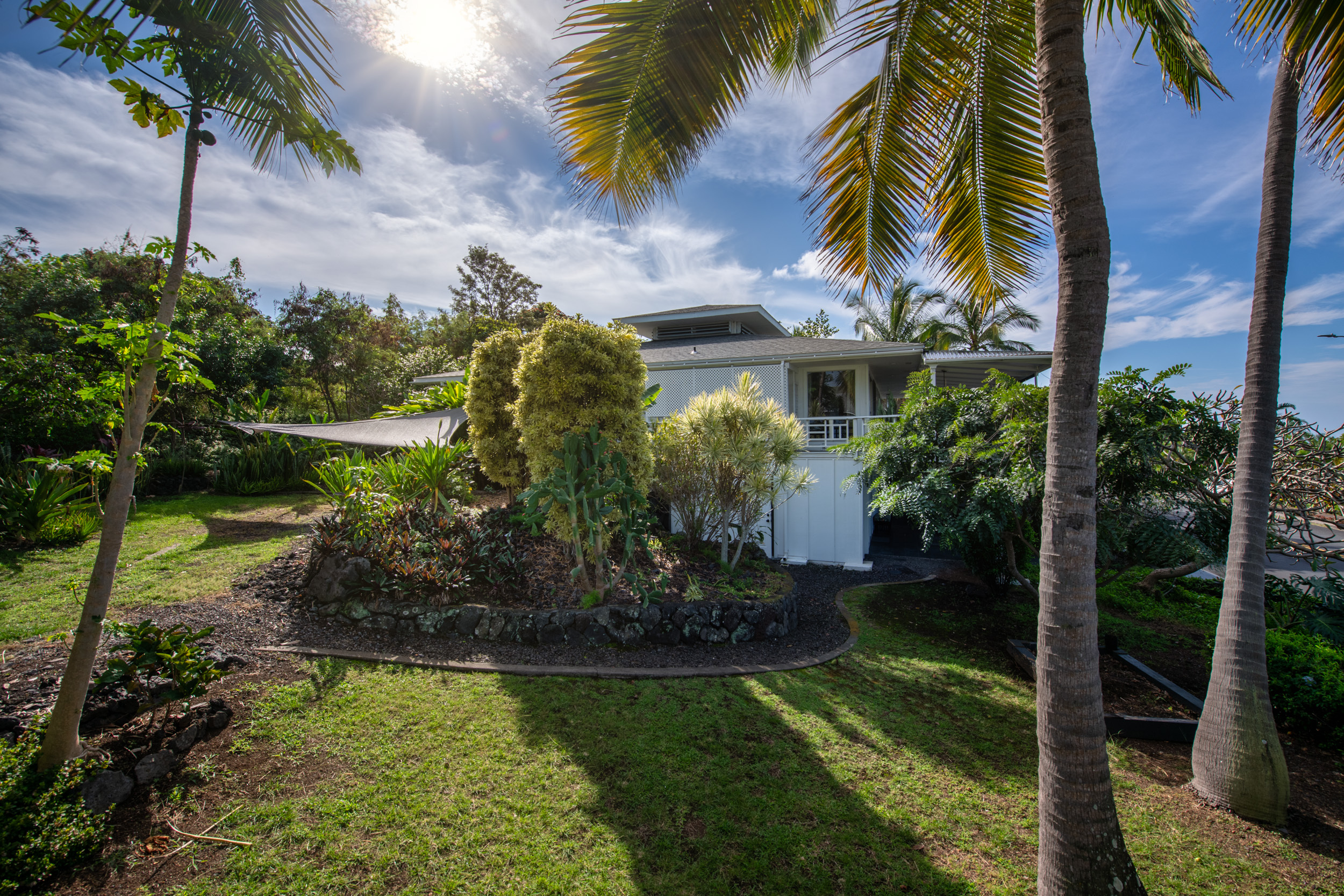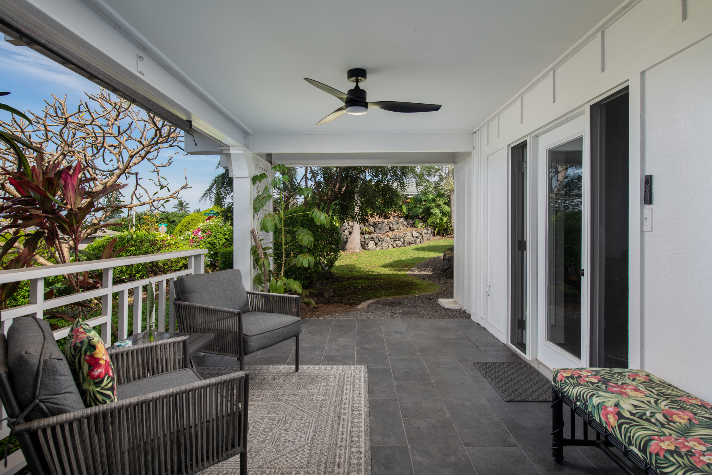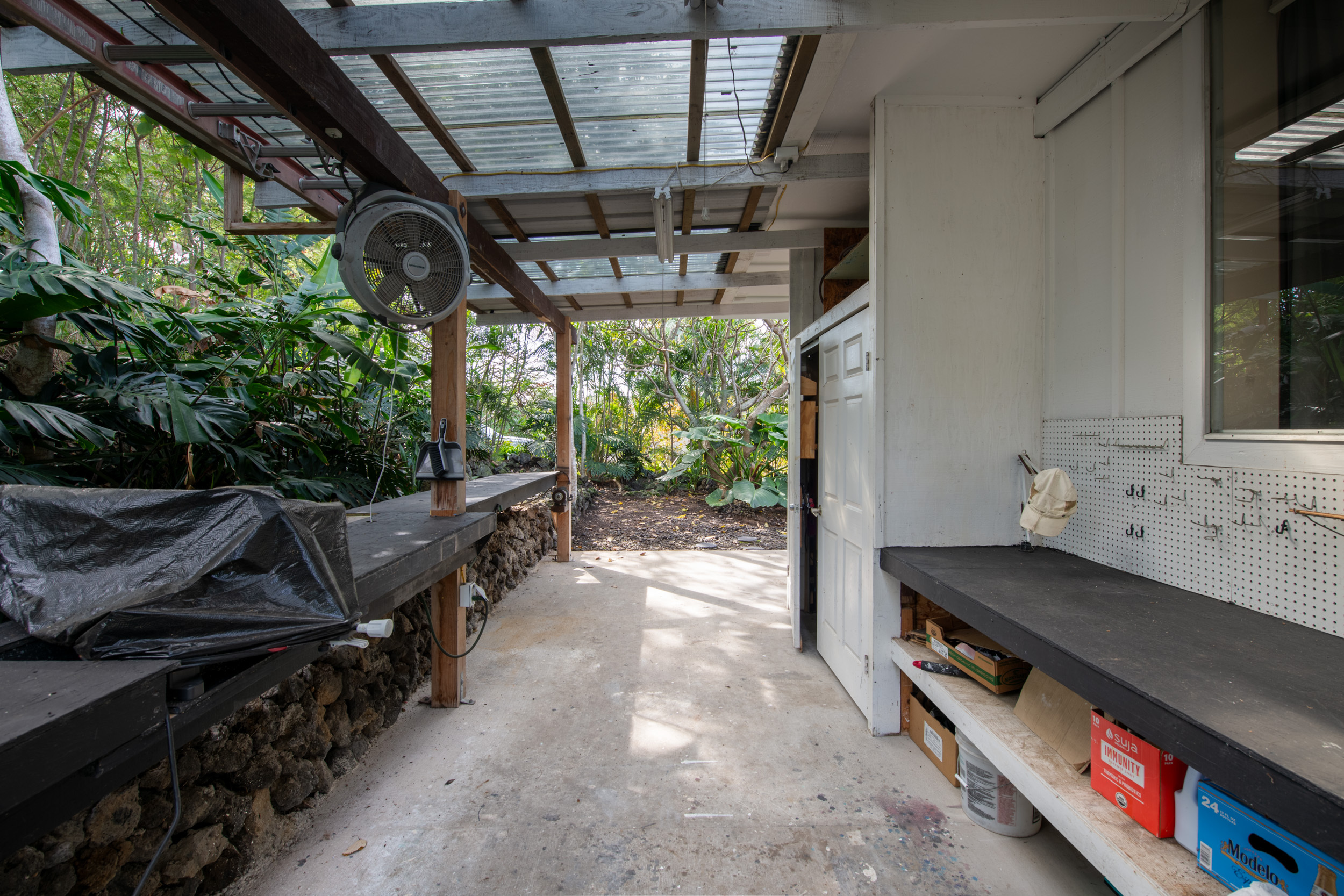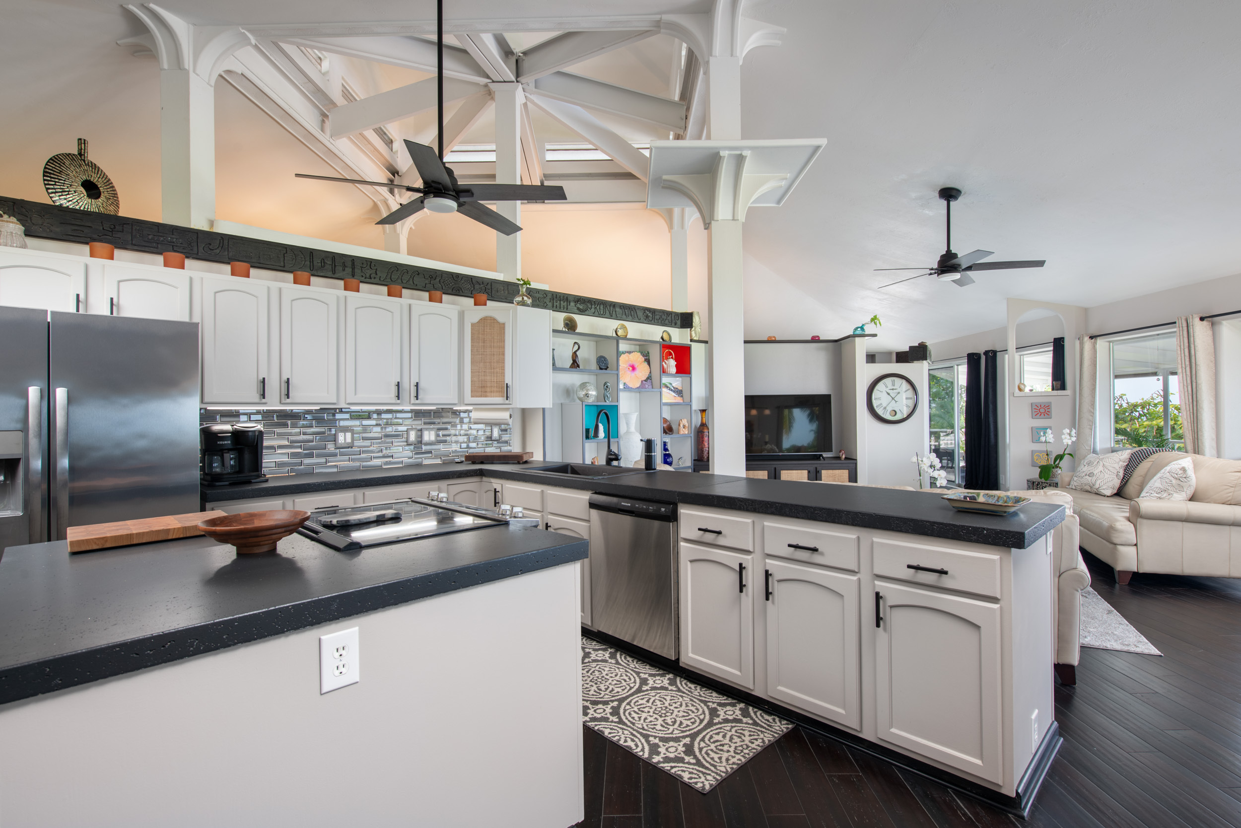 Get out your checklist. Spectacular coastline views? Yes. A spacious, unique floor plan? Absolutely. A separate, private guest space with income potential? Check. And that’s just the beginning. This home captures the essence of Hawai?i living, with an emphasis on indoor-outdoor flow and everyday comfort. Expansive covered lanais on both the upper and lower levels invite you to relax, entertain, and enjoy cooling trade winds and ocean views year-round. A distinctive central cupola was thoughtfully designed to enhance natural airflow throughout the main living areas. The kitchen sits at the heart of the home, offering ample space for cooking, gathering, and entertaining. The main level upstairs features three bedrooms and two full baths, providing a functional and comfortable layout for daily living. Downstairs, a separate guest room/ohana offers its own private entrance and parking. This space includes one bedroom, a full bath, and a kitchenette, ideal for extended guests, multi-generational living, or potential rental income. Construction is a standout feature of this property. The steel-framed structure and a new roof installed in June 2023 contribute to strong inspection appeal. The home has been well maintained by the current owners, and a pre-listing inspection has already been completed, offering added peace of mind. The property is ideally located near major shopping, dining, schools, beaches, and Kona International Airport, blending privacy with everyday convenience. Step outside and explore your own tropical retreat, complete with mature fruit trees including mango, starfruit, papaya, banana, and more. Lush tropical landscaping and a variety of flowering plants create a vibrant garden setting. An outdoor workshop area provides space for hobbies and projects while still enjoying the island lifestyle. Furnishings are negotiable, making this an easy, move-in-ready opportunity.