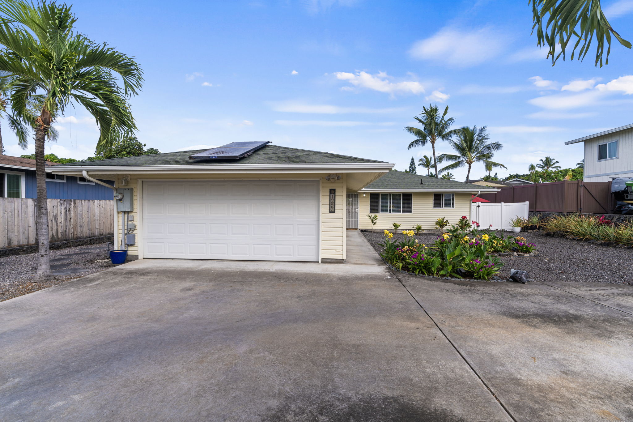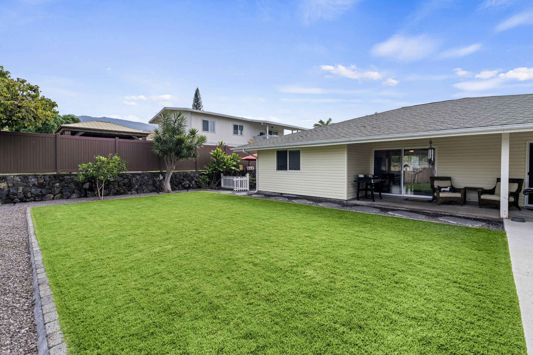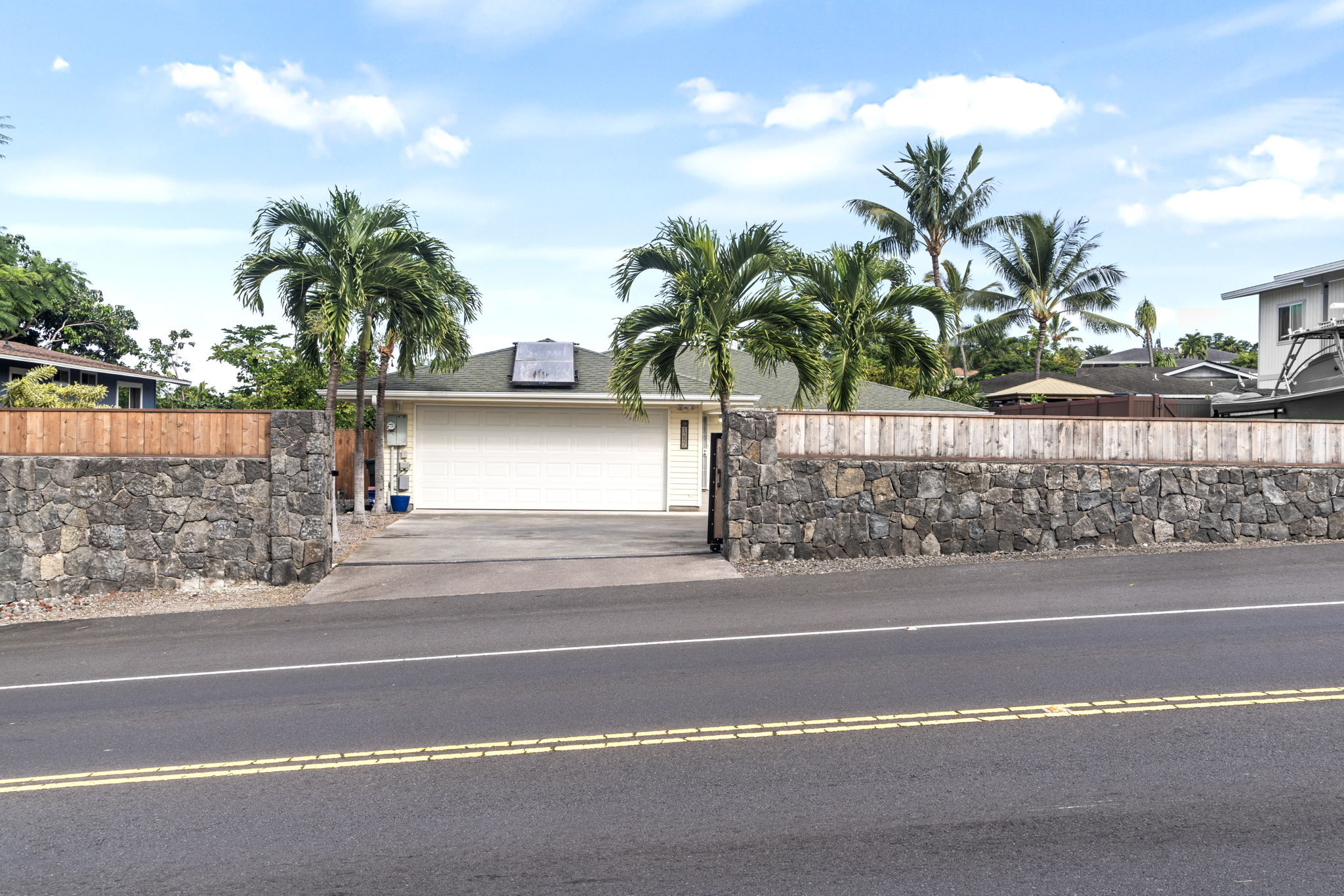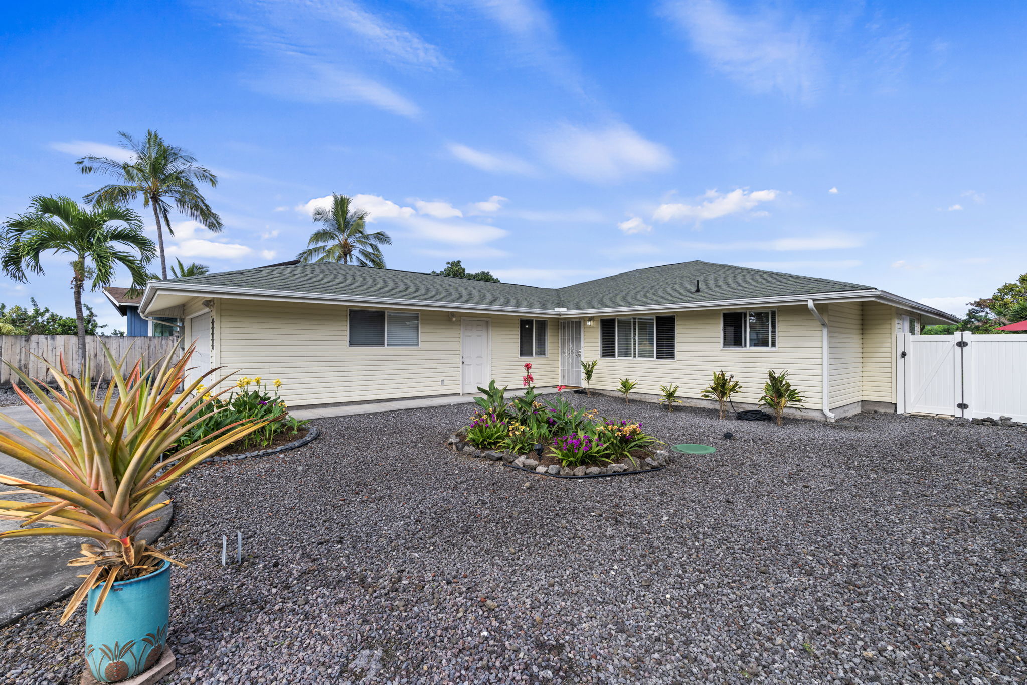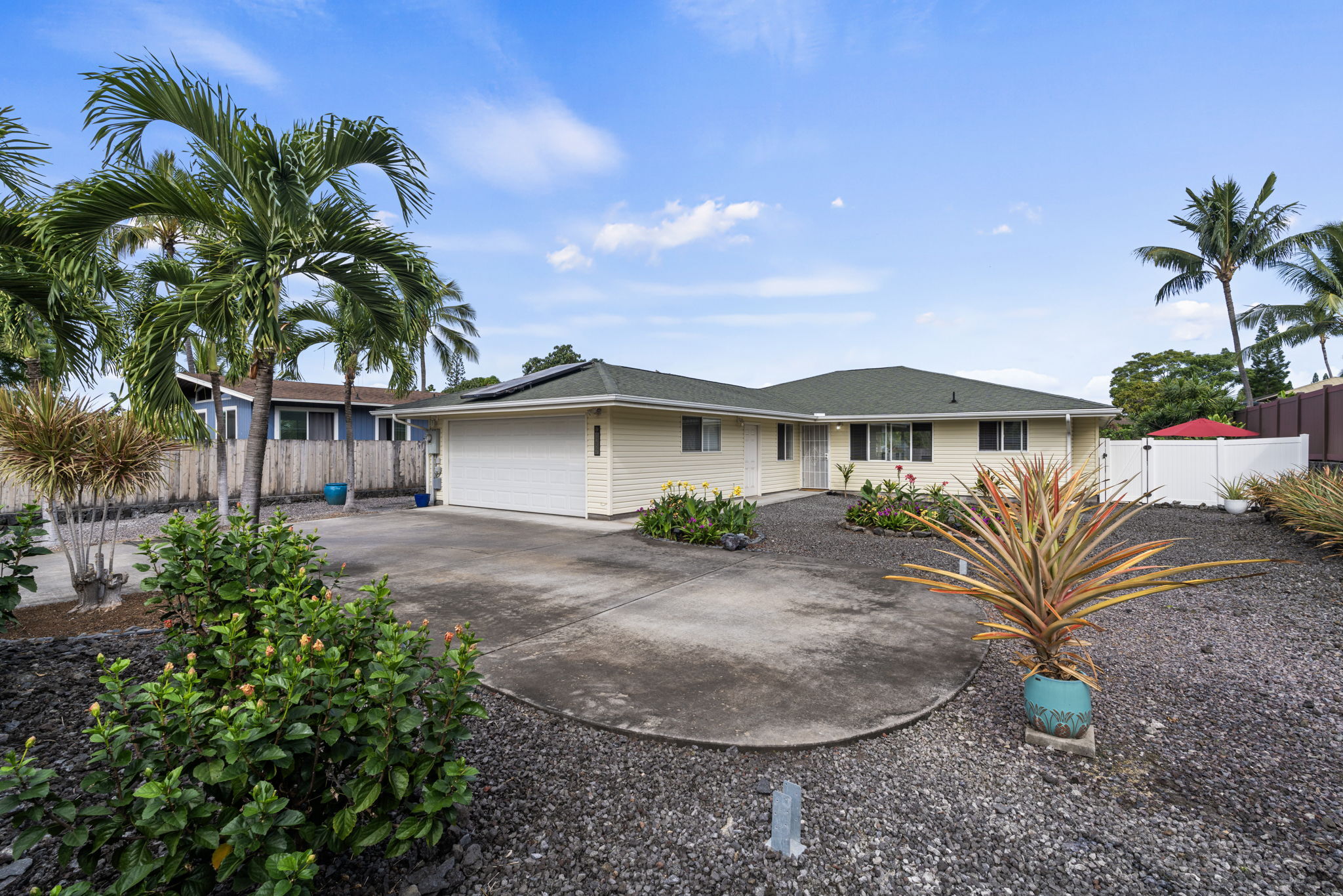 Single level Ranch style home with gorgeous open floor plan featuring four bedrooms and three bathrooms with two car garage. The main living space offers beautiful natural light through glass doors leading to the covered lanai and features vaulted ceilings and zoned/split AC where the kitchen and living room are connected by the dining space with natural flow. The Primary bedroom is spacious and boasts en suite bathroom with zoned/split AC and access to covered lanai. Property is gated with rock walls and fence! Large families or car enthusiasts will appreciate that multiple vehicles can be parked securely, if needed. Exceptional NEW landscaping is premier with Zoysia Sod, stamped lava rock paths, Tahitian limes, lemons, white & gold pineapple, and abundant in orchids and ornamentals. Level, manicured, and easily manageable landscaping awaits that can support your garden dreams. Both the front and back have been newly landscaped and exceptionally cared for. Fully enclosed with fencing providing future owners peace of mind for pets and family to enjoy the space leisurely. Hot Tub included with sale! Enjoy many lovely, shaded areas, including the Pergola nestled in the landscaping. Discover beautiful views of Hualalai Mountain from the property! Located in the heart of Kona, only minutes from the Airport, Beaches, Food & Gas.
