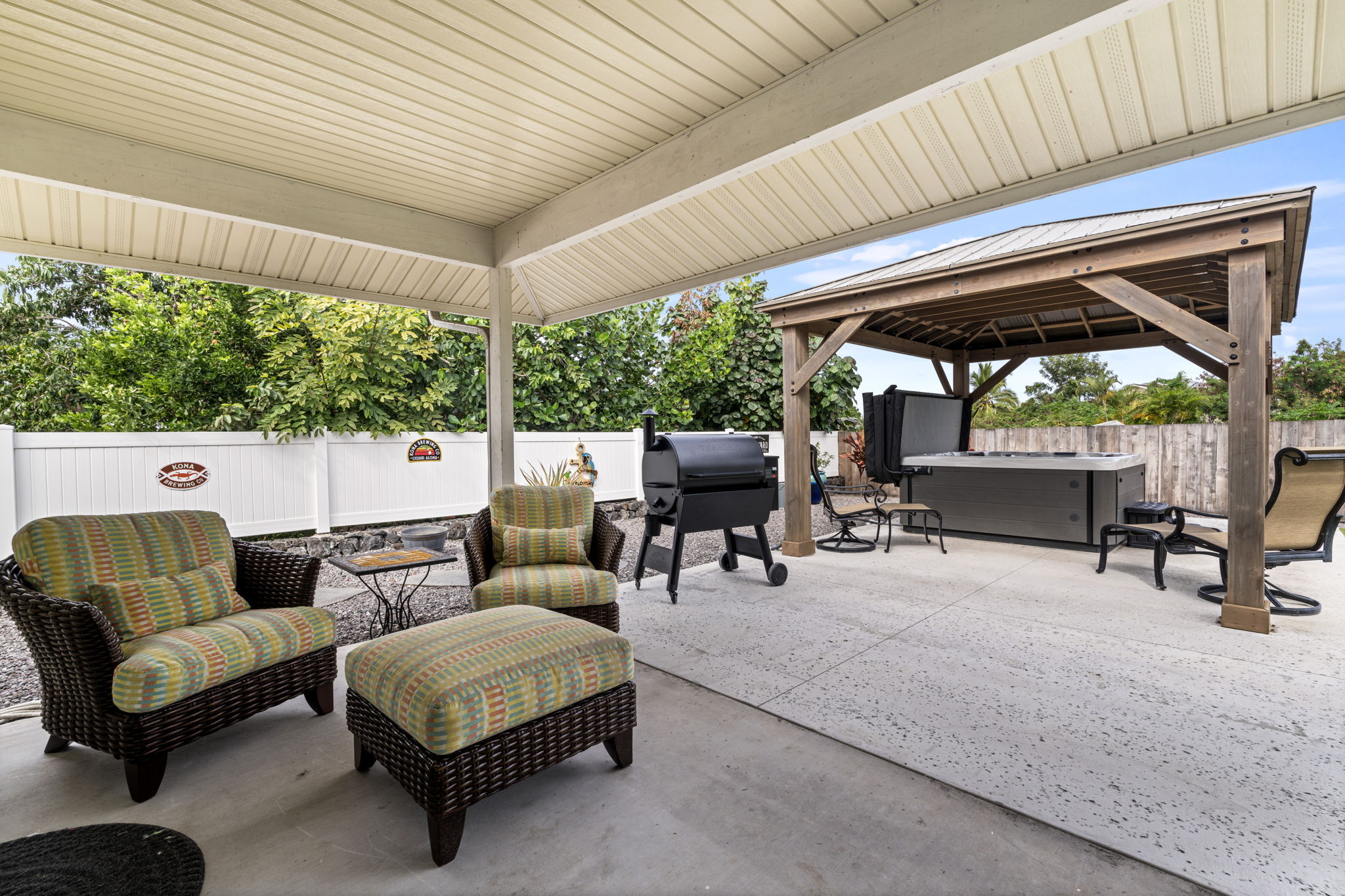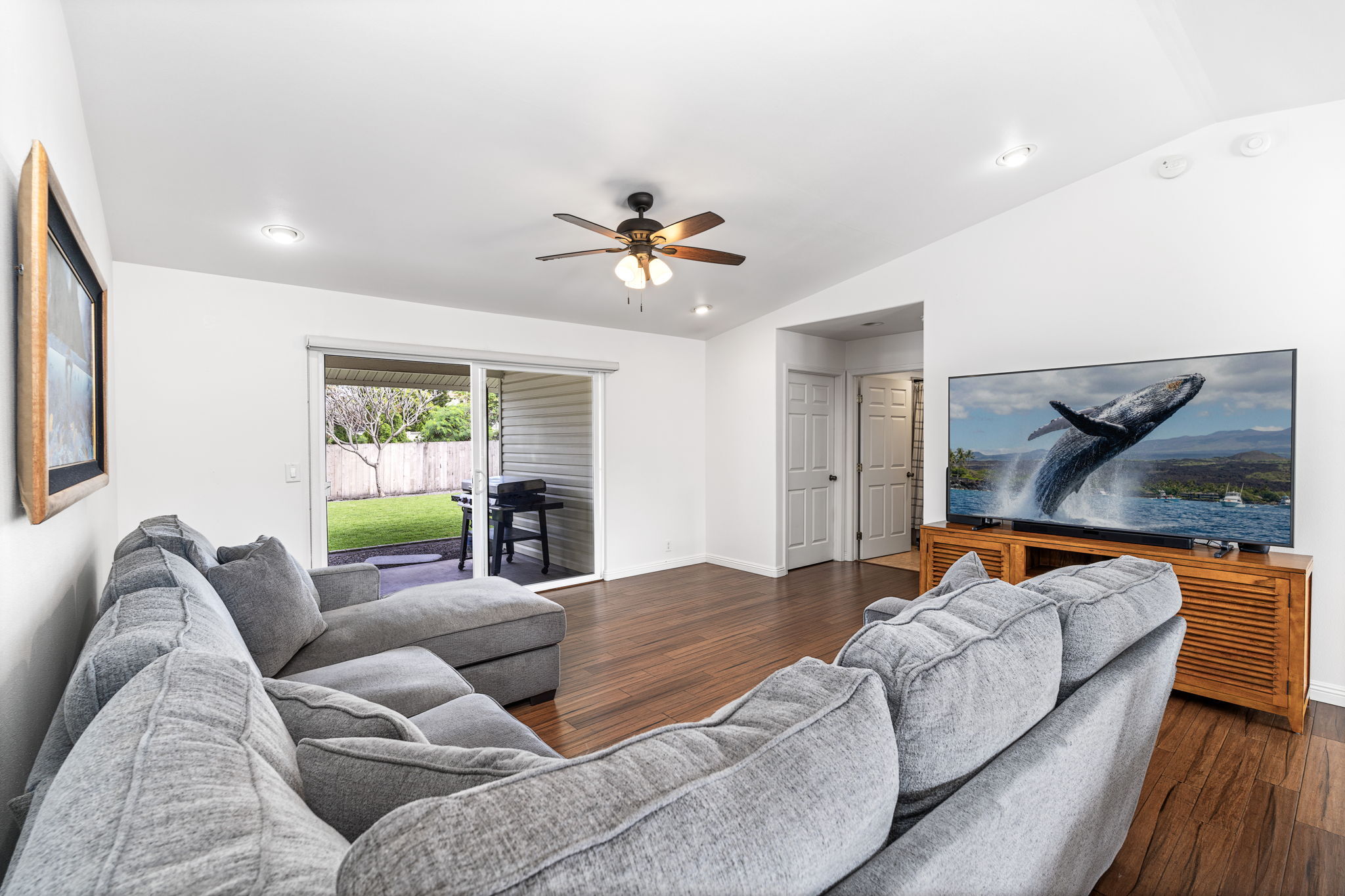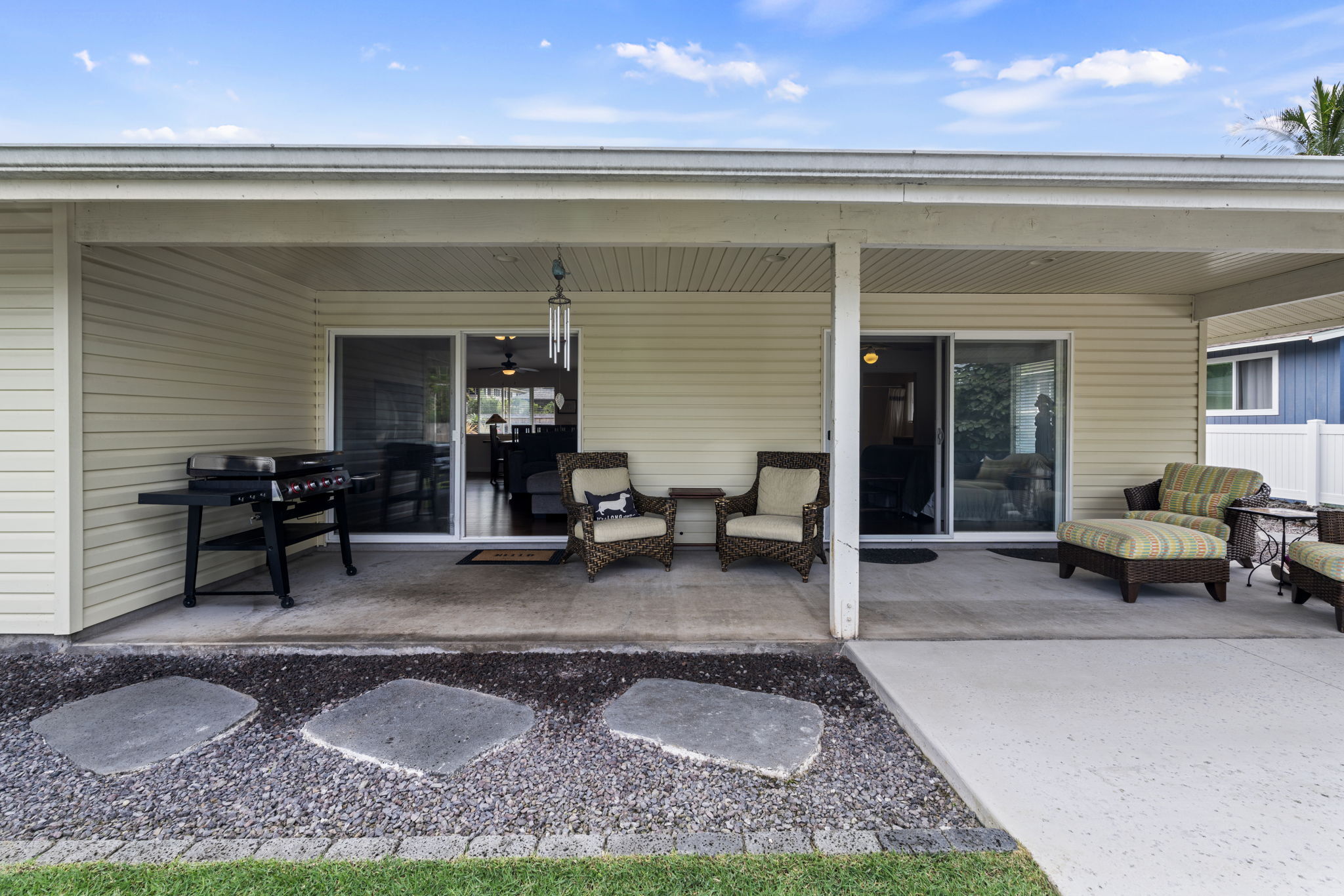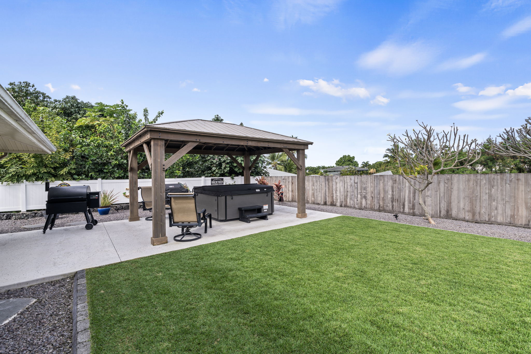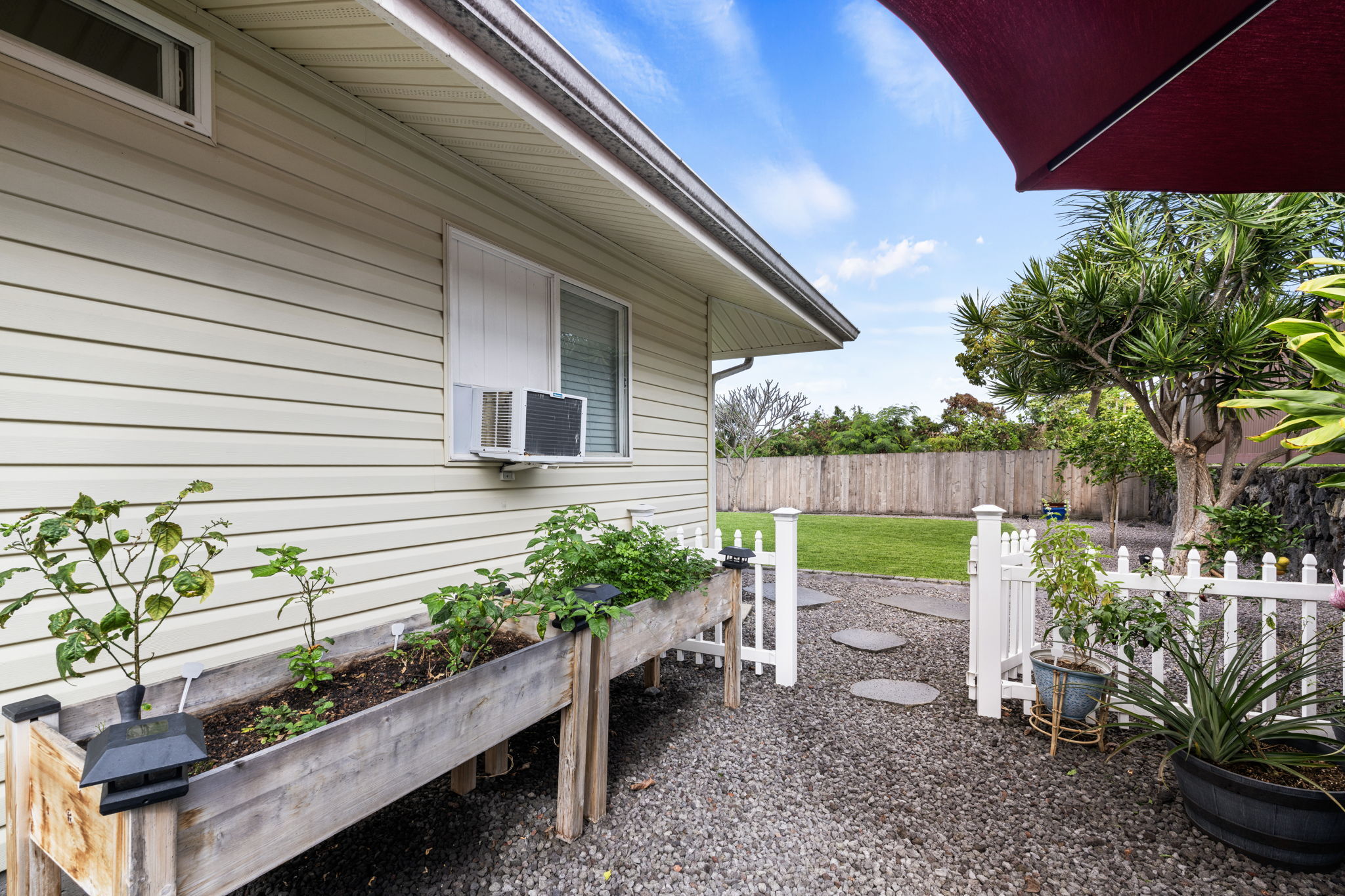 Single level Ranch style home with gorgeous open floor plan featuring four bedrooms and three bathrooms with two car garage. The main living space offers beautiful natural light through glass doors leading to the covered lanai and features vaulted ceilings and zoned/split AC where the kitchen and living room are connected by the dining space with natural flow. The Primary bedroom is spacious and boasts en suite bathroom with zoned/split AC and access to covered lanai. Property is gated with rock walls and fence! Large families or car enthusiasts will appreciate that multiple vehicles can be parked securely, if needed. Exceptional NEW landscaping is premier with Zoysia Sod, stamped lava rock paths, Tahitian limes, lemons, white & gold pineapple, and abundant in orchids and ornamentals. Level, manicured, and easily manageable landscaping awaits that can support your garden dreams. Both the front and back have been newly landscaped and exceptionally cared for. Fully enclosed with fencing providing future owners peace of mind for pets and family to enjoy the space leisurely. Hot Tub included with sale! Enjoy many lovely, shaded areas, including the Pergola nestled in the landscaping. Discover beautiful views of Hualalai Mountain from the property! Located in the heart of Kona, only minutes from the Airport, Beaches, Food & Gas.