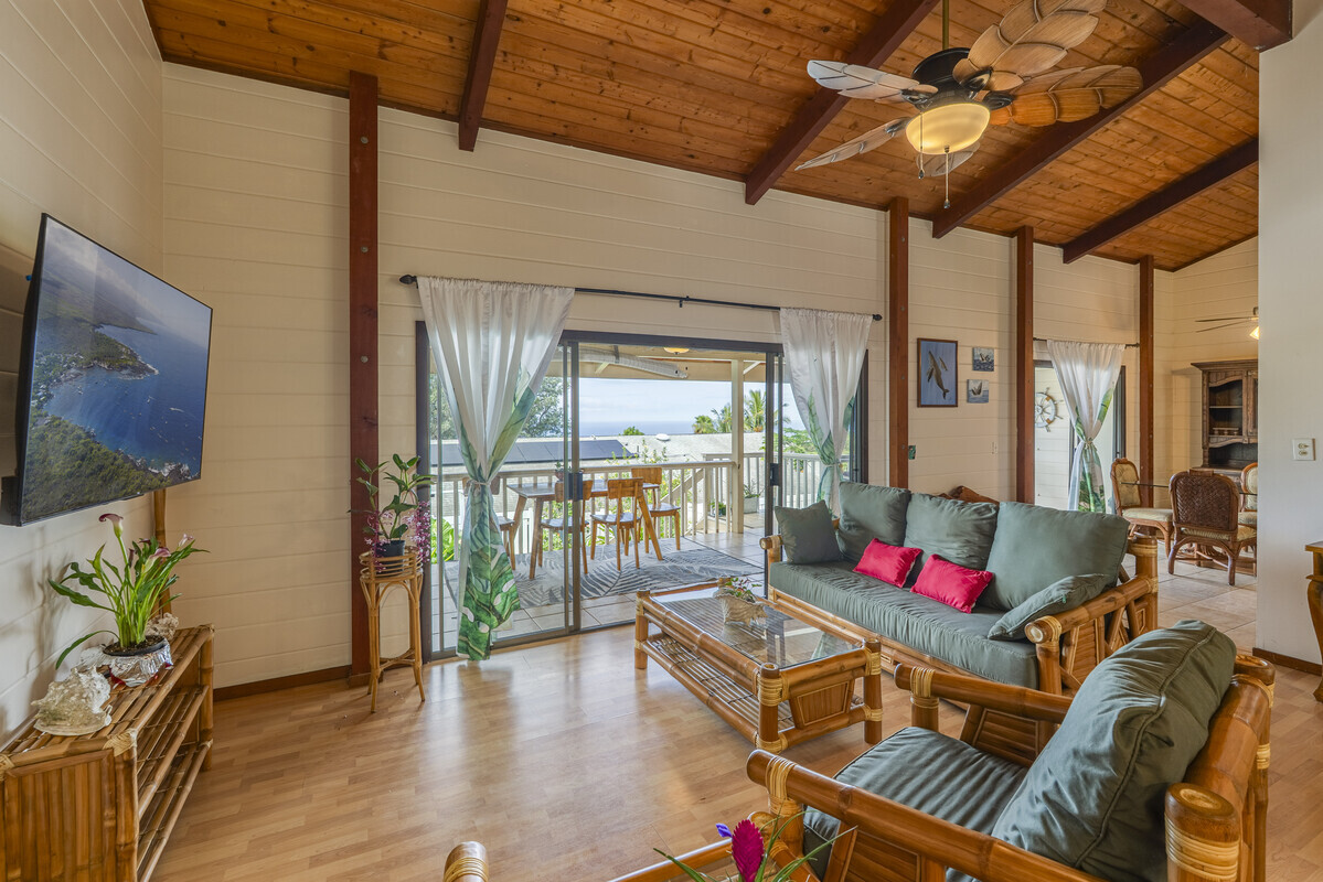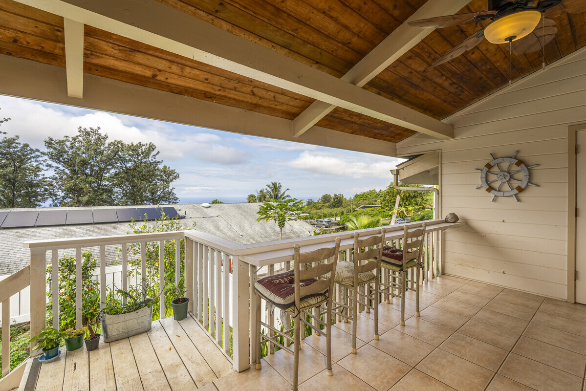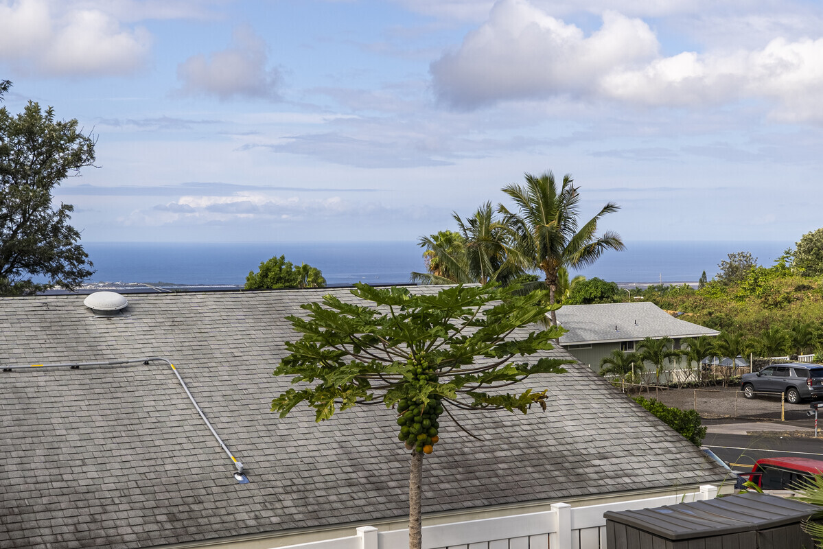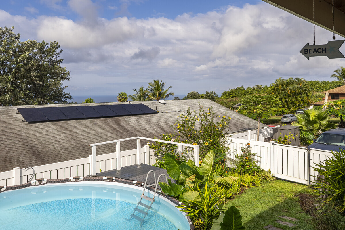 Amazing value in Kona Palisades! This single level home features 3 bedrooms and 2 baths with a den/office. The entire house, build of cedar, has vaulted open beam ceilings and a couple skylights. Situated at a comfortable elevation, this home was built allowing for easy flow from garage to kitchen to the bedrooms, which are situated at the rear of the home. The large lanai, with ocean views, is accessible through large sliding glass doors from different areas in the home, making it very convenient. This home is in very good condition but by adding a few upgrades, you could make it even better!! Setting this residence apart is the large, fully fenced fairly-level yard, where they have added an above ground pool to enjoy with family and friends, and allows your pets to be safely enclosed. There is also an additional parking pad which may even accommodate a small boat or additional cars.