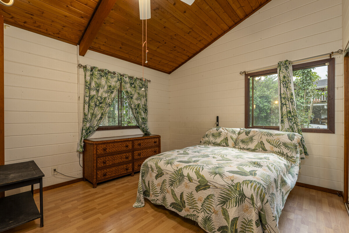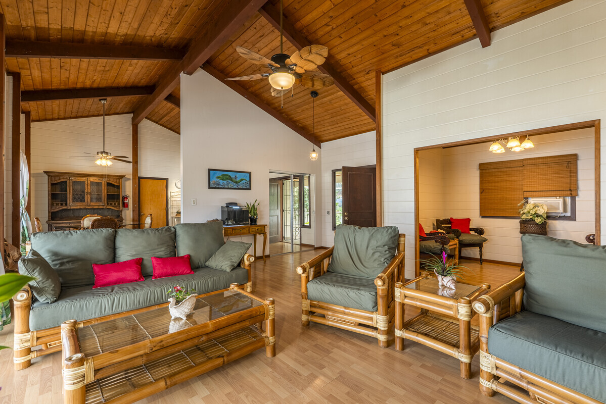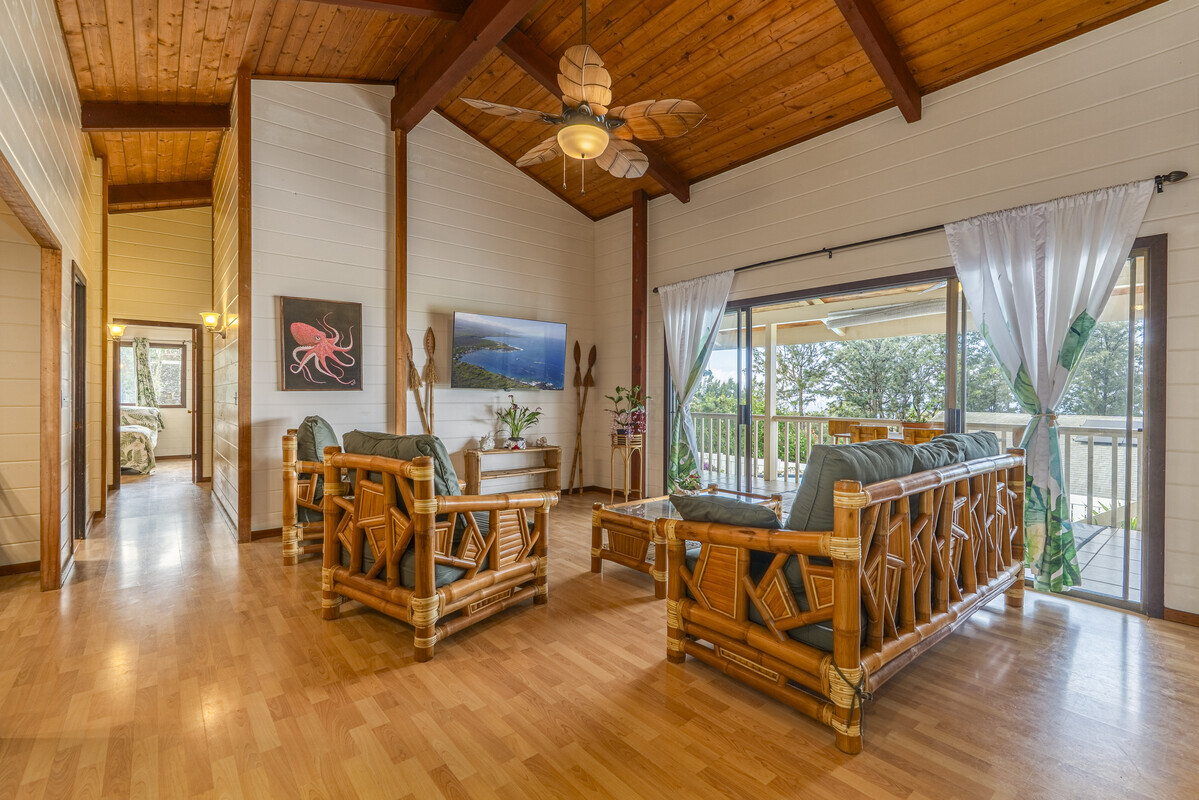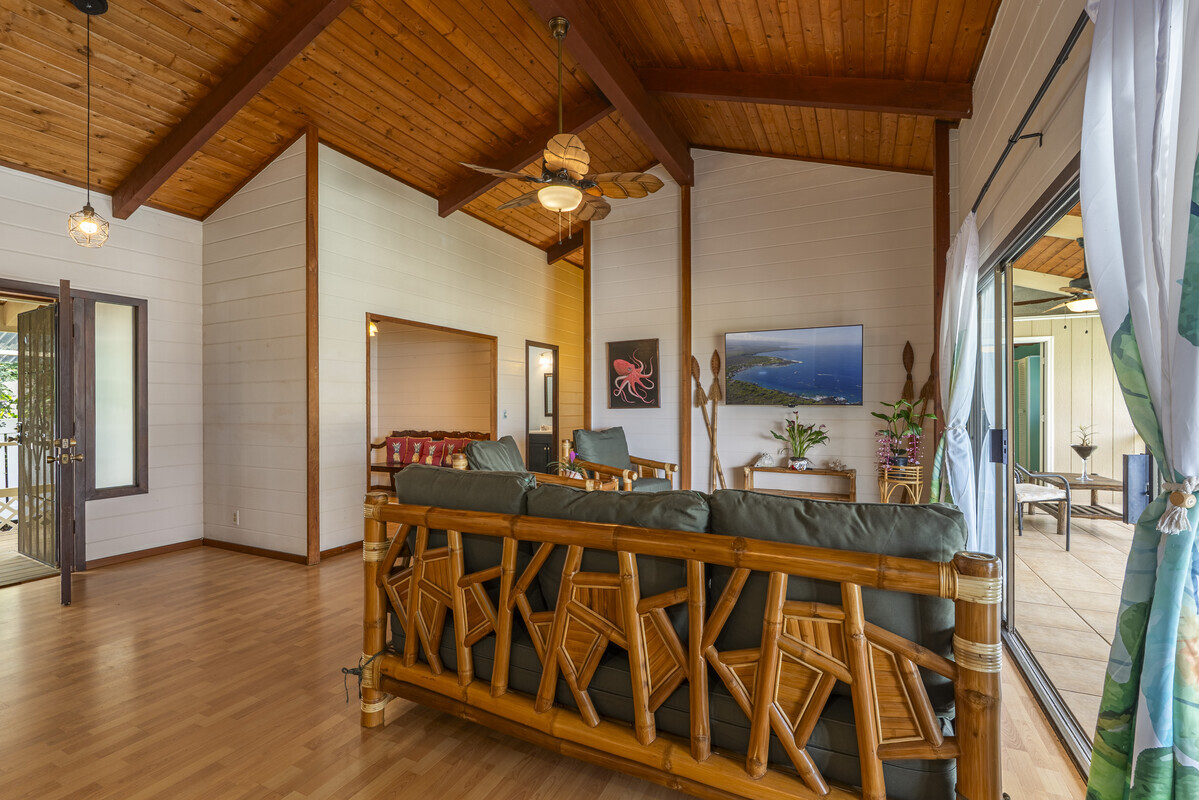 Amazing value in Kona Palisades! This single level home features 3 bedrooms and 2 baths with a den/office. The entire house, build of cedar, has vaulted open beam ceilings and a couple skylights. Situated at a comfortable elevation, this home was built allowing for easy flow from garage to kitchen to the bedrooms, which are situated at the rear of the home. The large lanai, with ocean views, is accessible through large sliding glass doors from different areas in the home, making it very convenient. This home is in very good condition but by adding a few upgrades, you could make it even better!! Setting this residence apart is the large, fully fenced fairly-level yard, where they have added an above ground pool to enjoy with family and friends, and allows your pets to be safely enclosed. There is also an additional parking pad which may even accommodate a small boat or additional cars.