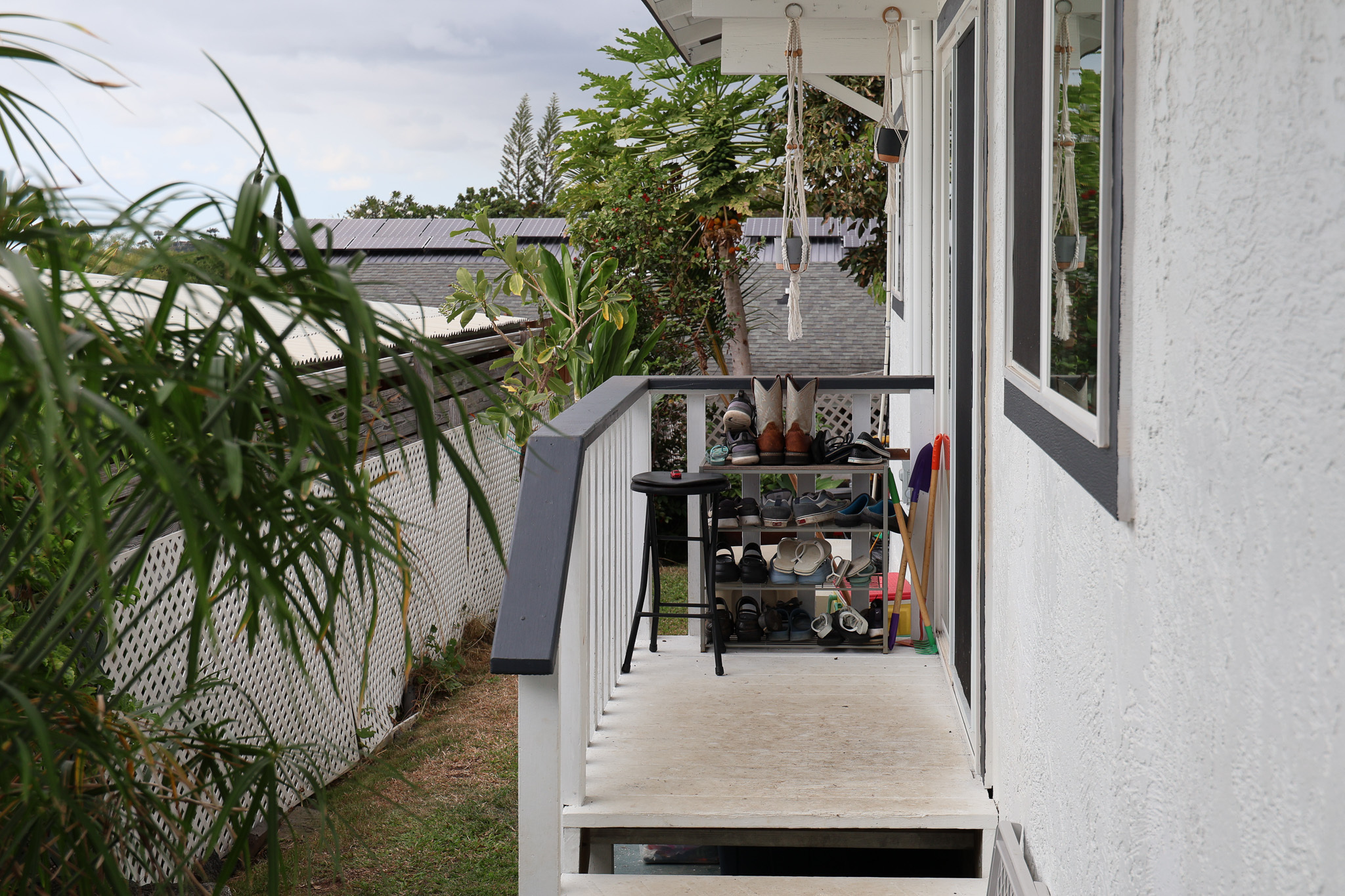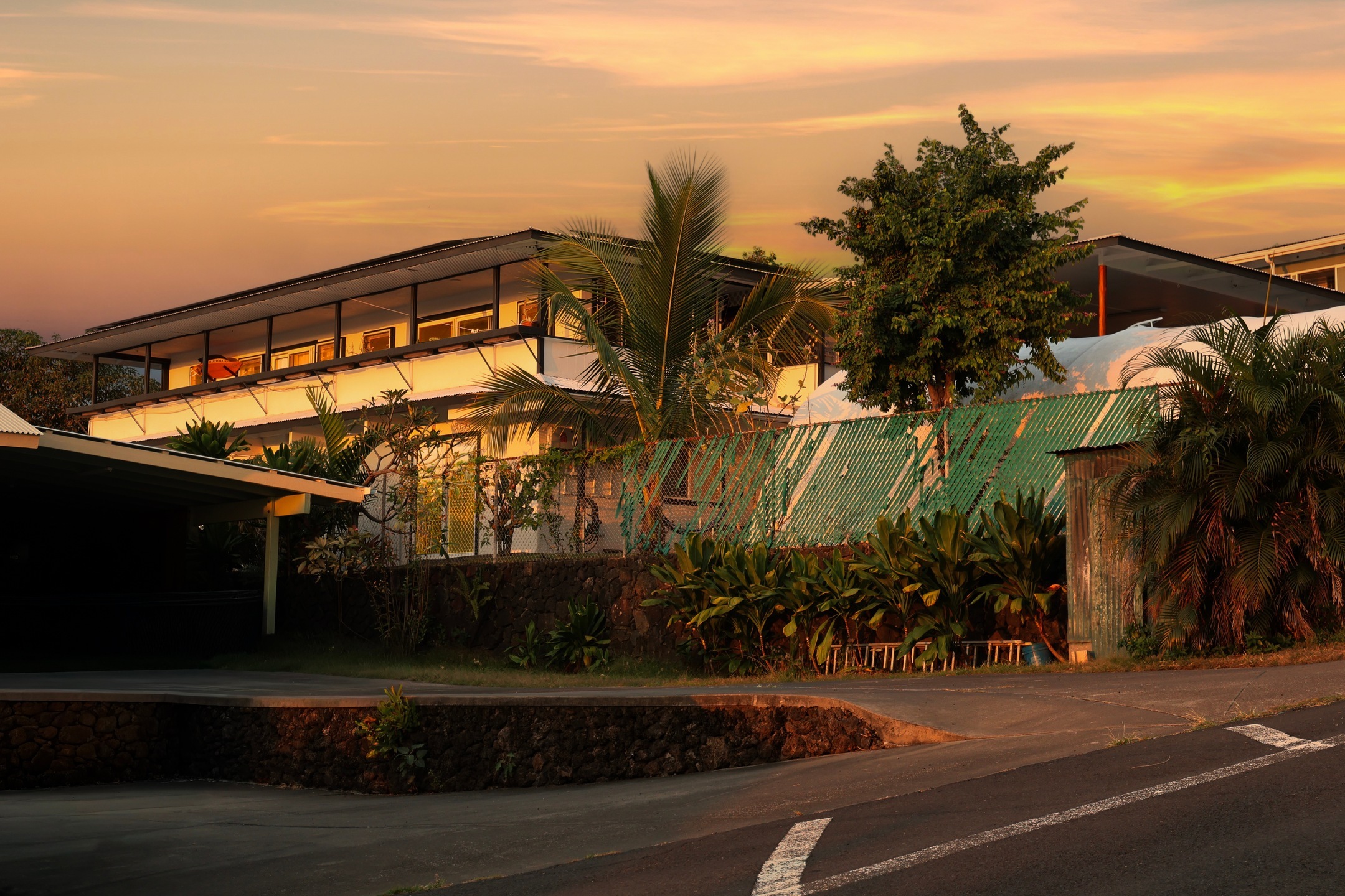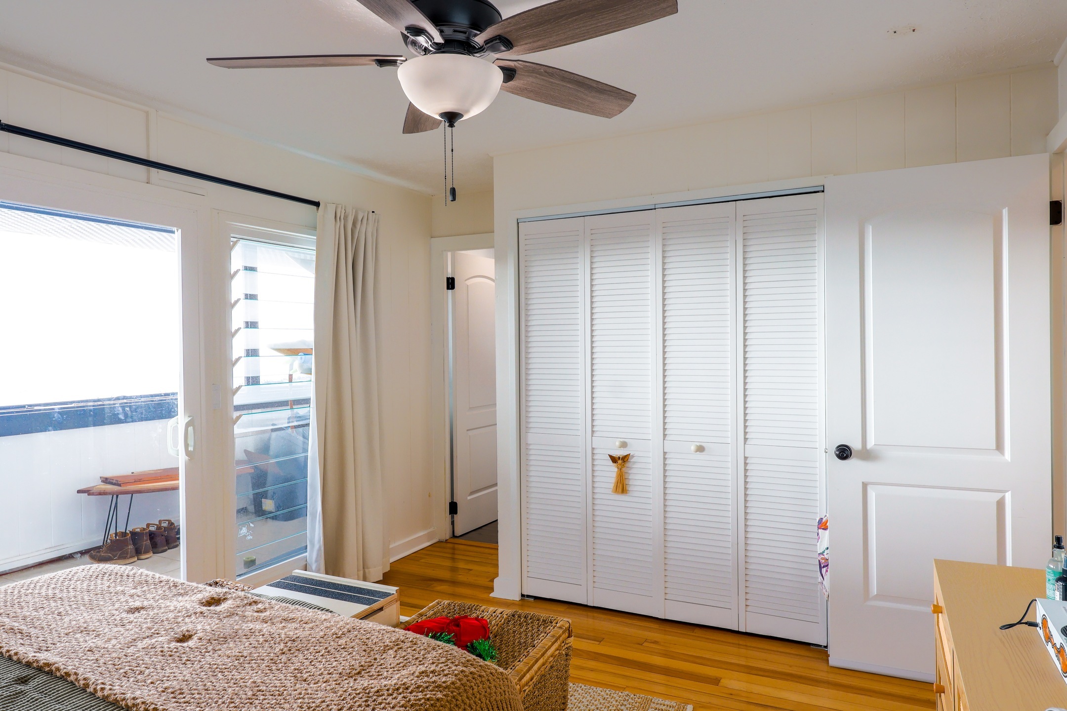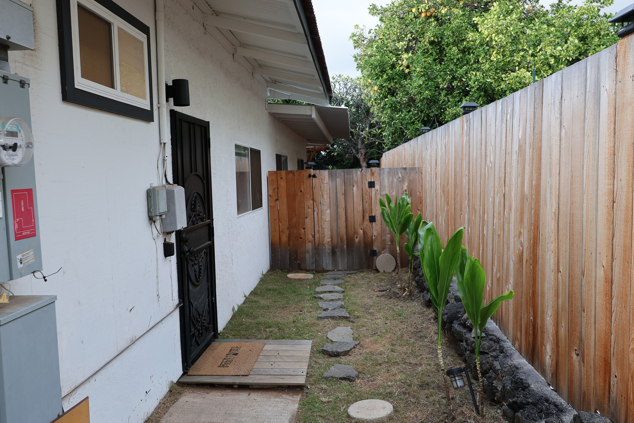 The upper 3-bedroom, 2-bath unit features a private lanai built with classic heartwood flooring, high-end ipe wood, showcasing wide ocean and downtown Kona views–where you can even watch cruise ships come. A whole-house fan helps keep the unit cool.
