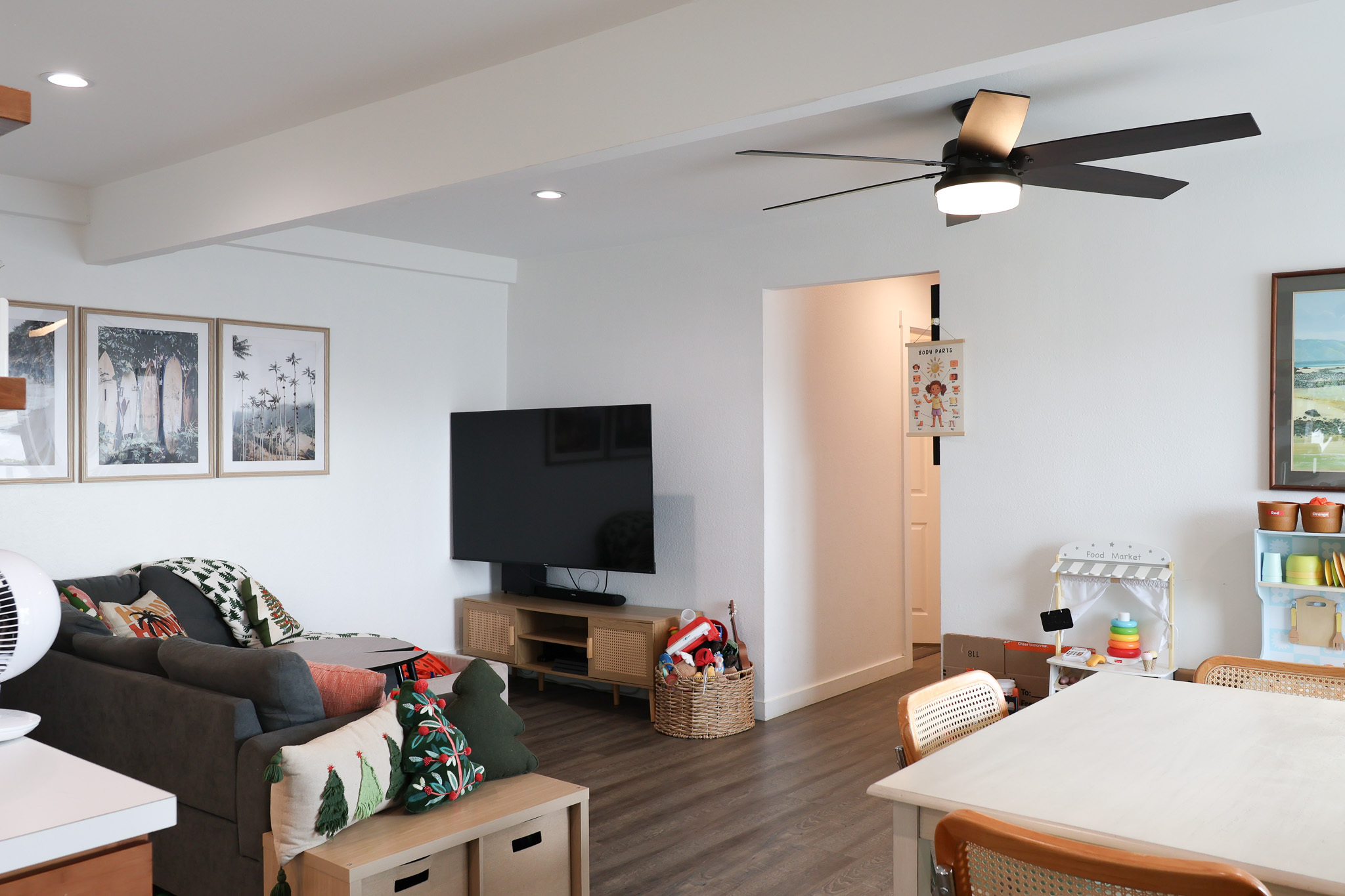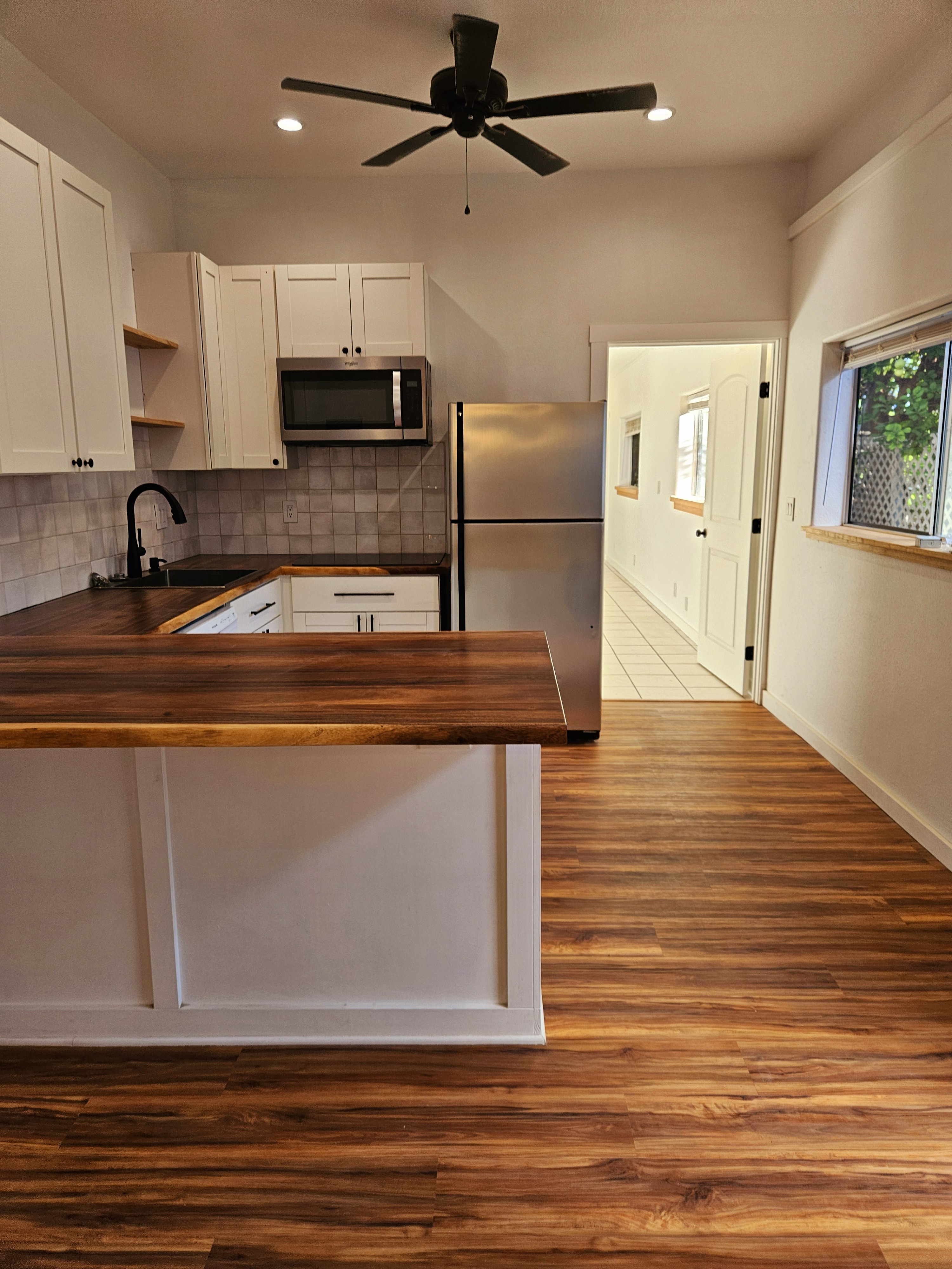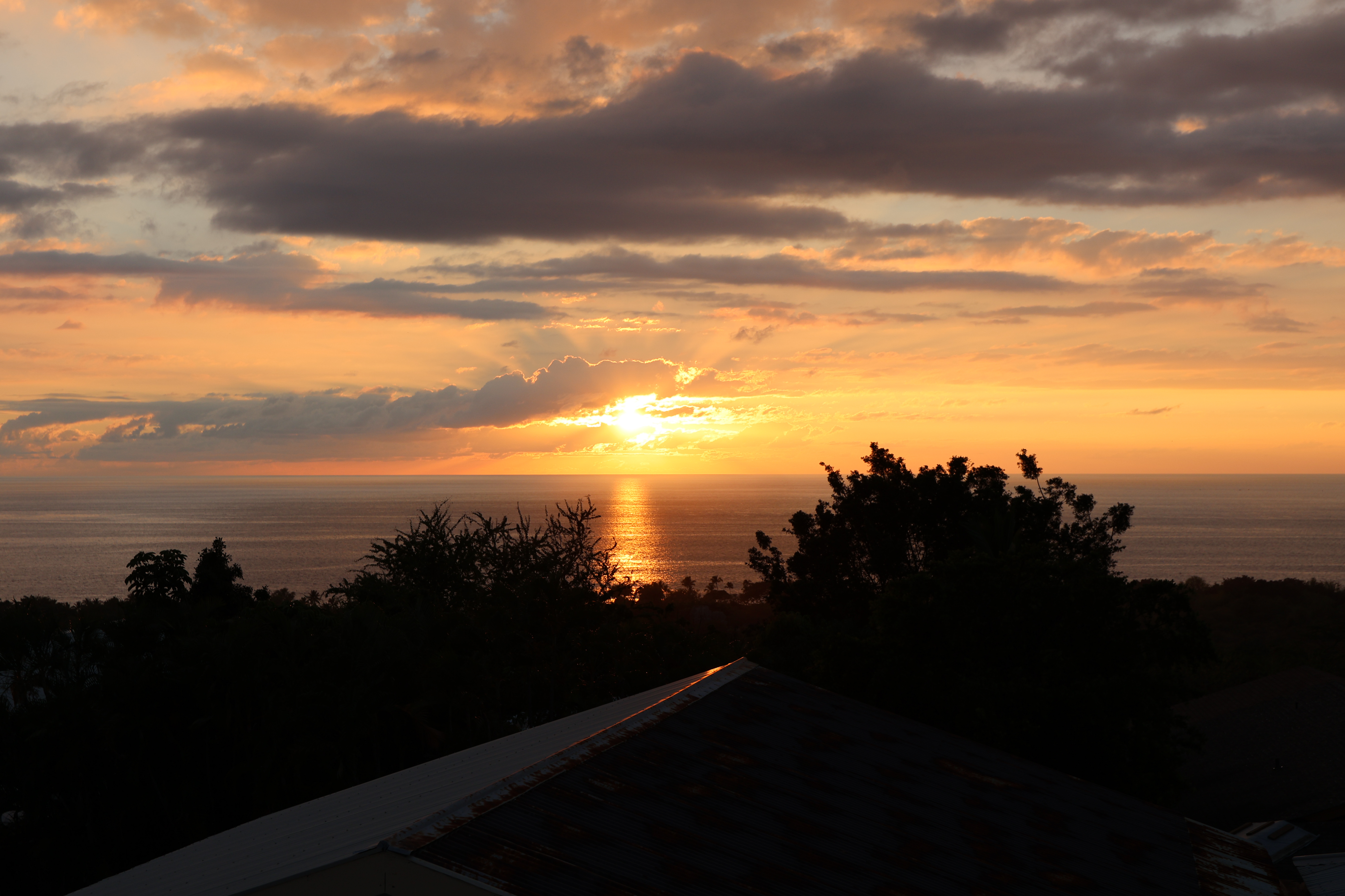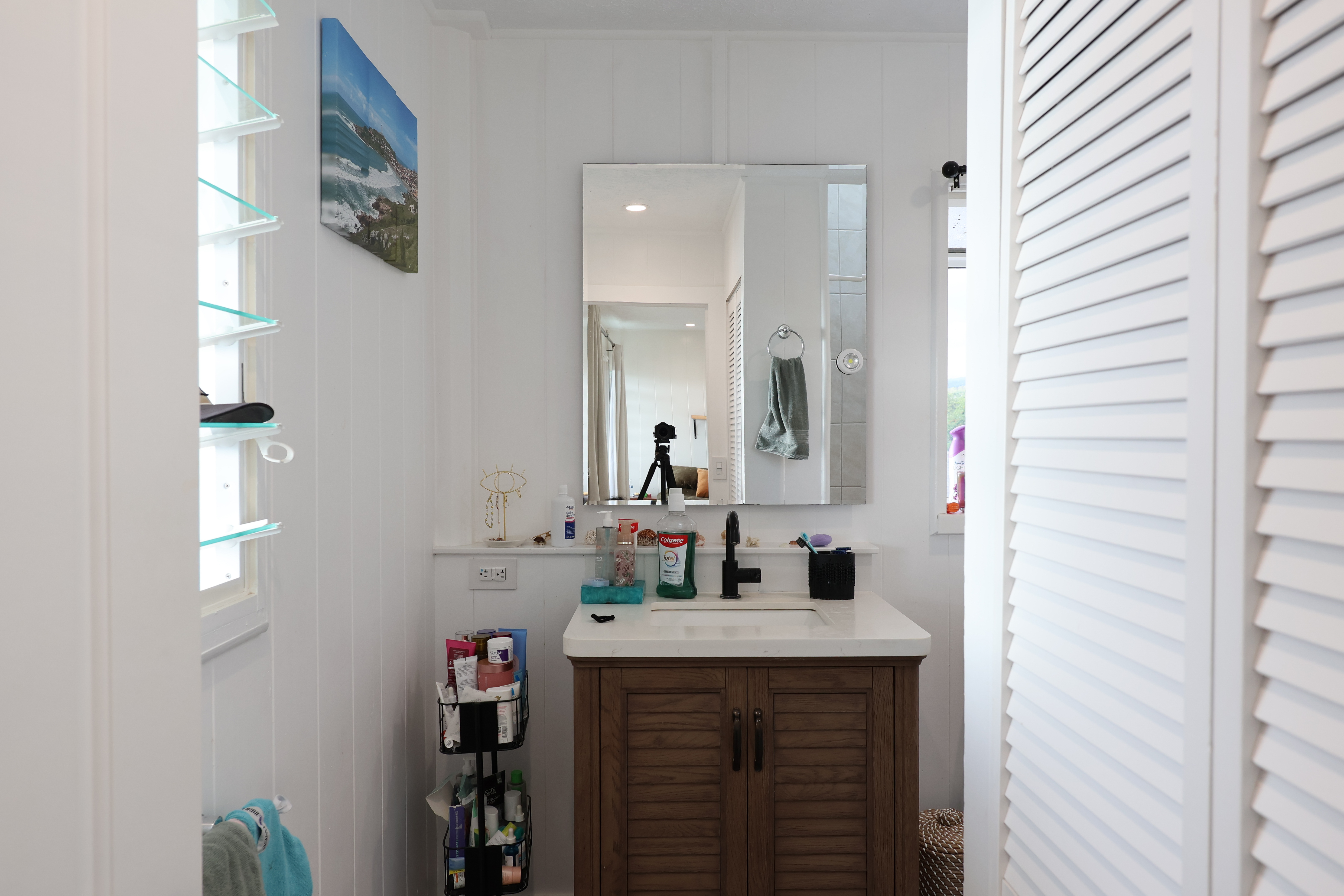 The upper 3-bedroom, 2-bath unit features a private lanai built with classic heartwood flooring, high-end ipe wood, showcasing wide ocean and downtown Kona views–where you can even watch cruise ships come. A whole-house fan helps keep the unit cool.