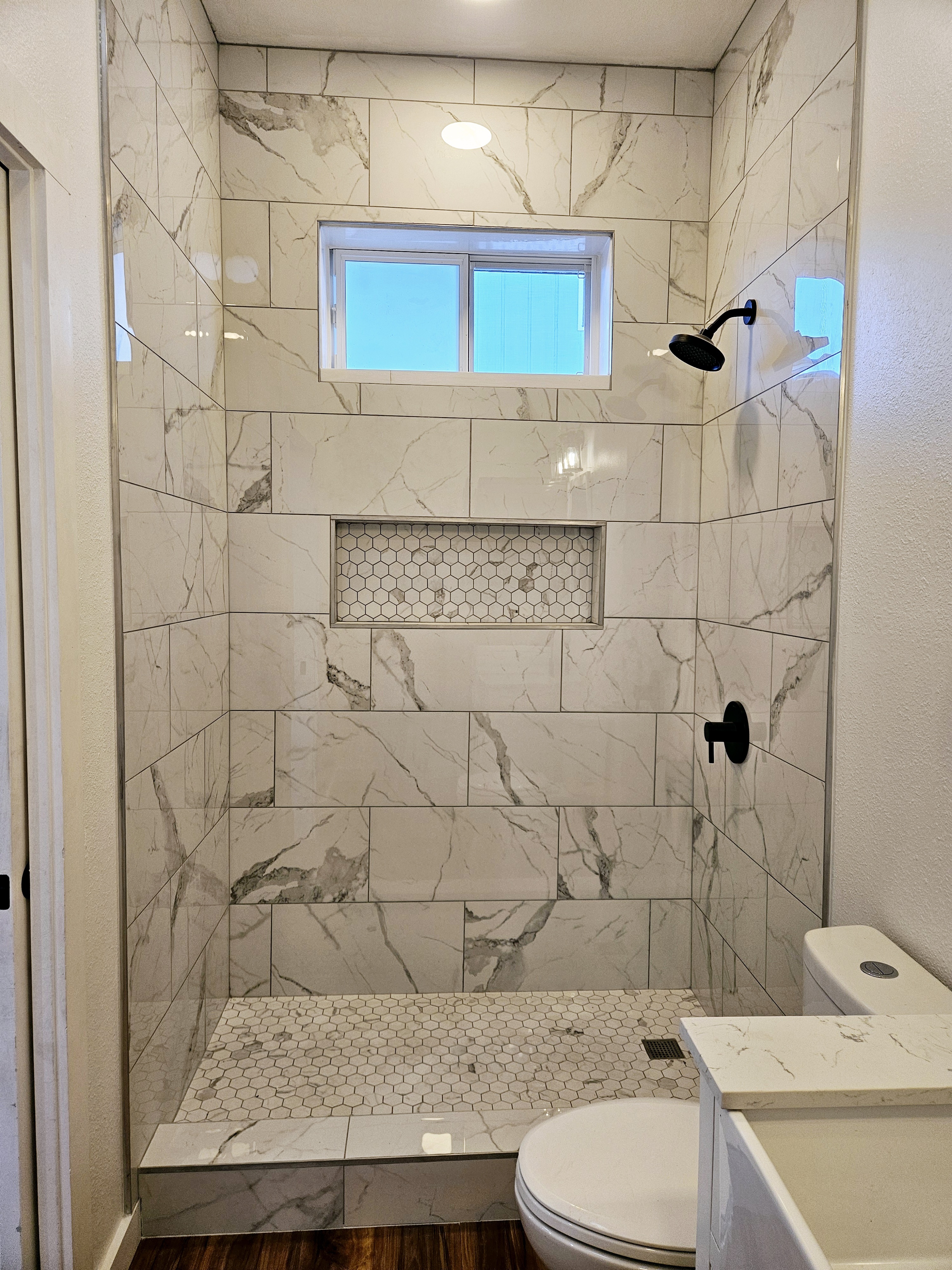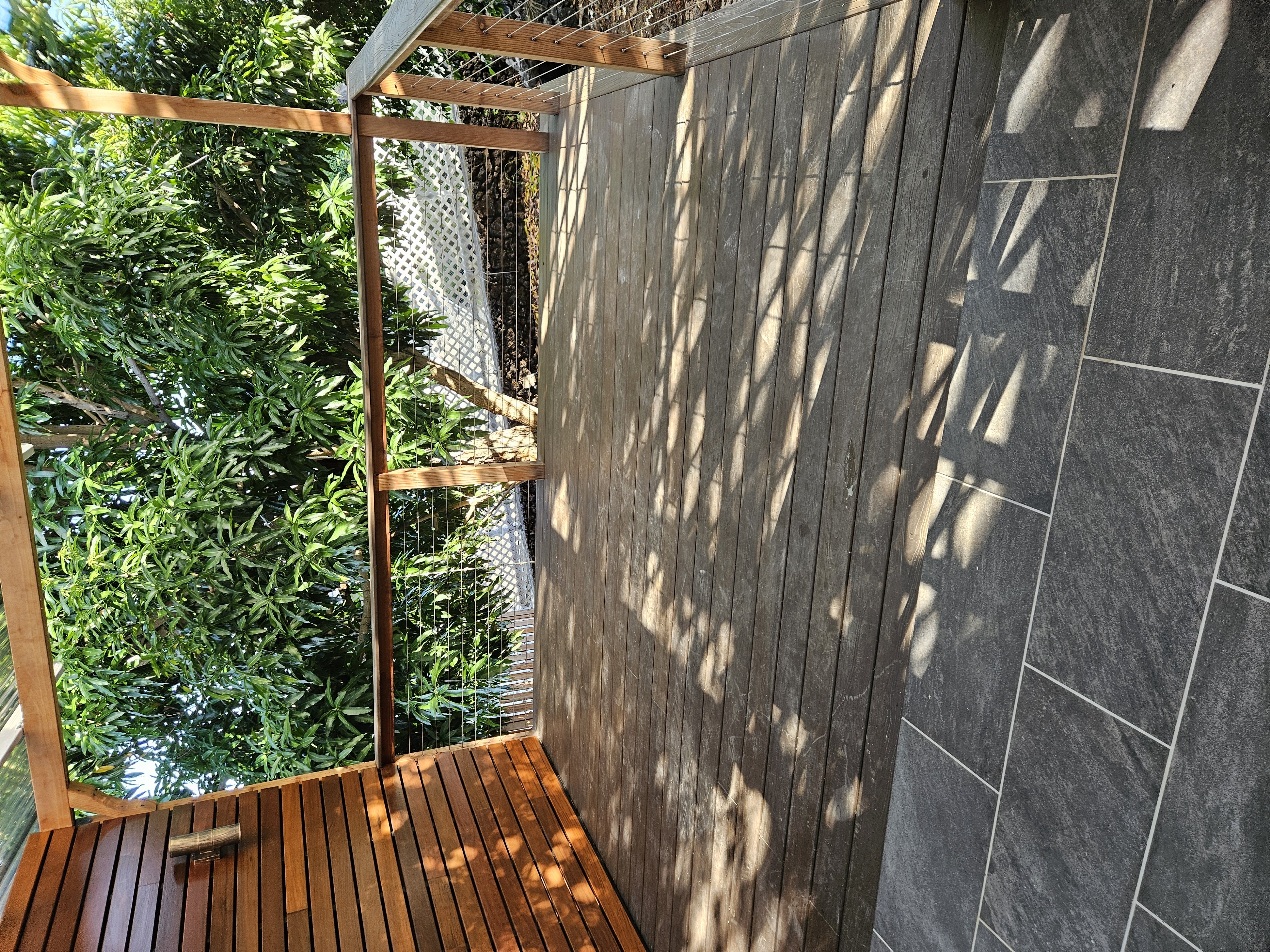 The studio unit provides another income-producing option with a private outdoor space. Featuring acacia wood countertops and a floor to ceiling marble tile shower
