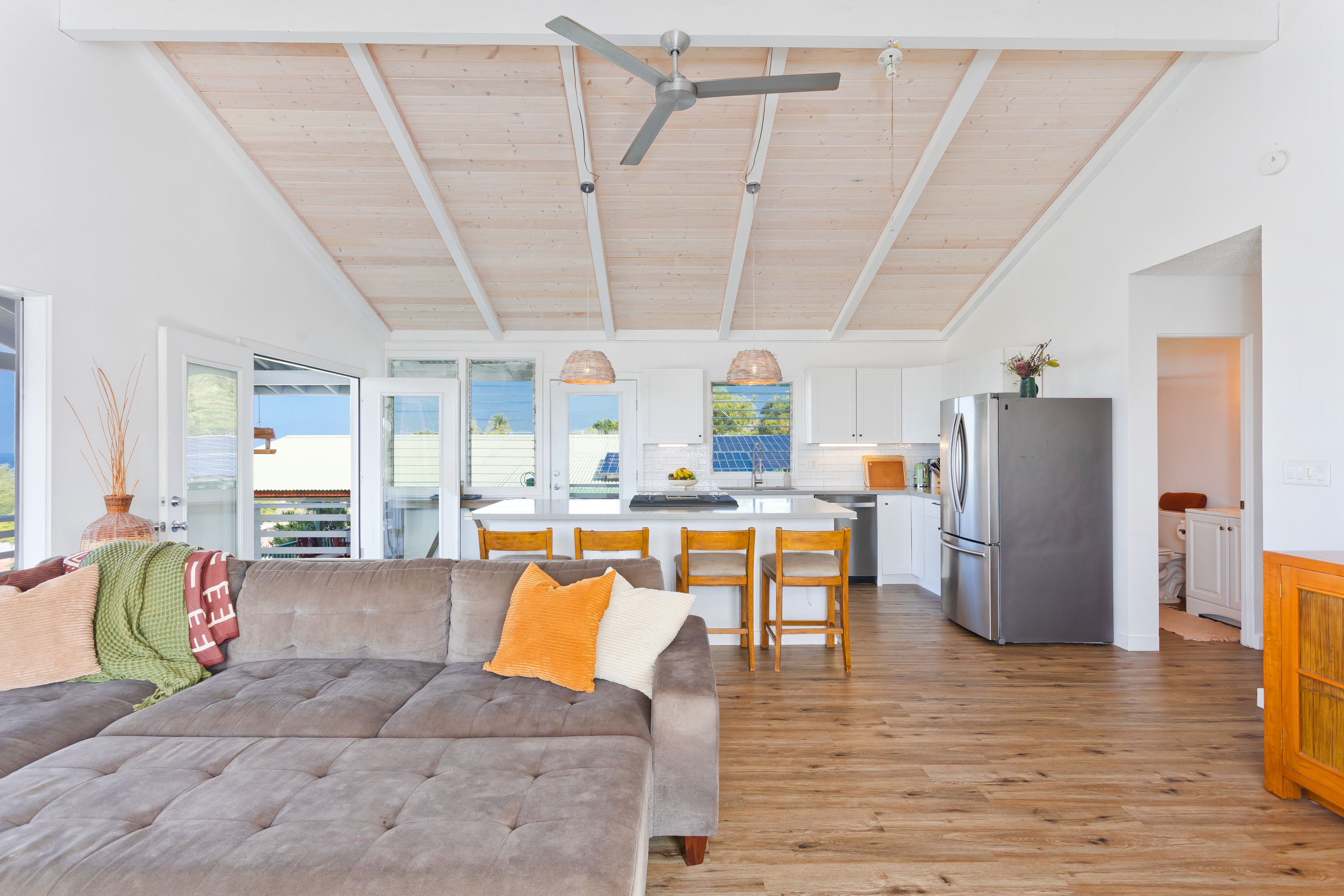 Million dollar views for under a million! This inviting 3-bedroom, 2-bath home offers sweeping ocean views and a bright, airy feel throughout. Free from power lines, the home captures the beauty of the coastline from both the interior living spaces and the outdoor lanai. The lanai is the perfect place to lounge, sip your morning coffee, or unwind in the evening while taking in the ever-changing ocean horizon. In winter, whales can be spotted daily. The home was renovated in 2019 and features updated appliances, thoughtful upgrades, and comfortable island living. The primary bedroom includes an en-suite bathroom, creating a private retreat within the home. A tankless water heater provides energy efficient hot water. Outdoors, you'll also find a stand-up chicken coop, a fun feature for those interested in fresh eggs or embracing a small homestead lifestyle. With beautiful views, modern updates, and a relaxed indoor-outdoor flow, this home offers a wonderful opportunity to enjoy life on the Big Island. Owners request buyers consider leaseback through 5/31/26. Owner holds an active real estate license.