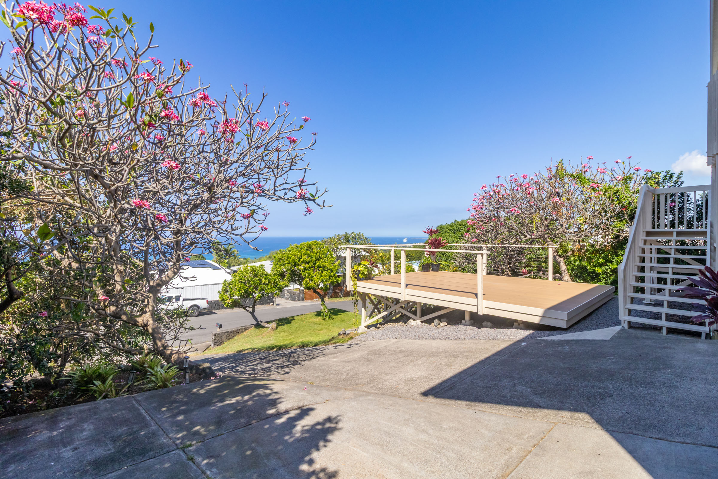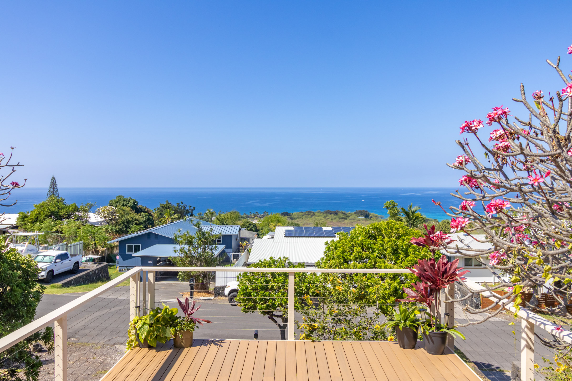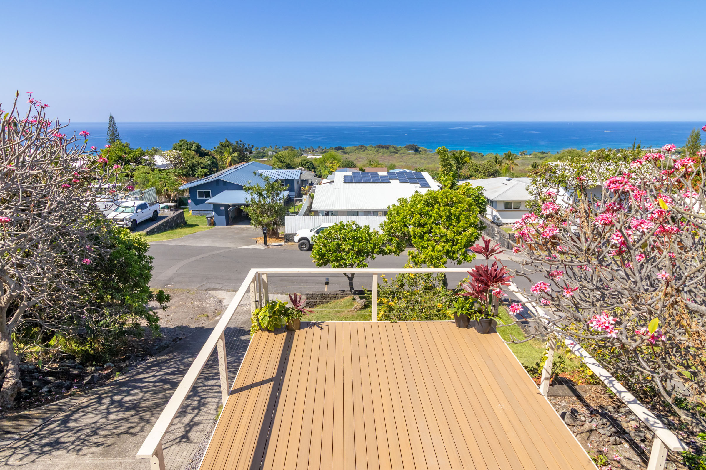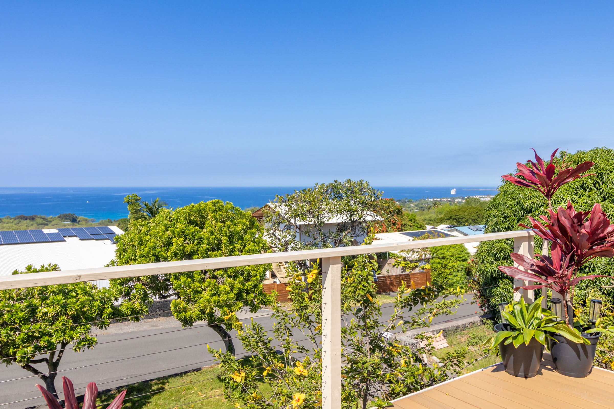 Discover this serene oasis in this this thoughtfully upgraded home located in central Sea View Circle. Spanning 1,147 square feet, the Leialoha home boasts 3 bedrooms and 2 bathrooms, providing ample space for both relaxation and entertainment. Offering expansive ocean and sunset views and a multitude of outdoor areas for fruit picking, gardening and entertaining fun with friends and family. Experience 77-6507 Leialoha Street https://player.vimeo.com/video/1169395566 Upon entering, you are greeted by the open floor plan with generous living area showcasing expansive panoramic ocean and sunset views. The kitchen is a modern masterpiece, featuring newer appliances, quartz counter tops in kitchen and bath with soft close cabinets. There's ample counter space, perfect for prepping and entertaining. Tying the modern aesthetic throughout are easy maintenance waterproof luxury vinyl plank flooring. The ground level features a modern, 1 bedroom Ohana Suite that offers an opportunity for additional living quarters, multigenerational housing or as a rental. Recently upgraded it includes a kitchenette sink and counter, new shower, toilet, washer and dryer, and utility sink. The lushly landscaped grounds invite you to unwind in the charming garden oasis. Lounge on the deck, soak in the sun or dine alfresco while taking in the mesmerizing sunset seascape. The landscaped grounds have retaining rock walls and established hedges and fruit trees - two varieties of mango, avocado, tangerine, orange, and a star fruit. All within reach and close proximity to all the conveniences of Kailua-Kona shopping, schools, dining and beaches.
