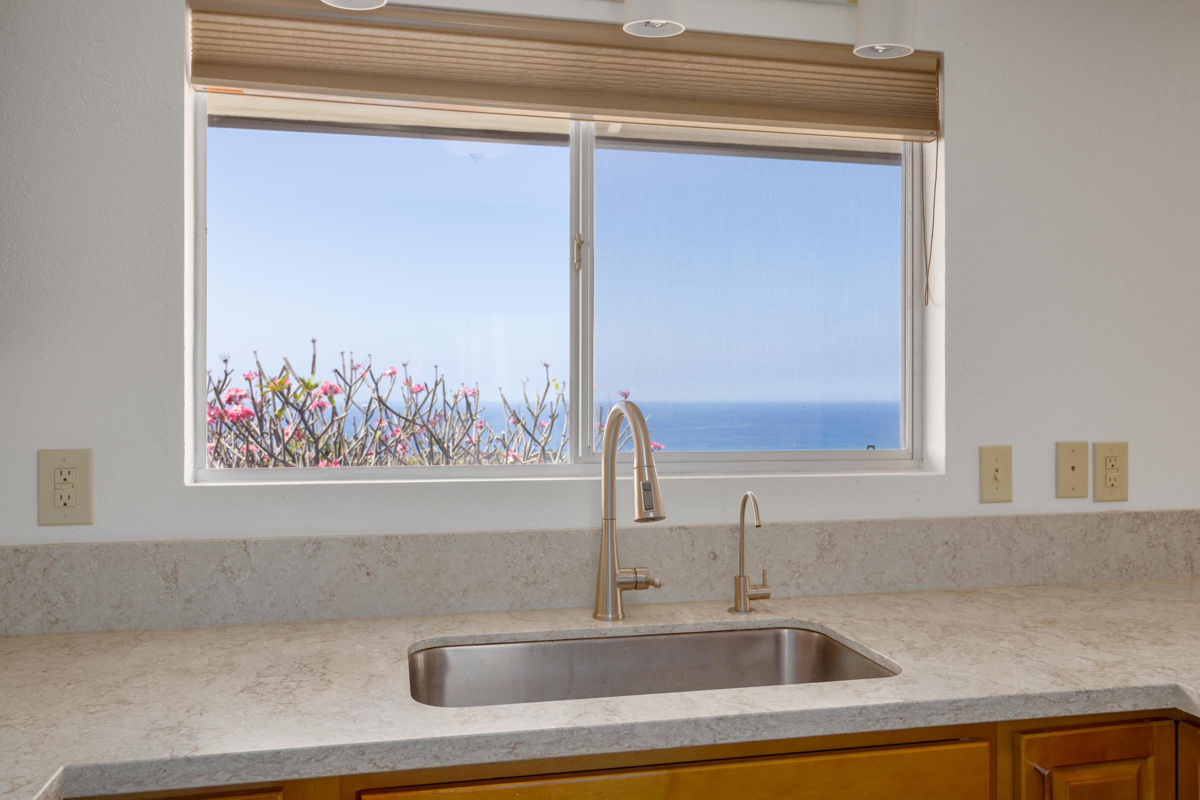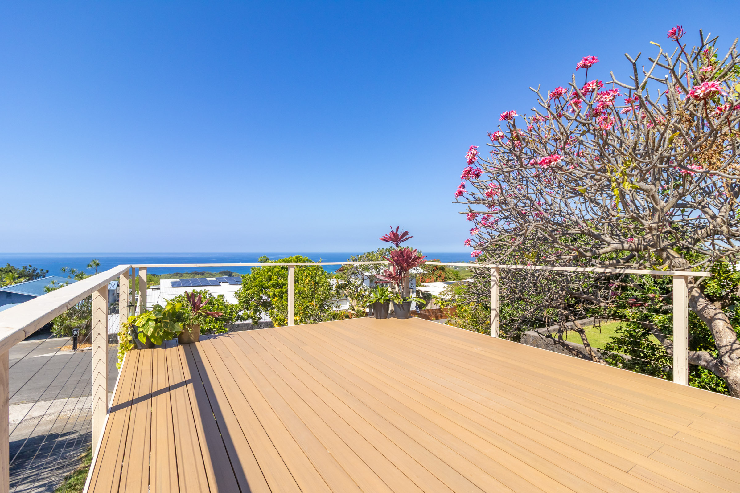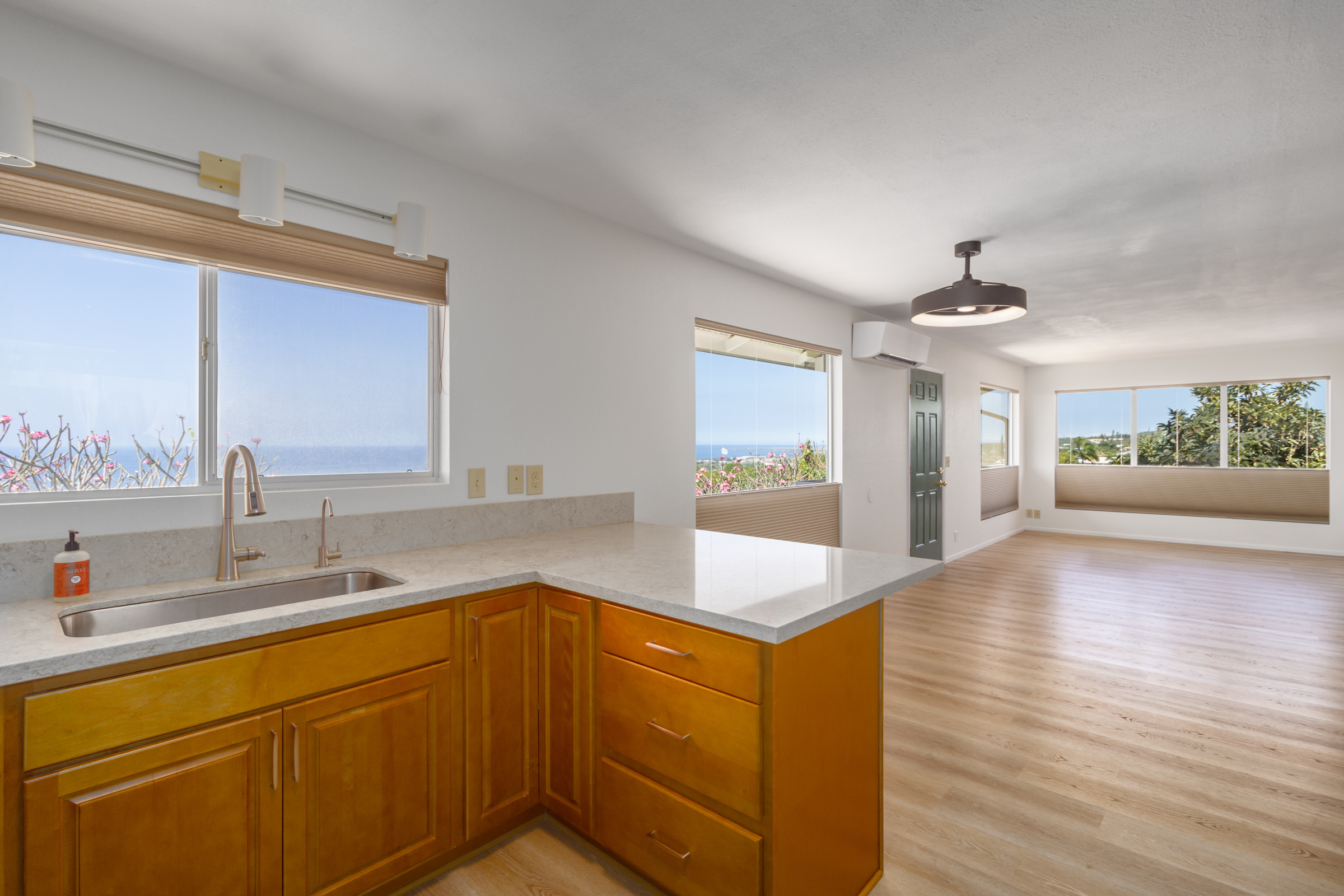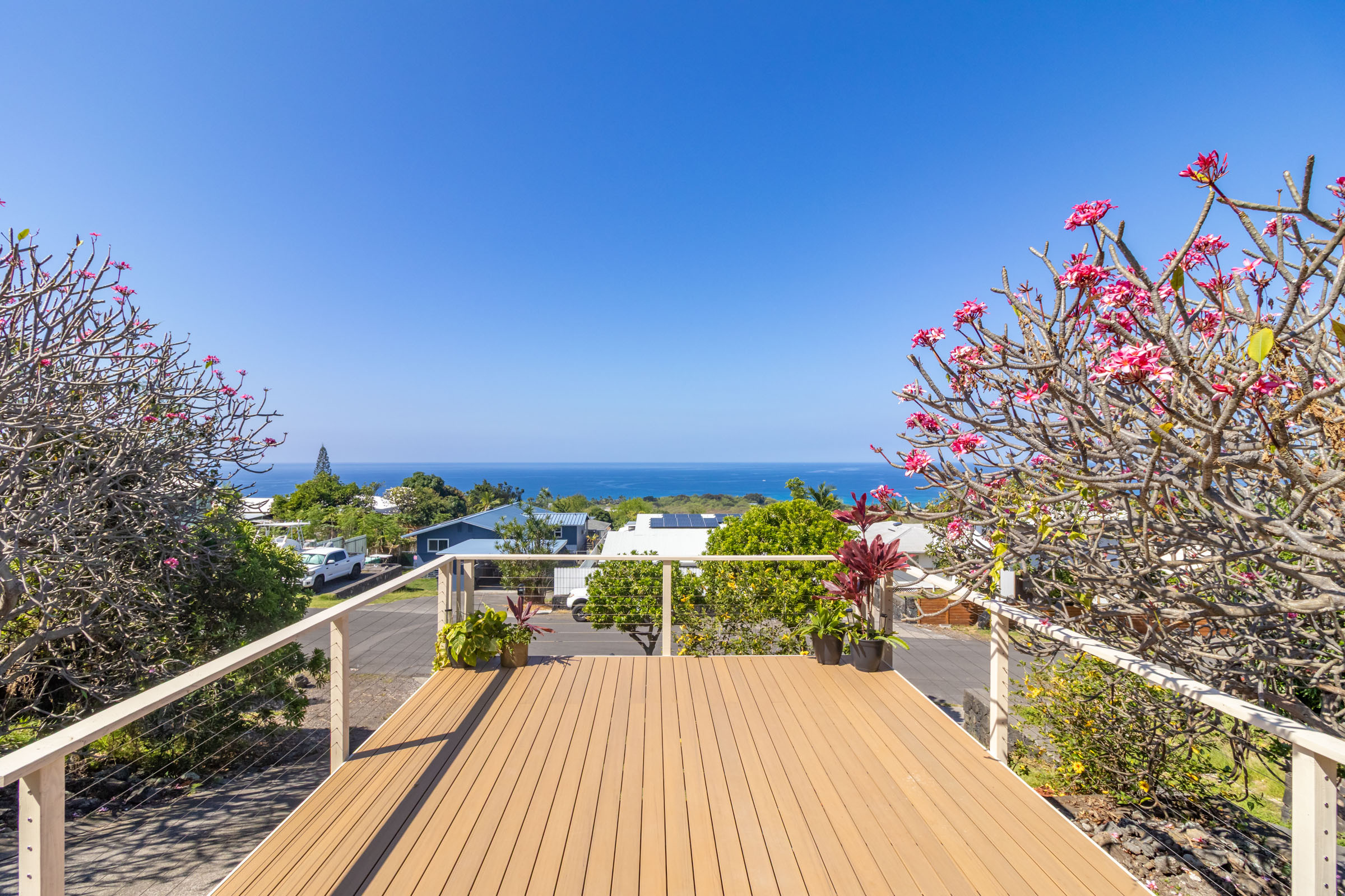 Discover this serene oasis in this this thoughtfully upgraded home located in central Sea View Circle. Spanning 1,147 square feet, the Leialoha home boasts 3 bedrooms and 2 bathrooms, providing ample space for both relaxation and entertainment. Offering expansive ocean and sunset views and a multitude of outdoor areas for fruit picking, gardening and entertaining fun with friends and family. Experience 77-6507 Leialoha Street https://player.vimeo.com/video/1169395566 Upon entering, you are greeted by the open floor plan with generous living area showcasing expansive panoramic ocean and sunset views. The kitchen is a modern masterpiece, featuring newer appliances, quartz counter tops in kitchen and bath with soft close cabinets. There's ample counter space, perfect for prepping and entertaining. Tying the modern aesthetic throughout are easy maintenance waterproof luxury vinyl plank flooring. The ground level features a modern, 1 bedroom Ohana Suite that offers an opportunity for additional living quarters, multigenerational housing or as a rental. Recently upgraded it includes a kitchenette sink and counter, new shower, toilet, washer and dryer, and utility sink. The lushly landscaped grounds invite you to unwind in the charming garden oasis. Lounge on the deck, soak in the sun or dine alfresco while taking in the mesmerizing sunset seascape. The landscaped grounds have retaining rock walls and established hedges and fruit trees - two varieties of mango, avocado, tangerine, orange, and a star fruit. All within reach and close proximity to all the conveniences of Kailua-Kona shopping, schools, dining and beaches.