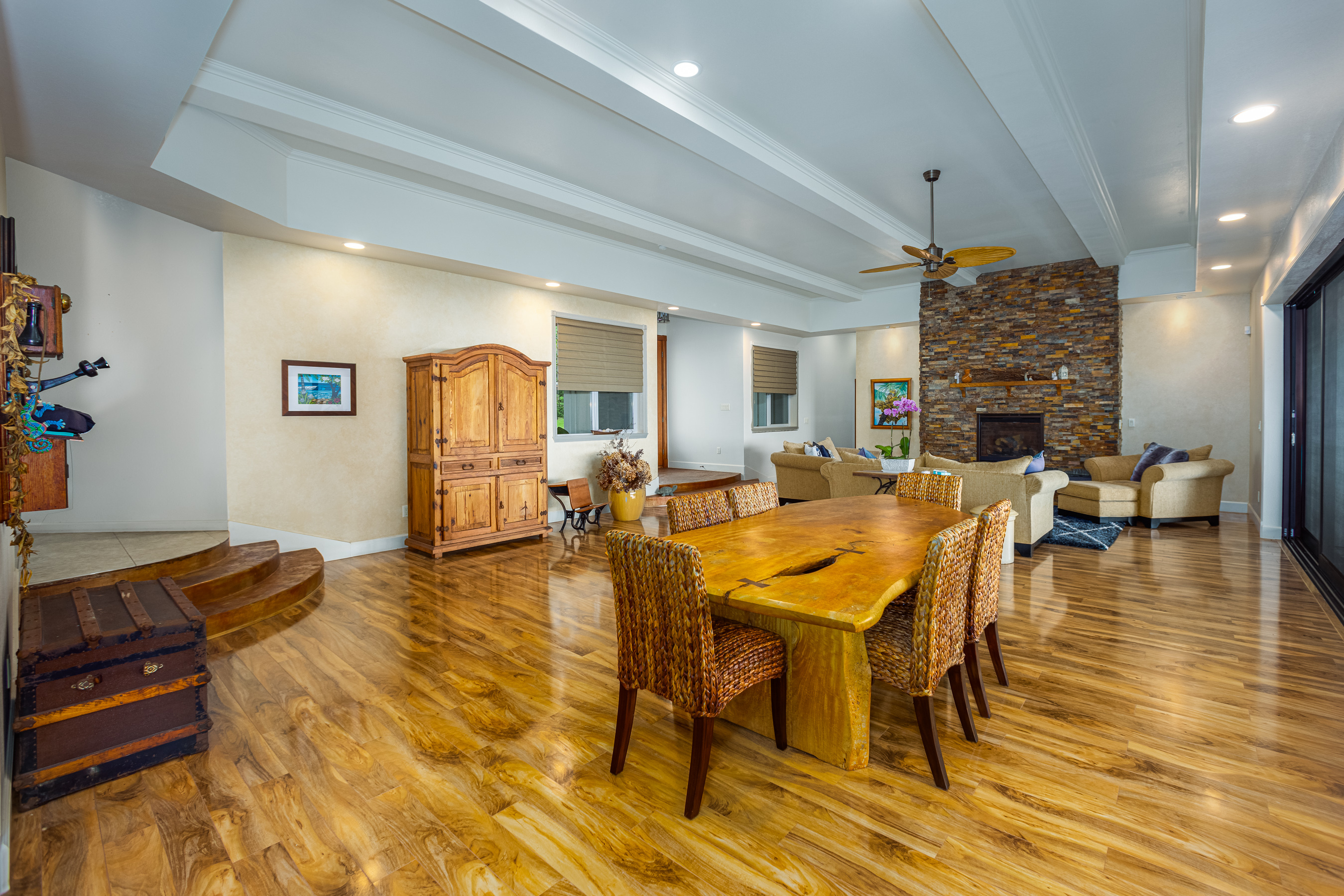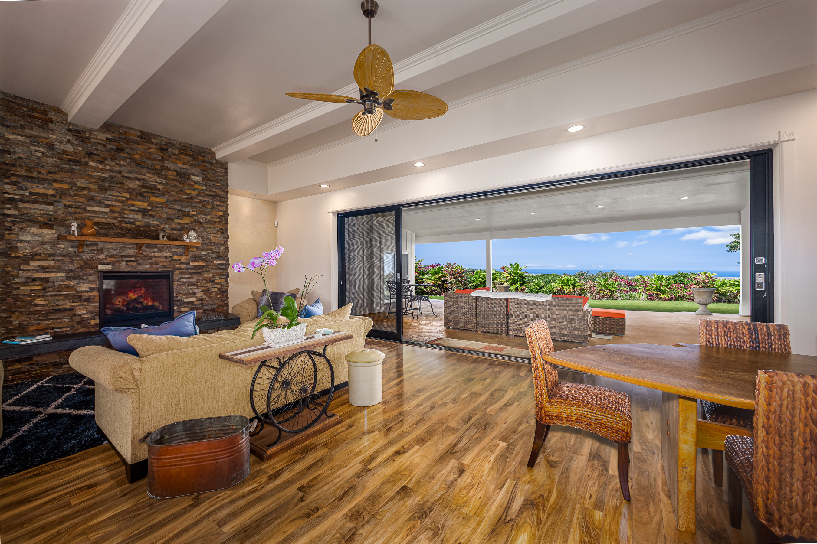 Luxury Coastal Estate with Ocean and Sunset views. Discover island luxury at its finest in this stunning 5,000 sq.ft. residence perched on one acre in a prestigious gated community along the Kona Coast. Designed to embrace panoramic ocean and sunset views, this elegant estate combines the best of island living with sophisticated comfort and exceptional craftsmanship. The home features an open concept great room with soaring ceilings, expansive pocket glass doors, and seamless indoor-outdoor flow to the spacious lanai-perfect for entertaining or simply relaxing as you watch the sun dip below the horizon. The gourmet kitchen is a chef's dream, complete with high end appliances, custom cabinetry, and a large island that opens to the dining and living areas anchored by a beautiful stone fireplace.