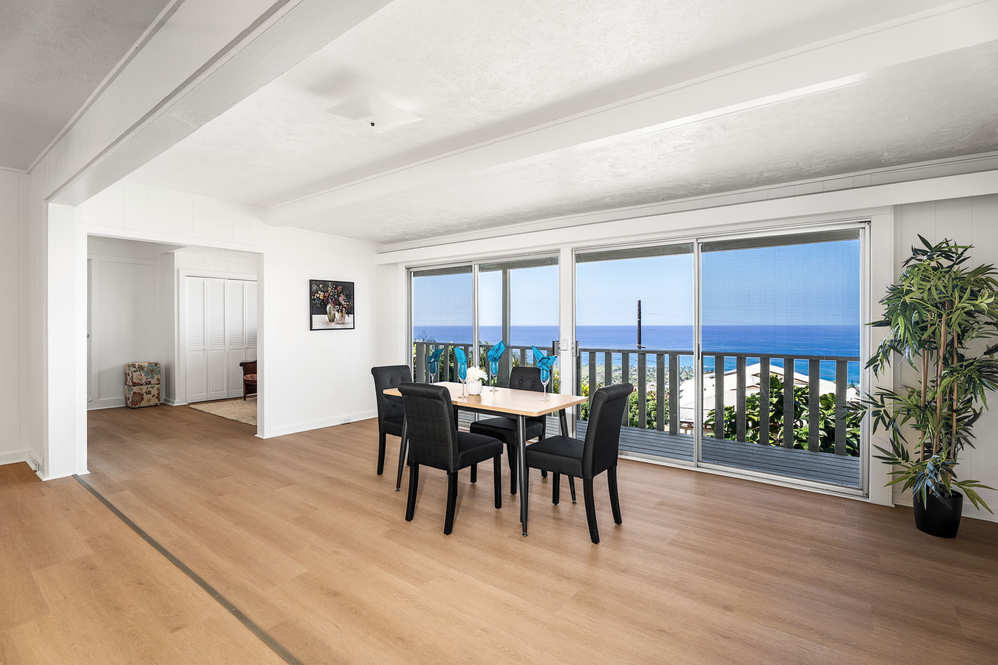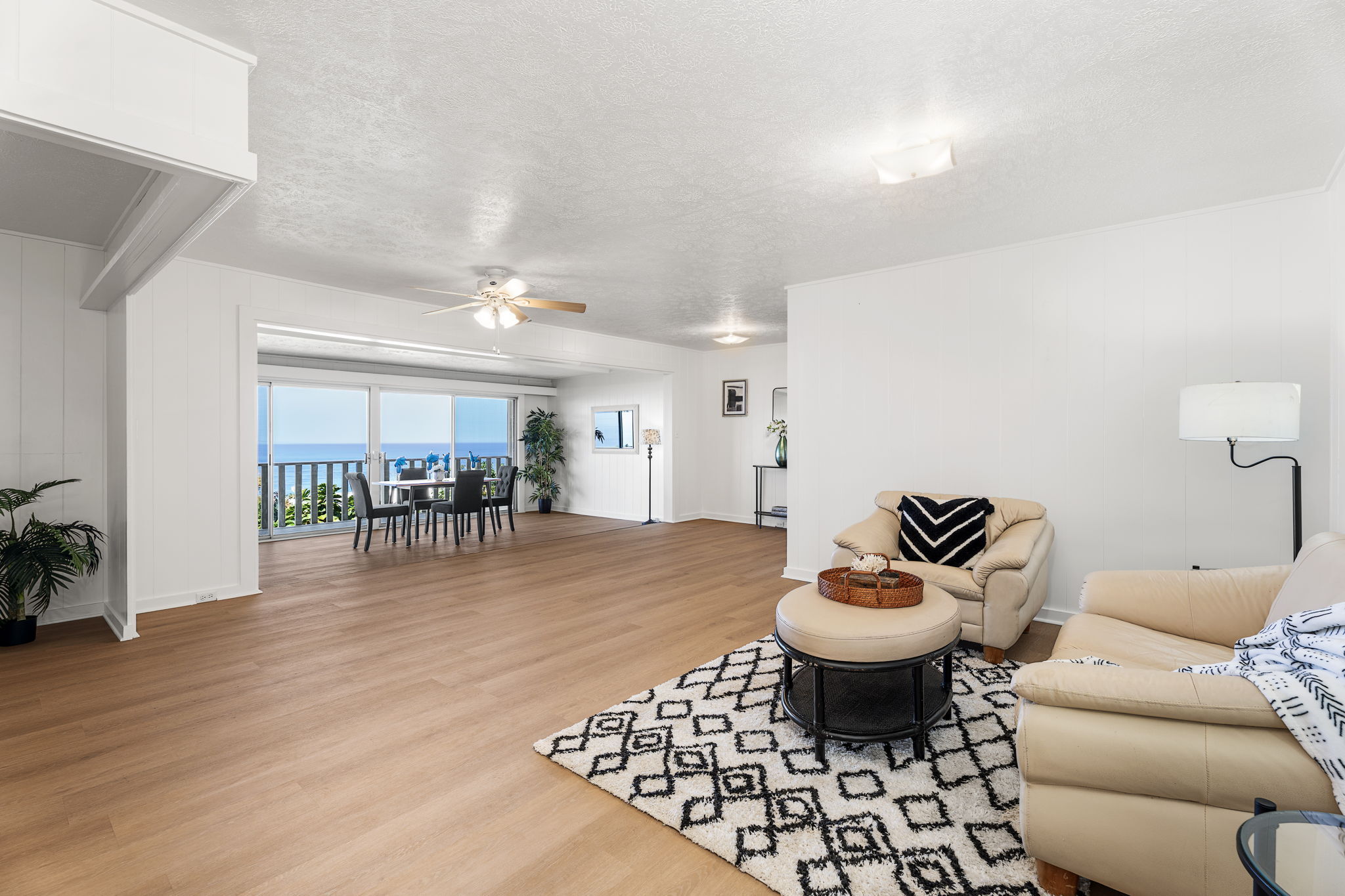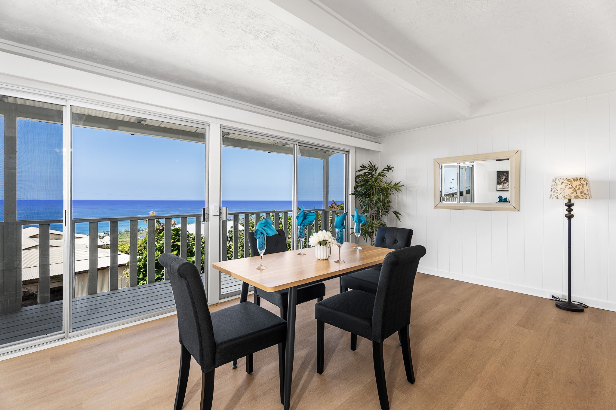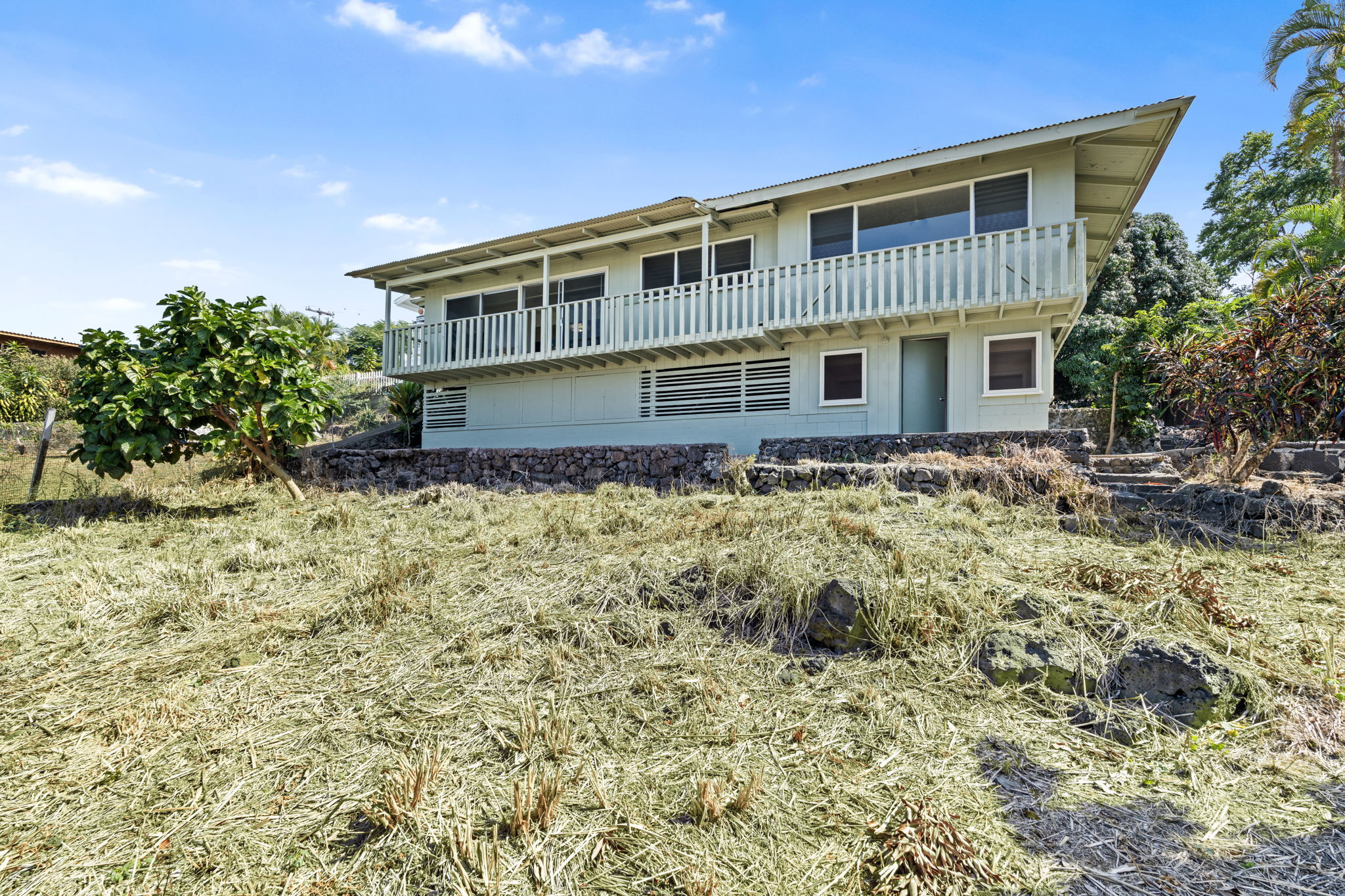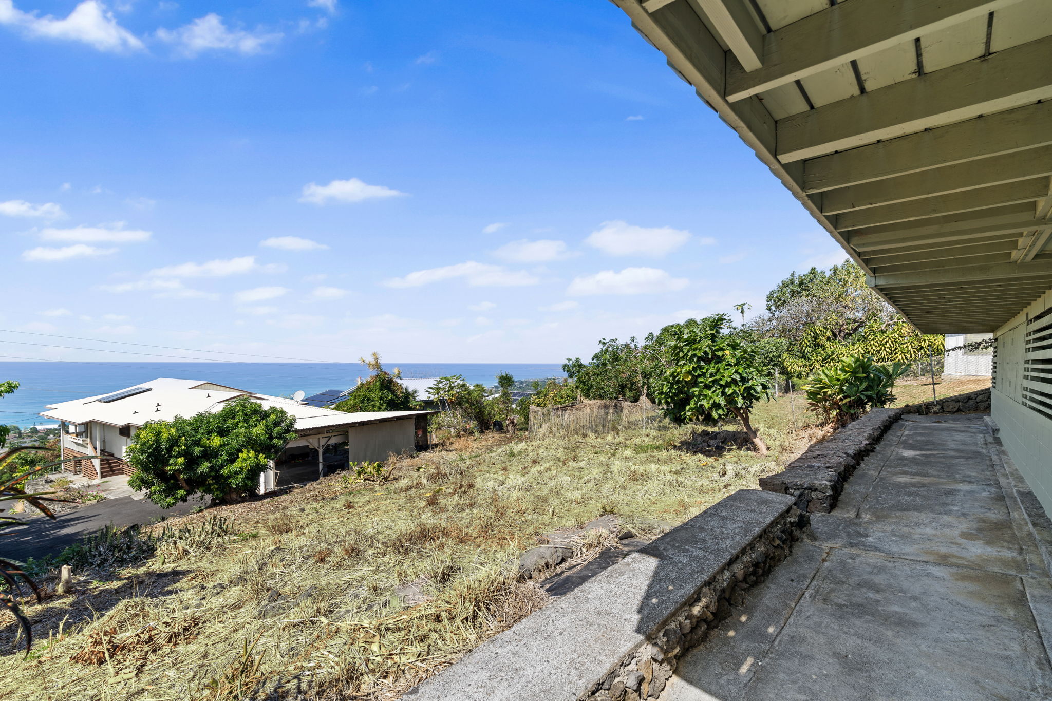 Exquisite ocean views to Kaiwi Point from this custom home in prestigious Kuakini Heights. A wraparound lanai invites you to savor sunsets year-round, while lovely mauka breezes provide natural comfort nearly every day. Major updates were completed in 2025. The open floor plan offers exceptional versatility, featuring a spacious living room, sitting area, and an additional alcove ideal for a children’s play area, TV or music room, or potential fourth bedroom. The well-appointed kitchen showcases man-made stone countertops, plentiful wood cabinetry, and upgraded stainless steel sink, range, and refrigerator, with a convenient quarter bath nearby. A gentle step down leads to the dining and sitting rooms, creating subtle separation while maintaining flow. The home includes three comfortable bedrooms plus an office. The guest bath features a shower with small tub, while the upgraded primary bath offers a full-size soaking tub. Luxury vinyl plank flooring runs throughout, complemented by louvered windows, ventilated closet doors, and a ceiling fan in the living area for enhanced airflow. Downstairs, a hobby room or workshop adds valuable flexible space. A covered two-car carport sits beside the home, topped by a permitted two-bedroom, one-bath guest unit with vaulted ceilings–ideal for extended family, guests, or rental potential. Square footage includes both the main residence and guest unit. The exterior was recently painted, and termite tenting has been completed. The yard features mature Hayden mango, kalamansi, and lychee trees, along with a grassy upper area offering room to expand your tropical vision. The property is part of the popular Walua walking trail. Kuakini Heights is centrally located between downtown Kailua-Kona and Keauhou, minutes from shopping, dining, and some of West Hawai?i’s most beloved beaches, including Kahalu?u for snorkeling and La?aloa (Magic Sands) for body surfing. Nearby Kainaliu is home to the historic Aloha Theatre.