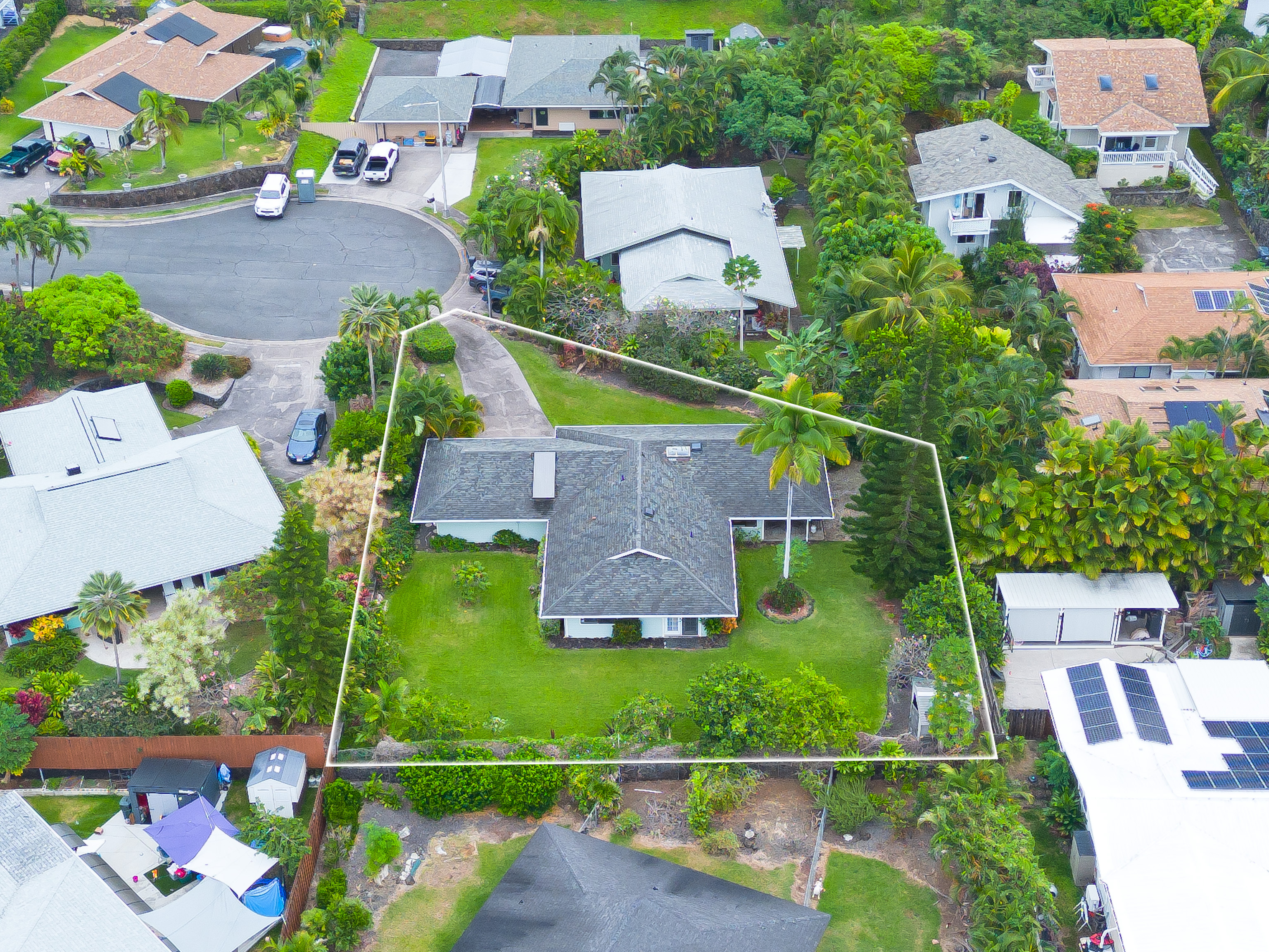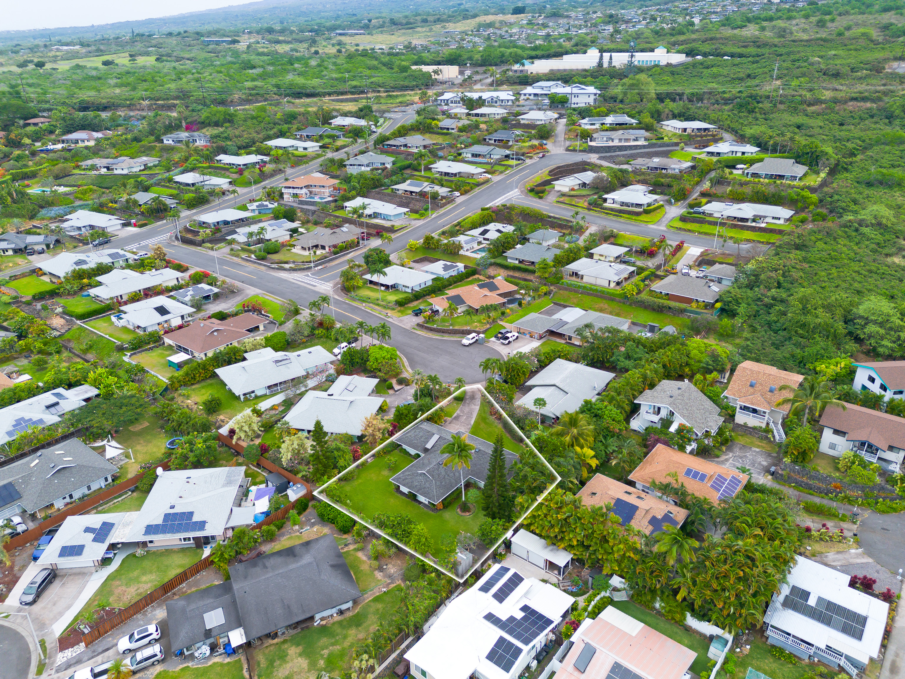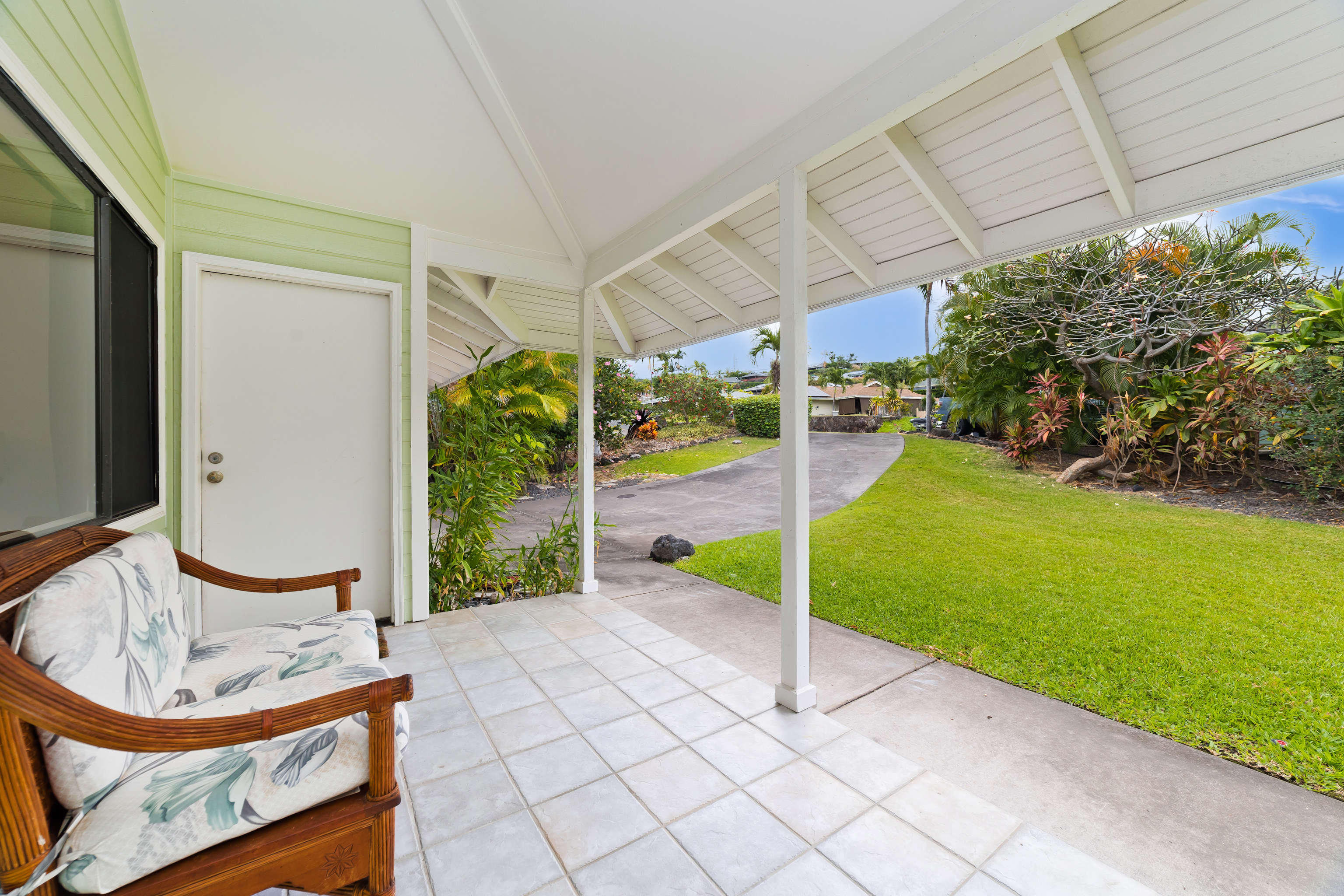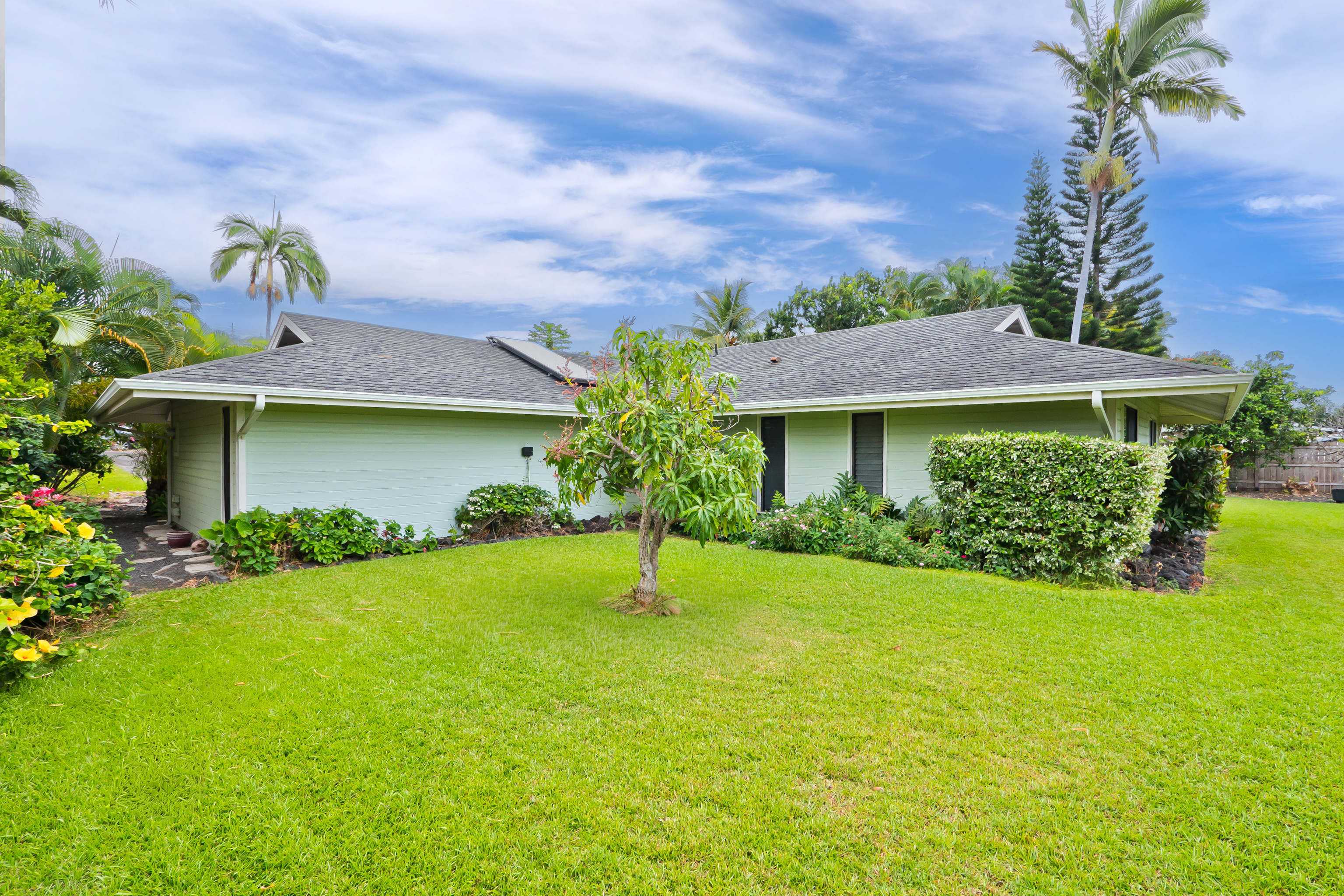 This special property is located in well established Kuakini Makai subdivision complete with street lights, curbing and underground utilities and just 2 miles south of downtown Kailua-Kona. Situated at an enviable elevation of approximately 180', this single story, turnkey furnished and access friendly 3 bedroom 2 bath home is comfortably nestled in a very private and aesthetically pleasing setting of lush landscape fringed with a combination of colorful shrubs, fruit trees and palms. Notable features of this desirable home include:- * A thoughtfully designed light and bright living area of 1,376 sqft. * Vaulted ceilings. * A well appointed and updated kitchen with granite tile counters. The dishwasher, disposal and refrigerator were replaced in 2023. * A 264 sqft covered lanai, the perfect venue for entertaining or relaxation. * Laminate flooring throughout except for the bathrooms which are tiled. * A laundry room. * A window mounted A/C in the primary bedroom. * The solar hot water system was replaced in 2022. * A two car garage of 480 sqft. Notable landscape features:- * Fenced on the south and eastern boundaries, while the northern side is defined by a low rockwall. * Producing fruit trees include , mango, lemon, tangerine and orange. * Plenty of room for raised garden beds and additional fruit tree planting if desired. Other:- The annual HOA fee for 2026 is a very affordable $275.00. The current monthly landscape maintenance cost is a favorable $250. This property is ideally located within close proximity to all the amenities, services and recreational activities of the greater Kailua-Kona area. Video of the Property: https://player.vimeo.com/video/1163109855