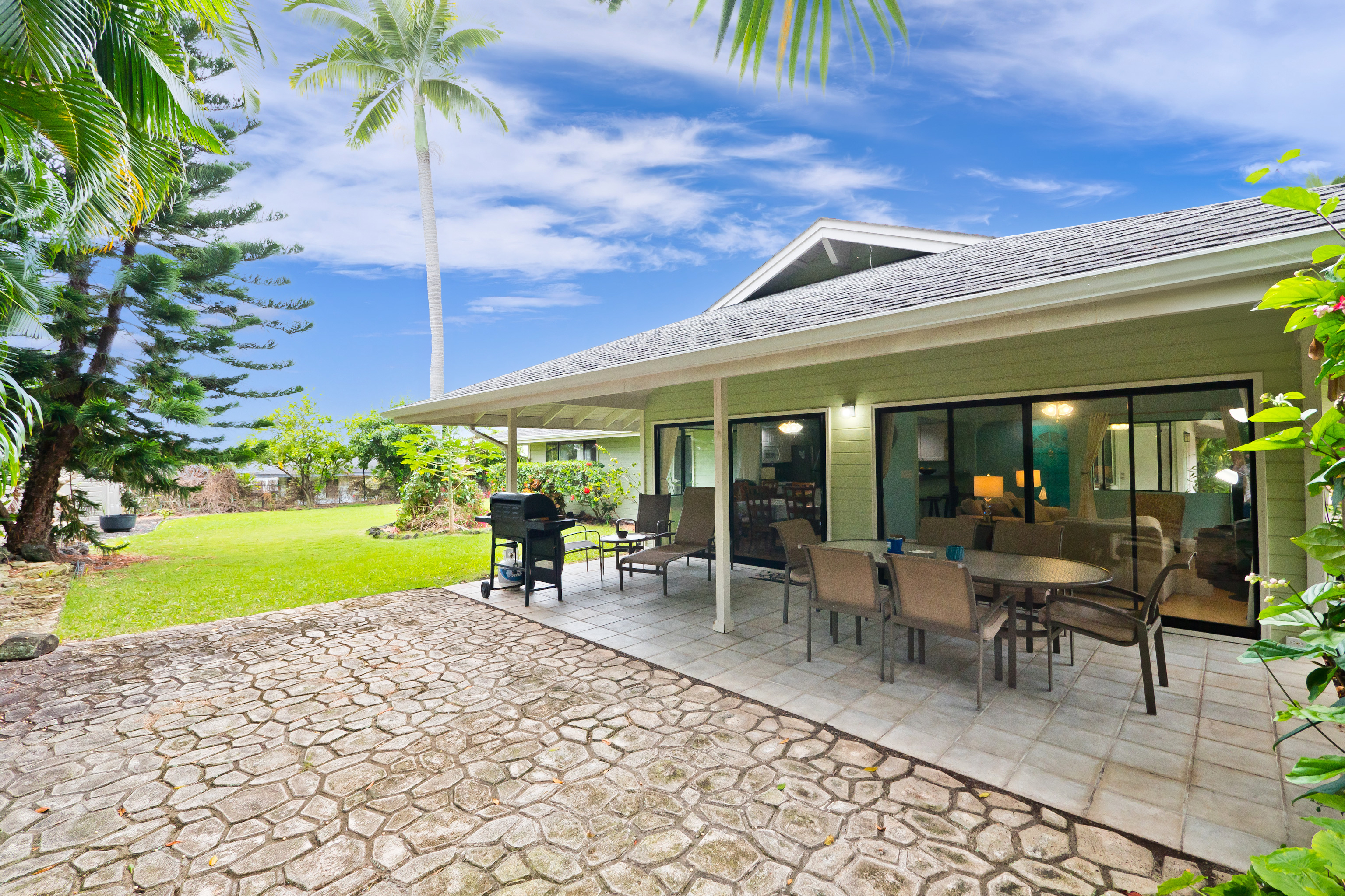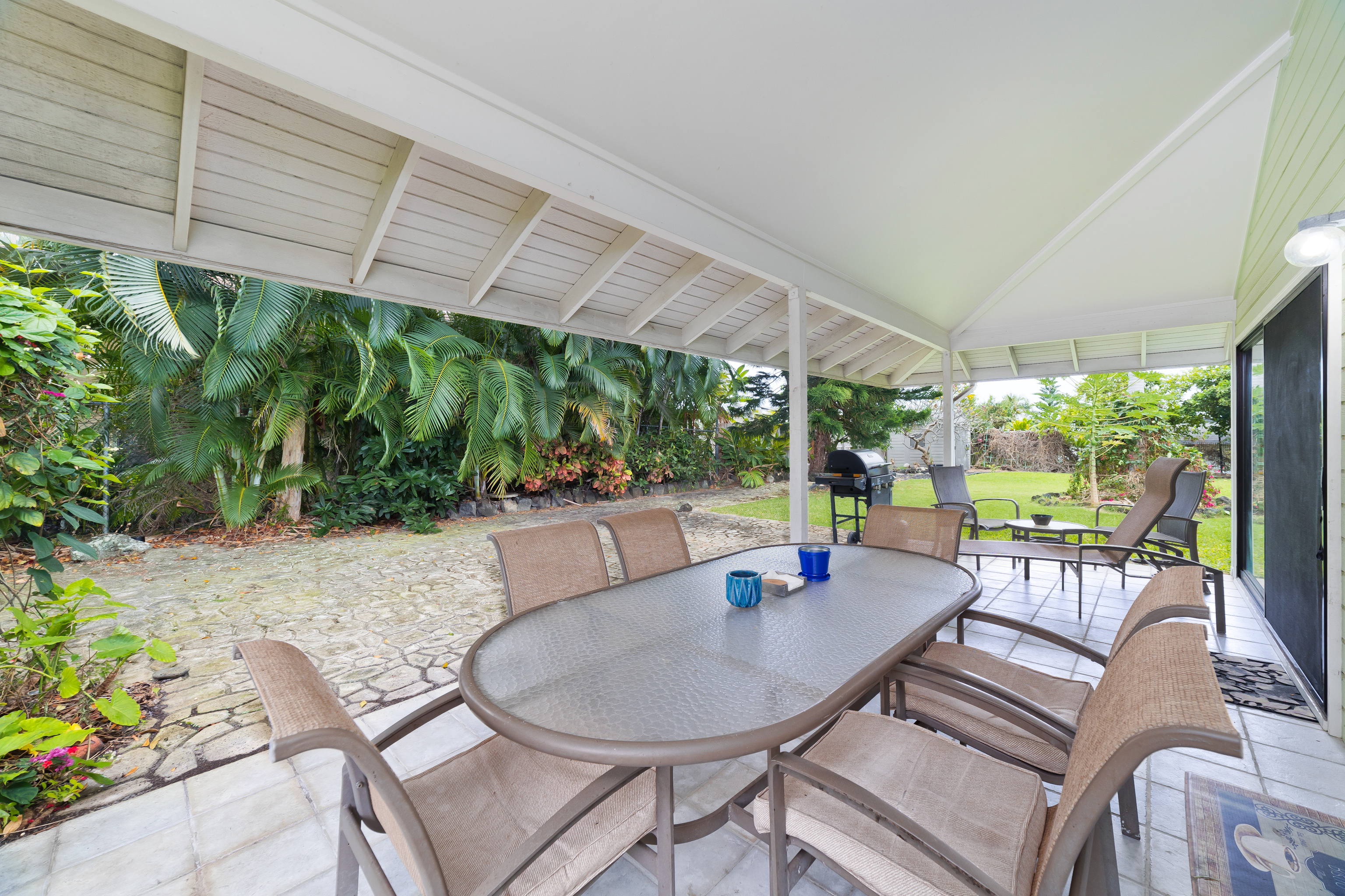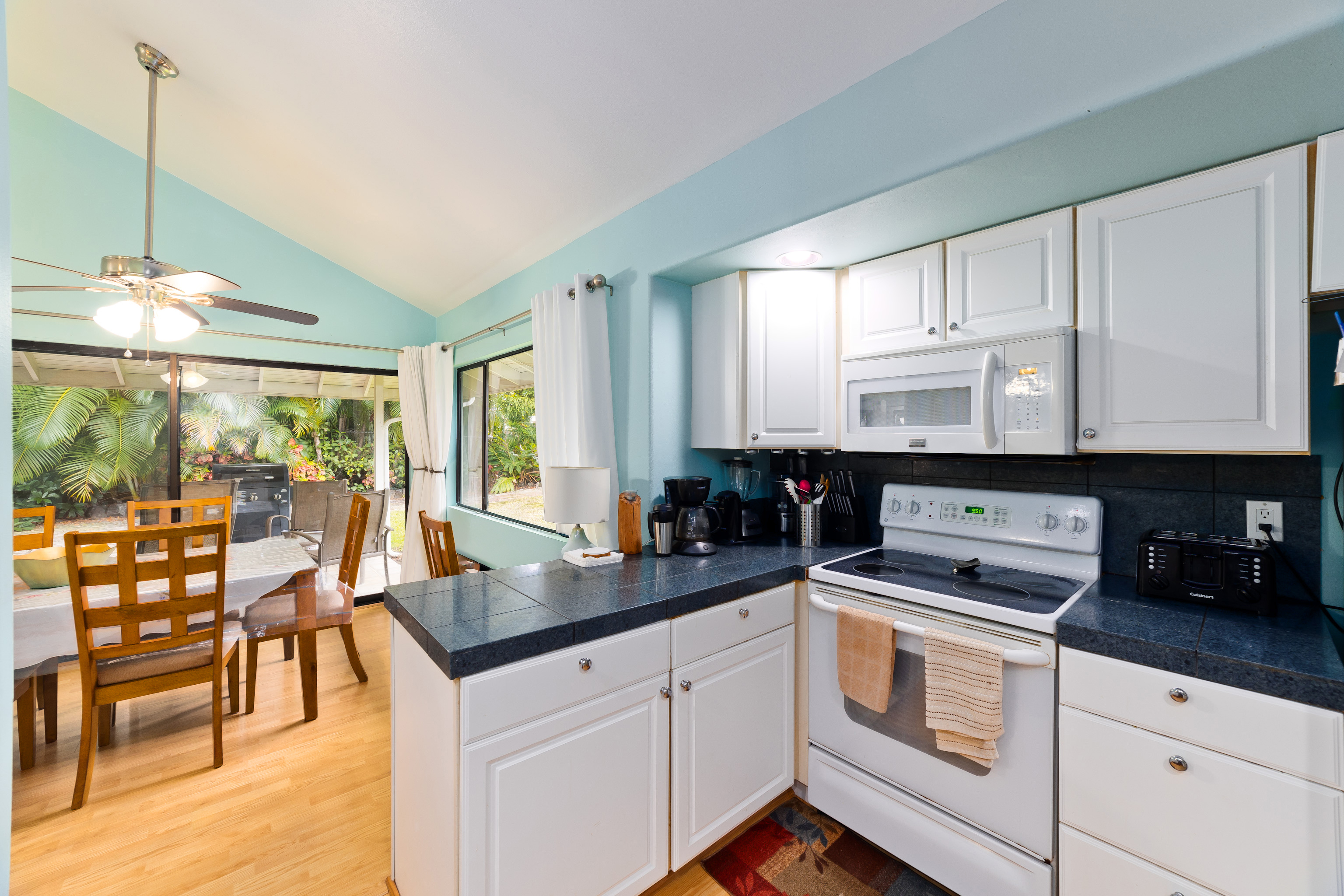 This special property is located in well established Kuakini Makai subdivision complete with street lights, curbing and underground utilities and just 2 miles south of downtown Kailua-Kona. Situated at an enviable elevation of approximately 180', this single story, turnkey furnished and access friendly 3 bedroom 2 bath home is comfortably nestled in a very private and aesthetically pleasing setting of lush landscape fringed with a combination of colorful shrubs, fruit trees and palms. Notable features of this desirable home include:- * A thoughtfully designed light and bright living area of 1,376 sqft. * Vaulted ceilings. * A well appointed and updated kitchen with granite tile counters. The dishwasher, disposal and refrigerator were replaced in 2023. * A 264 sqft covered lanai, the perfect venue for entertaining or relaxation. * Laminate flooring throughout except for the bathrooms which are tiled. * A laundry room. * A window mounted A/C in the primary bedroom. * The solar hot water system was replaced in 2022. * A two car garage of 480 sqft. Notable landscape features:- * Fenced on the south and eastern boundaries, while the northern side is defined by a low rockwall. * Producing fruit trees include , mango, lemon, tangerine and orange. * Plenty of room for raised garden beds and additional fruit tree planting if desired. Other:- The annual HOA fee for 2026 is a very affordable $275.00. The current monthly landscape maintenance cost is a favorable $250. This property is ideally located within close proximity to all the amenities, services and recreational activities of the greater Kailua-Kona area. Video of the Property: https://player.vimeo.com/video/1163109855