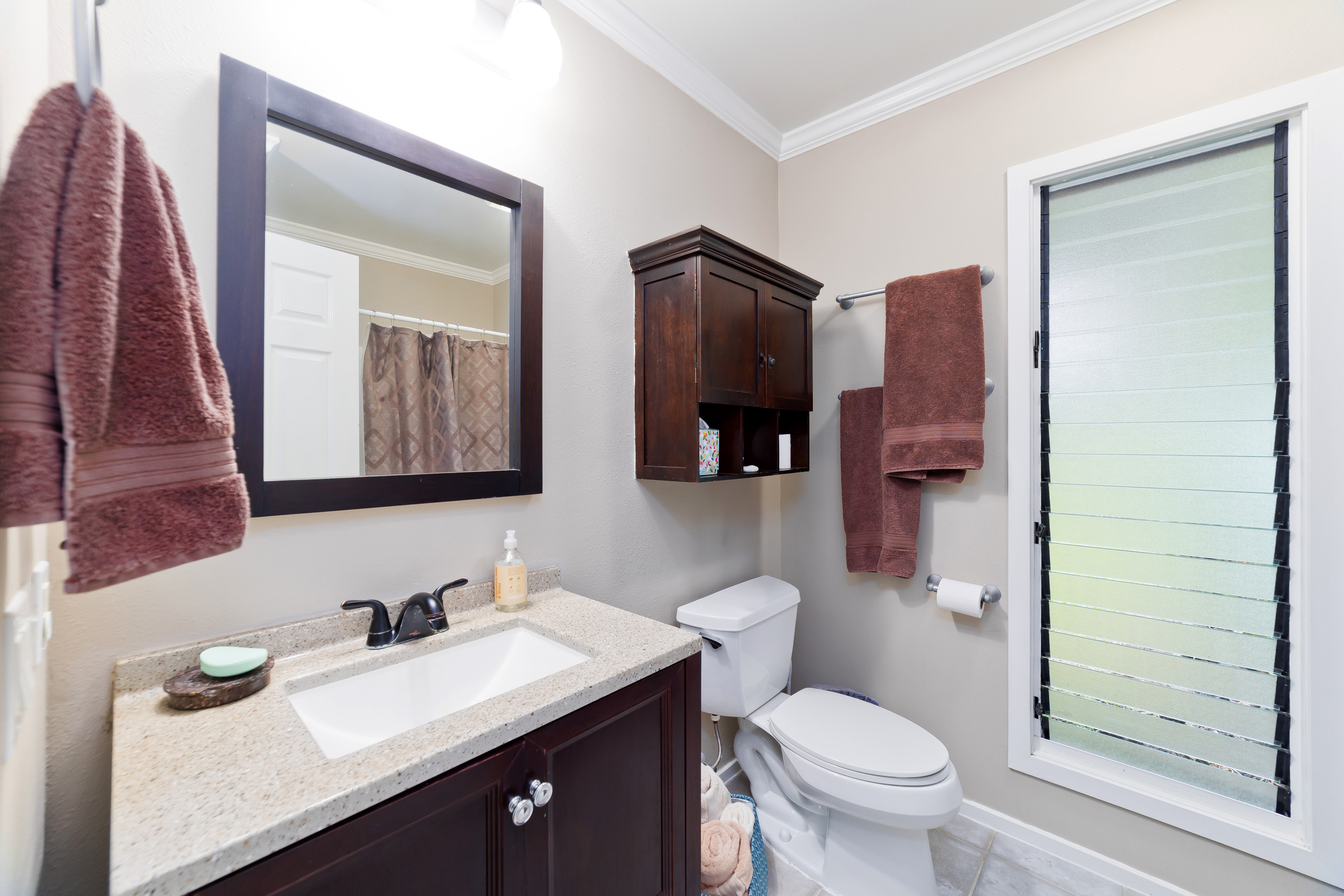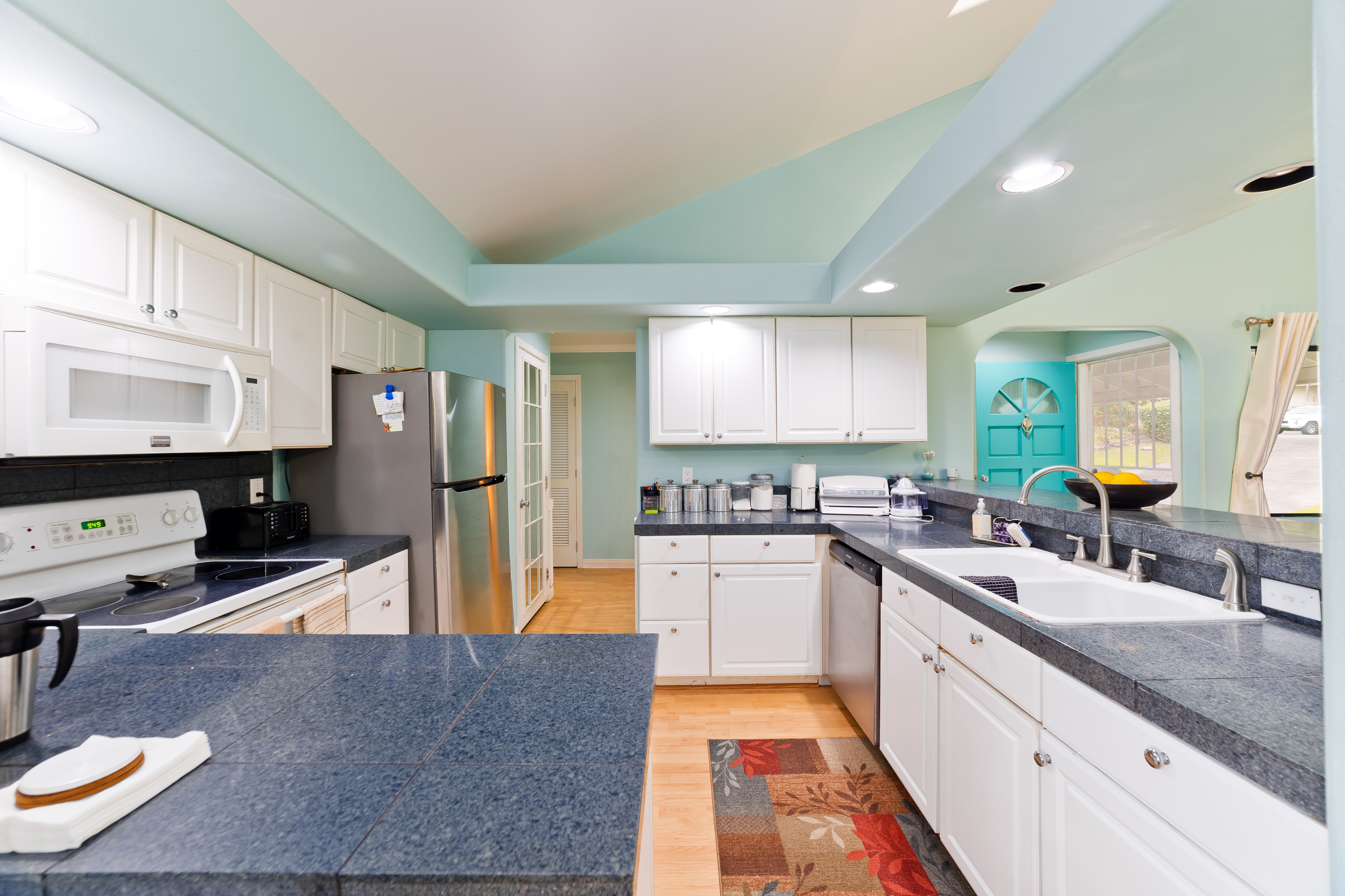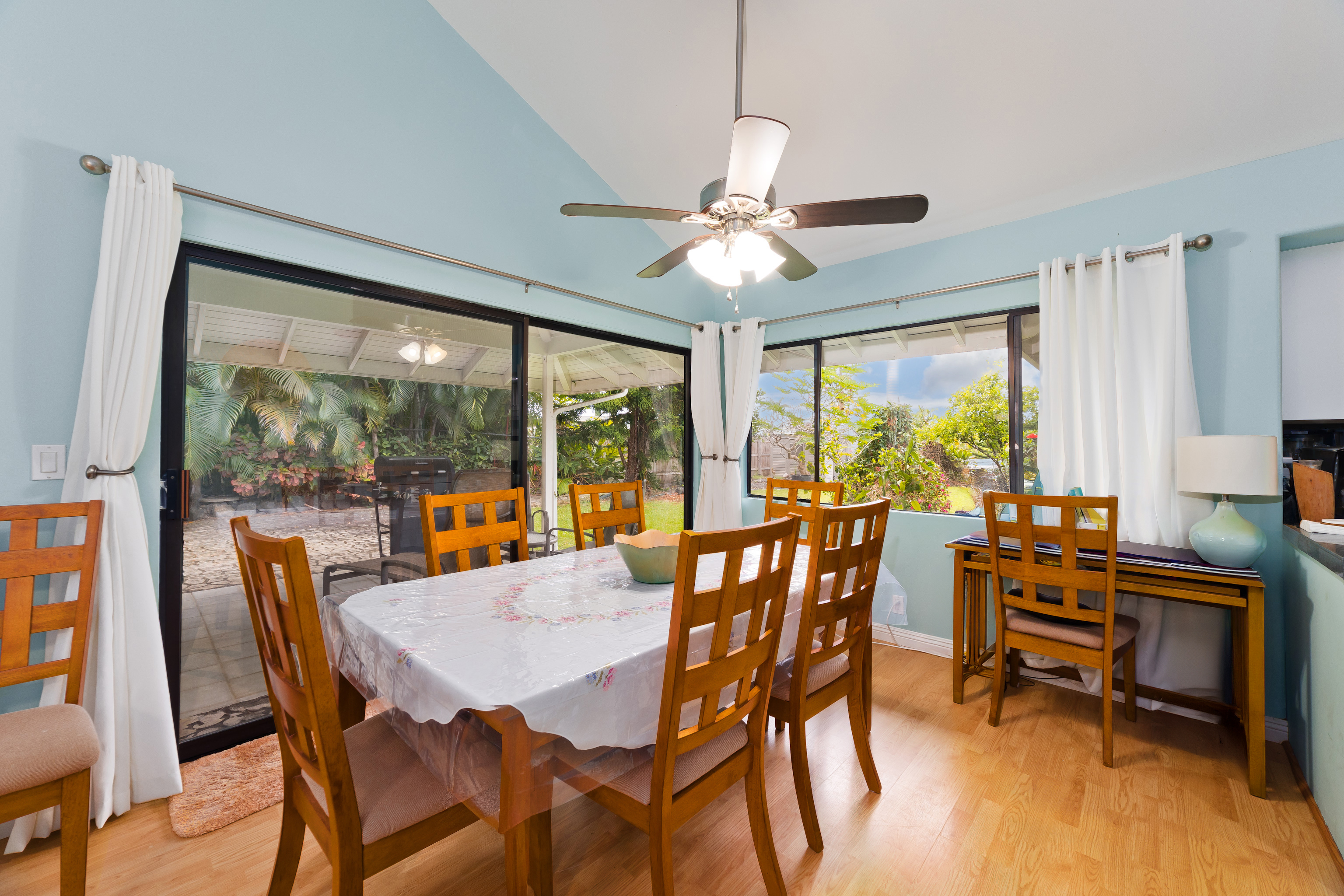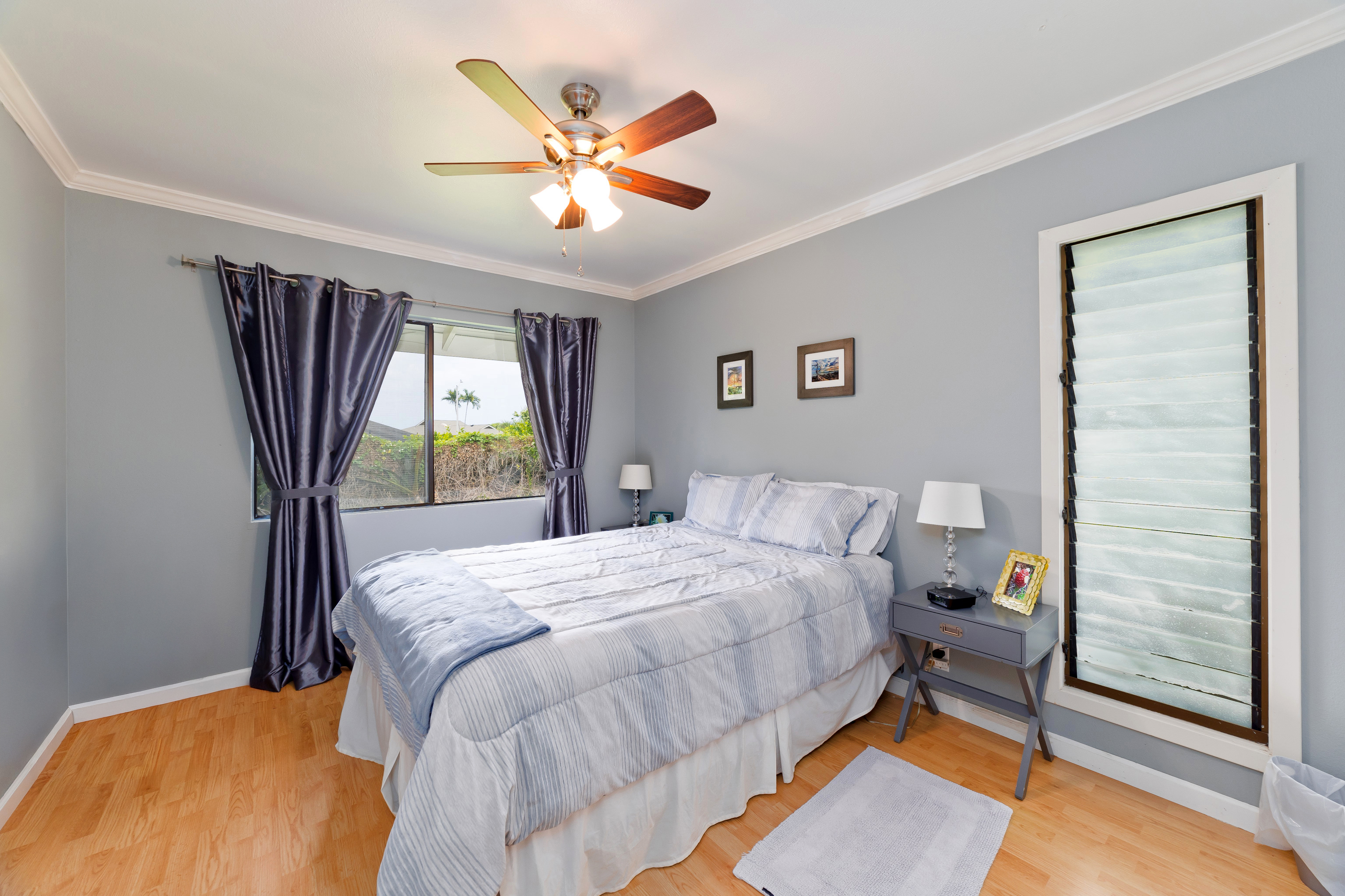 This special property is located in well established Kuakini Makai subdivision complete with street lights, curbing and underground utilities and just 2 miles south of downtown Kailua-Kona. Situated at an enviable elevation of approximately 180', this single story, turnkey furnished and access friendly 3 bedroom 2 bath home is comfortably nestled in a very private and aesthetically pleasing setting of lush landscape fringed with a combination of colorful shrubs, fruit trees and palms. Notable features of this desirable home include:- * A thoughtfully designed light and bright living area of 1,376 sqft. * Vaulted ceilings. * A well appointed and updated kitchen with granite tile counters. The dishwasher, disposal and refrigerator were replaced in 2023. * A 264 sqft covered lanai, the perfect venue for entertaining or relaxation. * Laminate flooring throughout except for the bathrooms which are tiled. * A laundry room. * A window mounted A/C in the primary bedroom. * The solar hot water system was replaced in 2022. * A two car garage of 480 sqft. Notable landscape features:- * Fenced on the south and eastern boundaries, while the northern side is defined by a low rockwall. * Producing fruit trees include , mango, lemon, tangerine and orange. * Plenty of room for raised garden beds and additional fruit tree planting if desired. Other:- The annual HOA fee for 2026 is a very affordable $275.00. The current monthly landscape maintenance cost is a favorable $250. This property is ideally located within close proximity to all the amenities, services and recreational activities of the greater Kailua-Kona area. Video of the Property: https://player.vimeo.com/video/1163109855