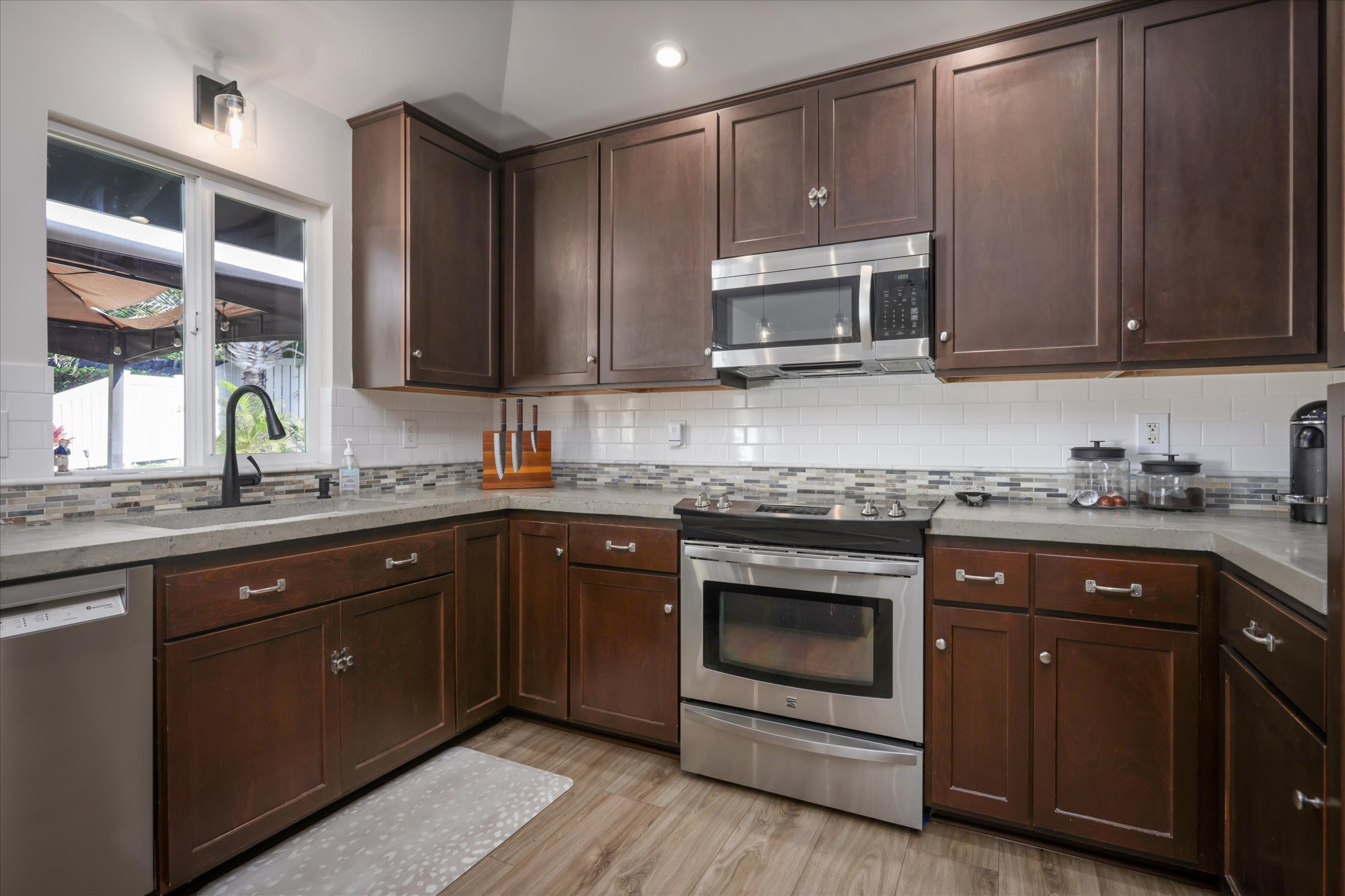 Well maintained home in the prime location of Lokahi Makai! 3 bedroom, 2 bathroom home has been updated with newer modern features including new LVPlank flooring throughout. Lovely kitchen with plenty of alder wood cabinetry ,stainless steel appliances and modern custom countertops. Home is bright and airy with privacy hedge . Garage has plenty of space for work shop or storage. Spacious primary suite has a large walk-in closet and newly updated bathroom with tiled shower. Sliding glass door access to the private backyard, which is fully fenced in and landscaped. Enjoy quiet evenings in your lovely gazebo in the backyard, and enjoy our beautiful colorful Hawaiian evening skies. Cute little "garden patch" in the front yard, prepped and ready for the home gardener's dream! Additional outdoor shower for the true Hawaiian experience! Solar hot water system and split AC system offer energy efficiency and comfort. Lokahi Makai is a well-maintained community with a community park, just 10 minutes above Kona Airport and OTEC, and 20 minutes from Kailua Kona Village and all major shopping centers, including Costco. Check out the virtual tour or matterport today!