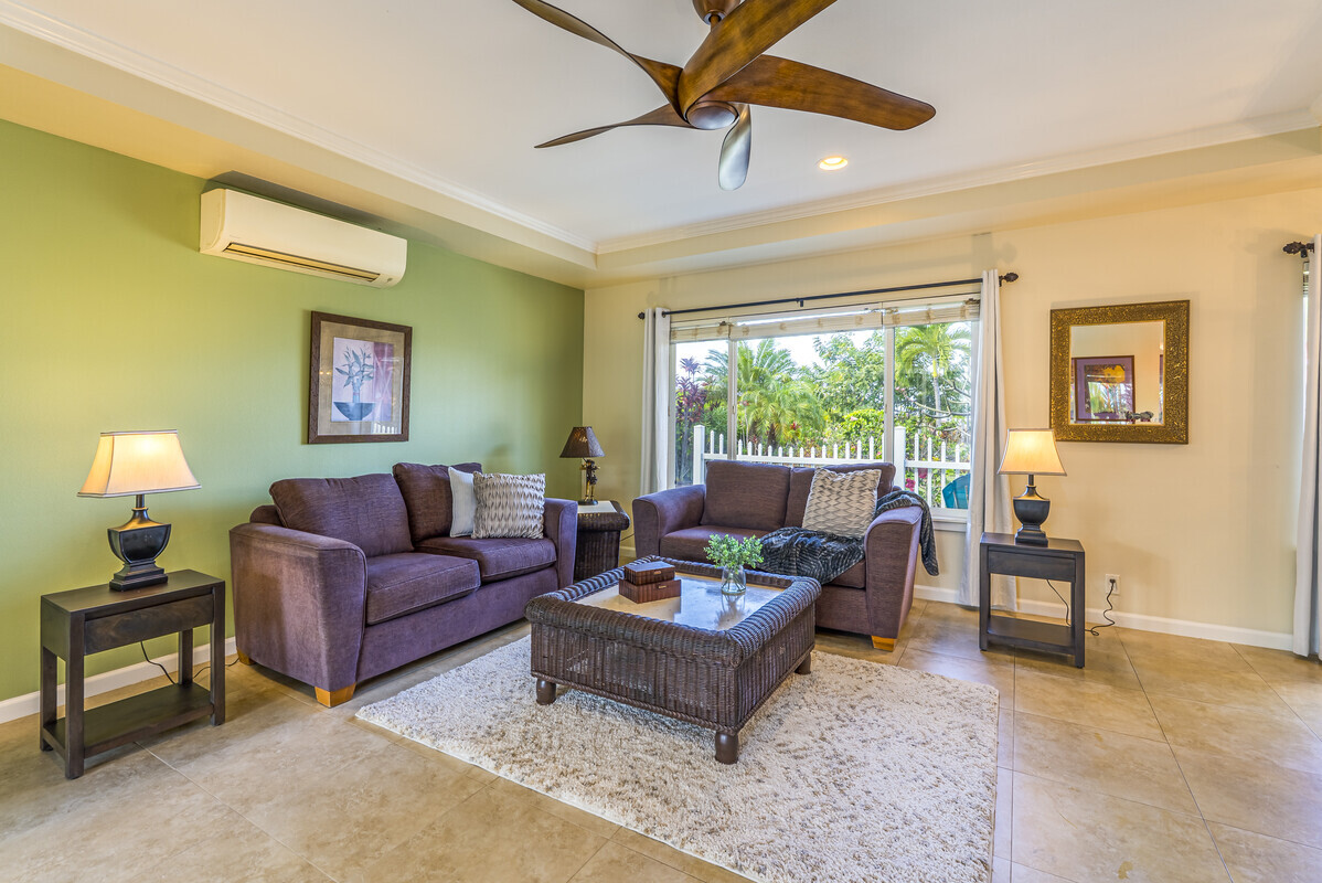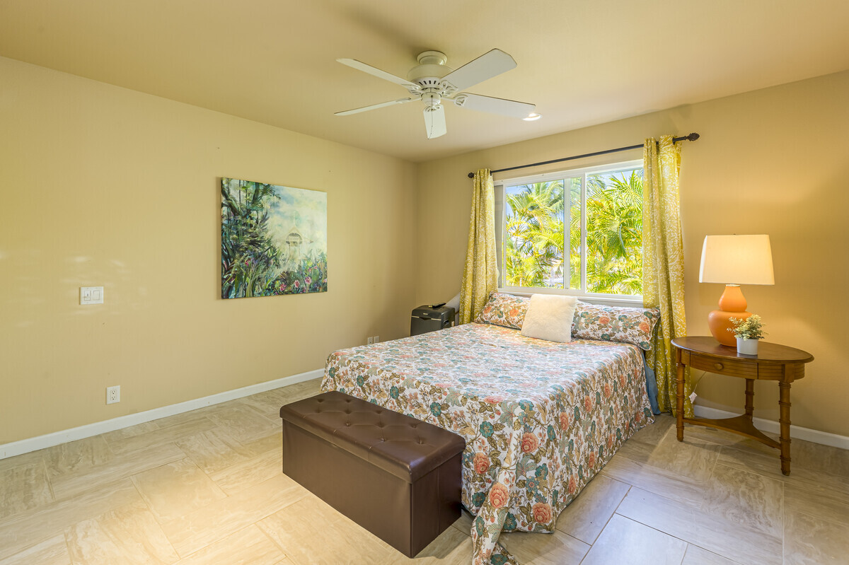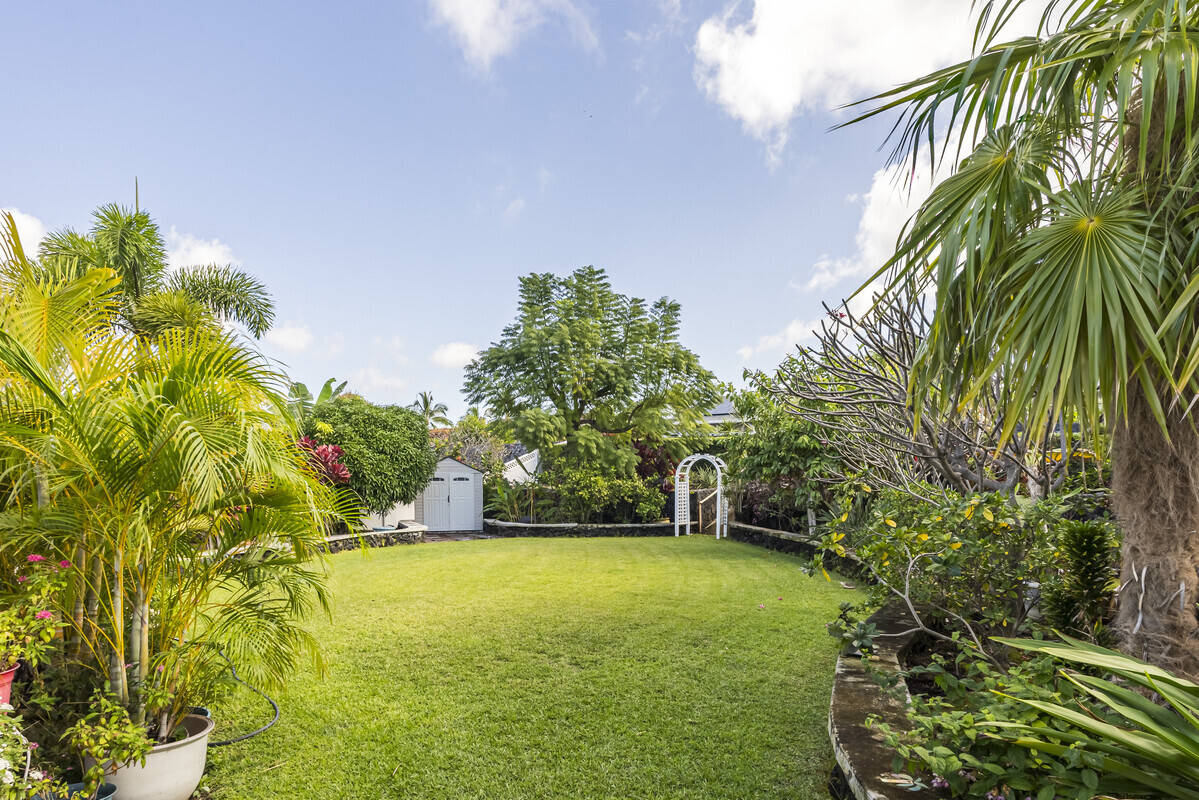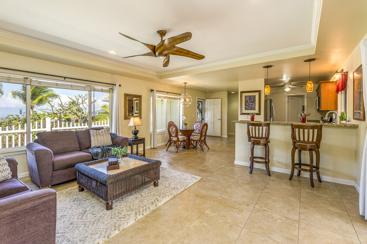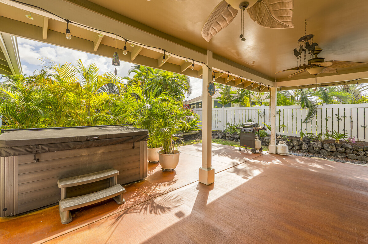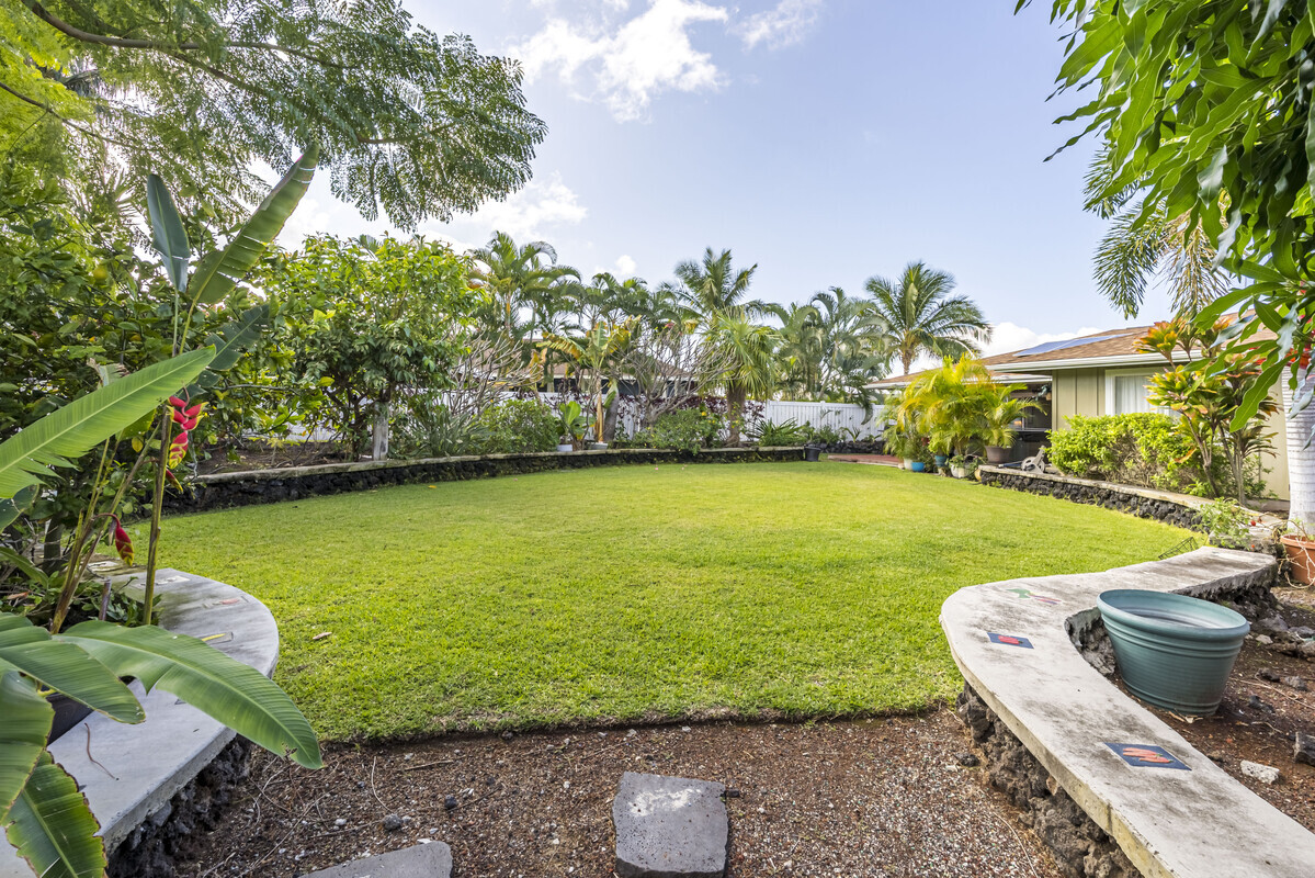 A perfect blend of comfort and space in this beautifully customized home in the Lokahi Makai neighborhood. Sitting on one of the subdivision's larger lots, this well cared-for home has been lovingly maintained by its original owner, and offers an abundance of features. Step through the charming, custom-designed screen door into a bright and inviting open floor plan, where the kitchen, dining, and living areas seamlessly flow together. The kitchen features granite countertops, a large pantry, and plentiful wood cabinetry. A window above the sink frames views of the patio, while the sliding glass door opens to your private oasis: a covered patio complete with a hot tub, open to the sun and stars. The abundant and well kept yard has a mango tree, lush tropical foliage, and a terraced garden area bursting with pineapples and potential. This home features three generously sized bedrooms, including a serene primary suite with a walk-in closet, double-sink vanity, and tiled shower. A sliding glass door in the primary bedroom opens to the patio. The two additional bedrooms are thoughtfully placed for privacy and feature ample closet space, including a walk-in closet in the second guest room. The guest bathroom boasts stylish tile work and a full bathtub. Additional highlights include tiled flooring throughout, luxurious ceiling fans in every room, split A/C in the living area, and portable A/C units in all bedrooms to keep you cool year-round. The finished two-car garage offers extra perks like an extra refrigerator, full freezer, and washer/dryer. Outside, the fully fenced yard provides both security and tranquility, complete with an entry gate and storage shed. Centrally located on the Kona coast, minutes from Kona's airport, this property puts you close to the best beaches, shopping, and dining Kona coast has to offer. With gentle ocean breezes, this home embodies the relaxed yet refined lifestyle of Lokahi Makai.