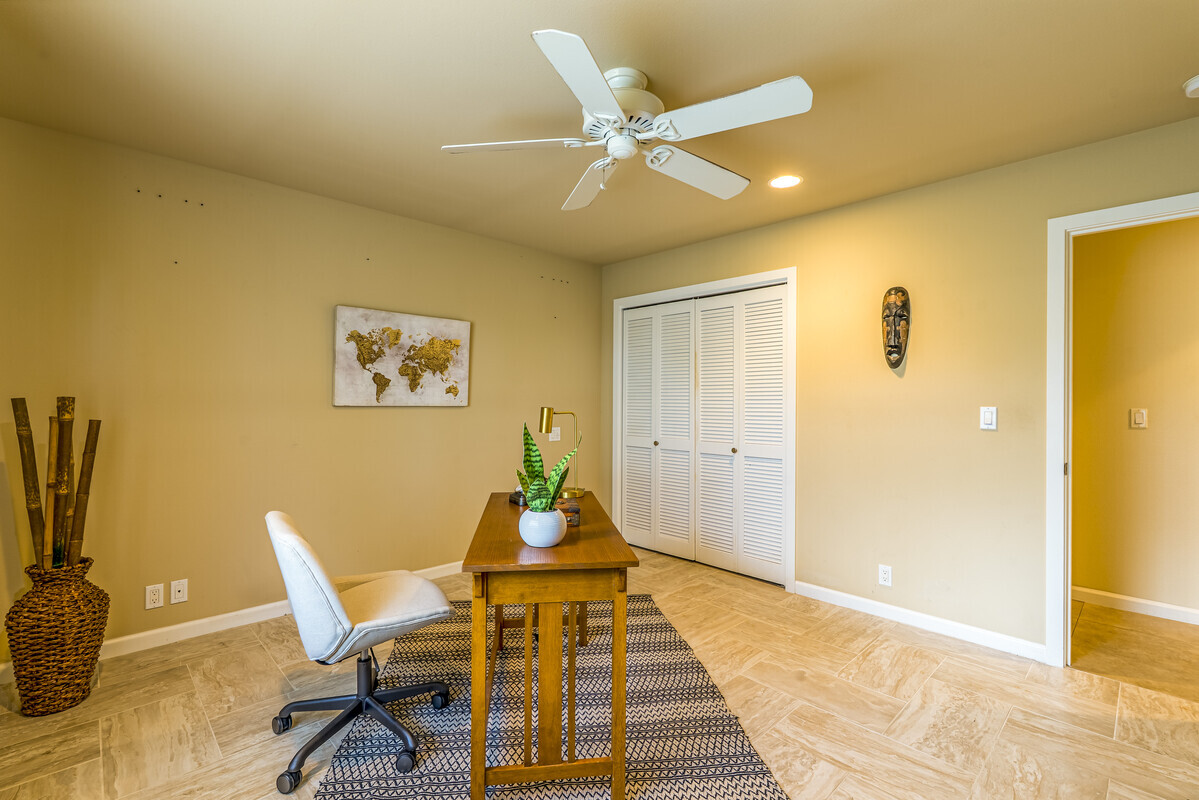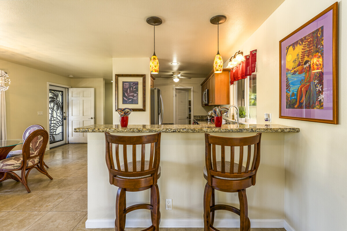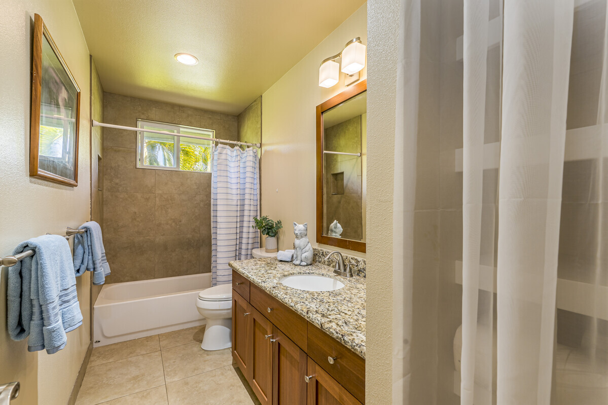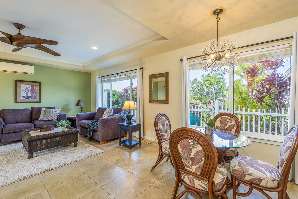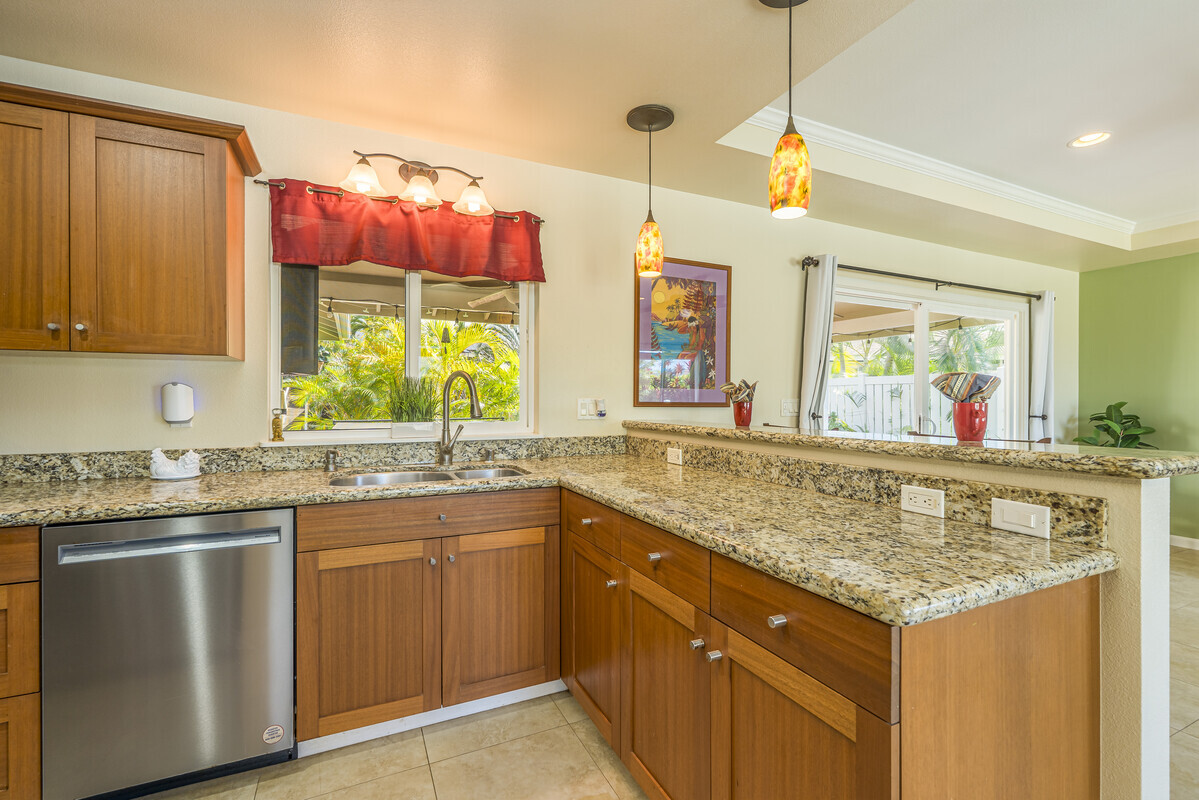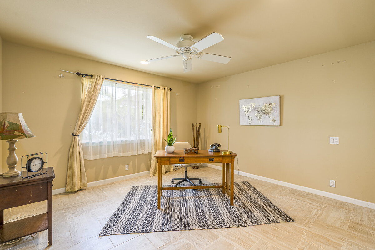 A perfect blend of comfort and space in this beautifully customized home in the Lokahi Makai neighborhood. Sitting on one of the subdivision's larger lots, this well cared-for home has been lovingly maintained by its original owner, and offers an abundance of features. Step through the charming, custom-designed screen door into a bright and inviting open floor plan, where the kitchen, dining, and living areas seamlessly flow together. The kitchen features granite countertops, a large pantry, and plentiful wood cabinetry. A window above the sink frames views of the patio, while the sliding glass door opens to your private oasis: a covered patio complete with a hot tub, open to the sun and stars. The abundant and well kept yard has a mango tree, lush tropical foliage, and a terraced garden area bursting with pineapples and potential. This home features three generously sized bedrooms, including a serene primary suite with a walk-in closet, double-sink vanity, and tiled shower. A sliding glass door in the primary bedroom opens to the patio. The two additional bedrooms are thoughtfully placed for privacy and feature ample closet space, including a walk-in closet in the second guest room. The guest bathroom boasts stylish tile work and a full bathtub. Additional highlights include tiled flooring throughout, luxurious ceiling fans in every room, split A/C in the living area, and portable A/C units in all bedrooms to keep you cool year-round. The finished two-car garage offers extra perks like an extra refrigerator, full freezer, and washer/dryer. Outside, the fully fenced yard provides both security and tranquility, complete with an entry gate and storage shed. Centrally located on the Kona coast, minutes from Kona's airport, this property puts you close to the best beaches, shopping, and dining Kona coast has to offer. With gentle ocean breezes, this home embodies the relaxed yet refined lifestyle of Lokahi Makai.