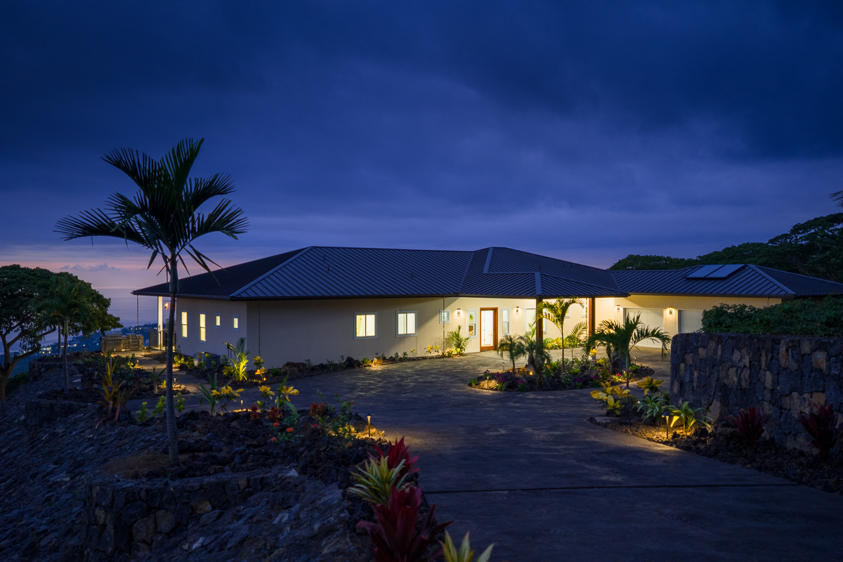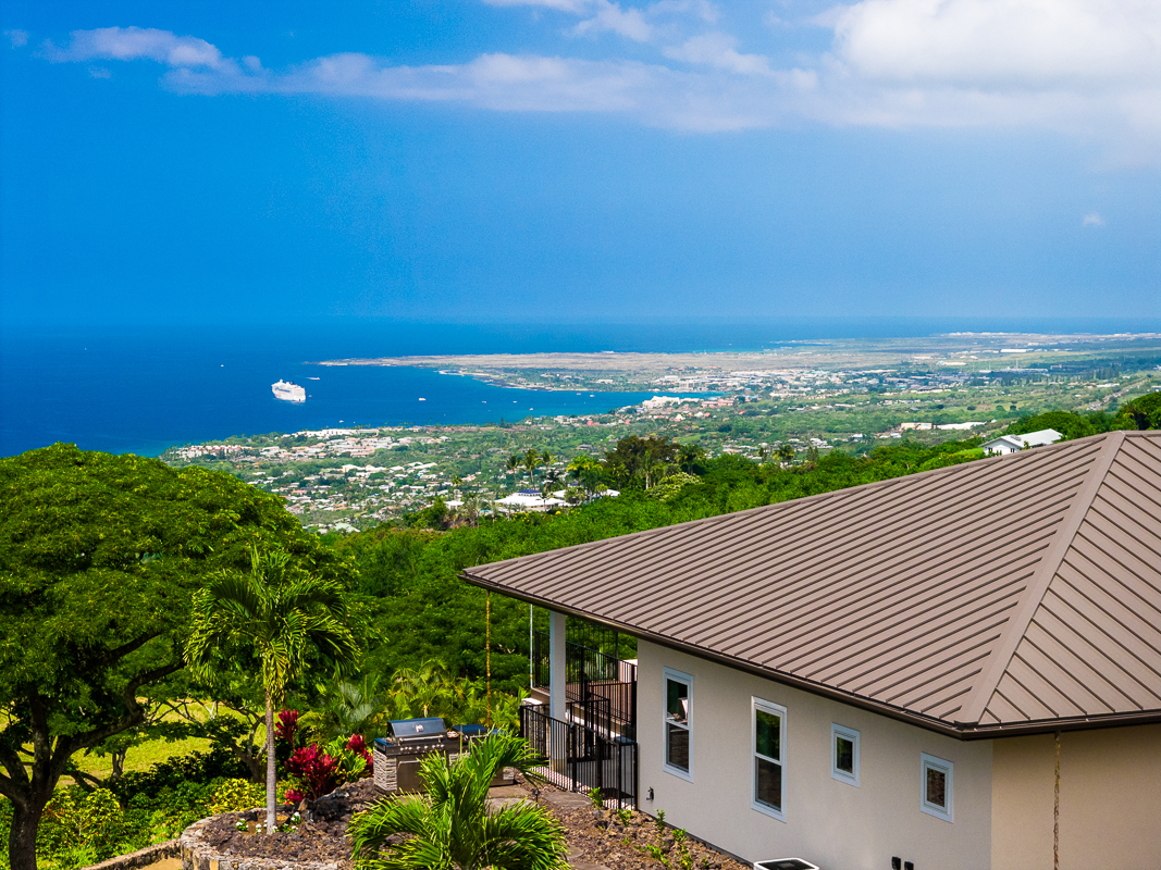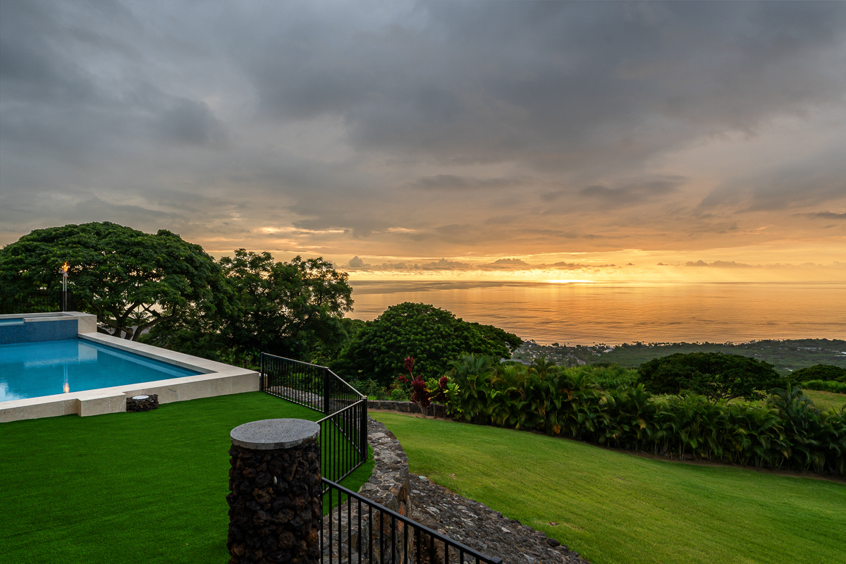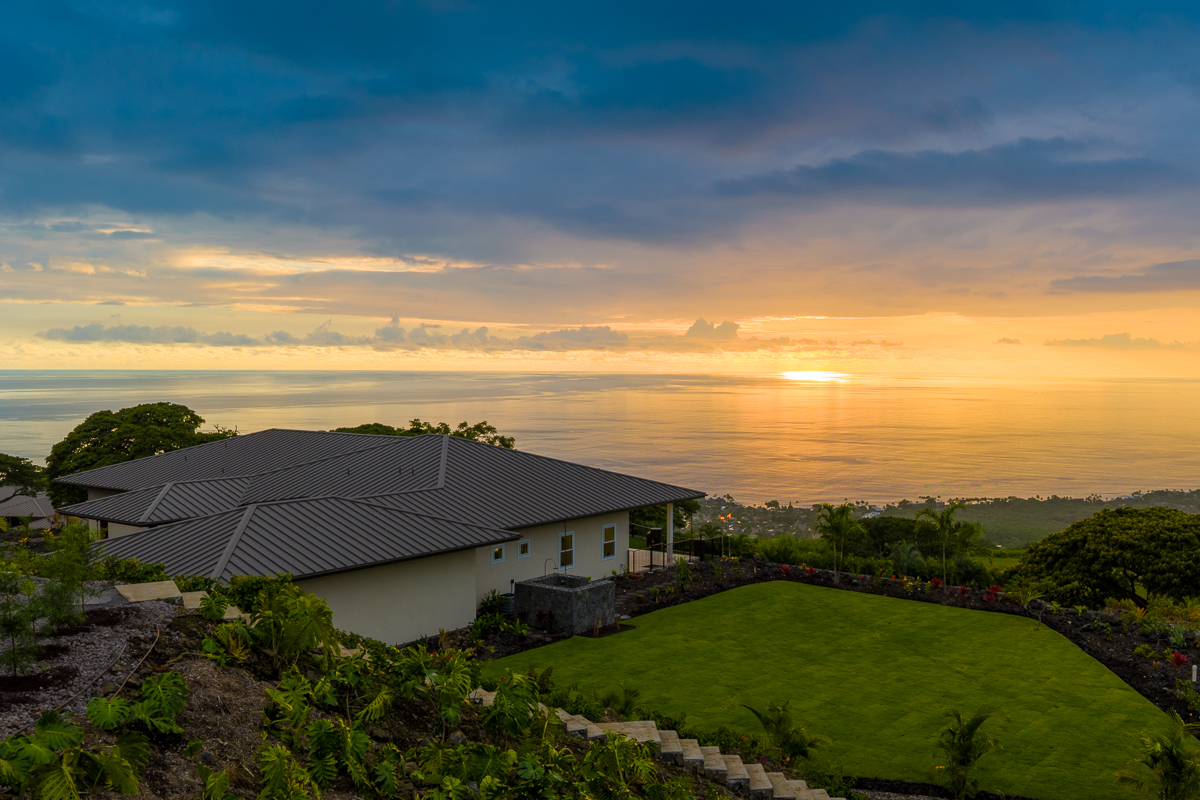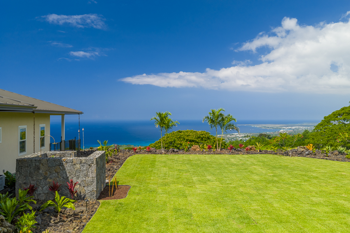Perched above the Kona Coast in the exclusive Makalani Subdivision, this newly built custom estate offers panoramic, unobstructed views of the Kona Coast-perfect for whale watching, vivid sunsets, and front-row seats to fireworks on the 4th of July and NYE. Privately positioned on its own road, this home is the only residence on the street, ensuring unmatched seclusion and tranquility. Behind two private gates, this exceptional home spans 5,880 square feet under roof and showcases expert craftmanship. Recreating this level of design, materials, and extensive site work today would come at a much higher cost, making it a truly rare offering. Extensive grading has been completed to create two additional pads, with their own gated entry-offering flexibility for future expansion, potential guest dwellings, or agricultural use.