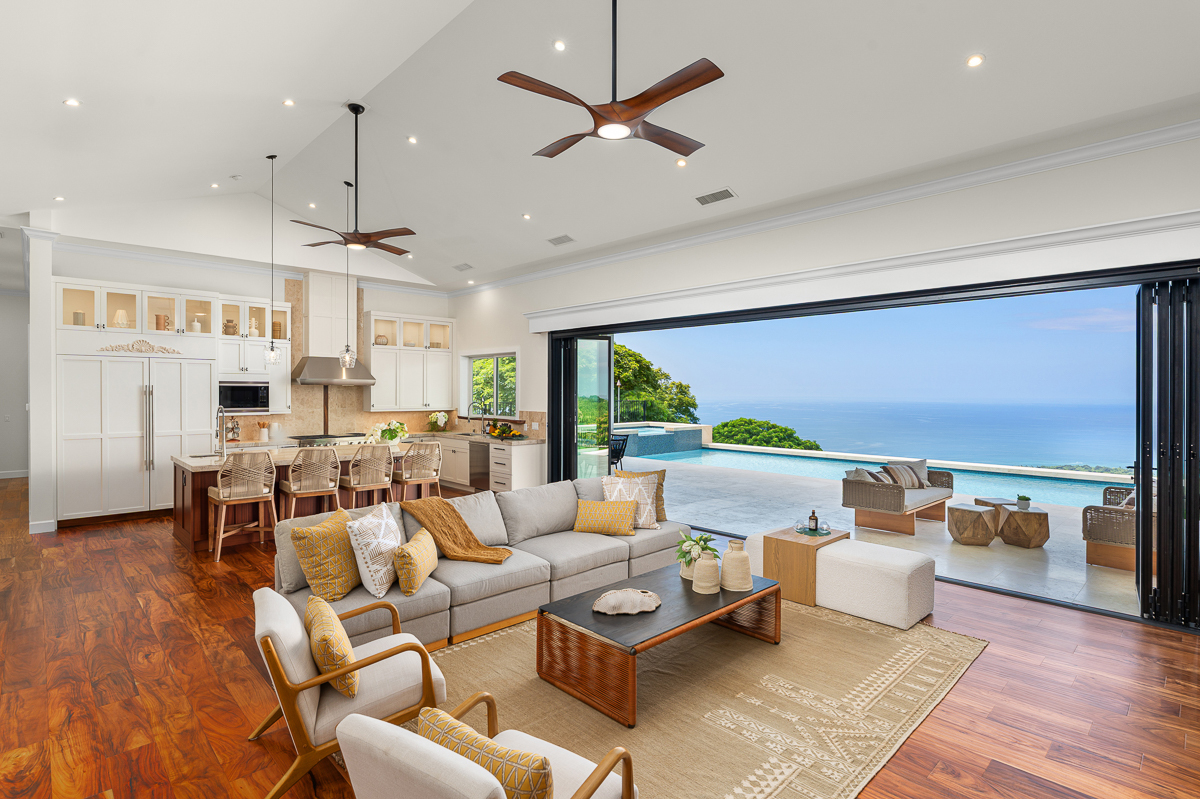 Designed for both luxury and functionality, the home features four en suite bedrooms-including two spacious primary suites- all with ocean views, independent AC, custom walk-in closets, and direct access to the expansive lanai. A flexible bonus room offers additional versatility. At the heart of the home, the open-concept kitchen and great room flow seamlessly to the covered lanai through 28-foot-wide NanaWall folding glass doors. The chef’s kitchen includes top-tier appliances from Sub-Zero, Wolf, Viking, and Cove, granite countertops, dual farm sinks, custom Sapele Mahogany cabinetry, and a custom wet bar with wine chiller and ice maker.