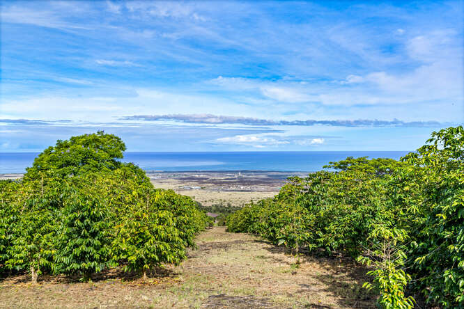 Makalei Estates is the premier 3 acre agricultural estate subdivision in Kona, and this lot is one of the absolute best view lots. Private, at the end of a cul-de-sac, bordered by Hawaii State Forest lands with fine homes below and above the fully mature coffee farm has expansive views of the ocean and coastline below. Fully fenced, the property includes full irrigation, electrical transformer and rock wall, with gate, entry.