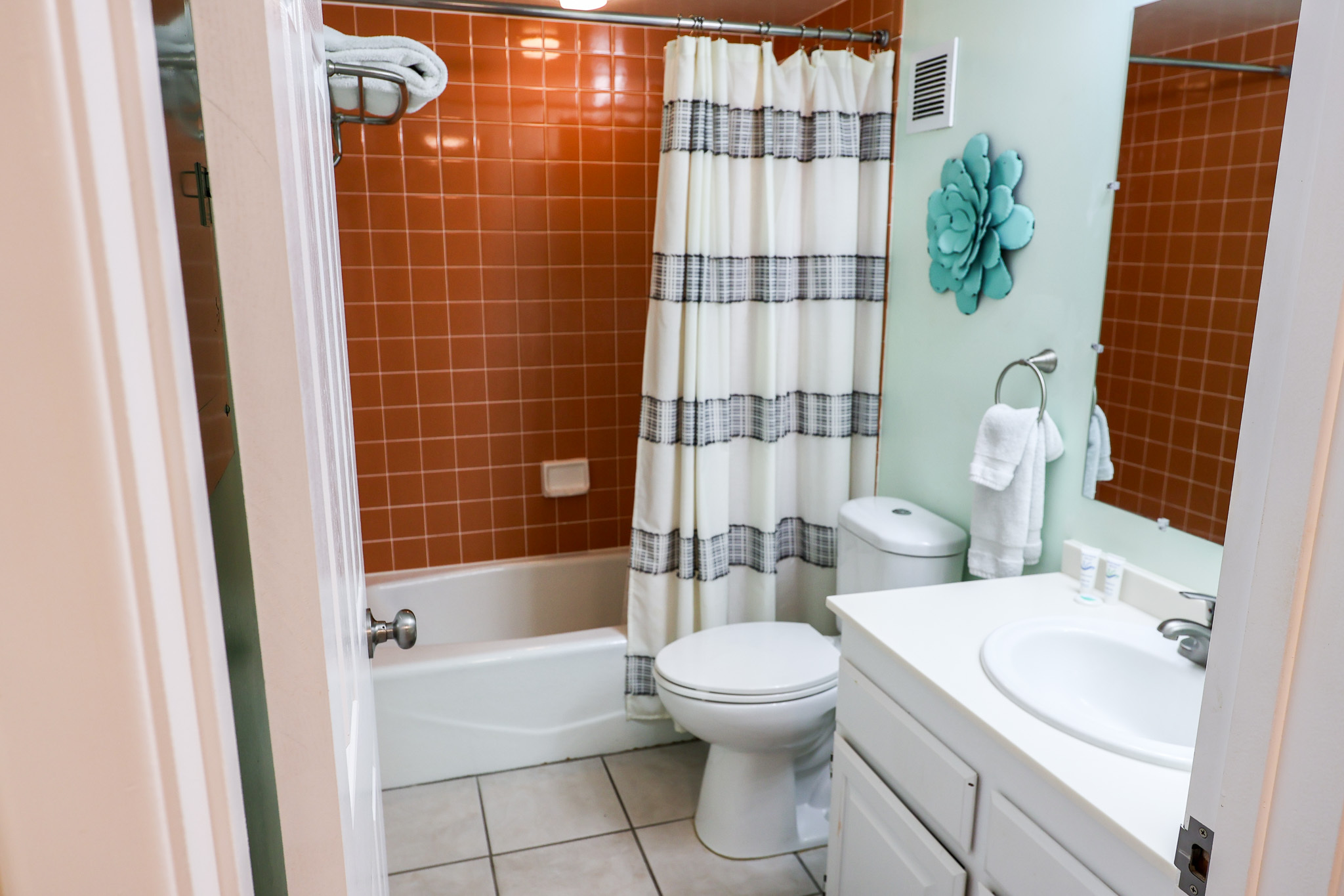 The guest bedroom, situated at the front of the unit, boasts a warm atmosphere filled with natural light. It conveniently shares a hallway with the guest bathroom.