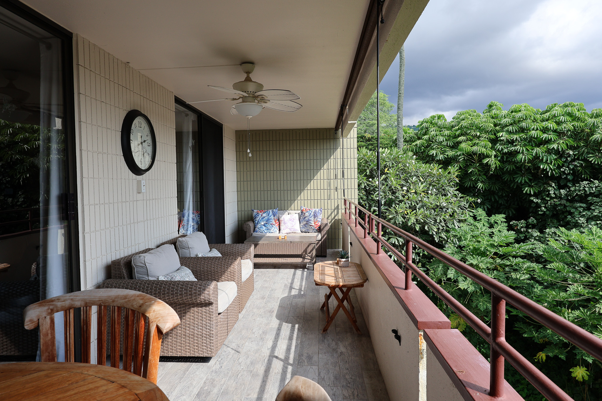 At the back of the unit, the primary bedroom features a spacious bathroom with sliding doors that open onto the covered lanai, providing an unobstructed view of the ocean.