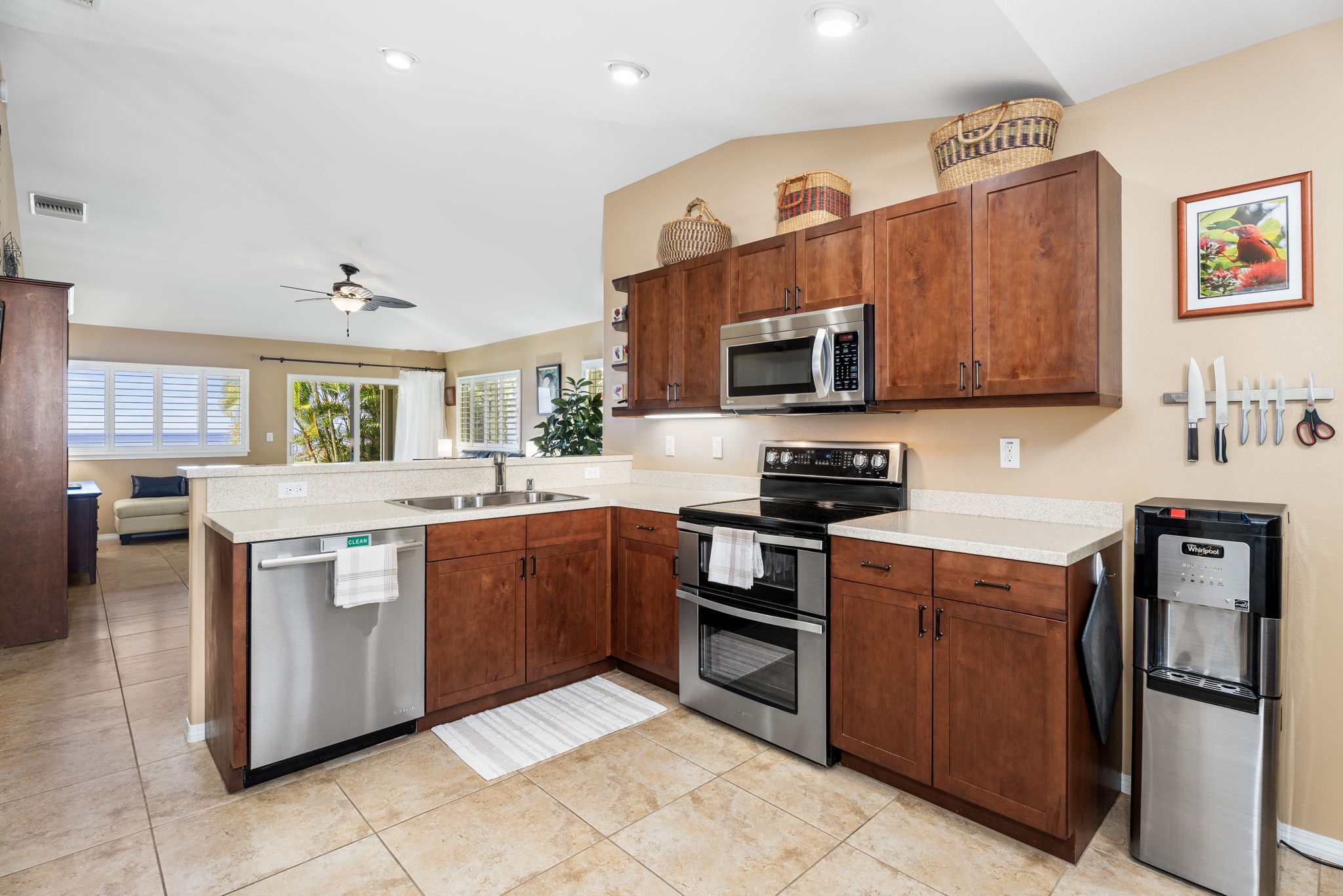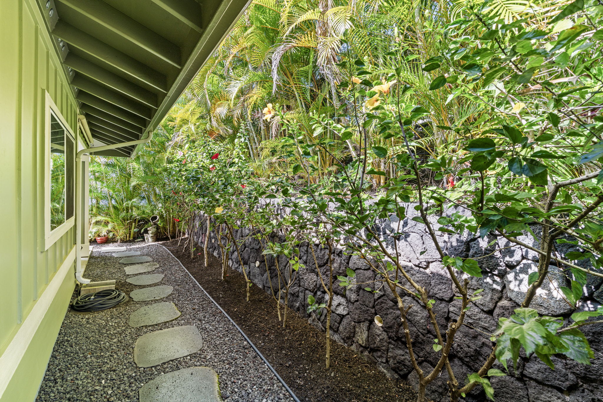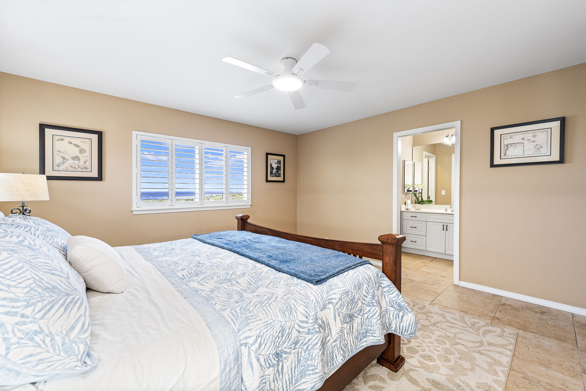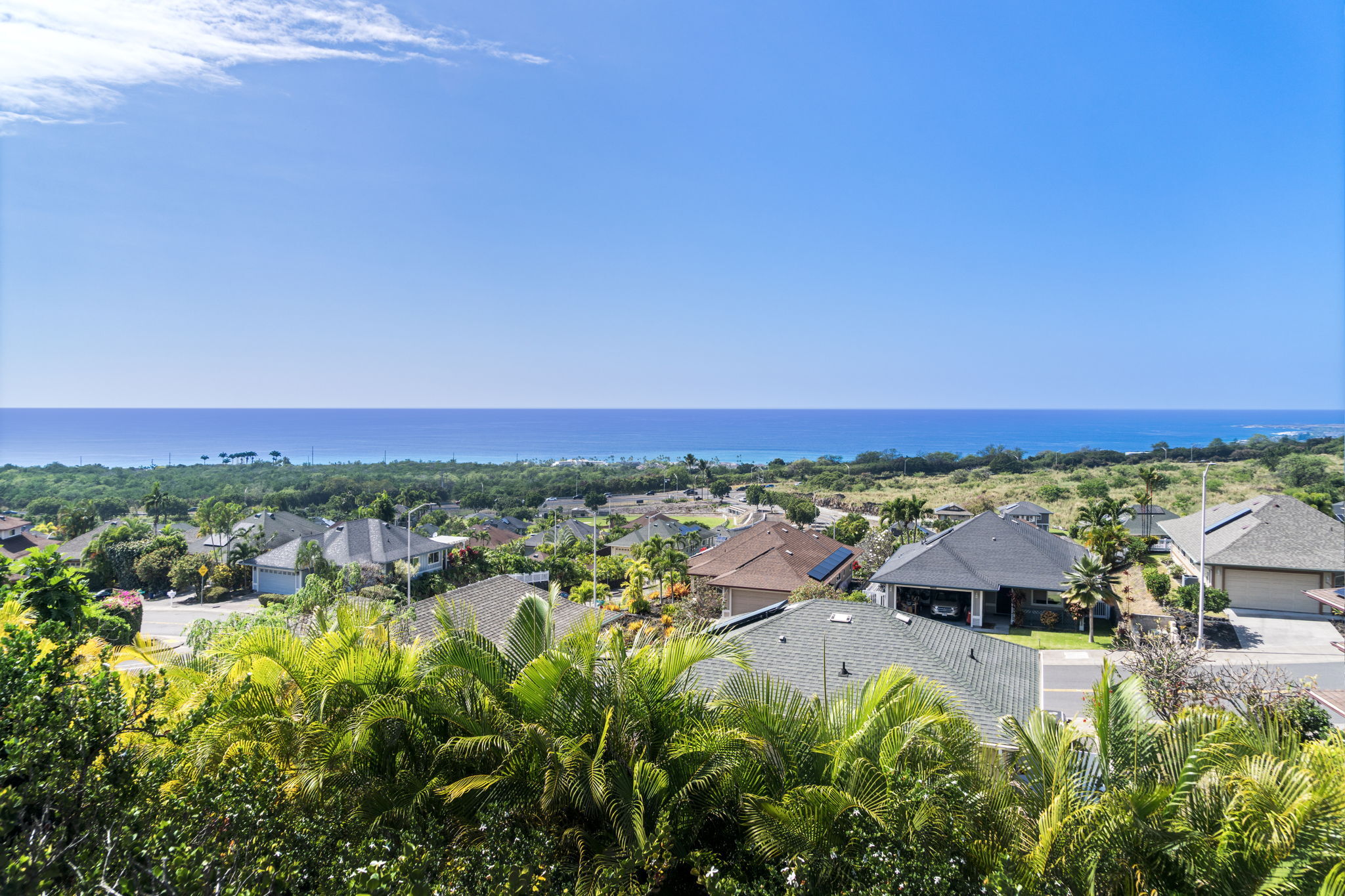 Perched in desirable Pualani Estates, this beautifully maintained residence captures sweeping 180-degree ocean views – enjoy vibrant sunsets, watch cruise ships arrive, and spot whales breaching during the season – all from the comfort of home. This spacious 3-bedroom, 2-bath home blends island elegance with modern efficiency and comfort. Designed for relaxed living and effortless entertaining, the covered lanai and patio area provides privacy and the perfect setting for gatherings or quiet evenings overlooking the coastline. The interior features large-format 20” tile flooring, custom wood interior shutters throughout, and a bright, open-concept layout. The well-appointed kitchen showcases high-end appliances, solid-surface counters, a generous bar-top for serving and seating, and a sunny eat-in nook – ideal for casual dining. The primary suite offers ocean views, a walk-in closet with custom ClosetMaid organizers, and a spa-style bath with a walk-in shower. One guest bedroom features a built-in California Closets Murphy bed with integrated shelving, and all three bedrooms include upgraded ClosetMaid storage systems. The second guest room is beautifully furnished and welcoming. Energy-efficient upgrades add exceptional value, including a fully paid solar photovoltaic system with net metering and a solar hot water heater, plus central air conditioning for year-round comfort. The property is surrounded by custom lava rock walls and wrought iron gates, with beautifully maintained tropical landscaping supported by an irrigation system – creating a private, polished island setting. An ARLO security system is included for added peace of mind while traveling or away. Quality furnishings are available and may be included, offering a strong turnkey opportunity to enjoy the Kona coast lifestyle. Video Tour: https://hawaiian-virtual-tours.aryeo.com/videos/019c4bc8-e6b4-72c9-bb49-14681a07ebfe
