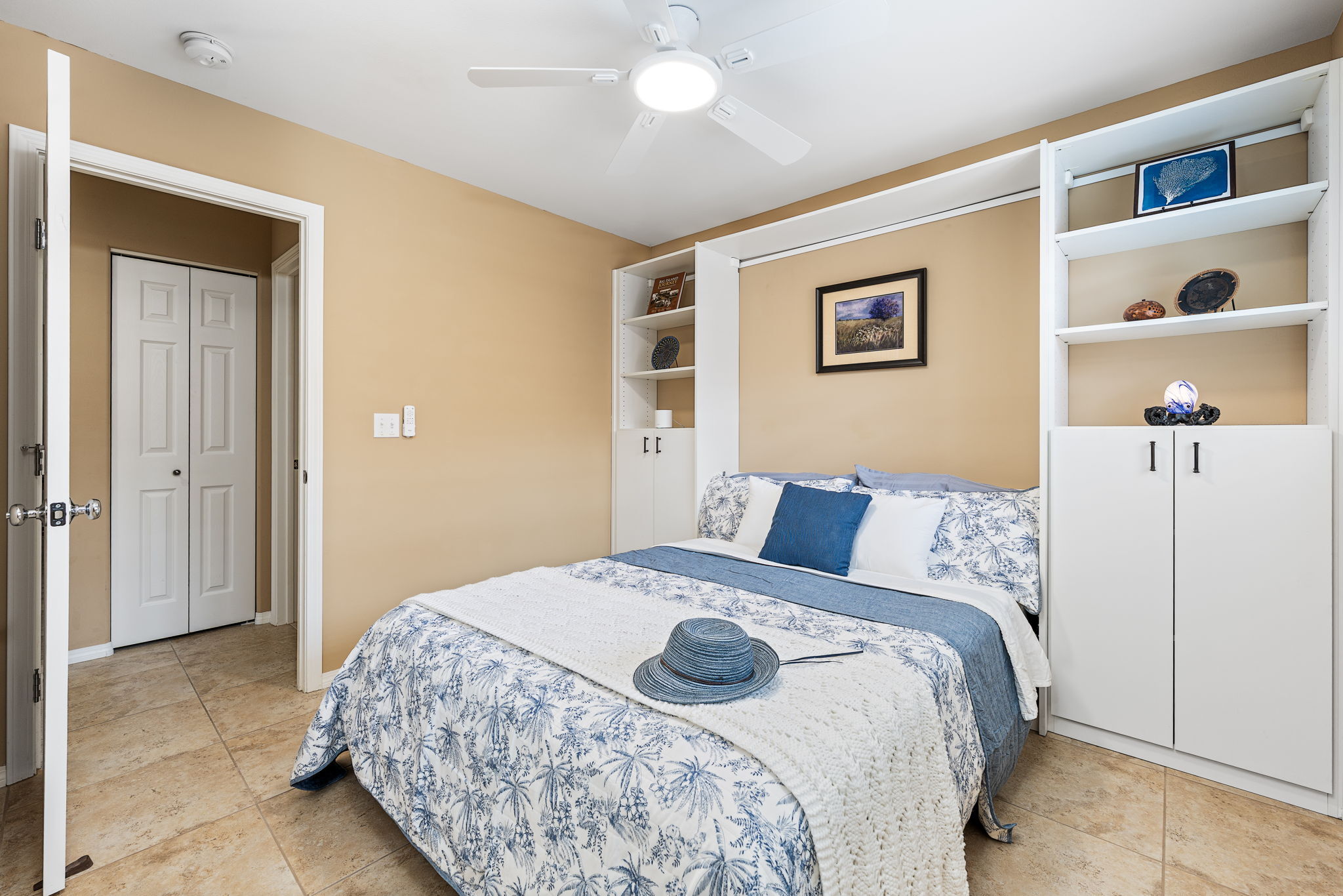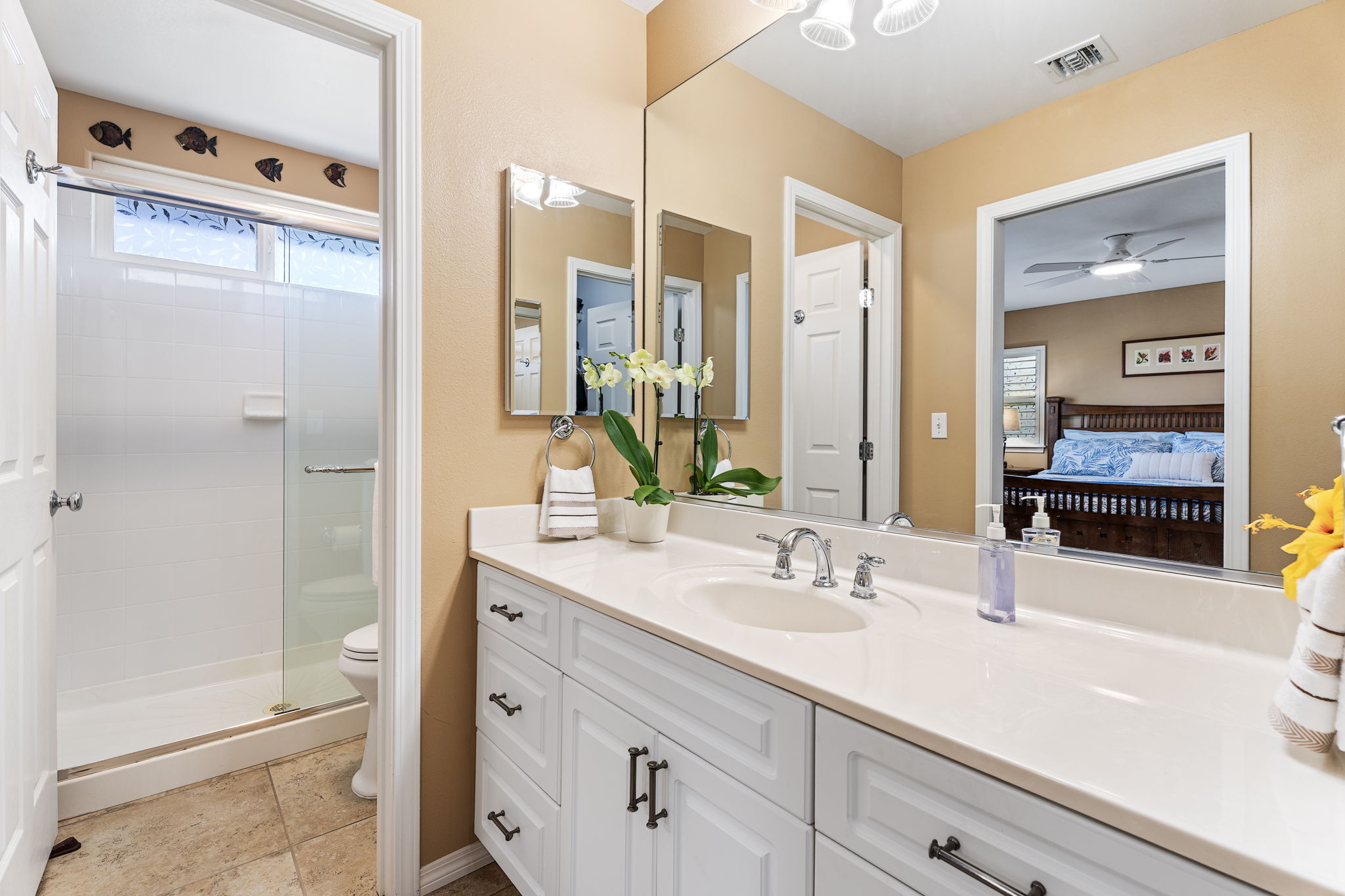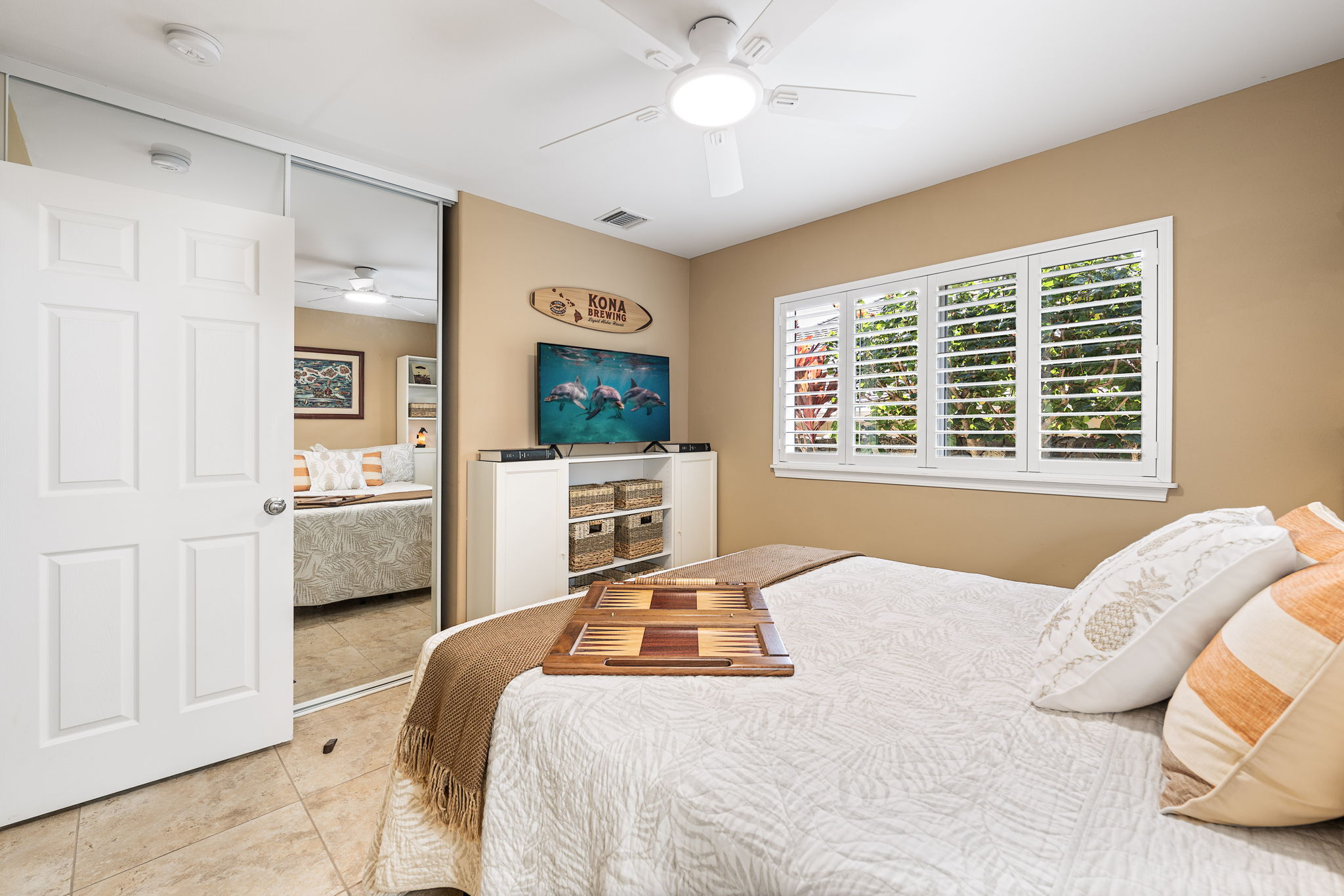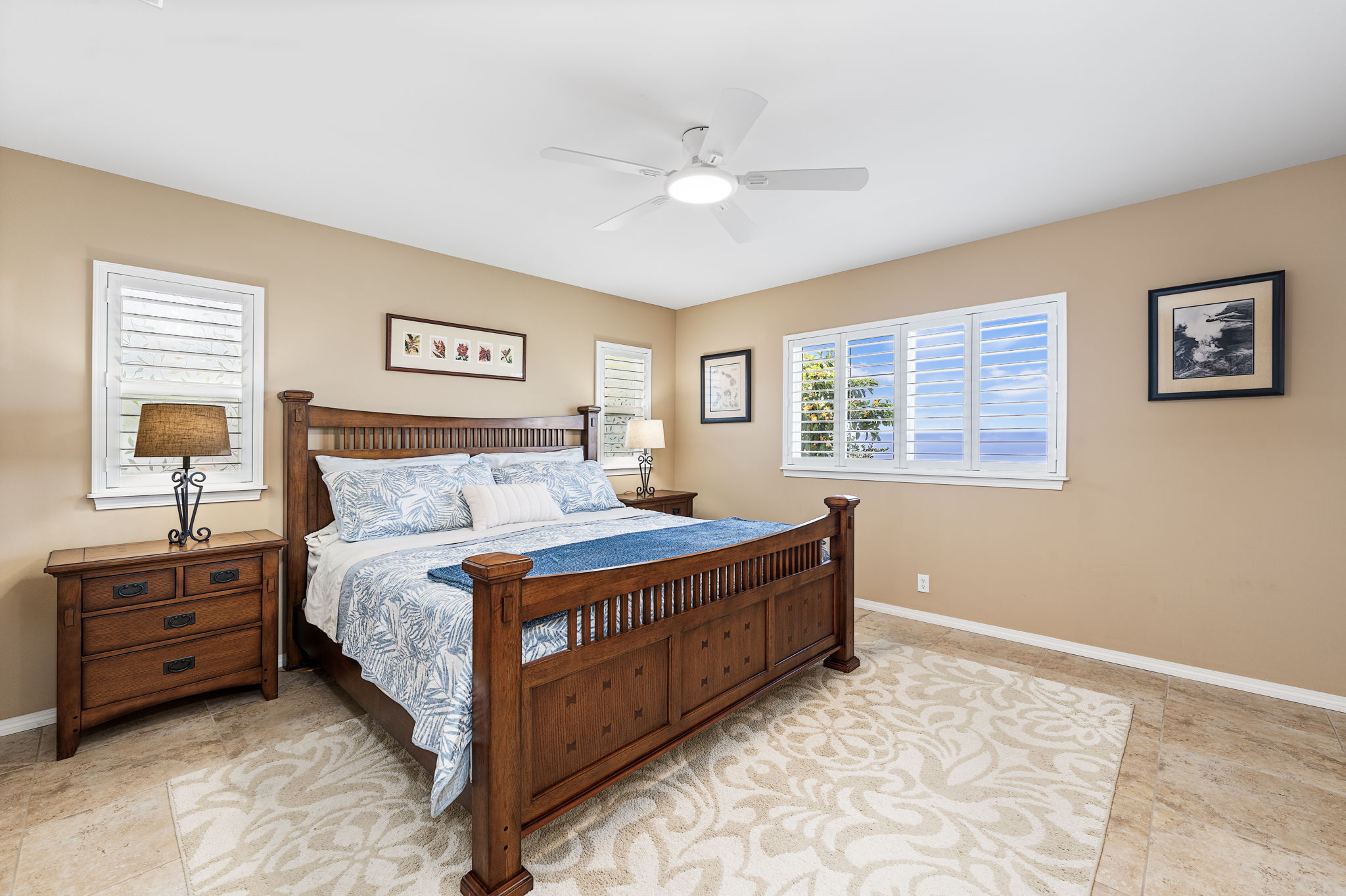 Perched in desirable Pualani Estates, this beautifully maintained residence captures sweeping 180-degree ocean views – enjoy vibrant sunsets, watch cruise ships arrive, and spot whales breaching during the season – all from the comfort of home. This spacious 3-bedroom, 2-bath home blends island elegance with modern efficiency and comfort. Designed for relaxed living and effortless entertaining, the covered lanai and patio area provides privacy and the perfect setting for gatherings or quiet evenings overlooking the coastline. The interior features large-format 20” tile flooring, custom wood interior shutters throughout, and a bright, open-concept layout. The well-appointed kitchen showcases high-end appliances, solid-surface counters, a generous bar-top for serving and seating, and a sunny eat-in nook – ideal for casual dining. The primary suite offers ocean views, a walk-in closet with custom ClosetMaid organizers, and a spa-style bath with a walk-in shower. One guest bedroom features a built-in California Closets Murphy bed with integrated shelving, and all three bedrooms include upgraded ClosetMaid storage systems. The second guest room is beautifully furnished and welcoming. Energy-efficient upgrades add exceptional value, including a fully paid solar photovoltaic system with net metering and a solar hot water heater, plus central air conditioning for year-round comfort. The property is surrounded by custom lava rock walls and wrought iron gates, with beautifully maintained tropical landscaping supported by an irrigation system – creating a private, polished island setting. An ARLO security system is included for added peace of mind while traveling or away. Quality furnishings are available and may be included, offering a strong turnkey opportunity to enjoy the Kona coast lifestyle. Video Tour: https://hawaiian-virtual-tours.aryeo.com/videos/019c4bc8-e6b4-72c9-bb49-14681a07ebfe