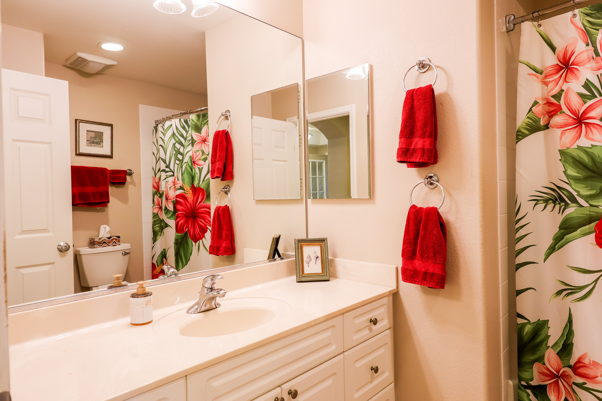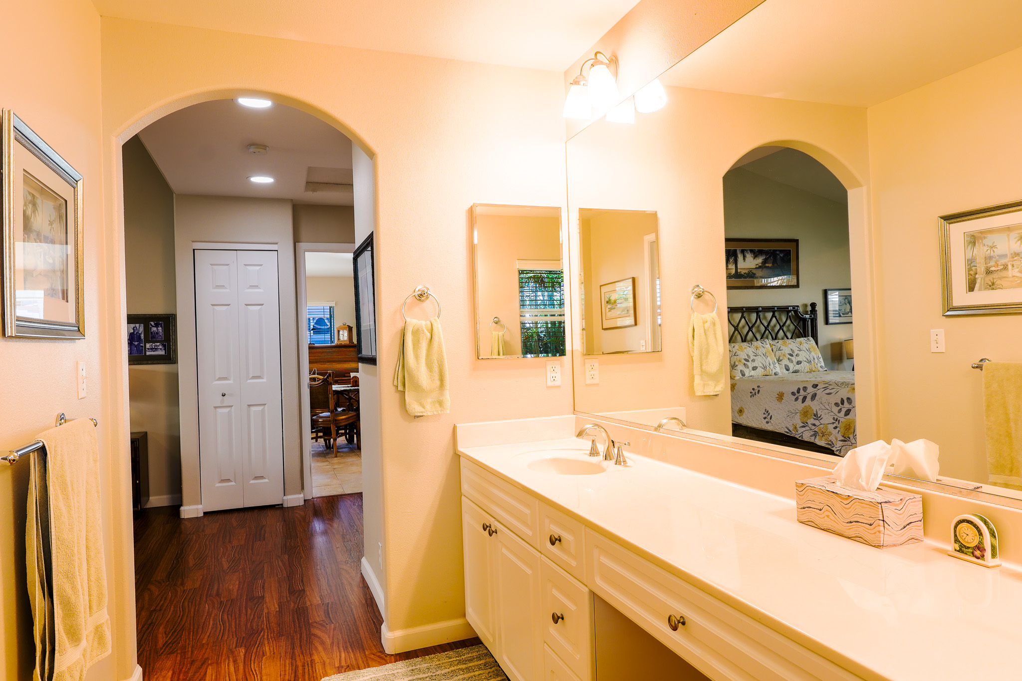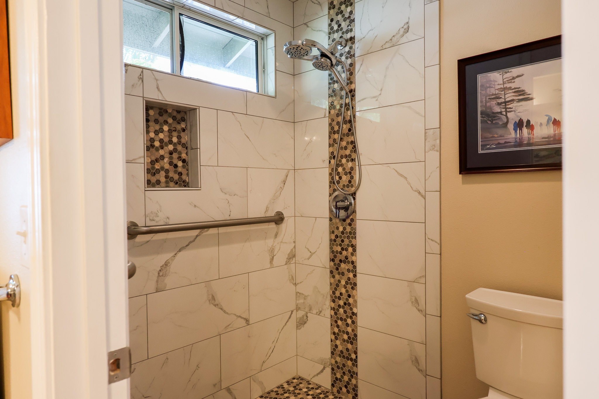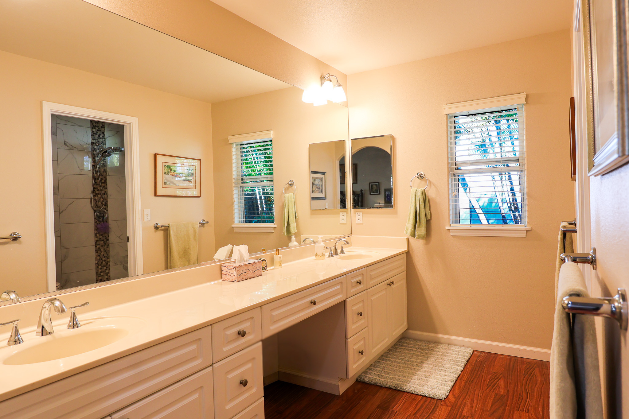 The primary bedroom offers a generous area with updated laminate flooring, complemented by a primary bathroom featuring a double vanity and a recently remodeled handicap-accessible walk-in tile shower.