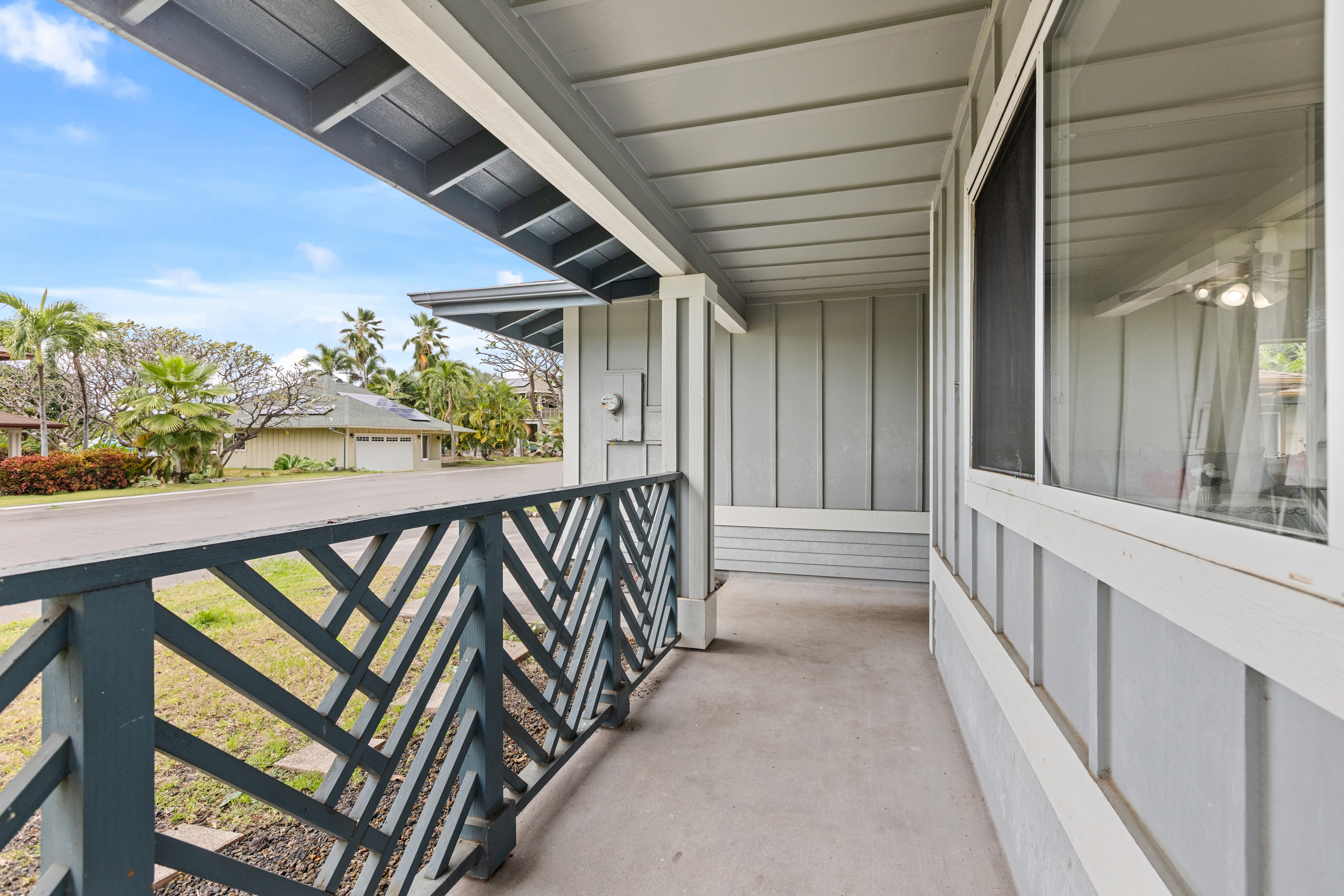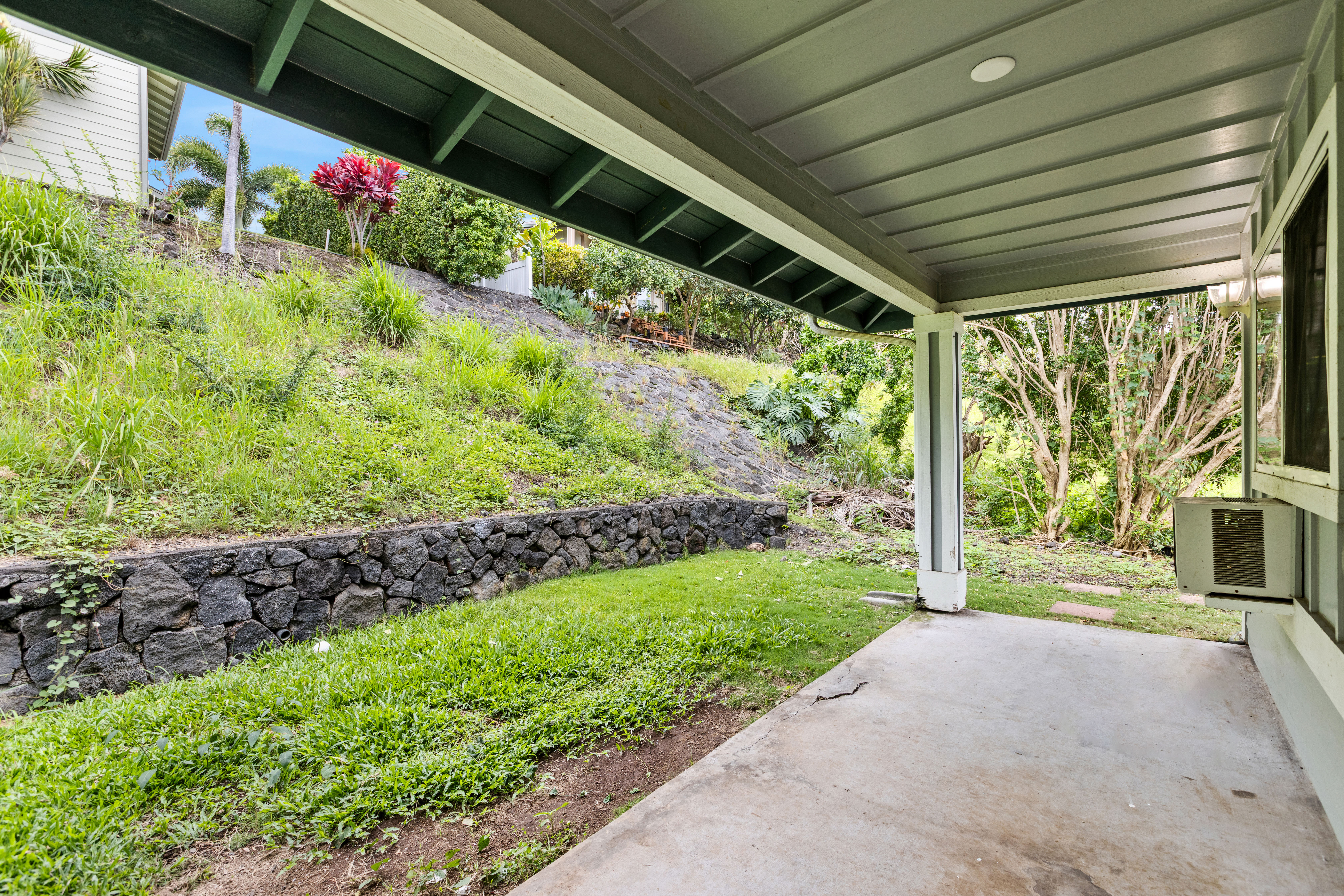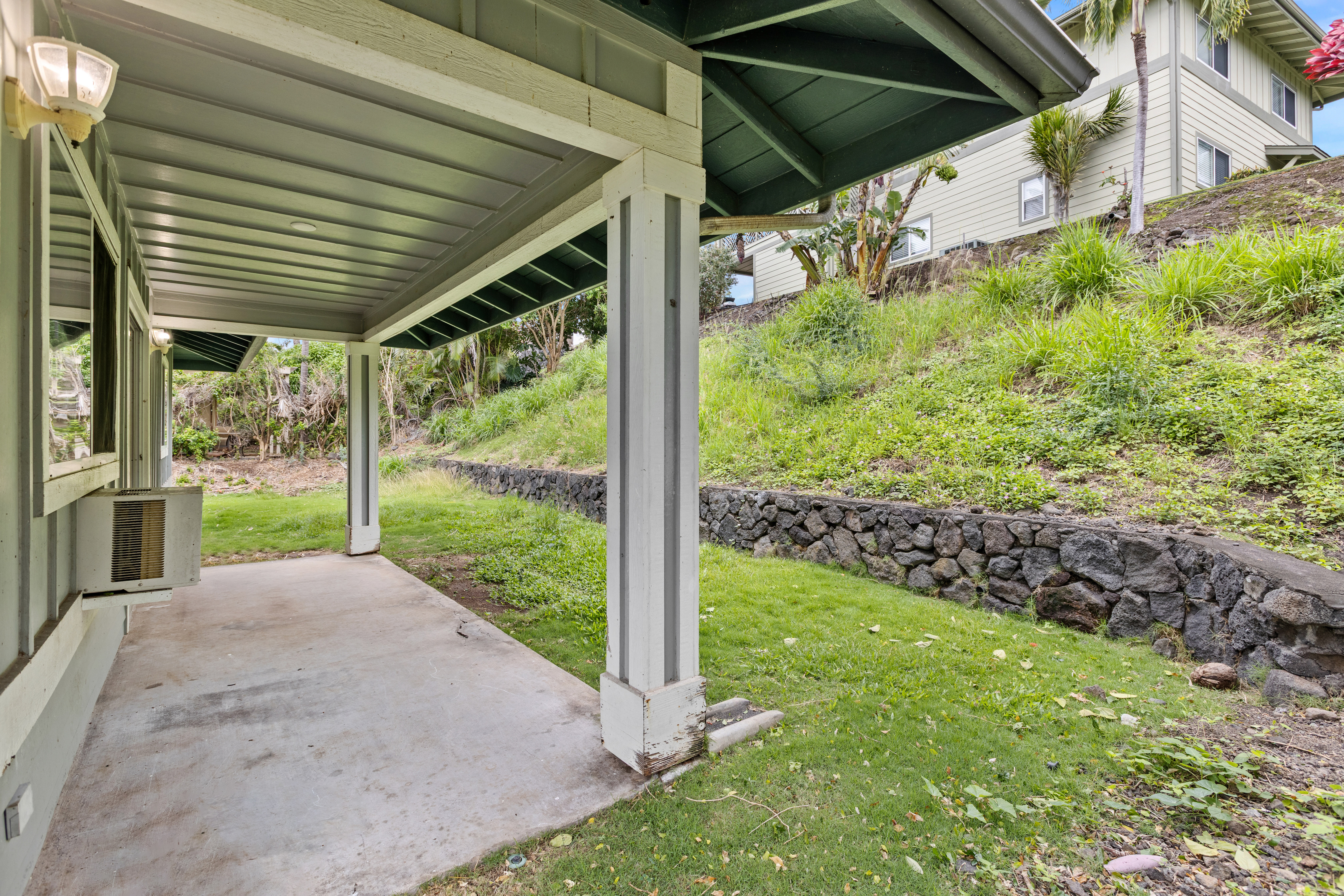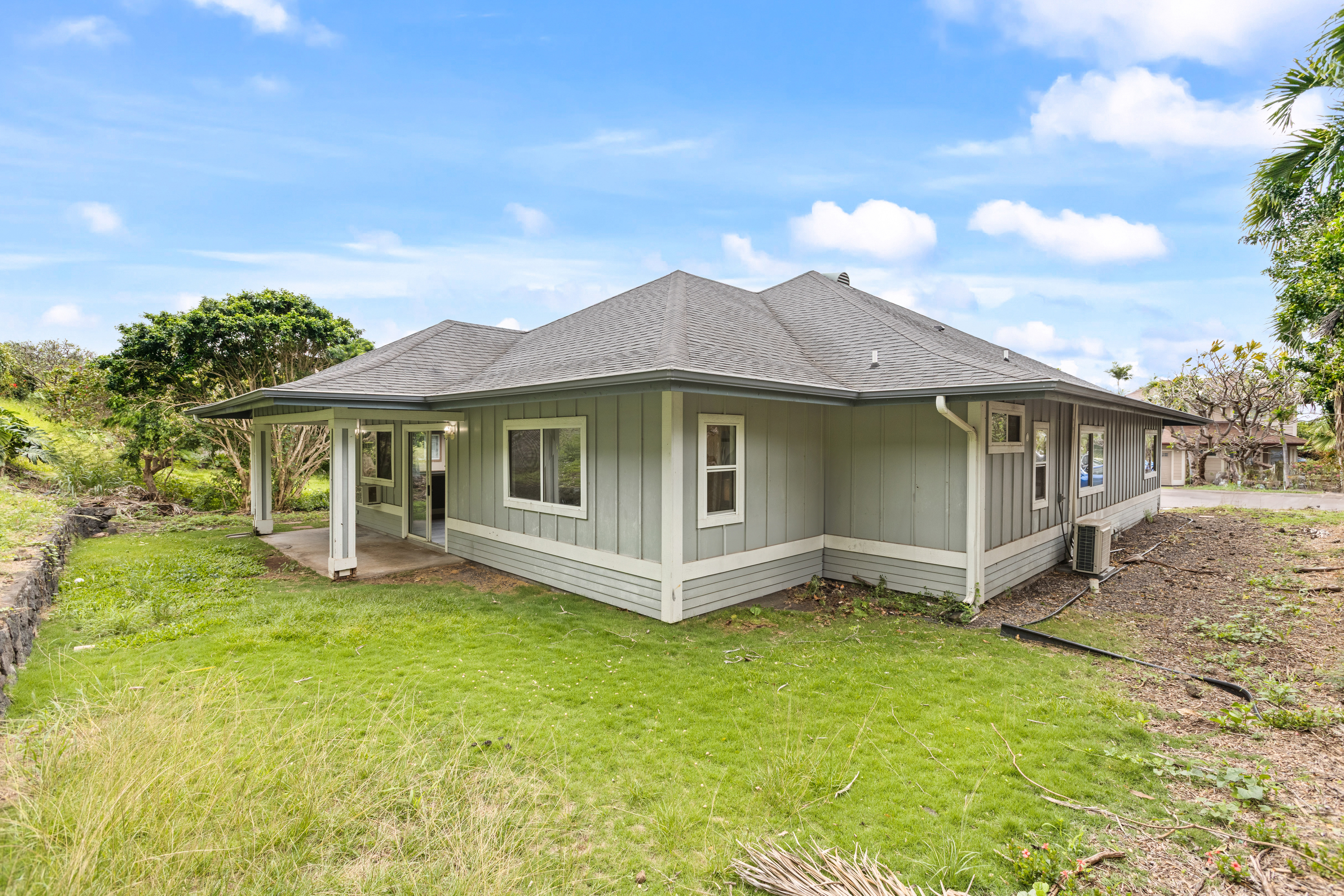 This single-story residence, featuring the highly sought-after Pikake floor plan, is situated in a prime location within the desirable Pualani Estates neighborhood. The property offers 3 bedrooms and 2 bathrooms. The kitchen has been remodeled with an open-concept design that flows seamlessly into the living room. It includes a garden window above the sink, ideal for cultivating herbs, and a large central island perfect for entertaining, cooking, and various hobbies. The home calls for the new owner's personal touches to complete the updates and tailor the finishes to their preference. It features vaulted ceilings, with split-system air conditioning units installed in the primary bedroom and the main living area. The enormous primary bedroom boasts a walk-in closet and a large ensuite bathroom with dual vanity sinks. The property's prime location offers easy access and close proximity to the community park, which includes a playground, a baseball field, and facilities for soccer enthusiasts. It is also conveniently close to downtown Kailua Kona. The monthly Homeowners Association (HOA) dues are low.