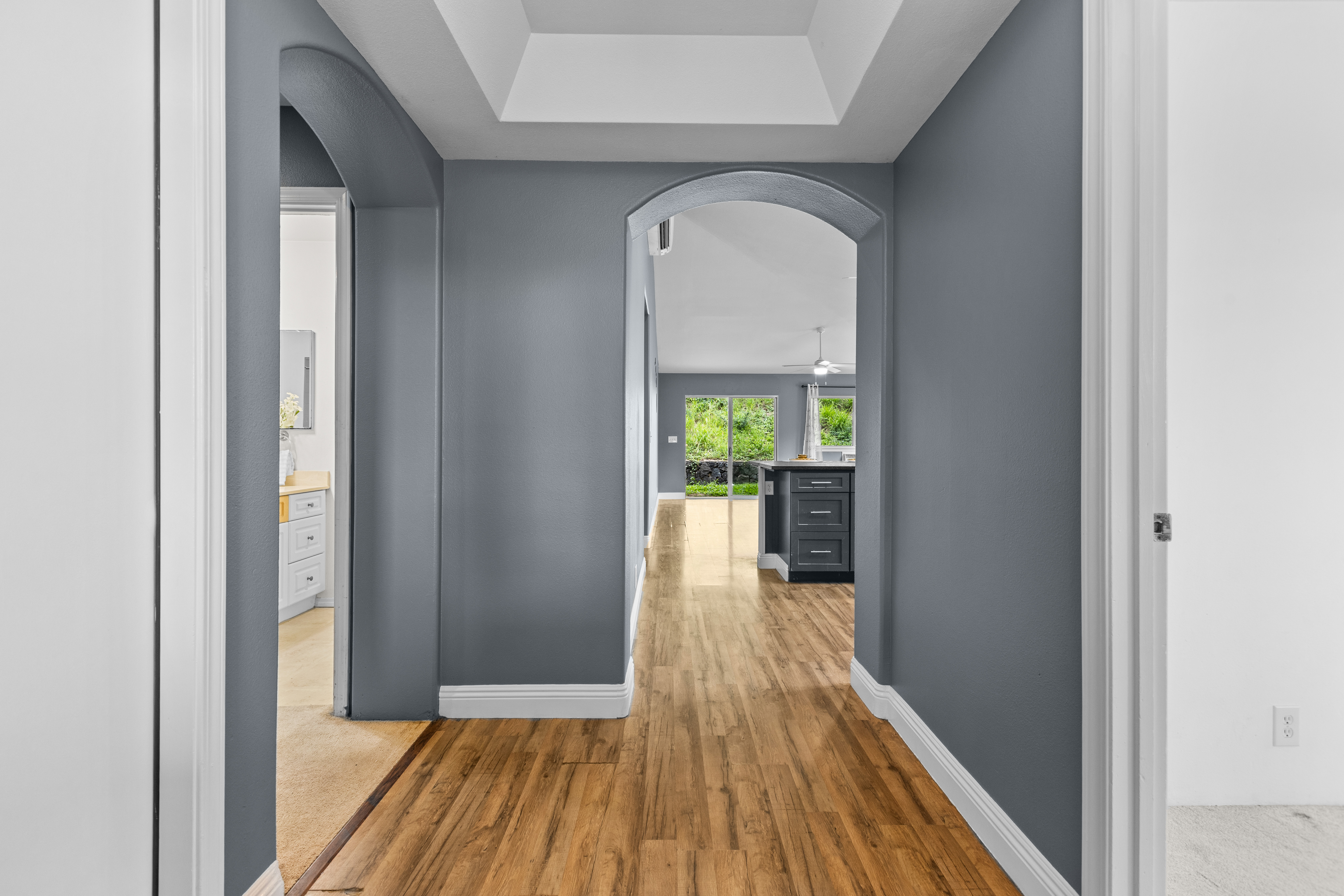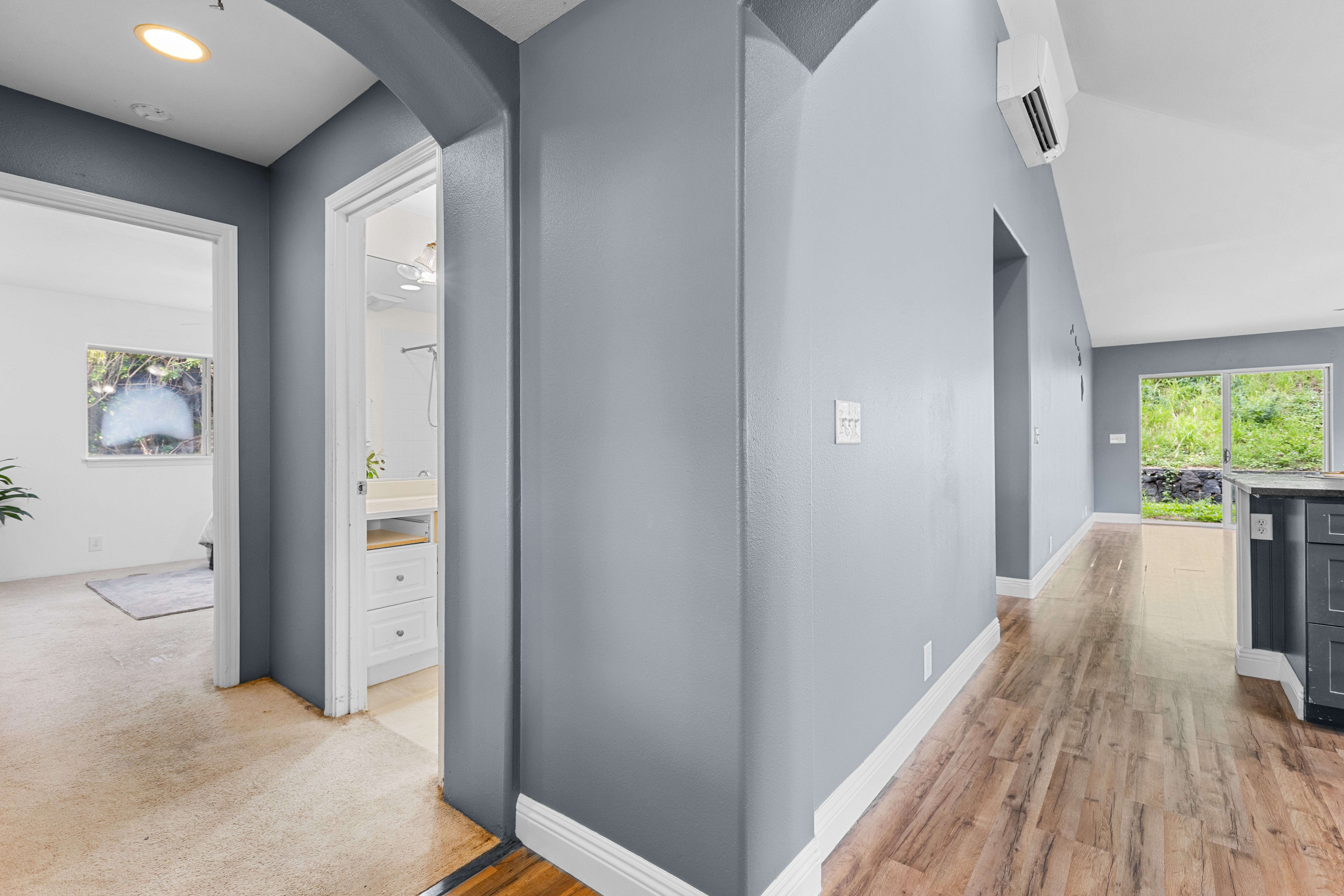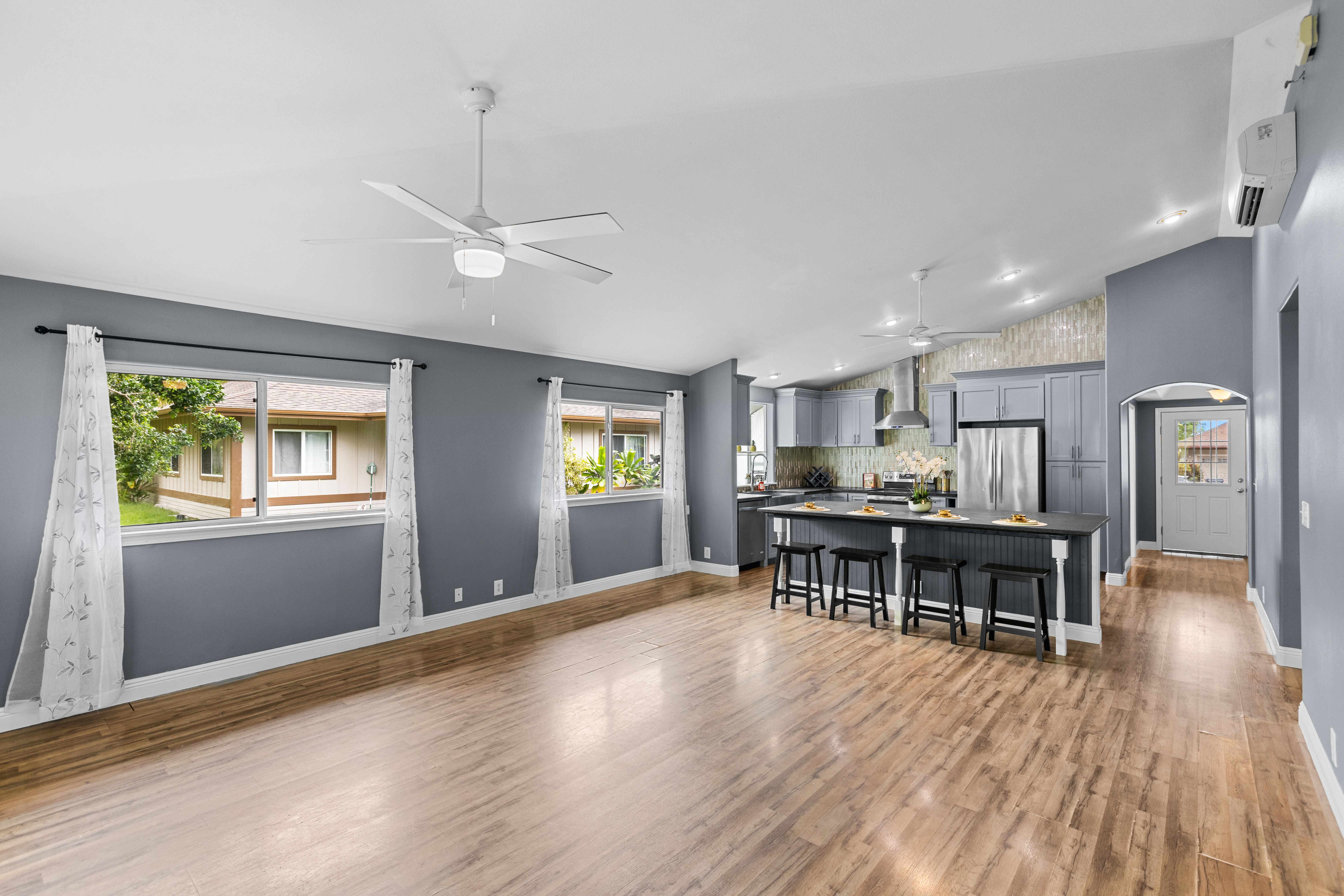 This single-story residence, featuring the highly sought-after Pikake floor plan, is situated in a prime location within the desirable Pualani Estates neighborhood. The property offers 3 bedrooms and 2 bathrooms. The kitchen has been remodeled with an open-concept design that flows seamlessly into the living room. It includes a garden window above the sink, ideal for cultivating herbs, and a large central island perfect for entertaining, cooking, and various hobbies. The home calls for the new owner's personal touches to complete the updates and tailor the finishes to their preference. It features vaulted ceilings, with split-system air conditioning units installed in the primary bedroom and the main living area. The enormous primary bedroom boasts a walk-in closet and a large ensuite bathroom with dual vanity sinks. The property's prime location offers easy access and close proximity to the community park, which includes a playground, a baseball field, and facilities for soccer enthusiasts. It is also conveniently close to downtown Kailua Kona. The monthly Homeowners Association (HOA) dues are low.