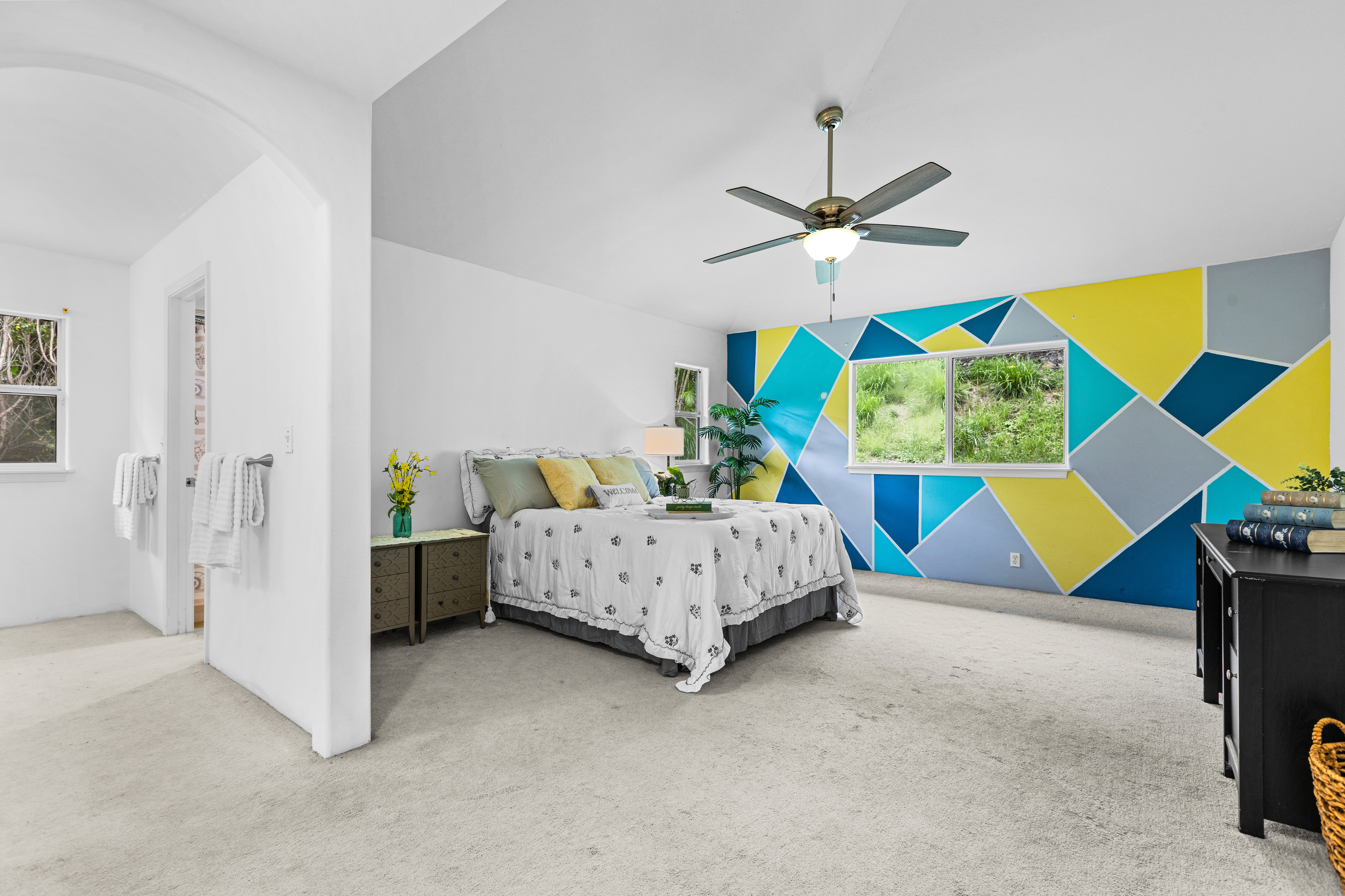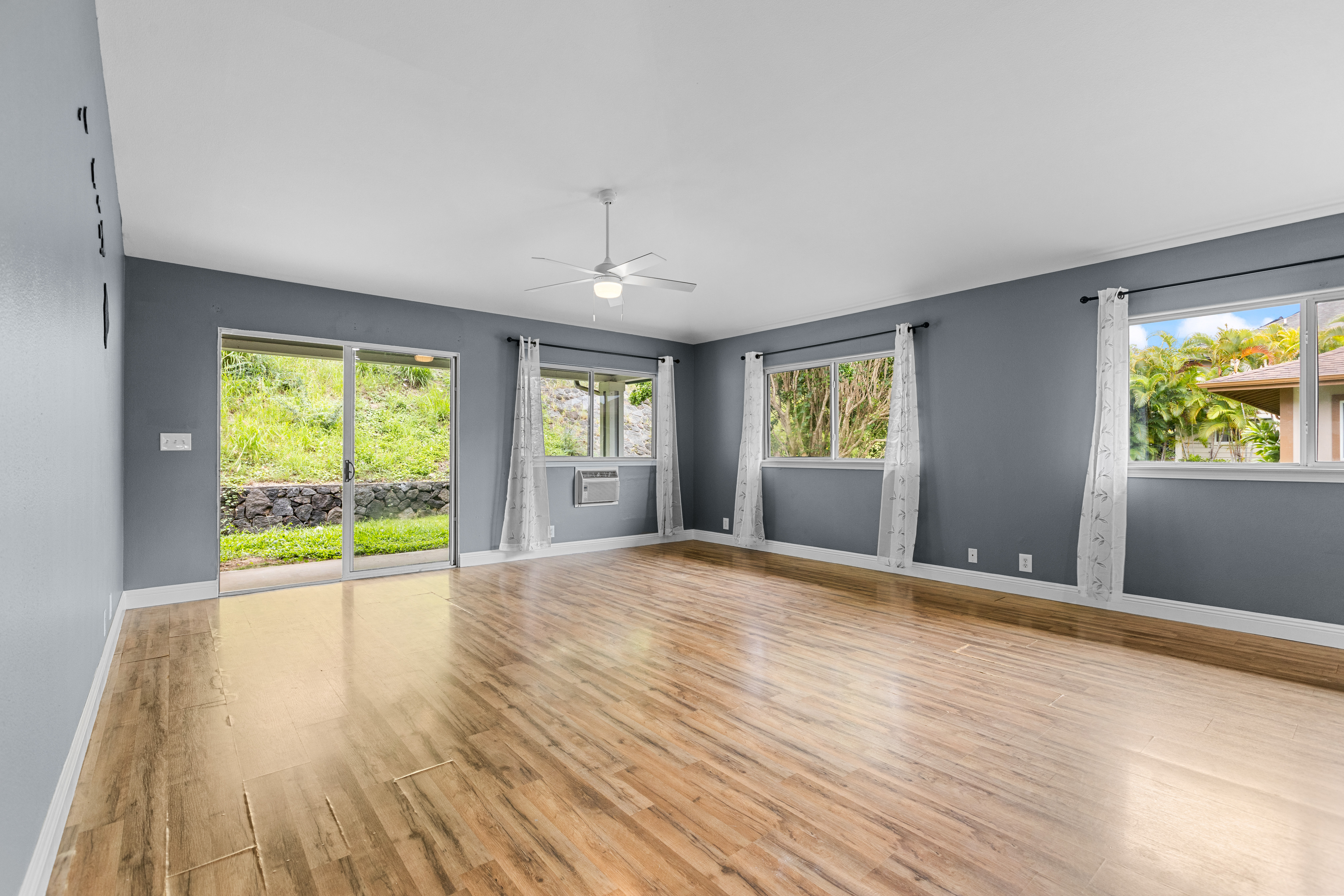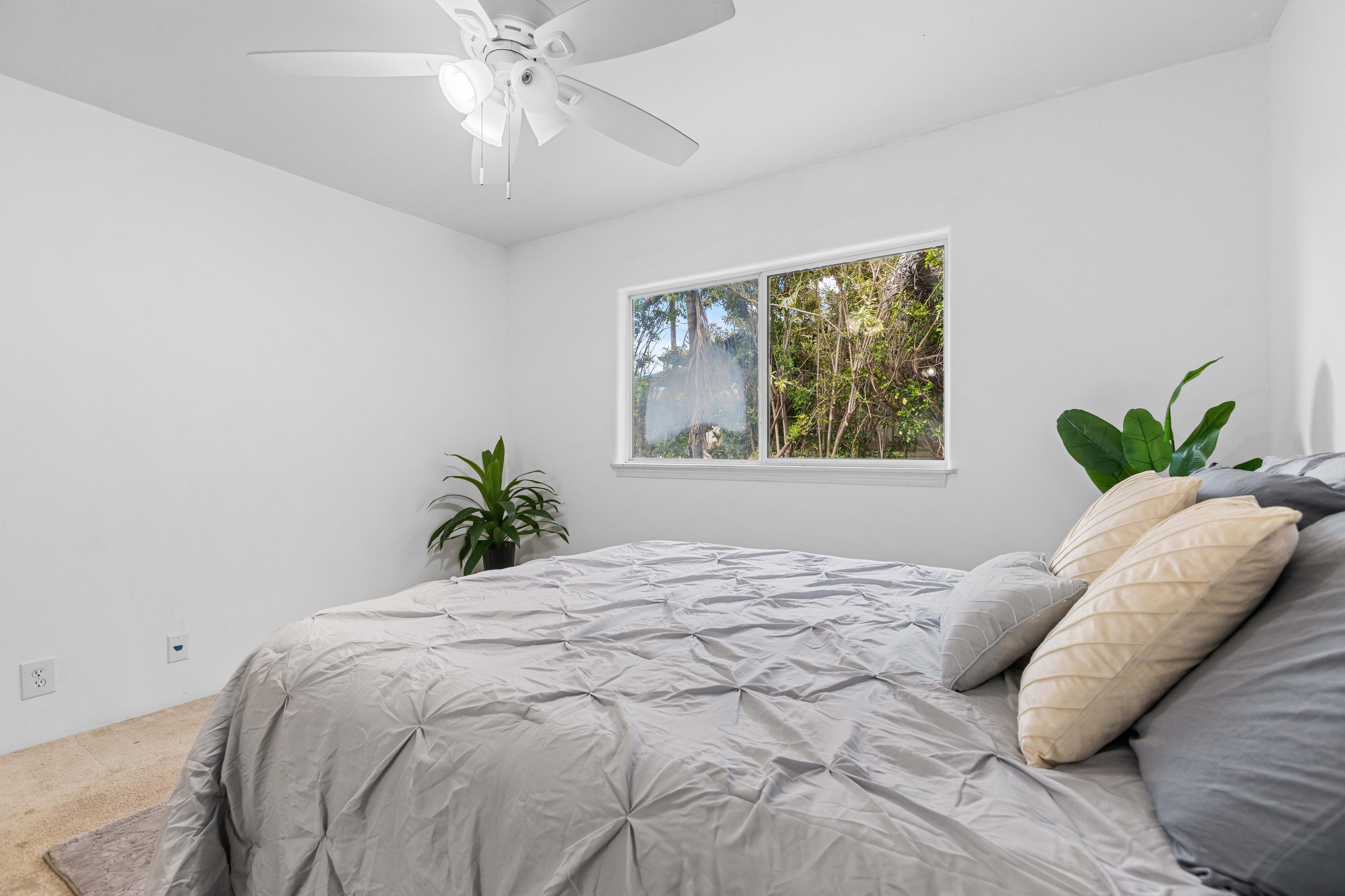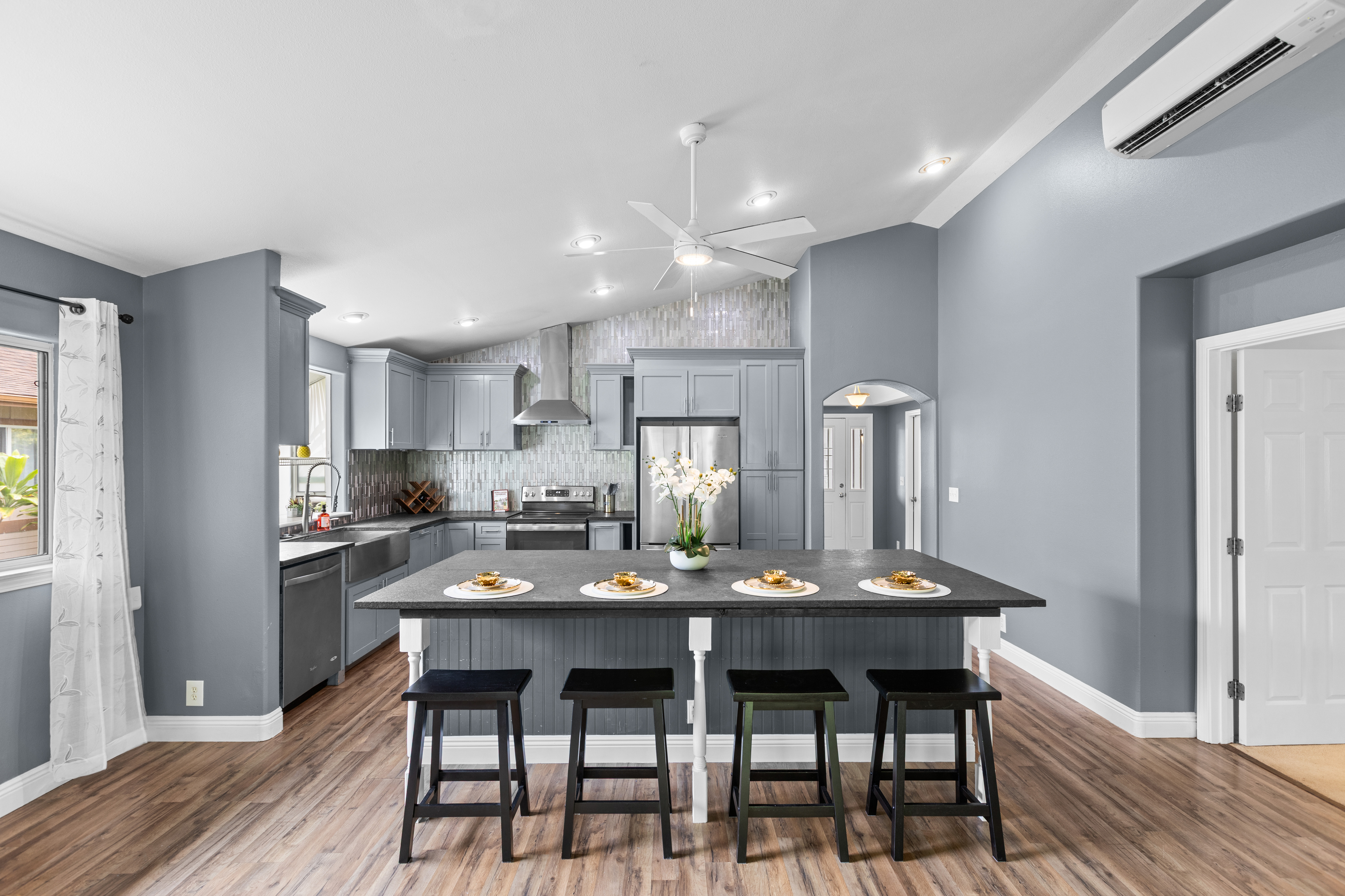 This single-story residence, featuring the highly sought-after Pikake floor plan, is situated in a prime location within the desirable Pualani Estates neighborhood. The property offers 3 bedrooms and 2 bathrooms. The kitchen has been remodeled with an open-concept design that flows seamlessly into the living room. It includes a garden window above the sink, ideal for cultivating herbs, and a large central island perfect for entertaining, cooking, and various hobbies. The home calls for the new owner's personal touches to complete the updates and tailor the finishes to their preference. It features vaulted ceilings, with split-system air conditioning units installed in the primary bedroom and the main living area. The enormous primary bedroom boasts a walk-in closet and a large ensuite bathroom with dual vanity sinks. The property's prime location offers easy access and close proximity to the community park, which includes a playground, a baseball field, and facilities for soccer enthusiasts. It is also conveniently close to downtown Kailua Kona. The monthly Homeowners Association (HOA) dues are low.